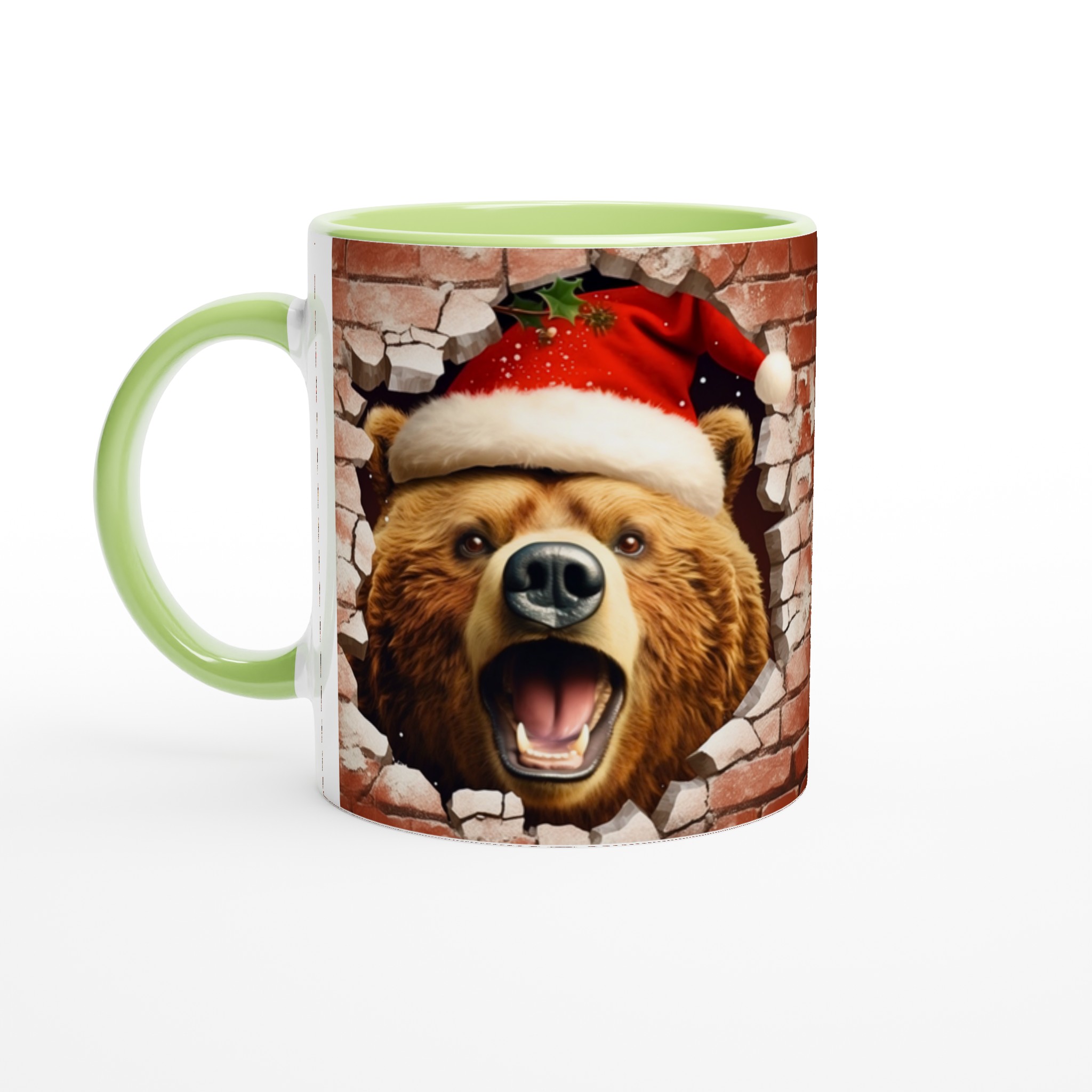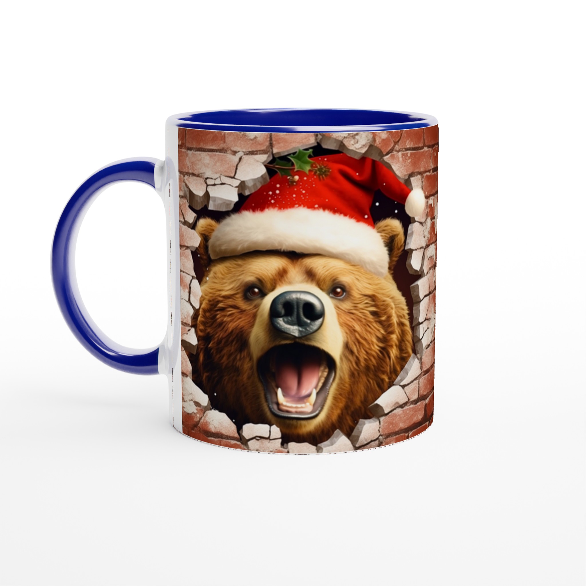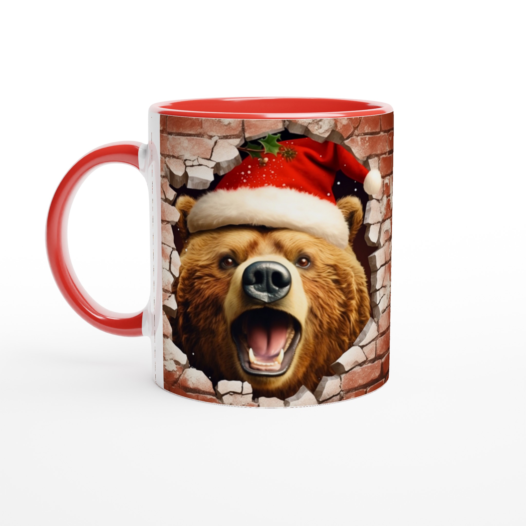 Överraska med en mugg som bryter igenom vardagen! Vår charmiga keramiska mugg med en julbjörn som kikar fram ur en tegelvägg, komplett med tomteluva och juliga detaljer, är den perfekta stämningshöjaren under julen. Oavsett om det är för morgonkaffet, kvällens varma choklad eller bara en mysig kopp te, kommer denna mugg att sprida glädje och festlig anda. Den blanka ytan framhäver trycket med klara, levande färger som behåller sin lyster, även efter otaliga turer i mikron och diskmaskinen.