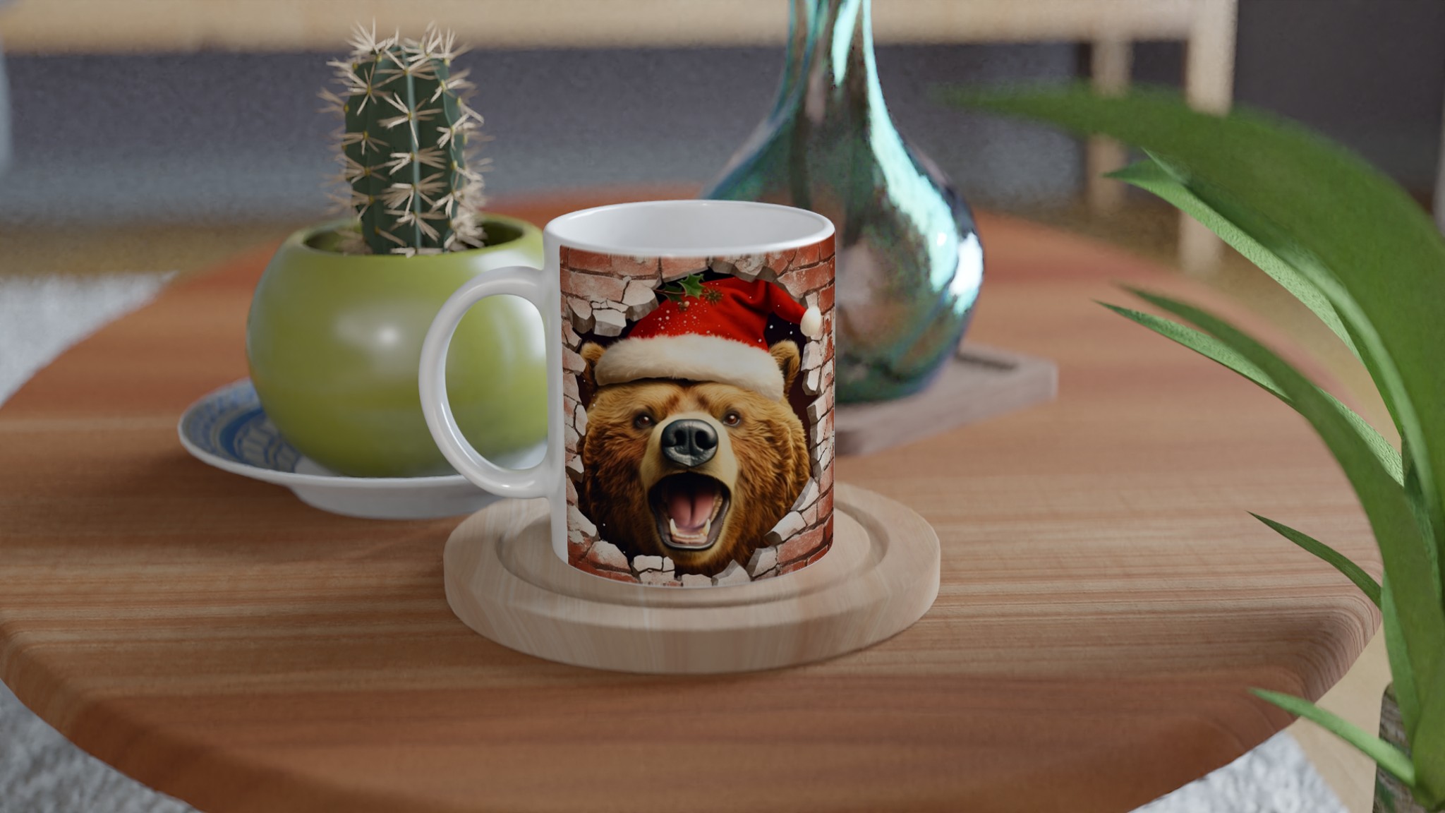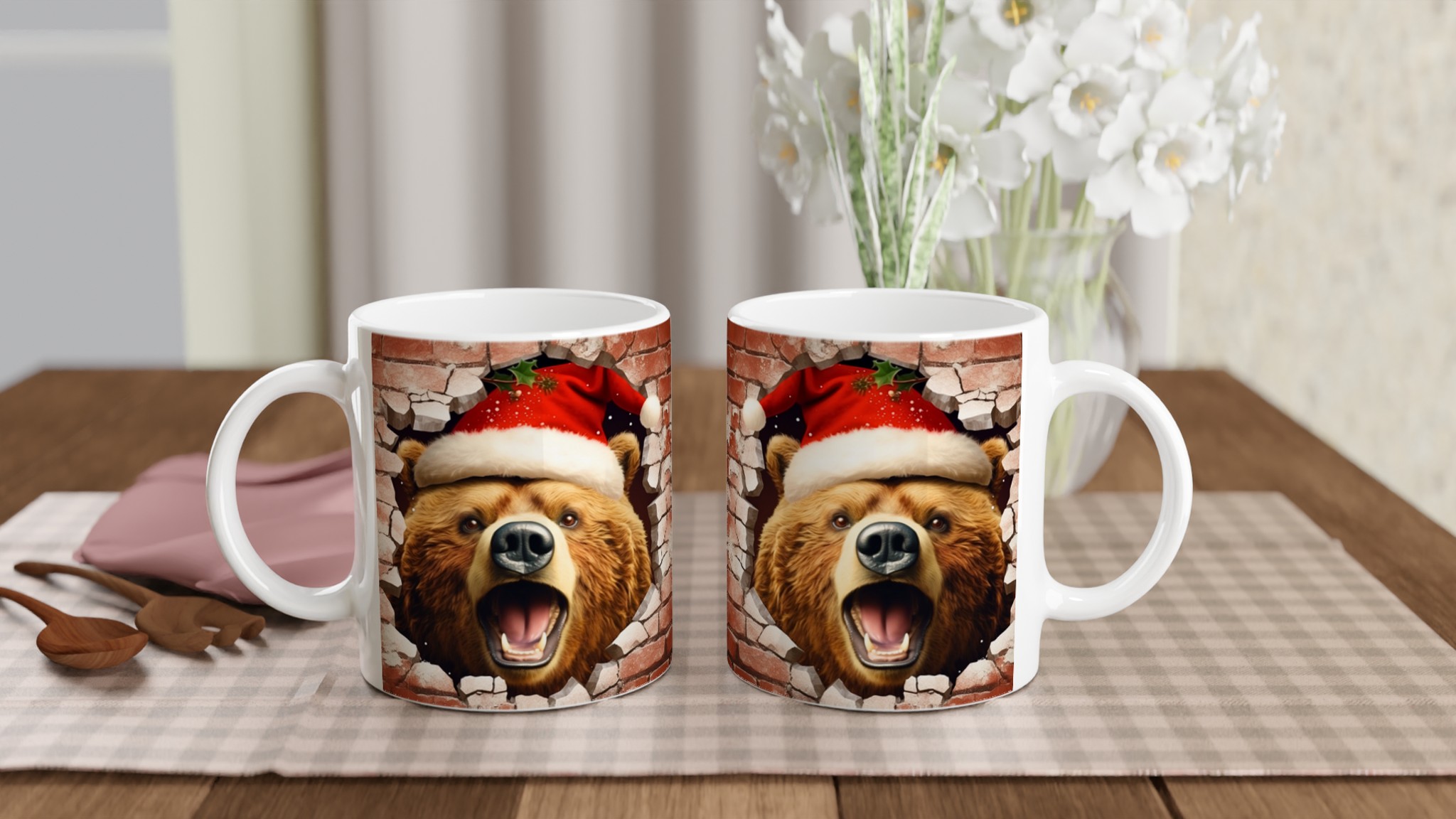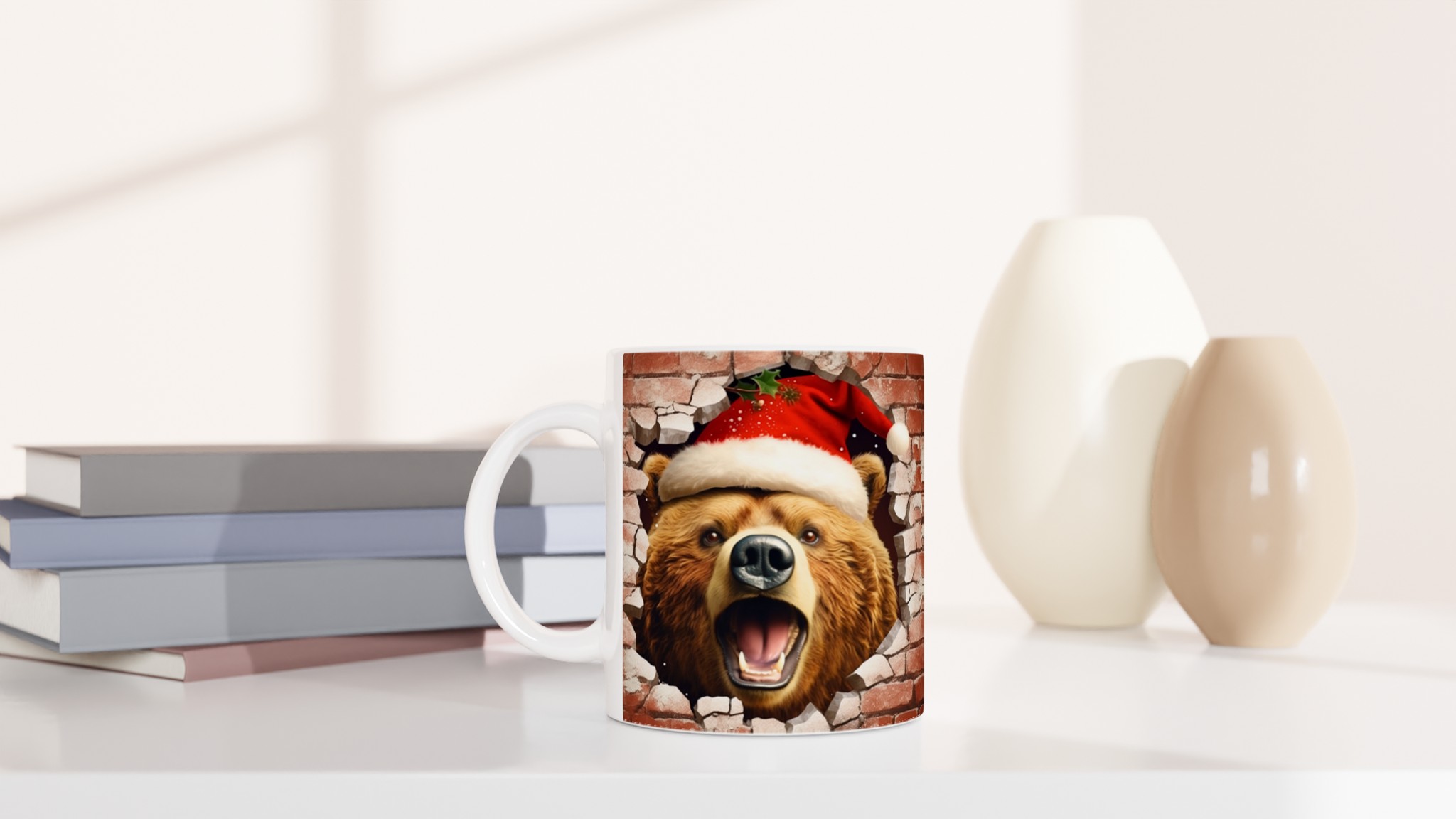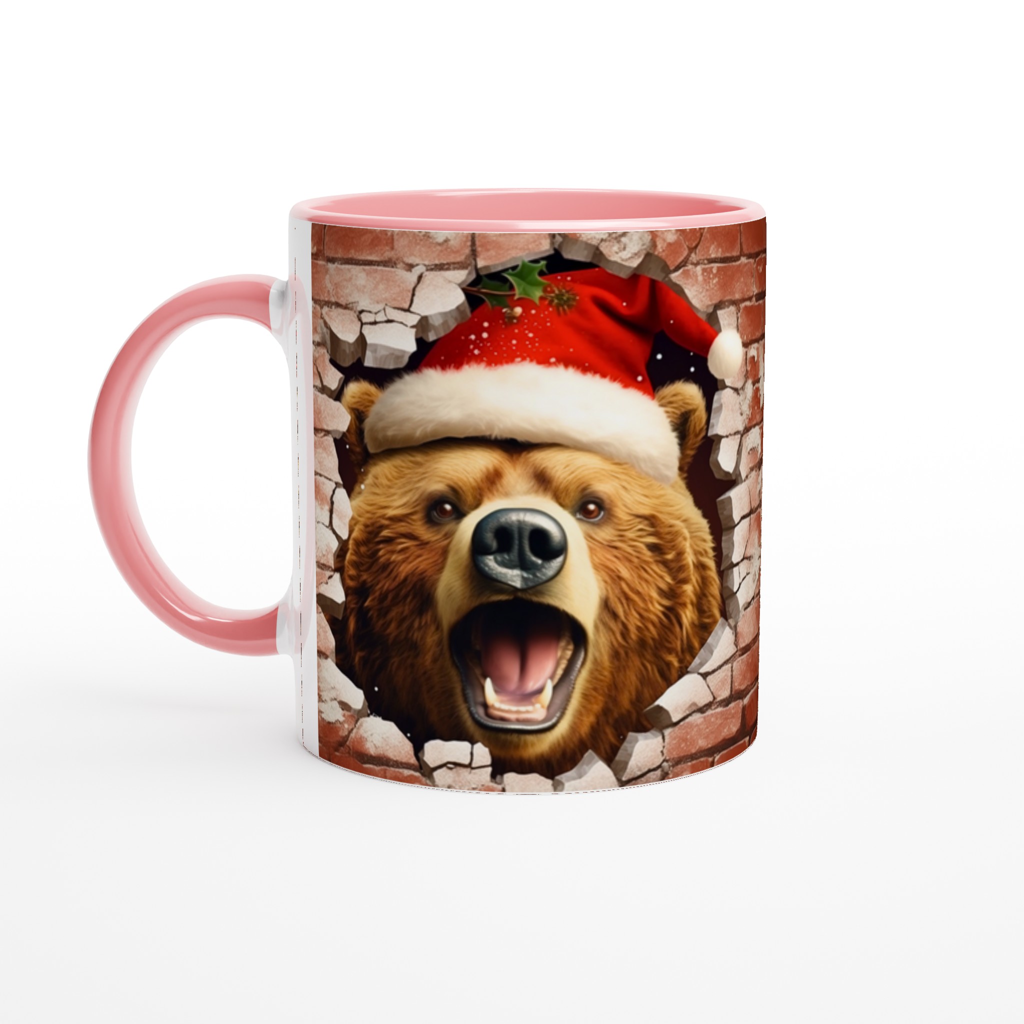 Överraska med en mugg som bryter igenom vardagen! Vår charmiga keramiska mugg med en julbjörn som kikar fram ur en tegelvägg, komplett med tomteluva och juliga detaljer, är den perfekta stämningshöjaren under julen. Oavsett om det är för morgonkaffet, kvällens varma choklad eller bara en mysig kopp te, kommer denna mugg att sprida glädje och festlig anda. Den blanka ytan framhäver trycket med klara, levande färger som behåller sin lyster, även efter otaliga turer i mikron och diskmaskinen.