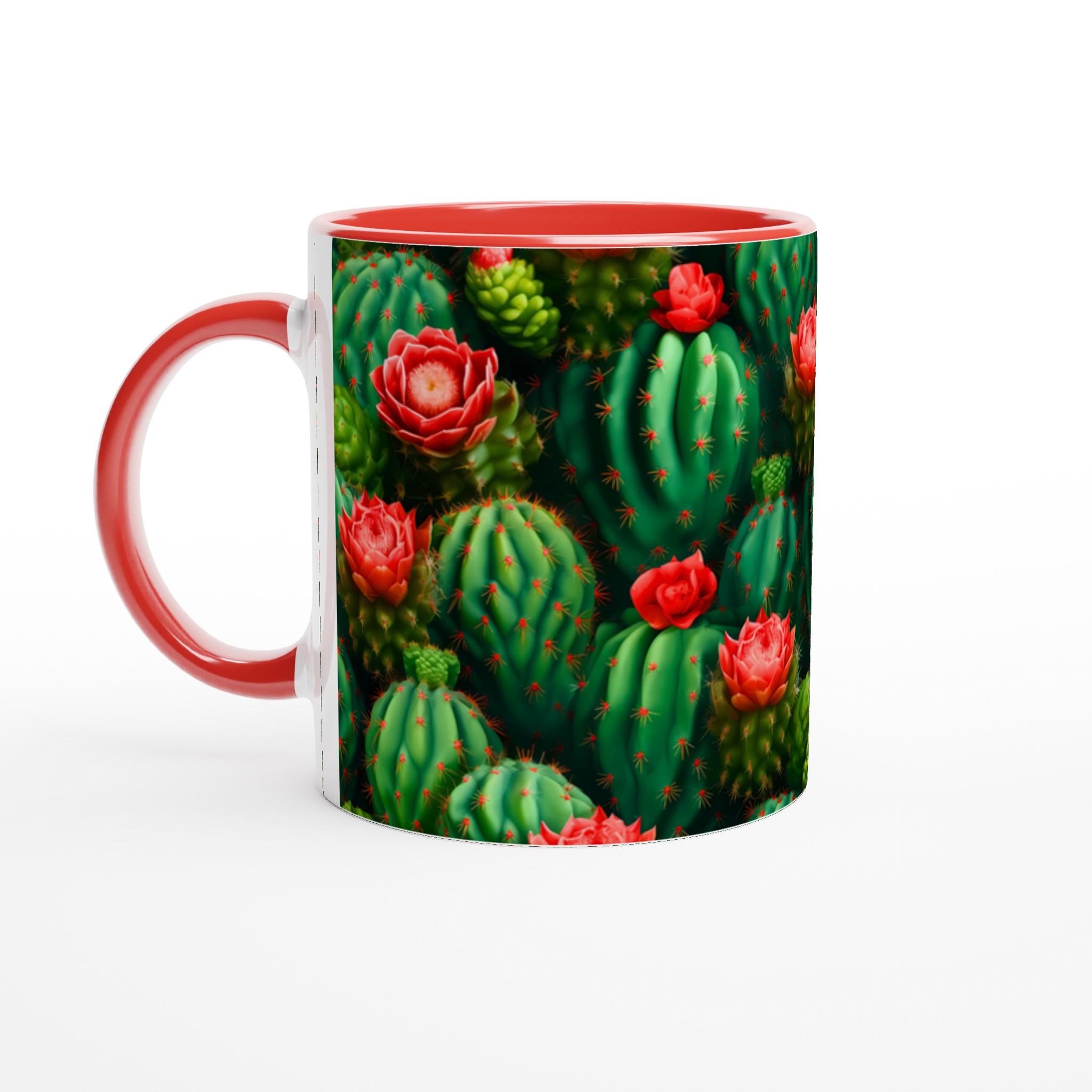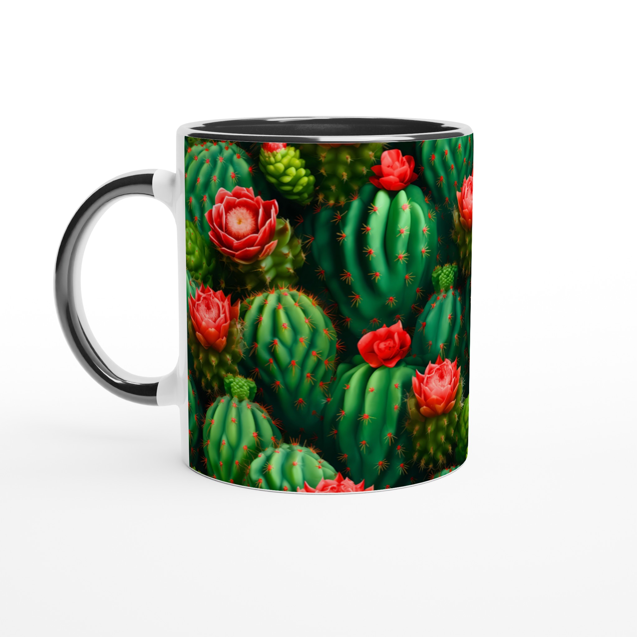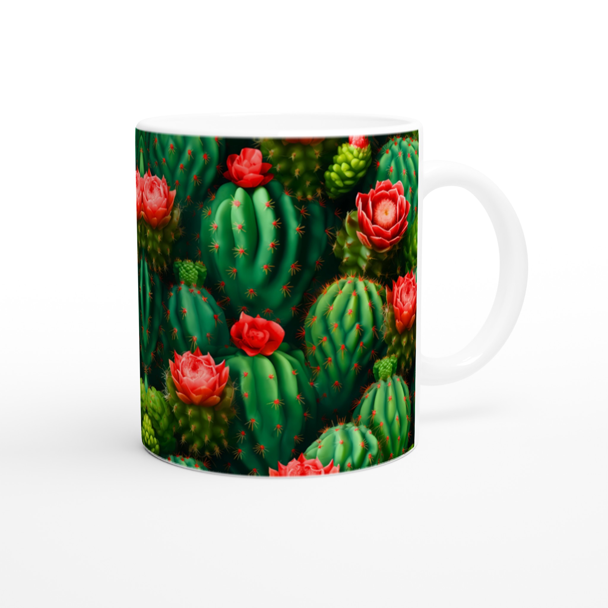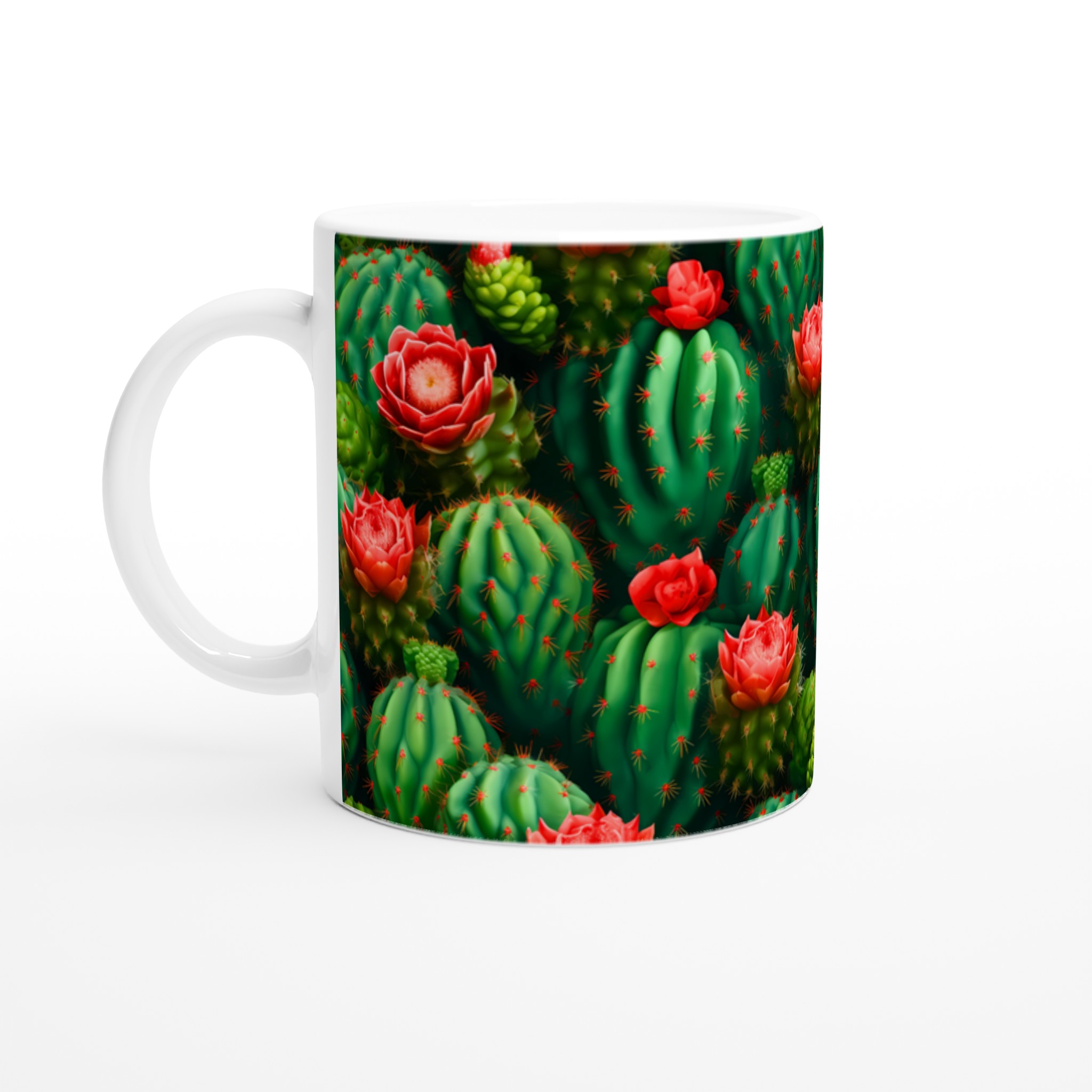 Låt din morgonkaffe, kvällste eller varma choklad blomstra med vår unika keramiska mugg, prydd med ett fantastiskt mönster av levande kaktusar och deras slående röda blommor. Inspirerad av öknens skönhet, förvandlar denna mugg varje dryckesstund till en liten flykt. Den blanka vita ytan framhäver de klara och levande färgerna med en sådan intensitet att det känns som att du håller en bit konst i handen.