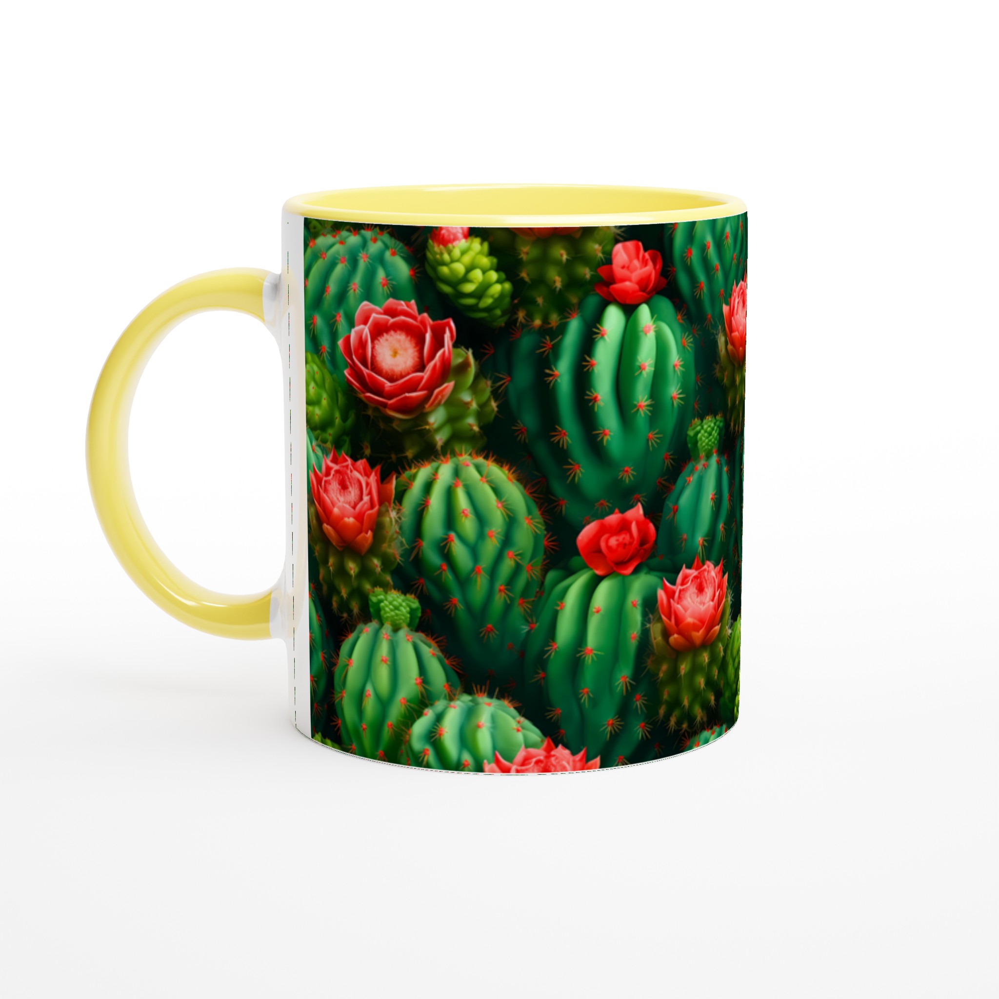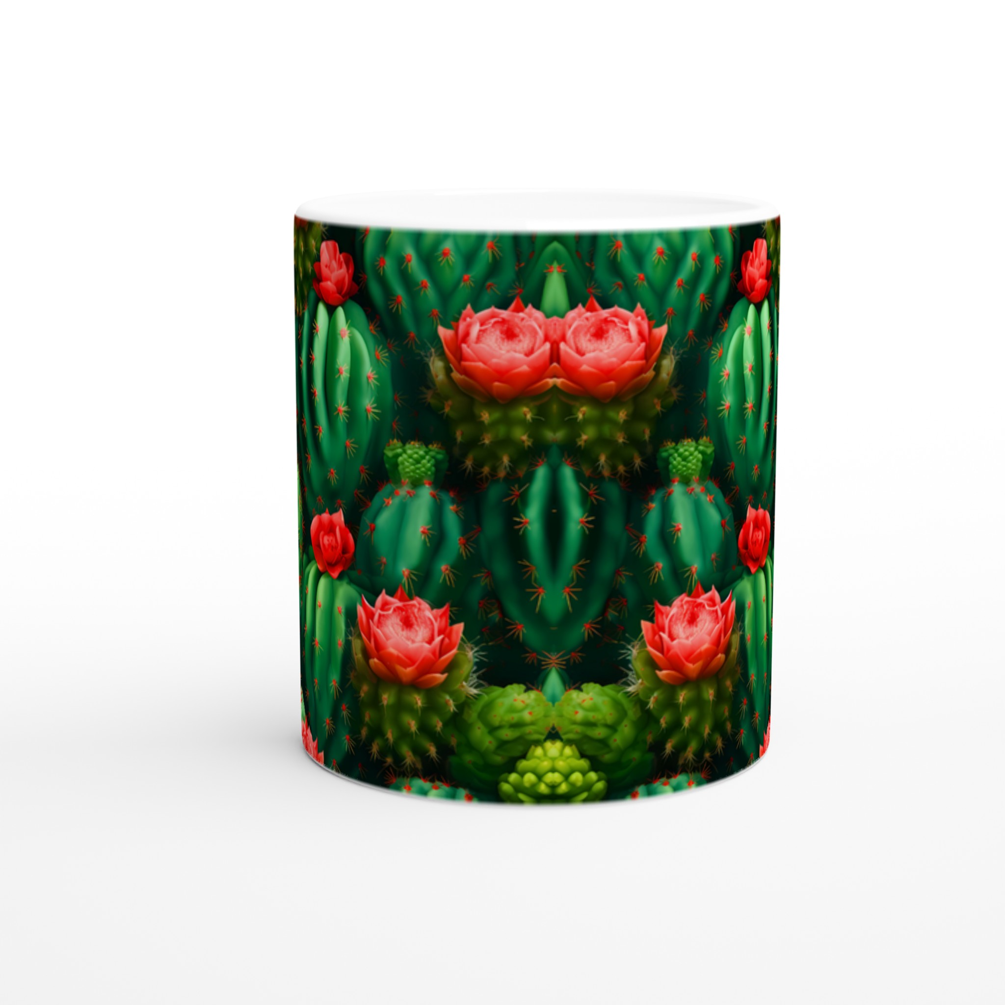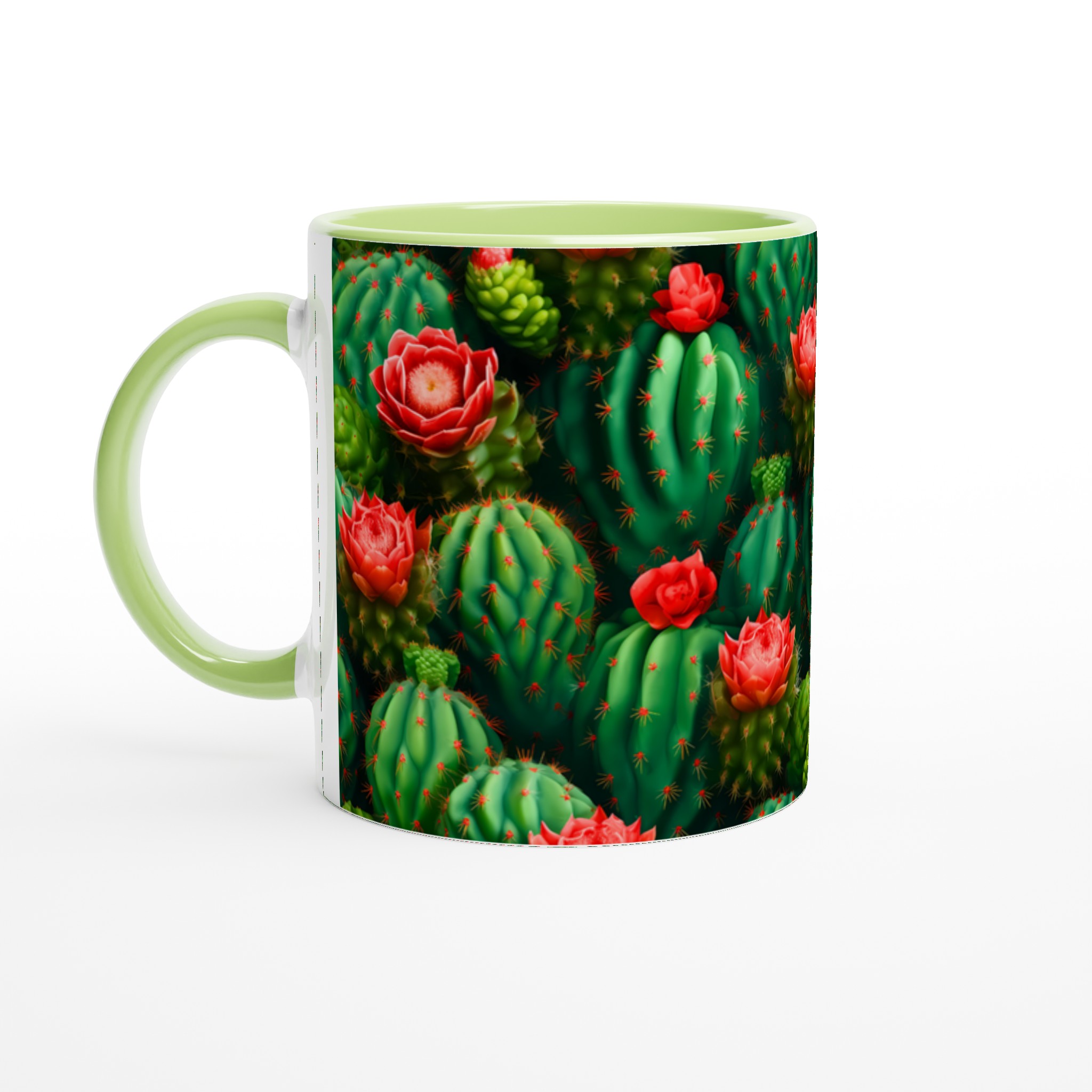 Låt din morgonkaffe, kvällste eller varma choklad blomstra med vår unika keramiska mugg, prydd med ett fantastiskt mönster av levande kaktusar och deras slående röda blommor. Inspirerad av öknens skönhet, förvandlar denna mugg varje dryckesstund till en liten flykt. Den blanka vita ytan framhäver de klara och levande färgerna med en sådan intensitet att det känns som att du håller en bit konst i handen.
