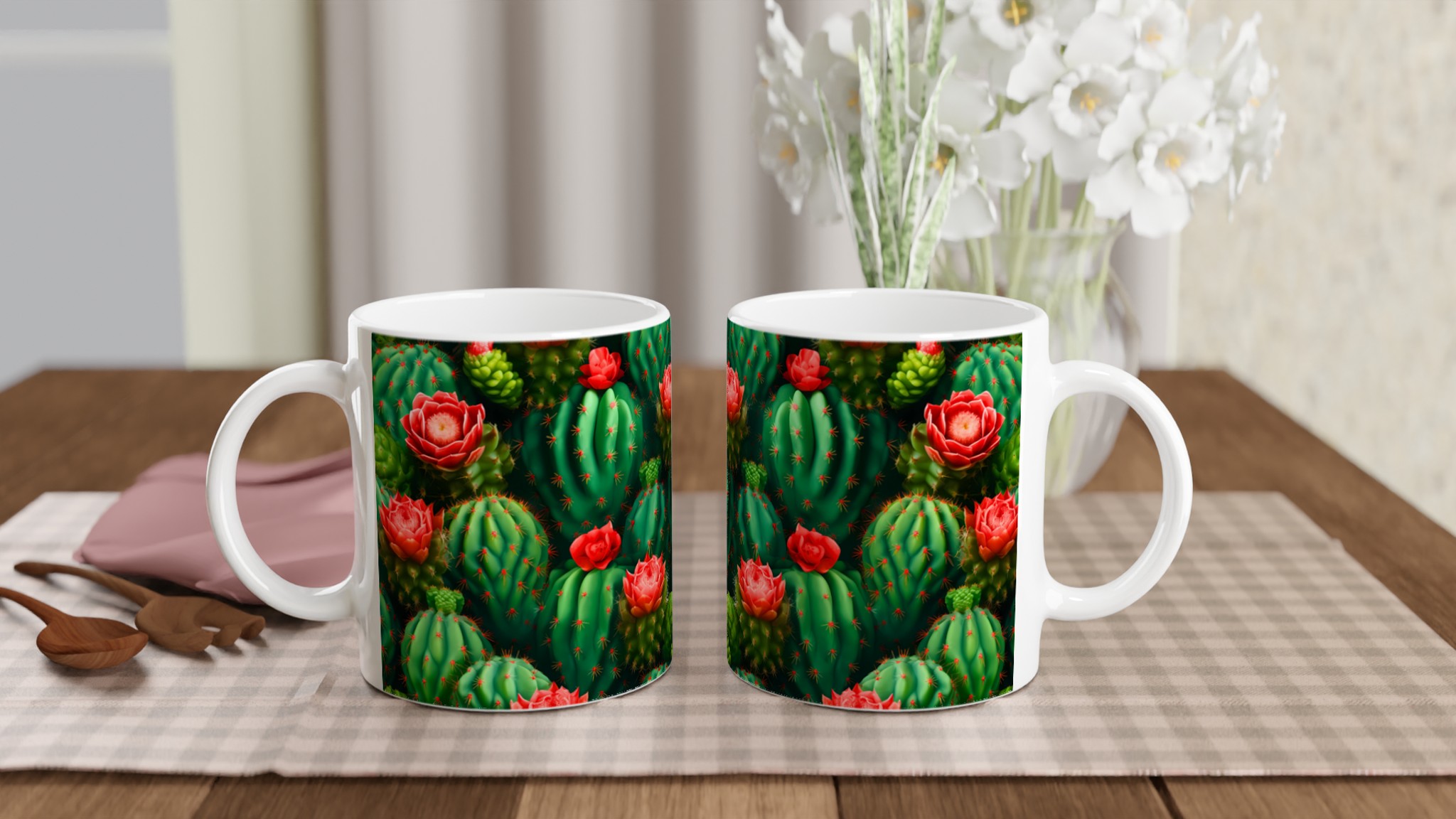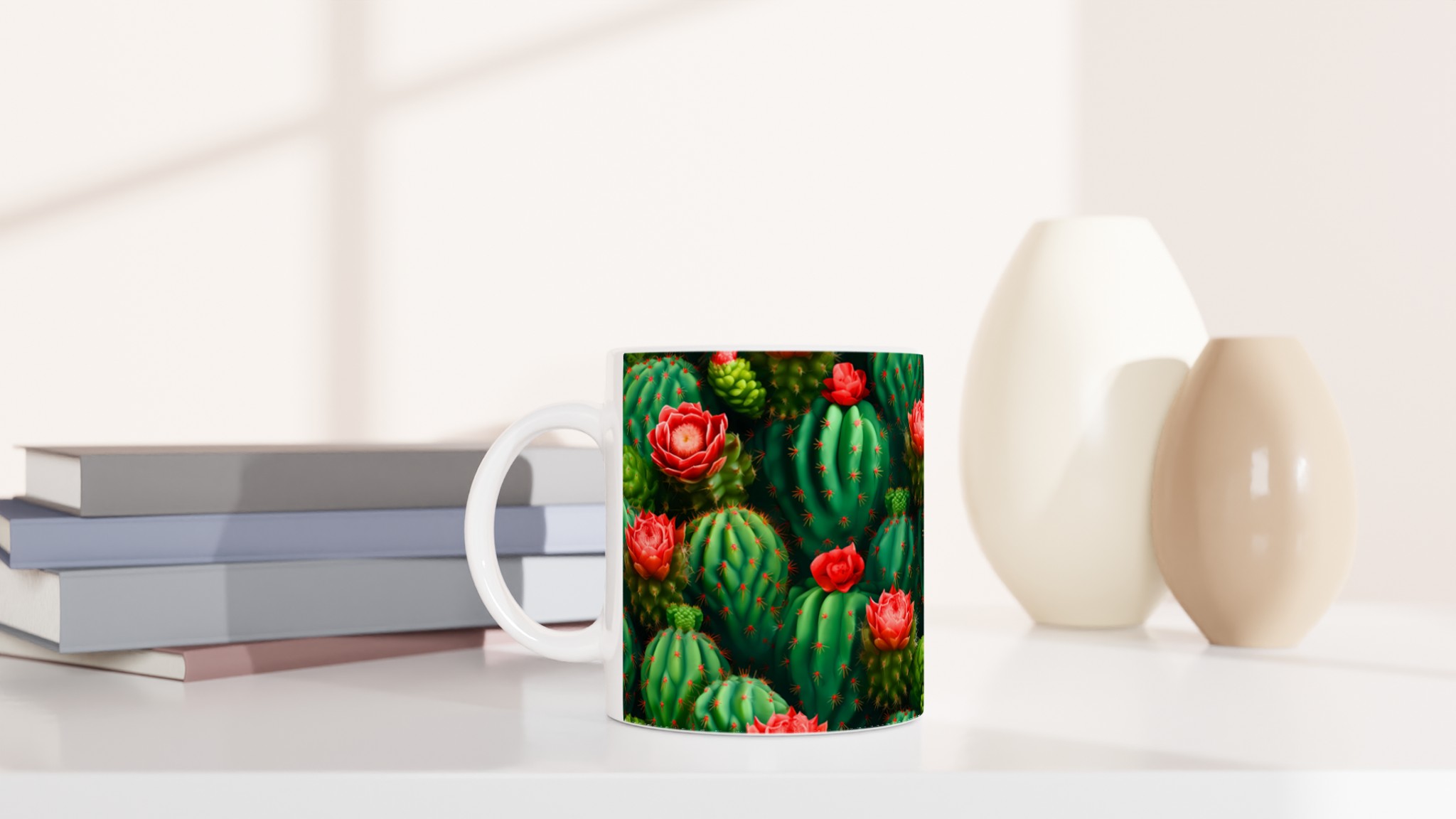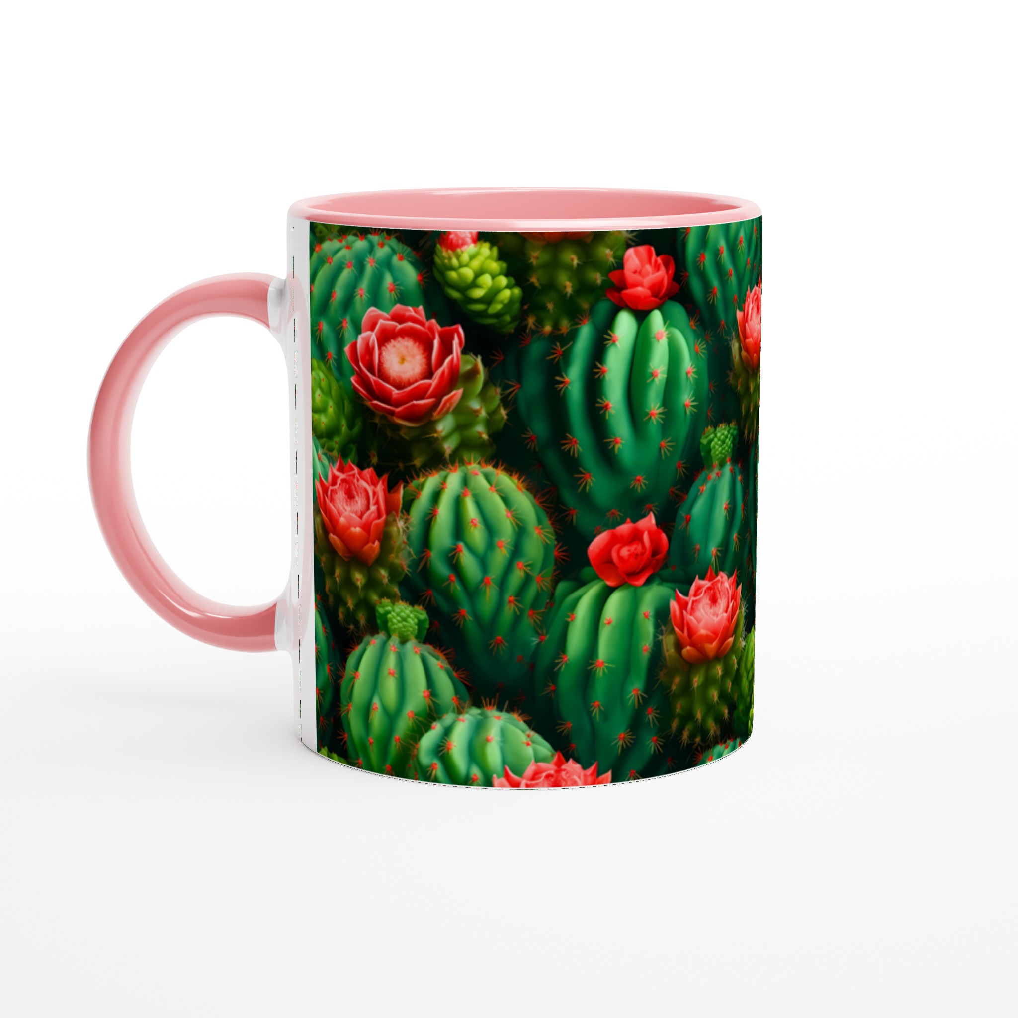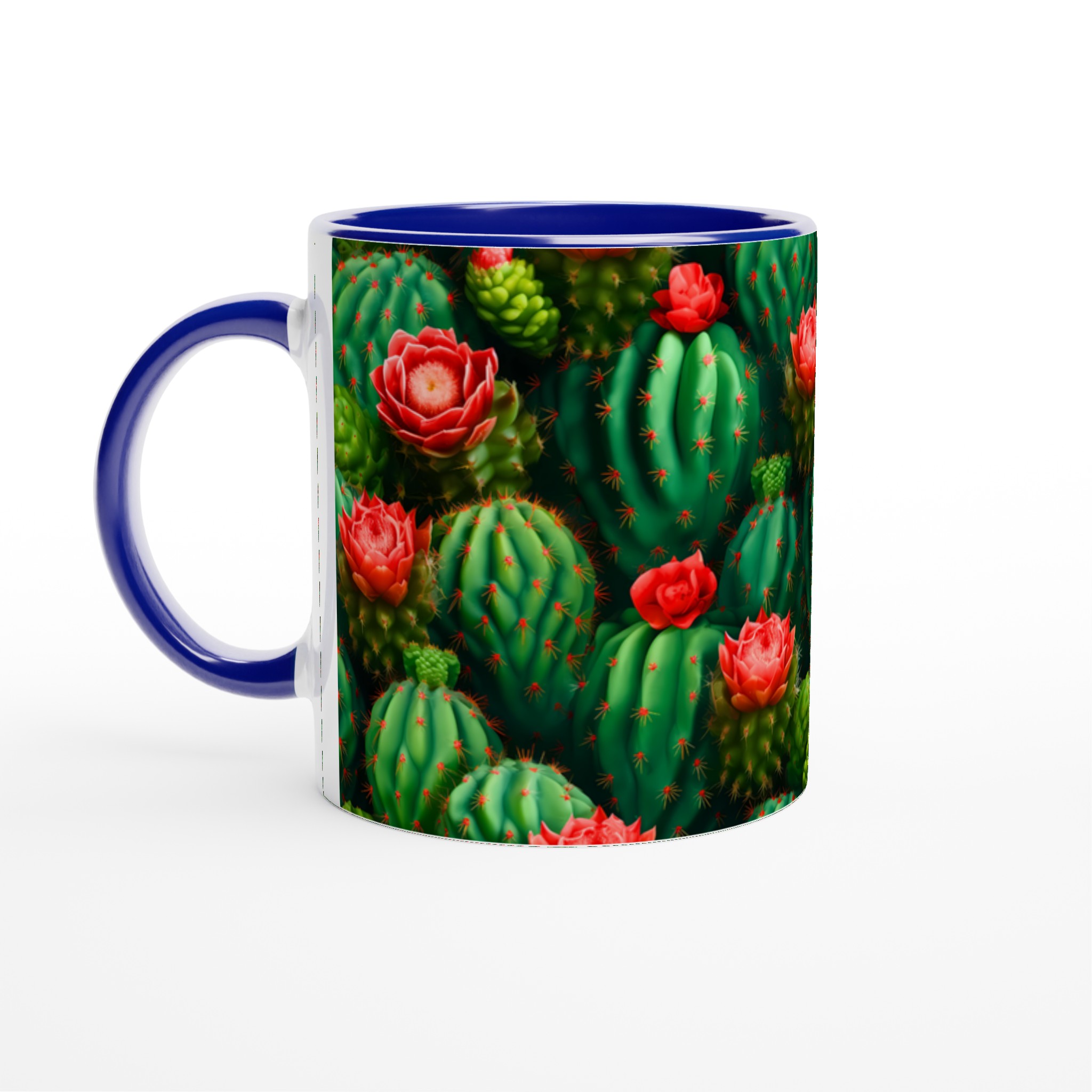 Låt din morgonkaffe, kvällste eller varma choklad blomstra med vår unika keramiska mugg, prydd med ett fantastiskt mönster av levande kaktusar och deras slående röda blommor. Inspirerad av öknens skönhet, förvandlar denna mugg varje dryckesstund till en liten flykt. Den blanka vita ytan framhäver de klara och levande färgerna med en sådan intensitet att det känns som att du håller en bit konst i handen.