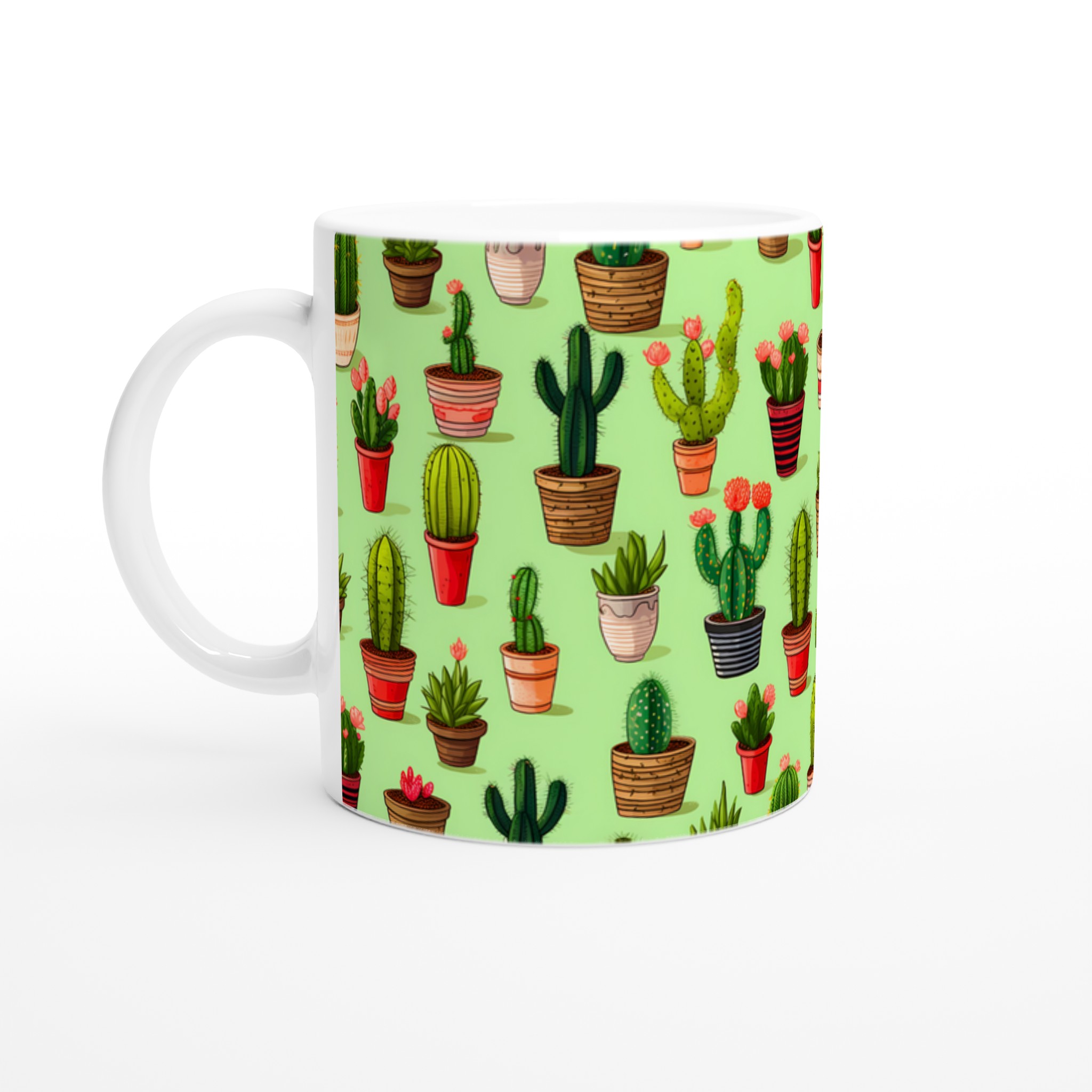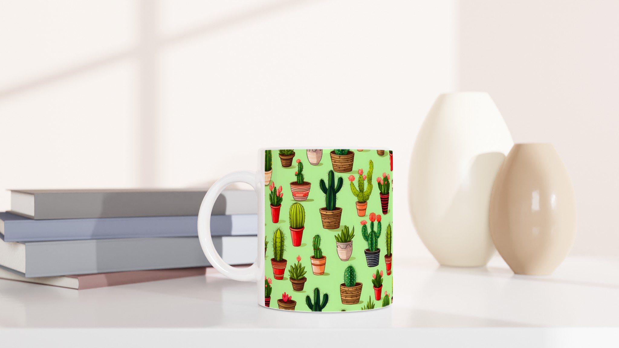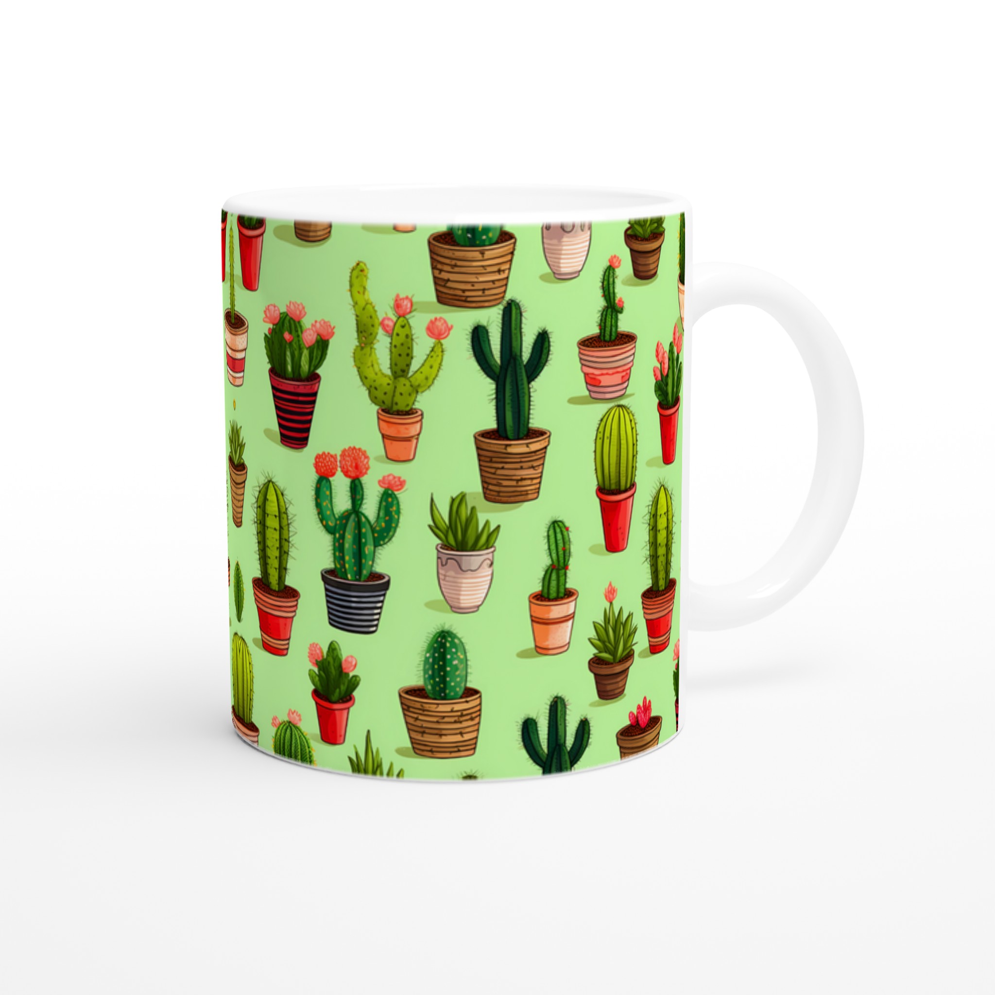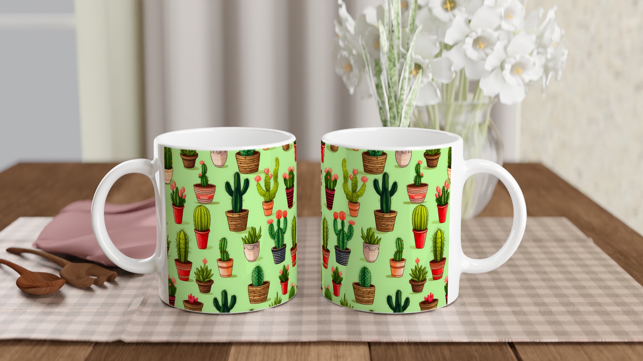 Lys upp din dag med vår charmiga keramiska mugg, prydd med ett förtjusande mönster av grönskande kaktusar och suckulenter. Denna mugg blir snabbt en vardagsfavorit för alla tillfällen, perfekt för att starta morgonen med kaffe, mysa med varm choklad på kvällen eller njuta av en lugn kopp te. Den blanka vita ytan låter det livfulla kaktusmotivet framträda med klara och levande färger som håller sig fina, även efter otaliga turer i mikron och diskmaskinen.
