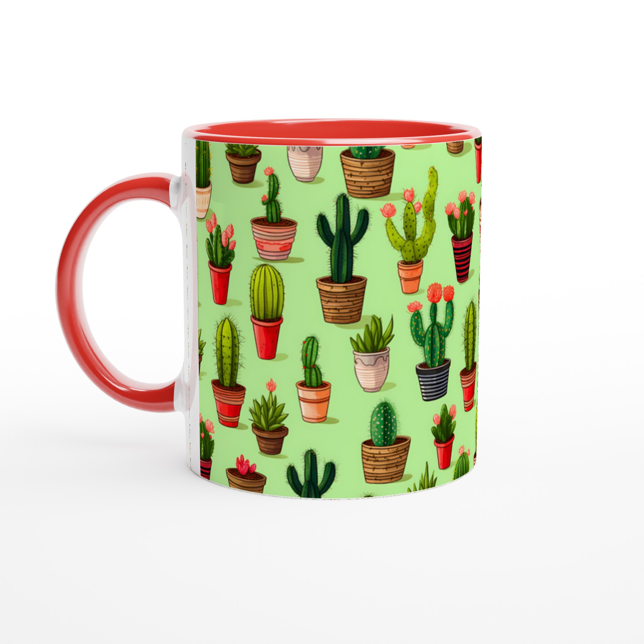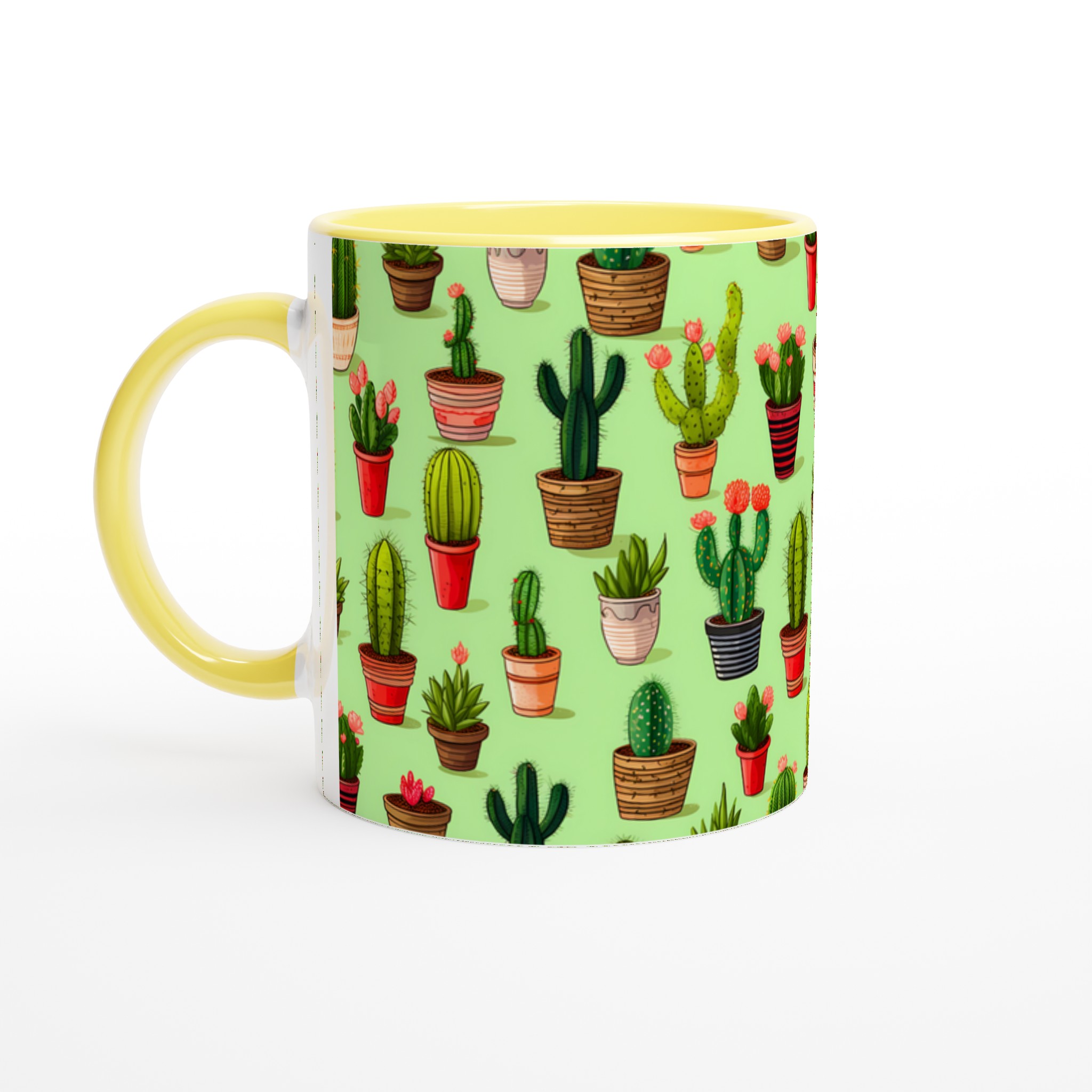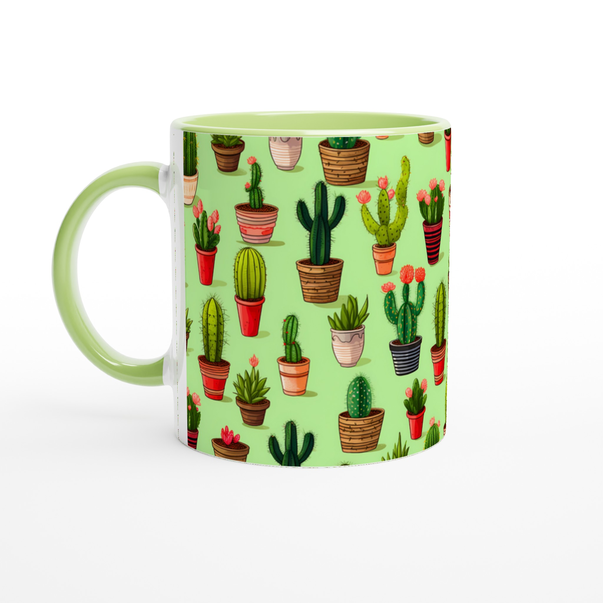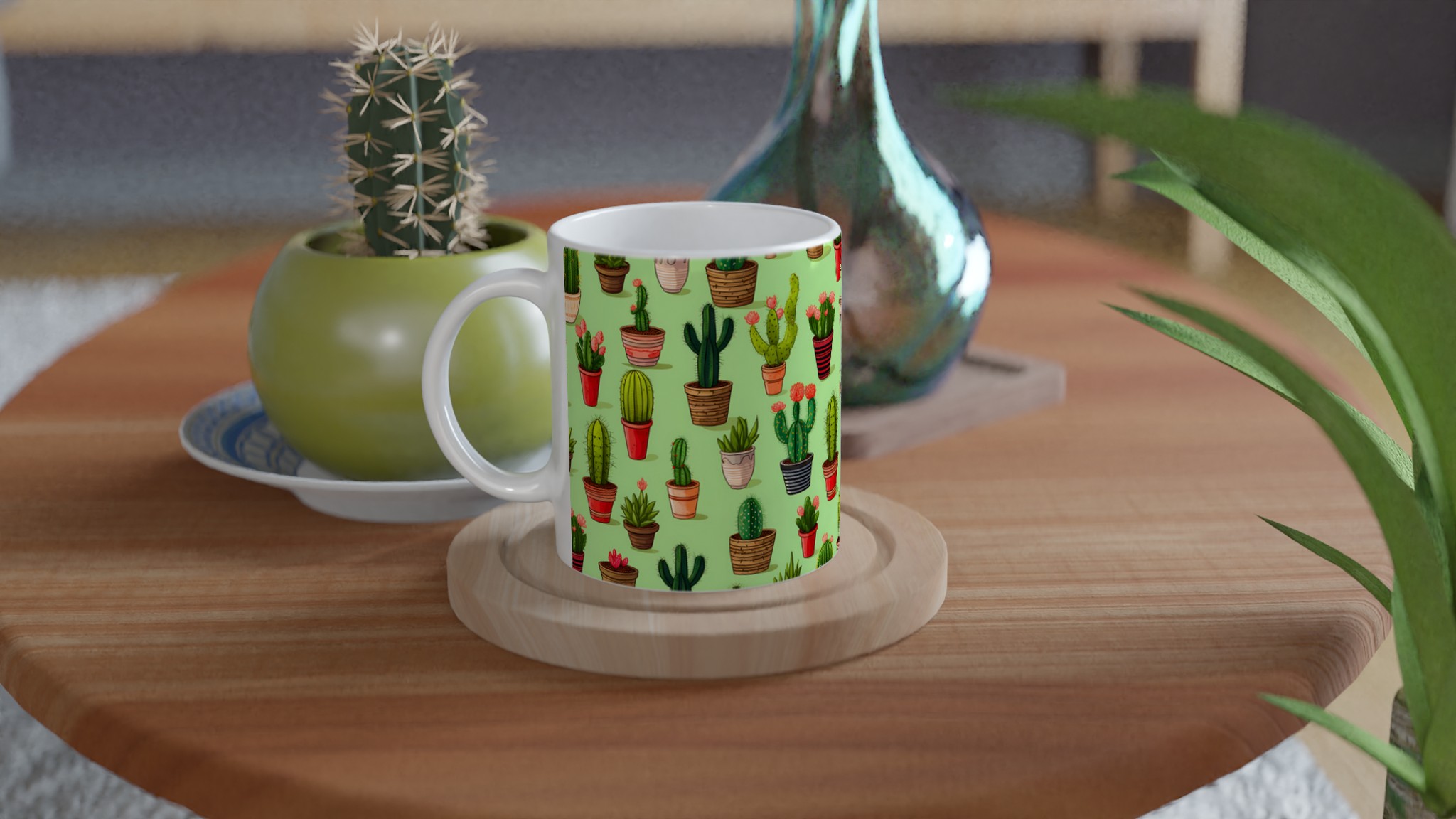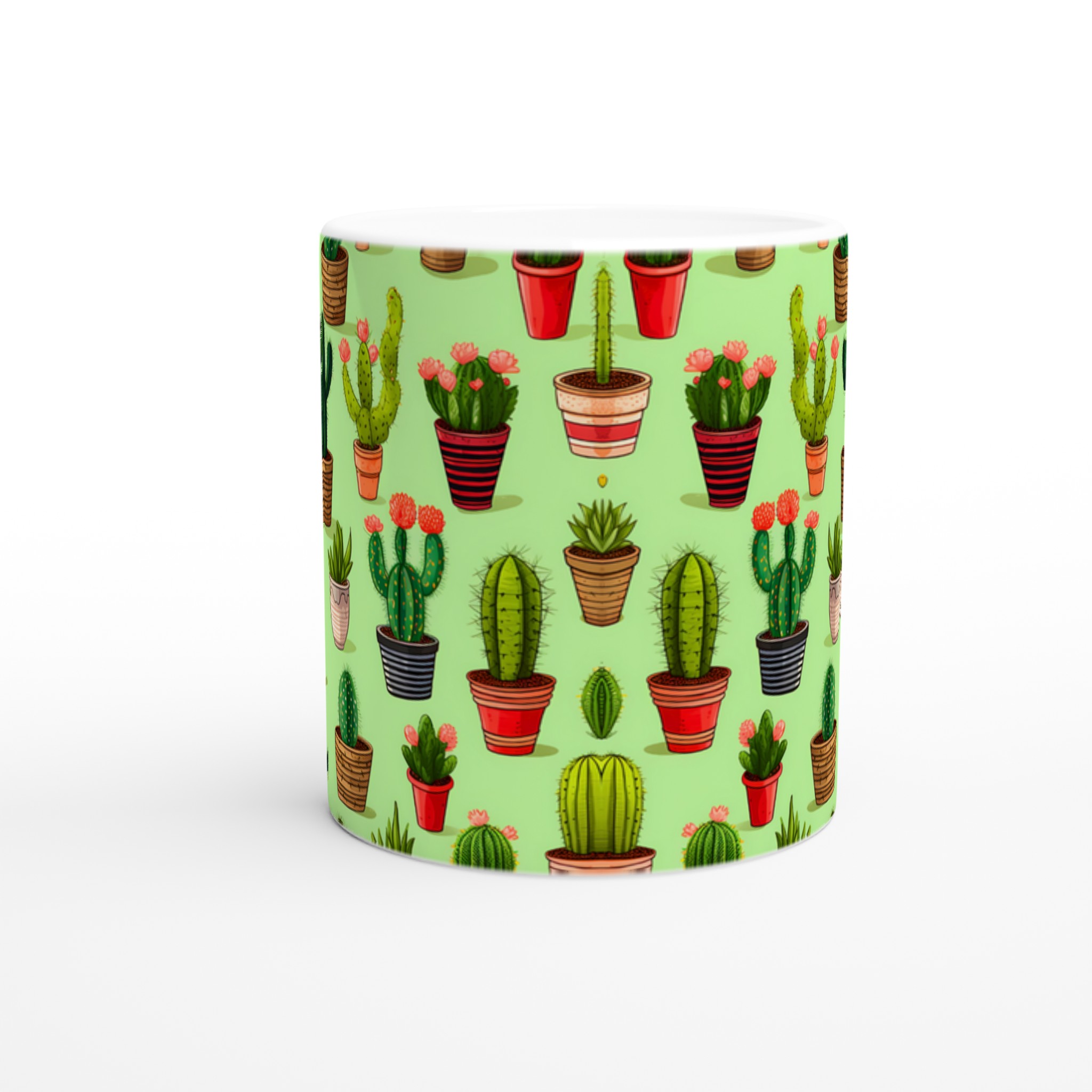 Lys upp din dag med vår charmiga keramiska mugg, prydd med ett förtjusande mönster av grönskande kaktusar och suckulenter. Denna mugg blir snabbt en vardagsfavorit för alla tillfällen, perfekt för att starta morgonen med kaffe, mysa med varm choklad på kvällen eller njuta av en lugn kopp te. Den blanka vita ytan låter det livfulla kaktusmotivet framträda med klara och levande färger som håller sig fina, även efter otaliga turer i mikron och diskmaskinen.