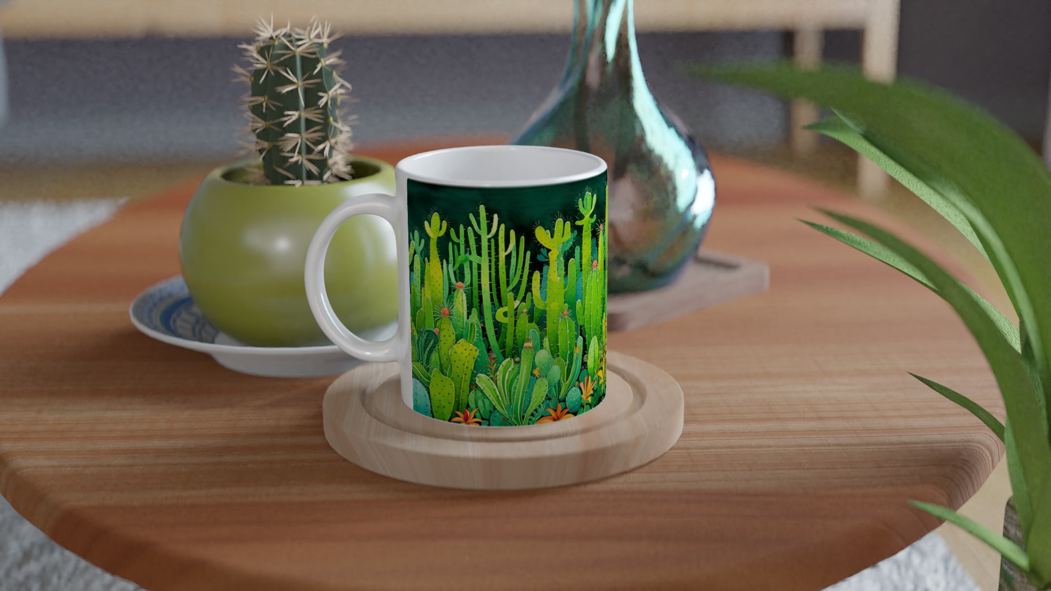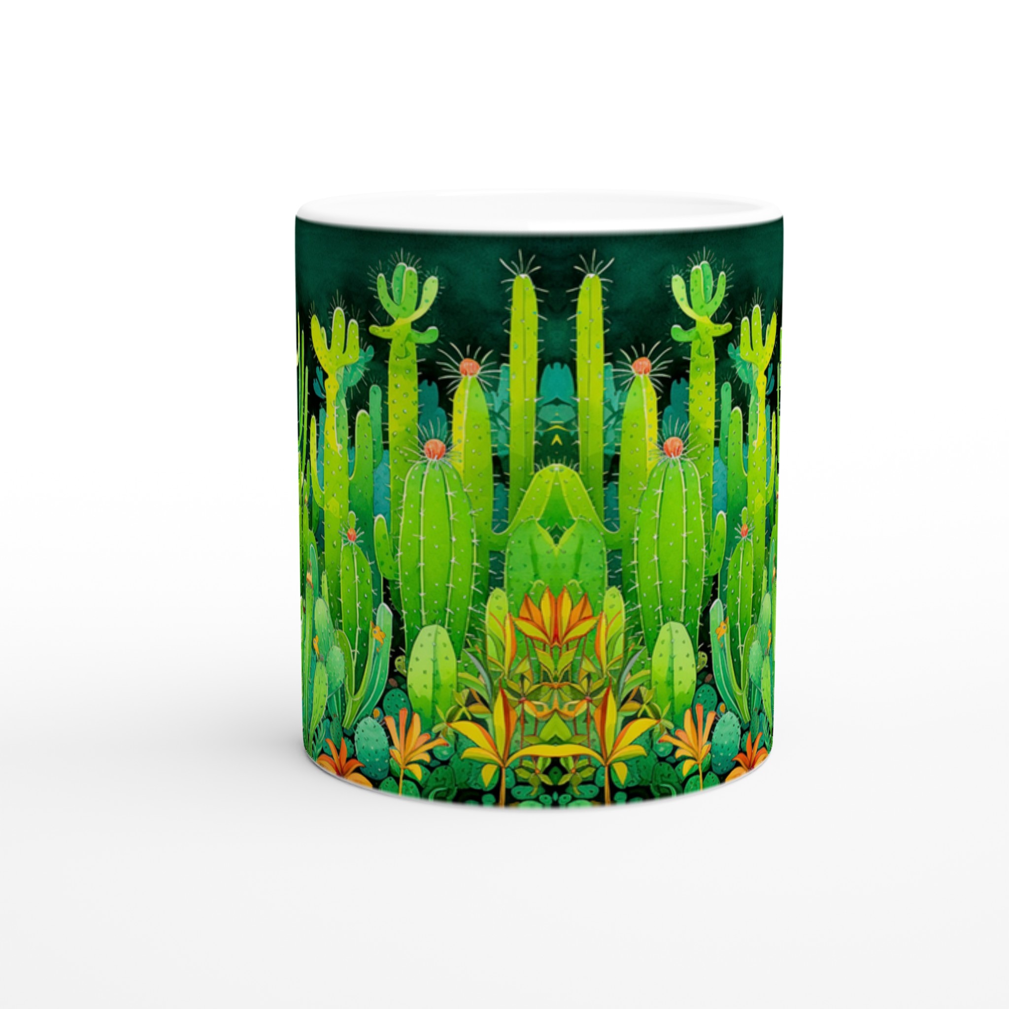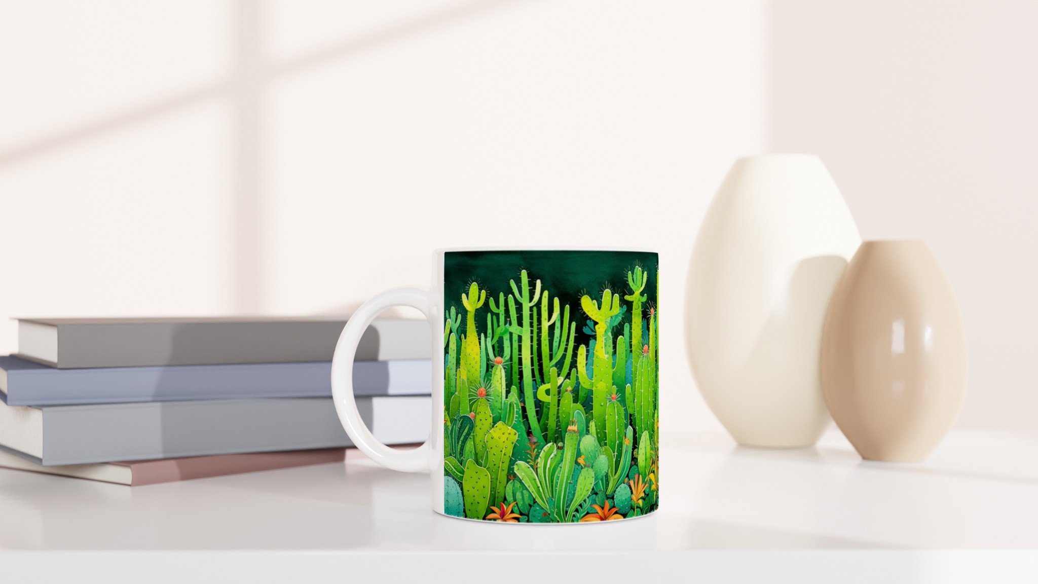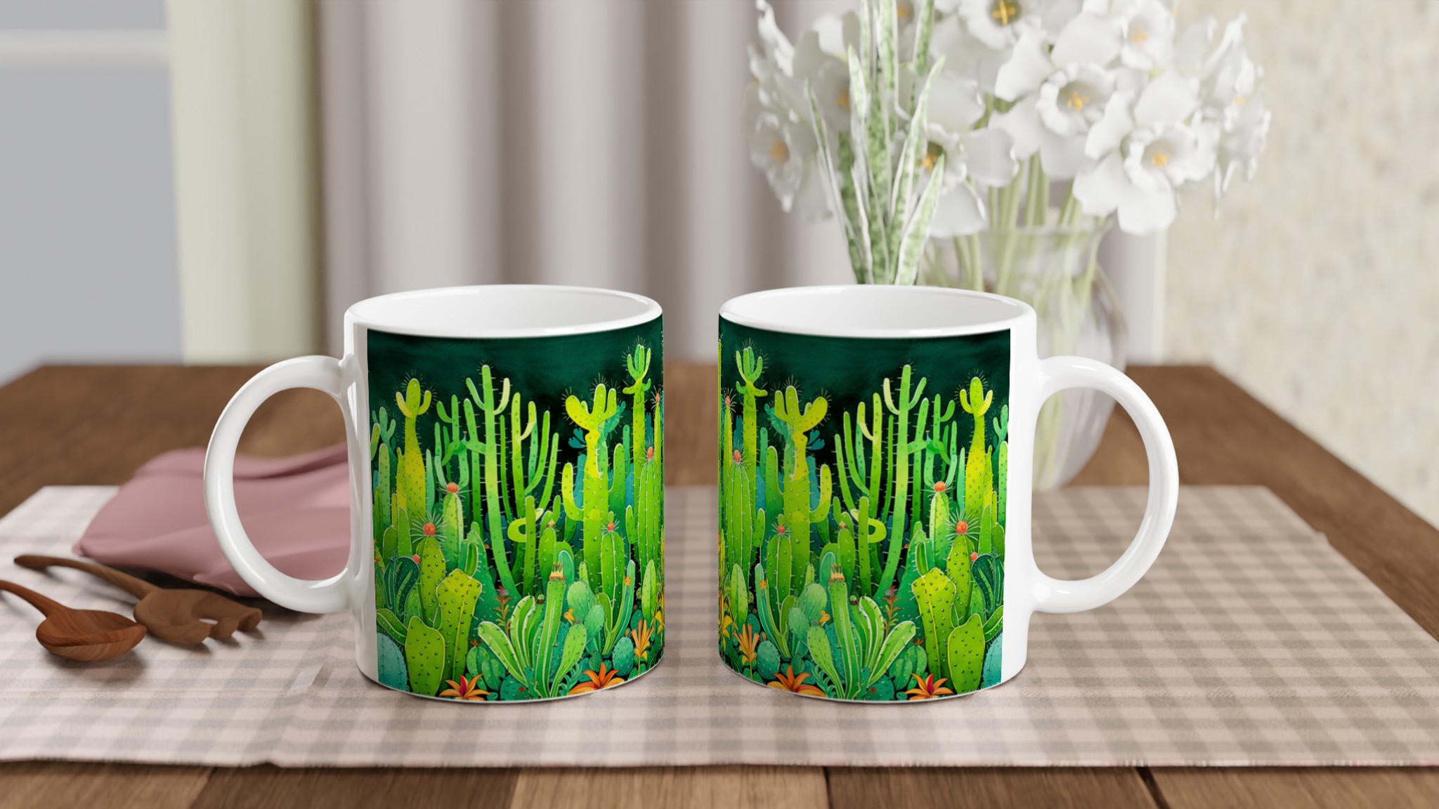 Låt den lummiga kaktusträdgårdens vibrerande gröna nyanser och lekfulla orange blommor liva upp din fikapaus. Den här stilrena keramiska muggen blir snabbt en vardagsfavorit, perfekt för morgonkaffet, kvällens varma choklad eller när du bara vill njuta av en kopp te. Den blanka vita ytan gör att trycken framhävs med klara och levande färger, som håller sig fina även efter många turer i mikron och diskmaskinen.