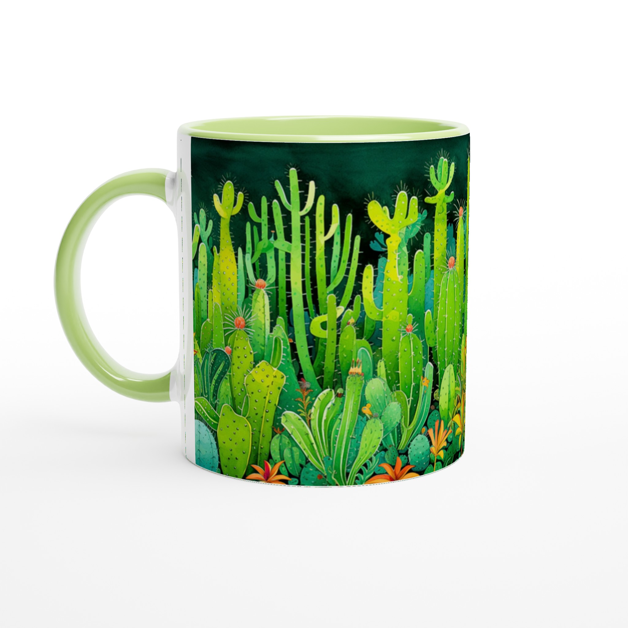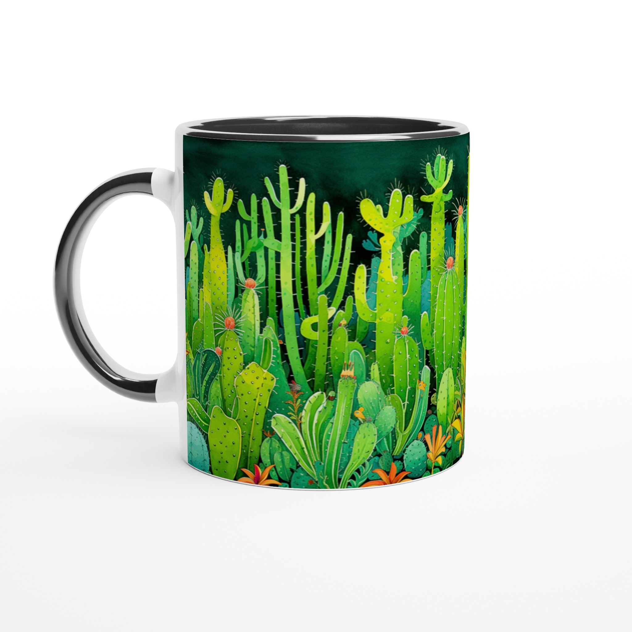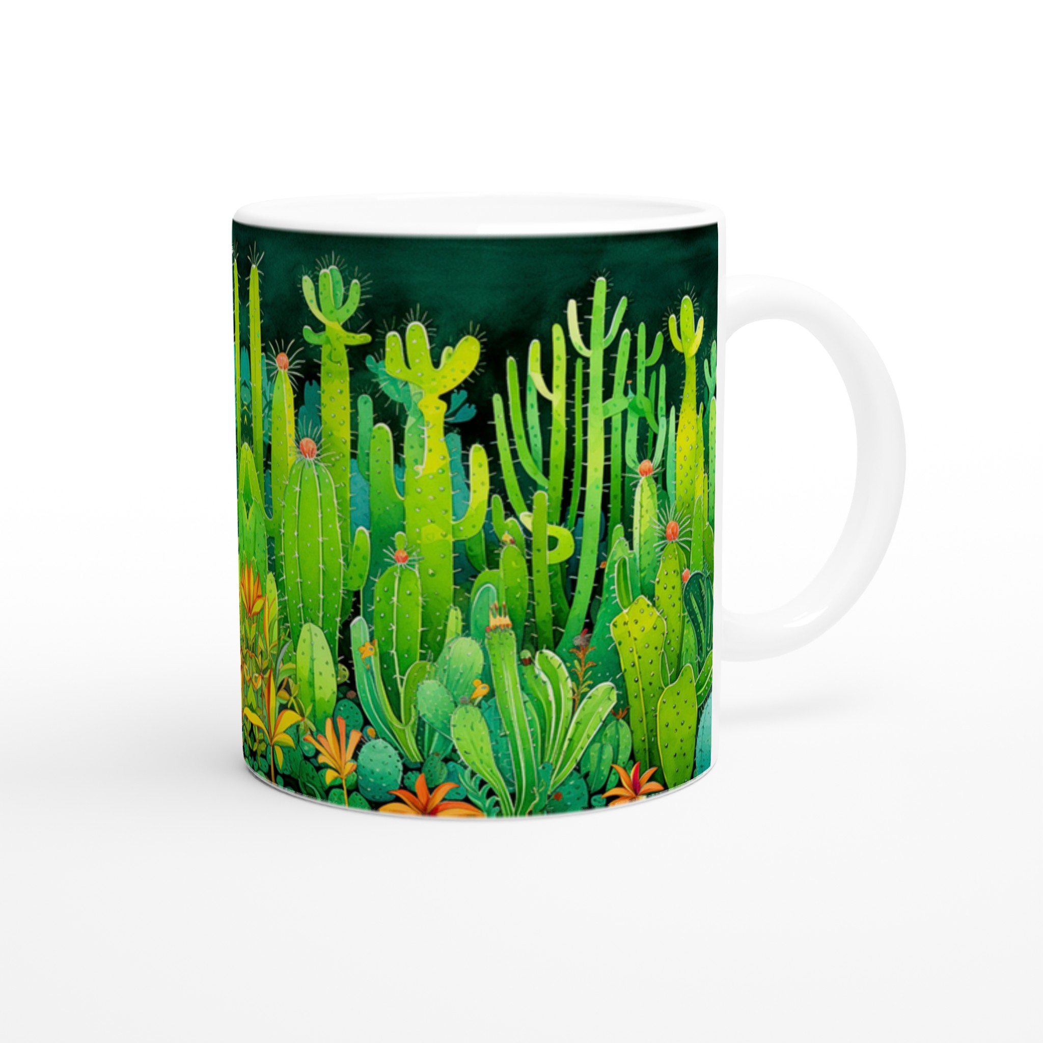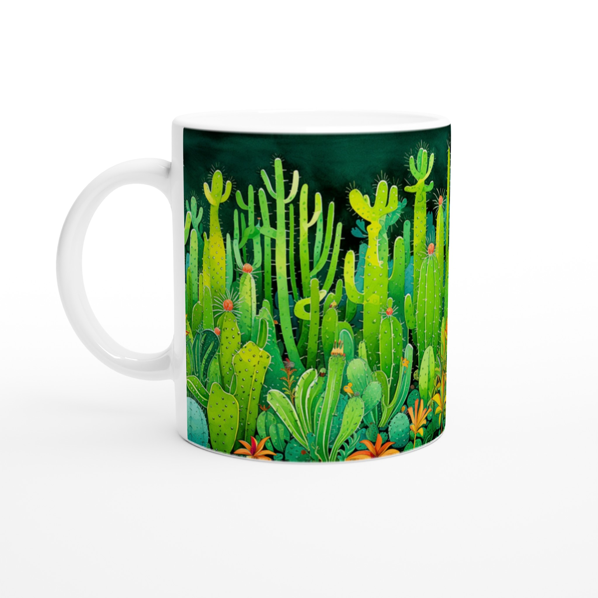 Låt den lummiga kaktusträdgårdens vibrerande gröna nyanser och lekfulla orange blommor liva upp din fikapaus. Den här stilrena keramiska muggen blir snabbt en vardagsfavorit, perfekt för morgonkaffet, kvällens varma choklad eller när du bara vill njuta av en kopp te. Den blanka vita ytan gör att trycken framhävs med klara och levande färger, som håller sig fina även efter många turer i mikron och diskmaskinen.