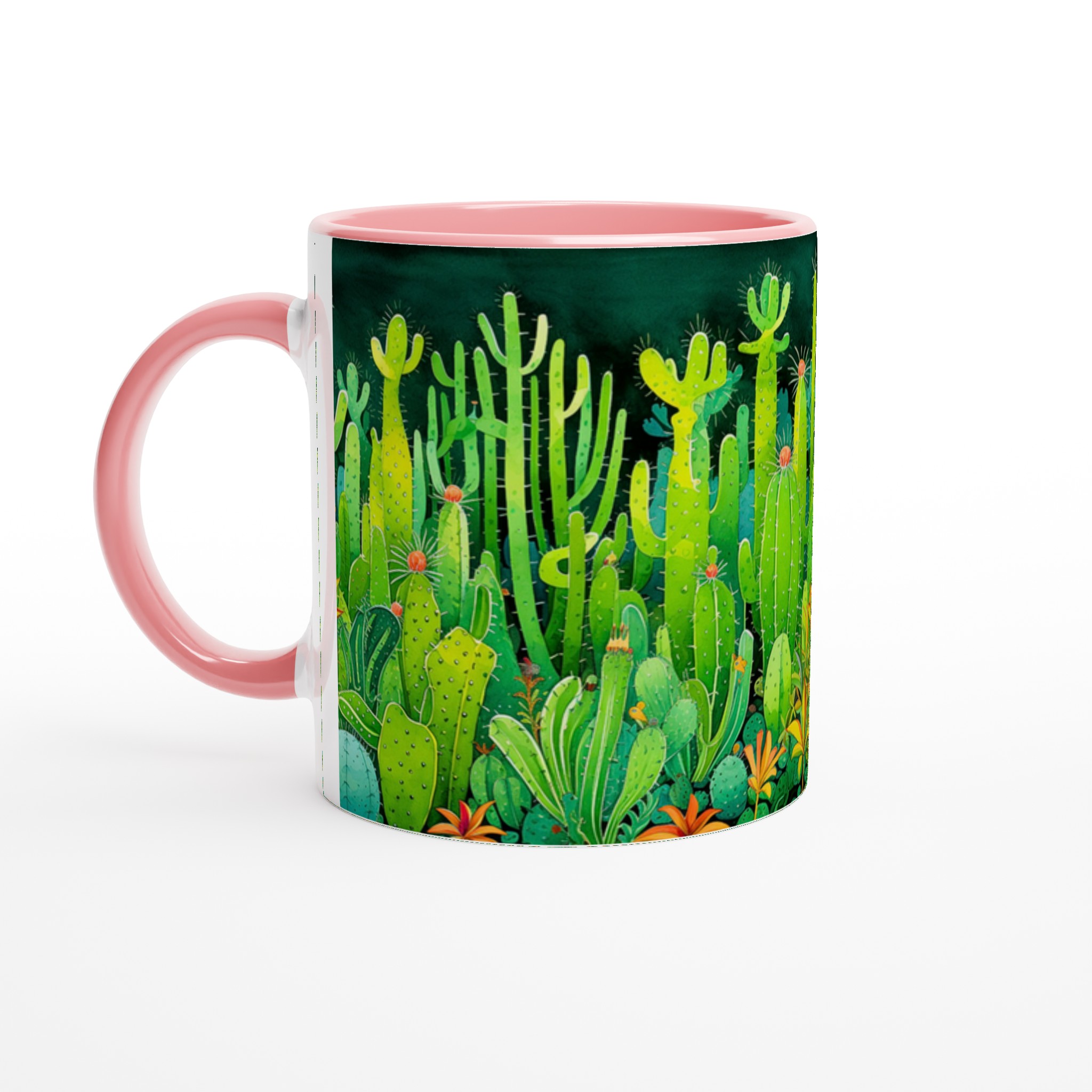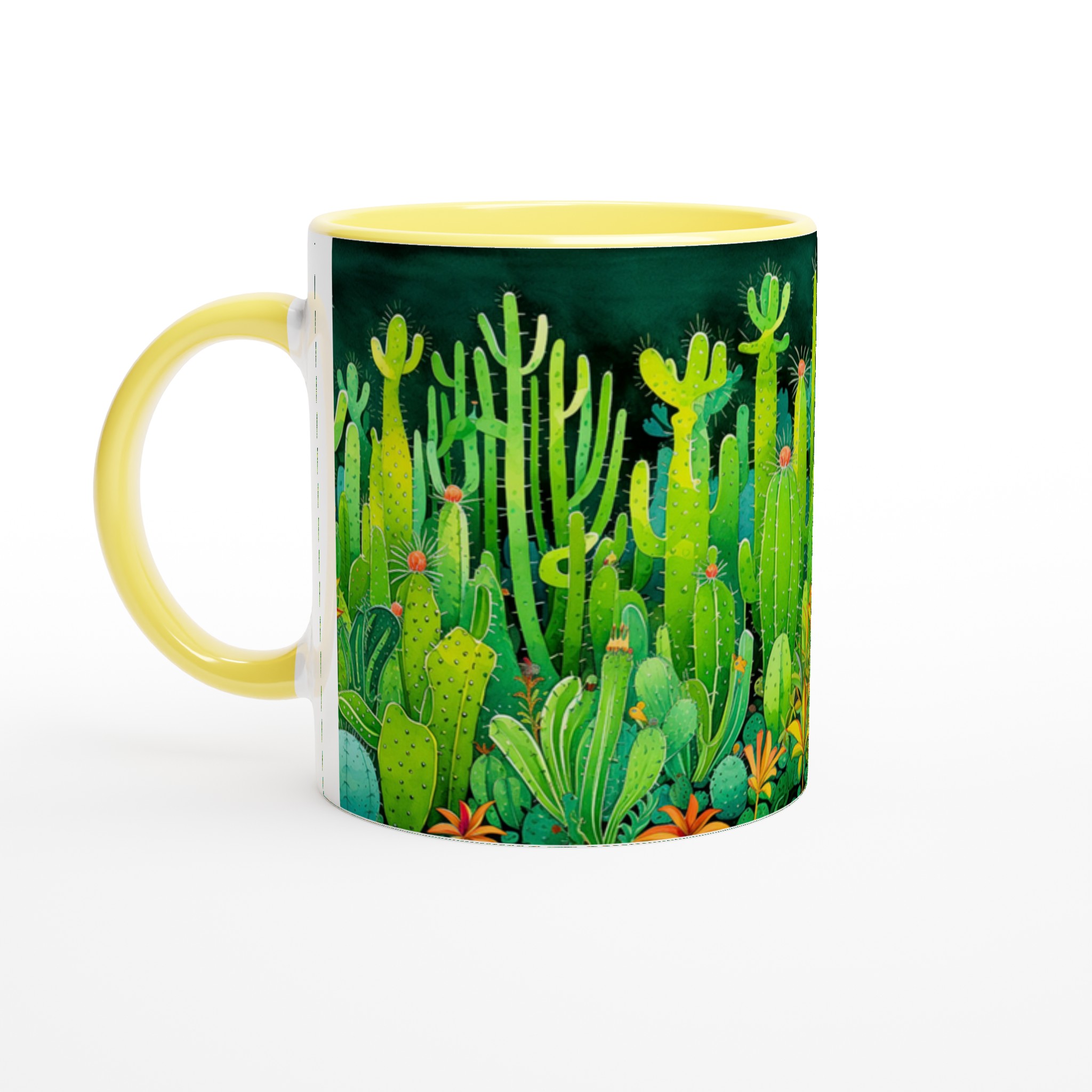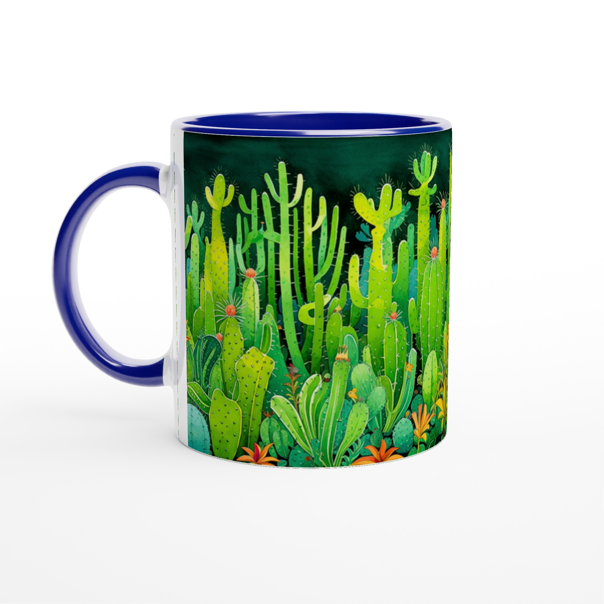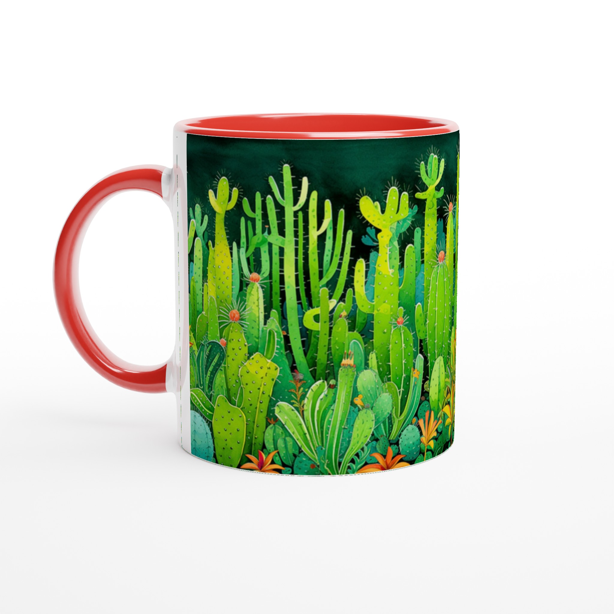 Låt den lummiga kaktusträdgårdens vibrerande gröna nyanser och lekfulla orange blommor liva upp din fikapaus. Den här stilrena keramiska muggen blir snabbt en vardagsfavorit, perfekt för morgonkaffet, kvällens varma choklad eller när du bara vill njuta av en kopp te. Den blanka vita ytan gör att trycken framhävs med klara och levande färger, som håller sig fina även efter många turer i mikron och diskmaskinen.