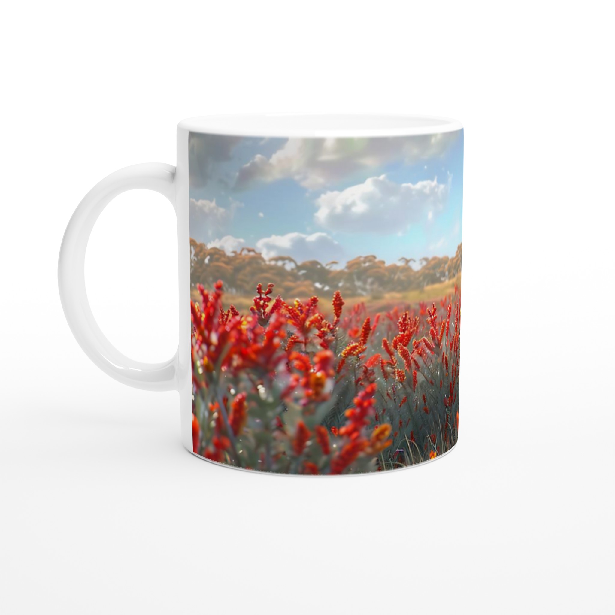 För att verkligen göra din mugg unik, kan du välja bland sju fantastiska keramiska färger: klassisk Ceramic White, solig Ceramic Yellow, charmig Ceramic Pink, fräsch Ceramic Green, passionerad Ceramic Red, elegant Ceramic Black eller lugnande Ceramic Blue. Varje färg framhäver trycket av kängurun i vallmofältet på sitt eget sätt, vilket gör varje mugg till ett konstverk.