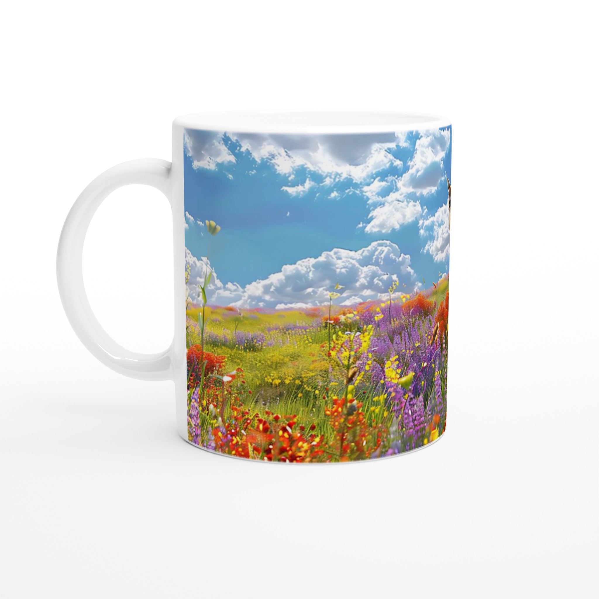 Inspirerad av den livfulla bilden av en känguru som hoppar genom en blommande våräng under en klarblå himmel, fångar denna mugg naturens glädje och energi. Den blanka vita ytan ger ett skarpt och levande tryck som verkligen sticker ut, oavsett om det är en personlig design, ett roligt citat eller en present till någon du tycker om.