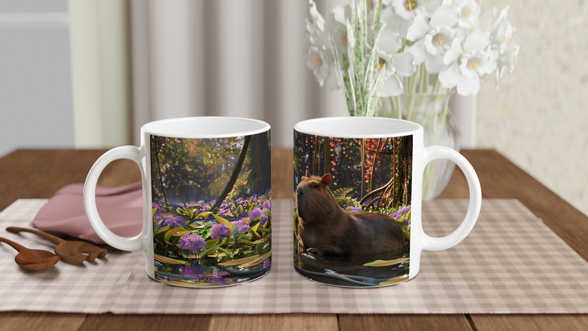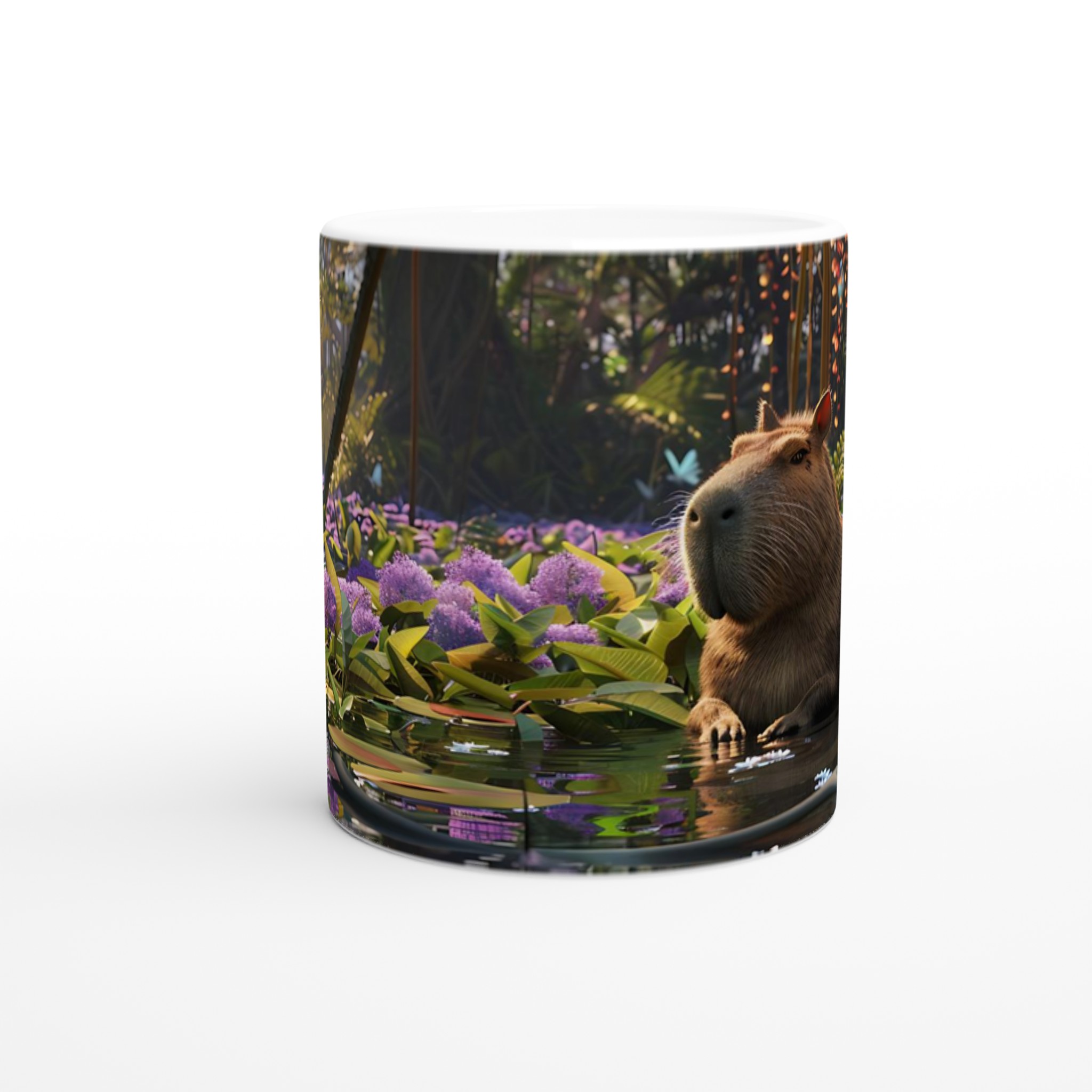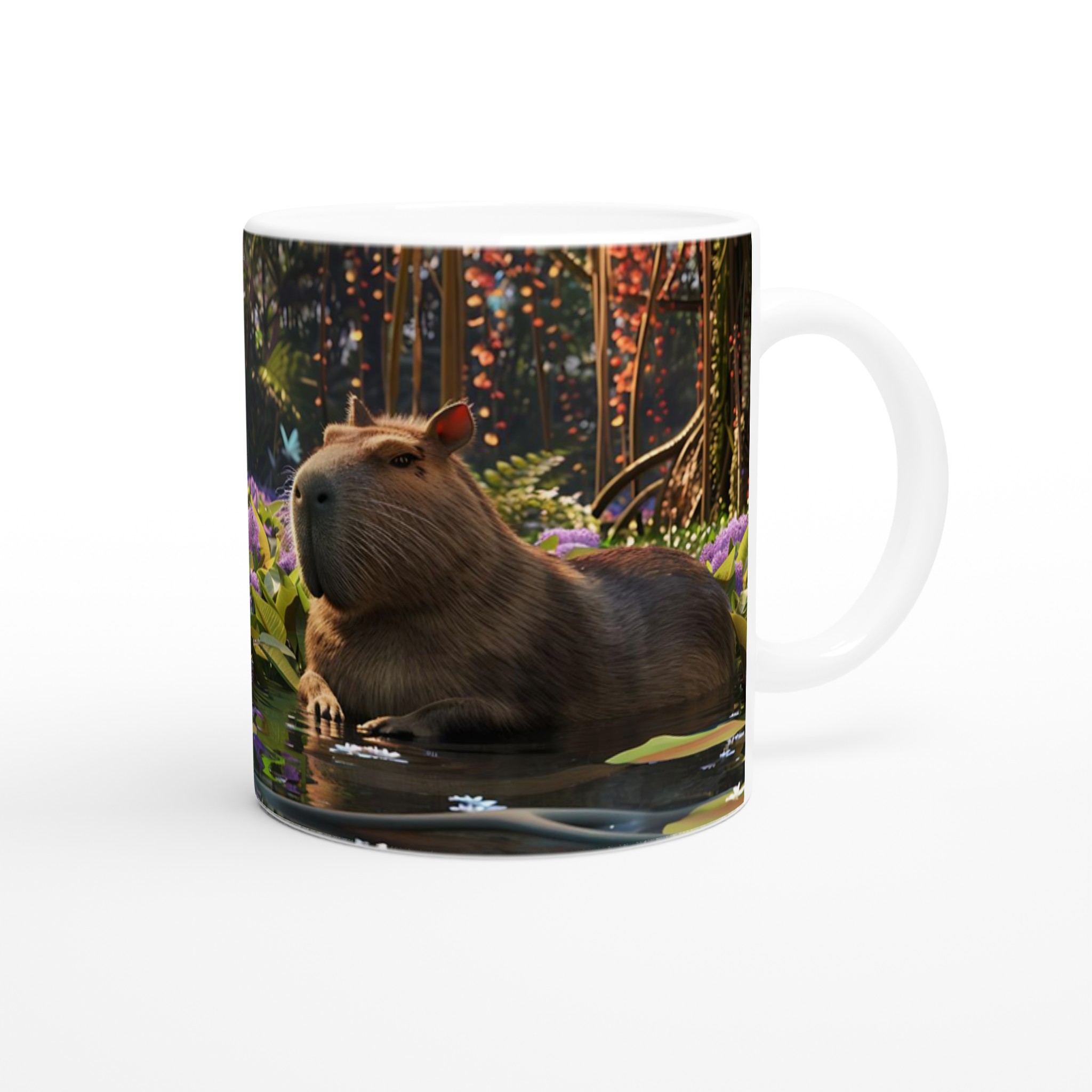 Fånga lugnet och charmen från djungelns hjärta med vår unika keramiska mugg, prydd med en förtrollande bild av en kapybara som vilar fridfullt bland lila blommor och flytande näckrosor. Denna stilrena keramiska mugg blir snabbt en vardagsfavorit, perfekt för morgonkaffet, kvällens varma choklad eller när du bara vill njuta av en kopp te.