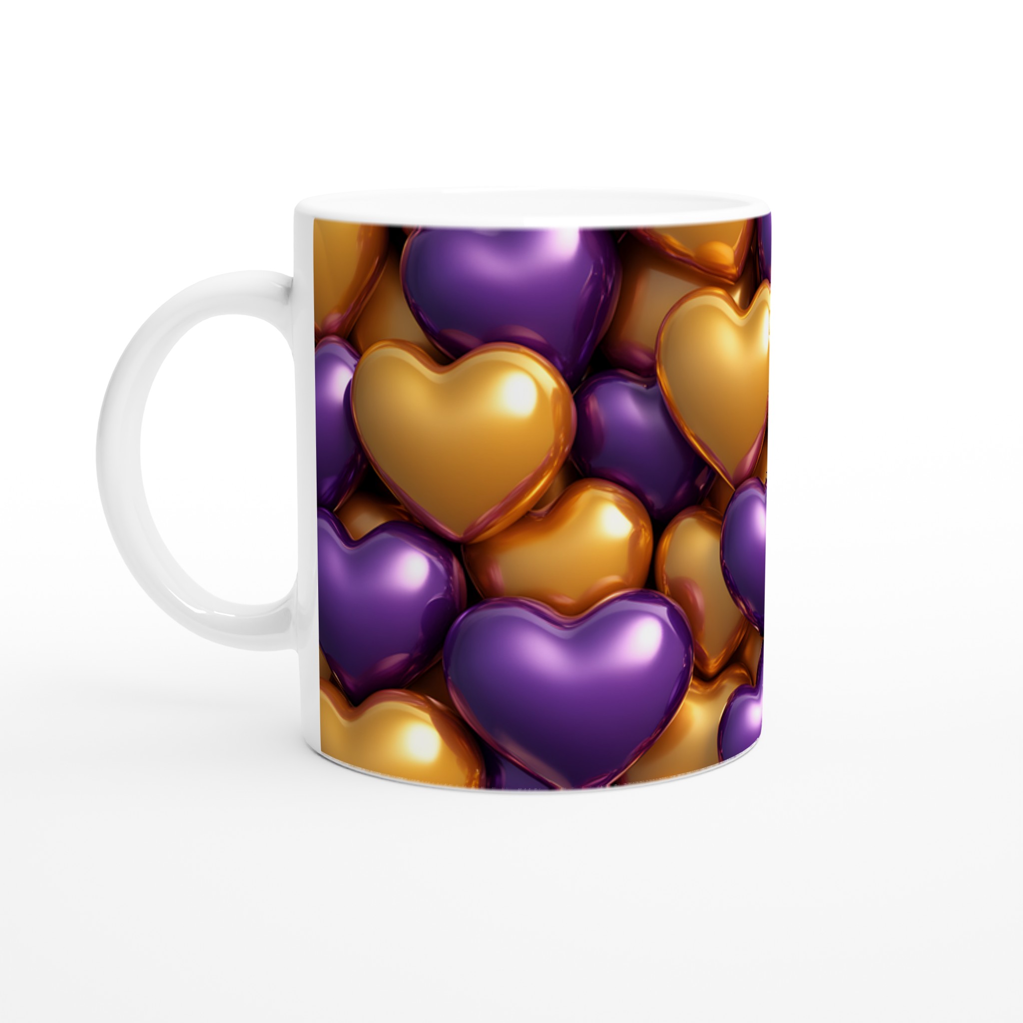 Fira kärleken i varje klunk med vår fantastiska keramiska mugg, prydd med en glänsande design av guld- och lila hjärtan. Denna mugg är inte bara en dryckesbehållare, utan en daglig påminnelse om värme och uppskattning, perfekt för att lysa upp morgonkaffet, en lugnande kopp te eller en lyxig varm choklad.
