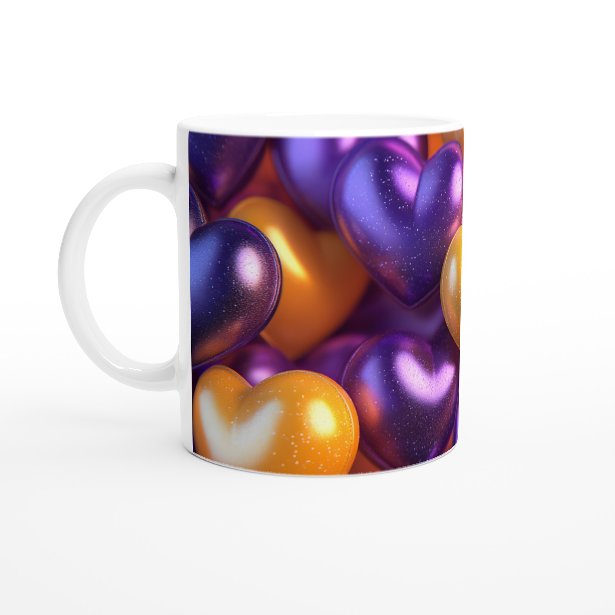 Fånga magin i varje sipp med vår förtrollande keramikmugg, prydd med ett glittrande motiv av hjärtan i skimrande guld och djuplila nyanser. Denna mugg är inte bara en behållare för din favoritdryck, utan en hyllning till kärlekens glans och lyx. Den blanka vita ytan låter det gnistrande trycket framträda med en livfullhet som förgyller varje morgonkaffe, tebjudning eller mysig stund med varm choklad. Varje hjärta strålar med en känsla av lycka och elegans, vilket gör denna mugg till en riktig stämningshöjare i vardagen.