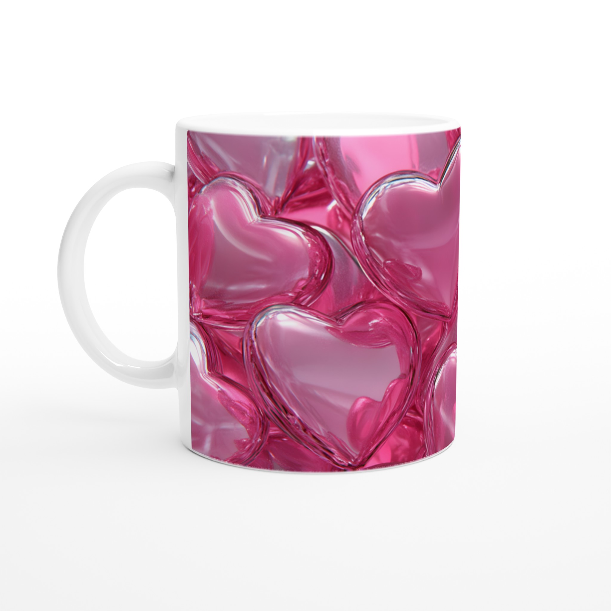 Fyll varje stund med värme och kärlek med denna underbara keramikmugg. Inspirerad av en dröm i rosa, med glänsande hjärtan som fångar ljuset, är denna mugg mer än bara ett kärl – den är en känsla. Perfekt för ditt morgonkaffe, en lugnande kopp te eller en lyxig varm choklad, den blanka vita ytan gör att det charmiga hjärtmotivet framträder klart och färgstarkt, vilket gör den till en riktig favorit i vardagen.