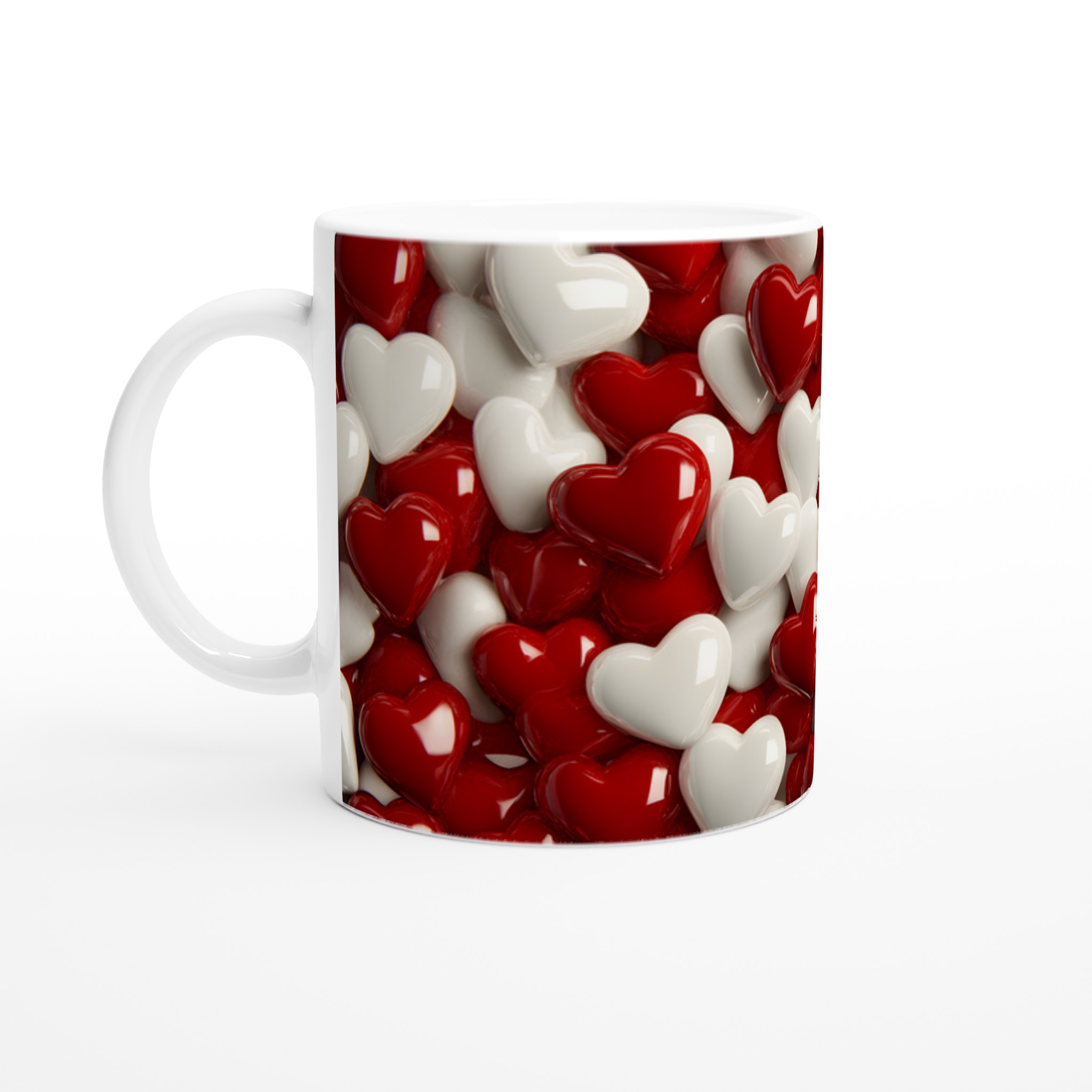 Fyll din dag med kärlek med denna stilrena och vackra keramikmugg, prydd med en lekfull blandning av glänsande röda och vita hjärtan. Perfekt för alla dagens stunder – morgonkaffet, en värmande kopp te eller en härlig varm choklad. Den blanka vita ytan gör att trycken framträder klart och färgstarkt, vilket gör muggen till en riktig favorit i vardagen. Varje hjärta strålar med en känsla av glädje och romantik, vilket gör varje klunk till en liten påminnelse om kärlekens kraft.