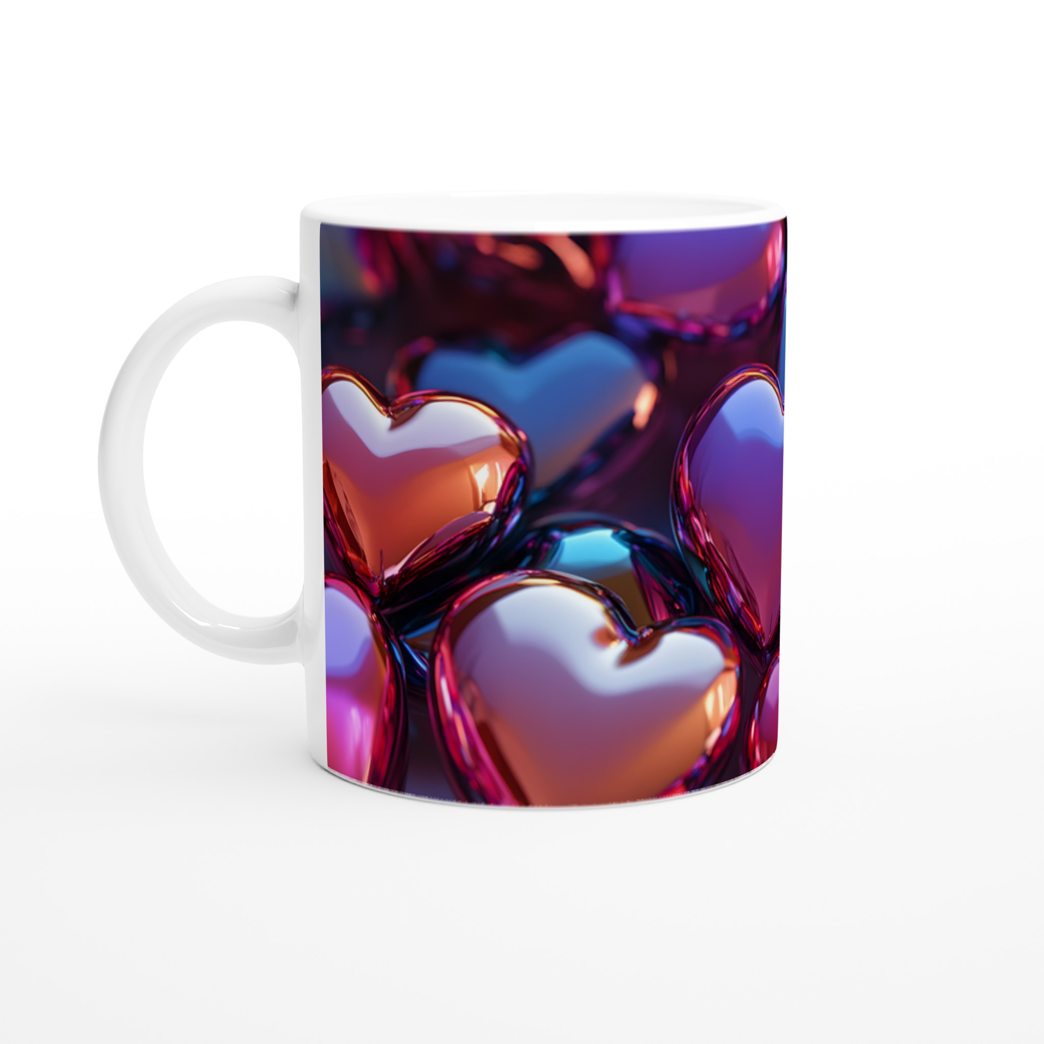 Fånga kärlekens glöd varje dag med denna förtrollande keramikmugg, prydd med en levande symfoni av glänsande, metalliska hjärtan i skimrande nyanser av lila, rosa och blått. Dess hypnotiserande design reflekterar ljuset och skapar en känsla av lekfull lyx, perfekt för att förgylla dina stunder med kaffe, te eller varm choklad. Varje sipp blir en påminnelse om passion och glädje, insvept i en mugg som är lika unik som du är.