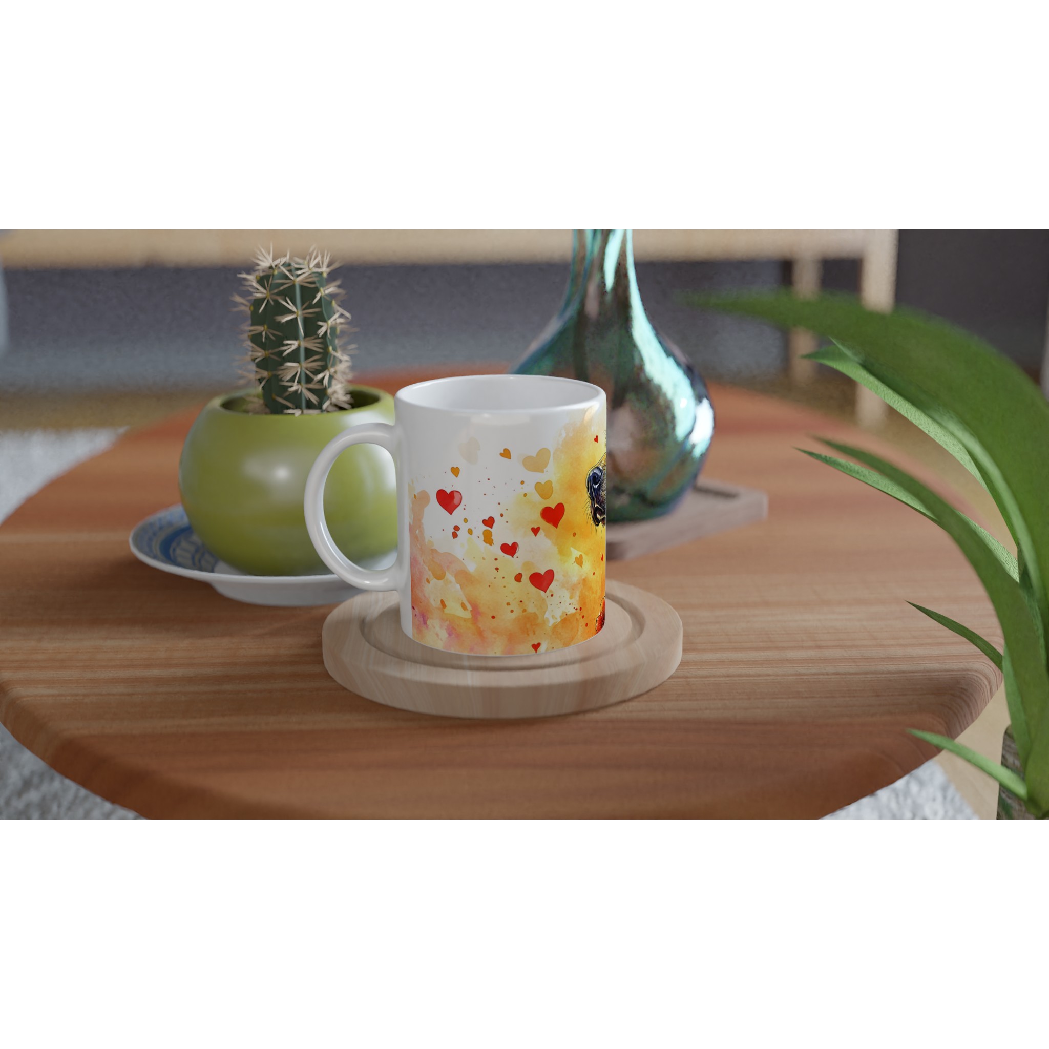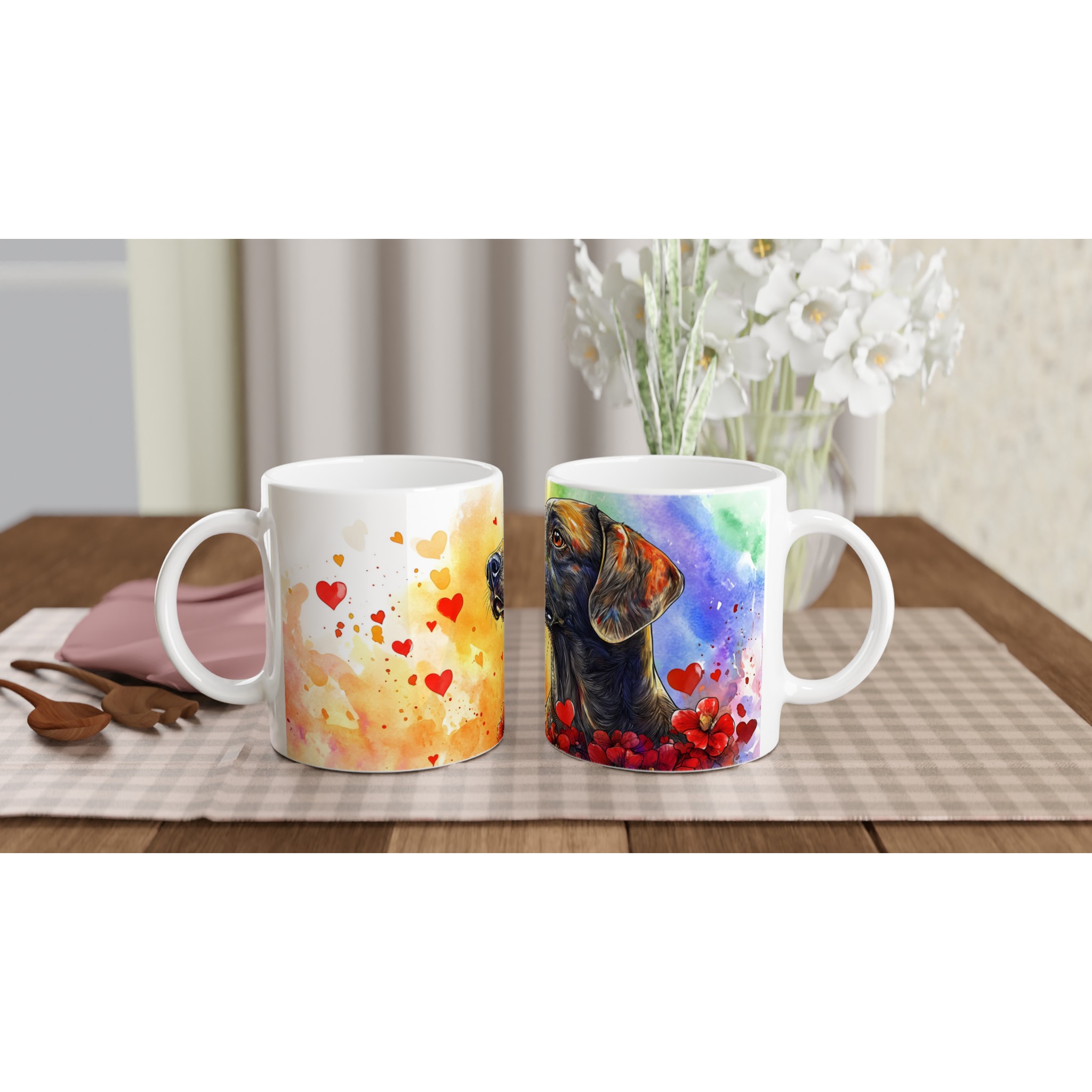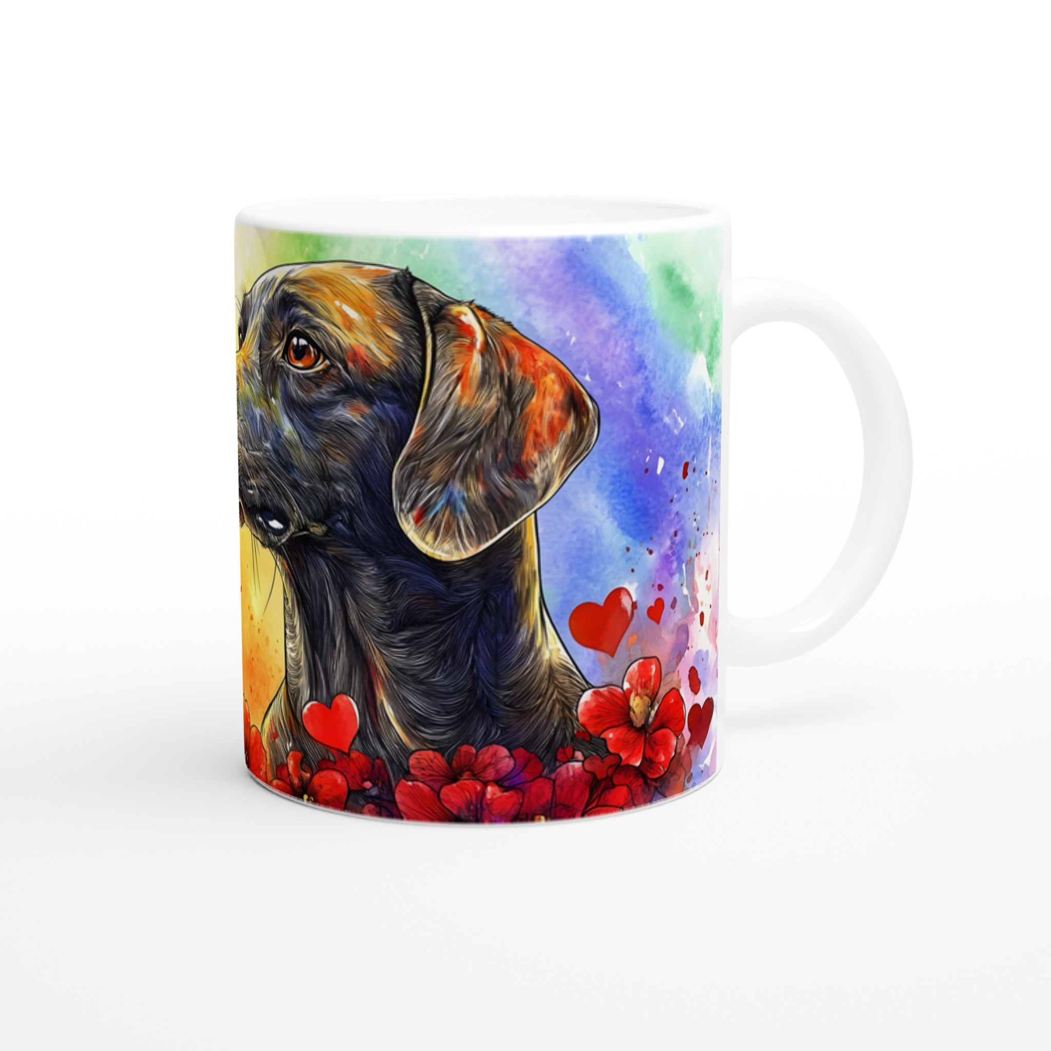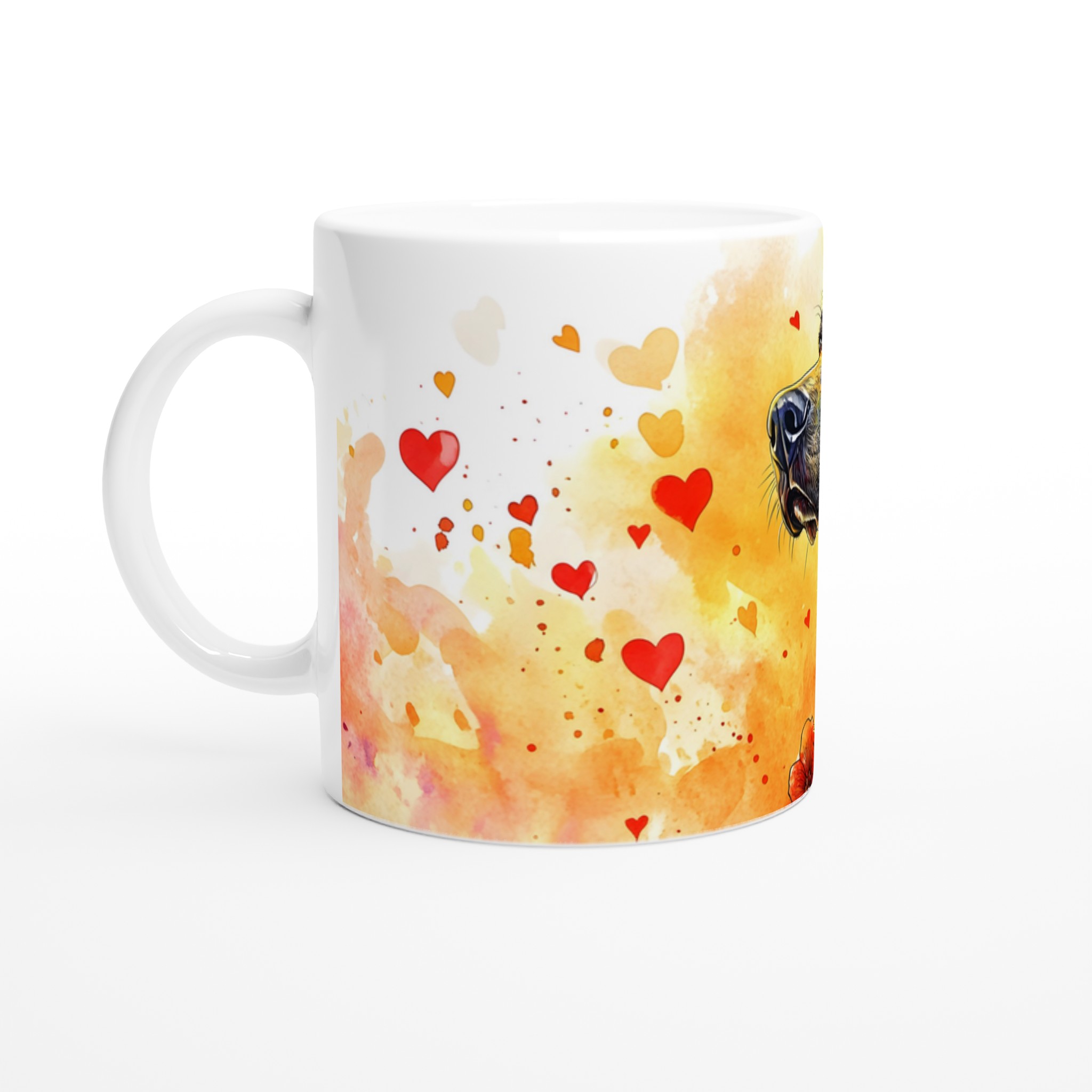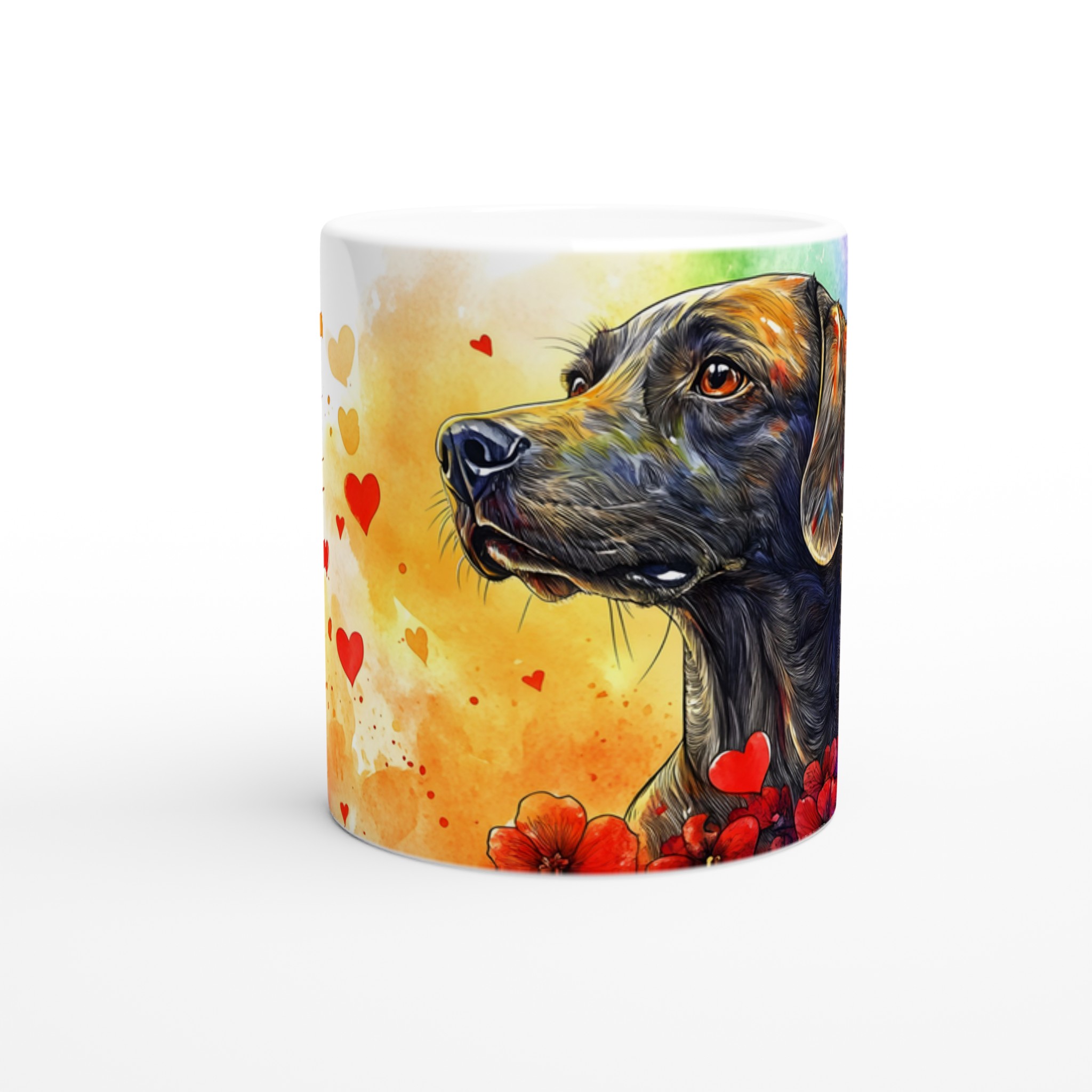 Fånga den innerliga värmen från din fyrbenta vän med vår unika ”Kärleksfull Hund” keramikmugg. Denna mugg har ett livfullt akvarellmotiv av en elegant hund omgiven av hjärtan och blommor, perfekt för alla husdjursälskare. Den konstnärliga stilen och de varma färgtonerna skapar en hjärtevärmande design som gör varje fikastund speciell.