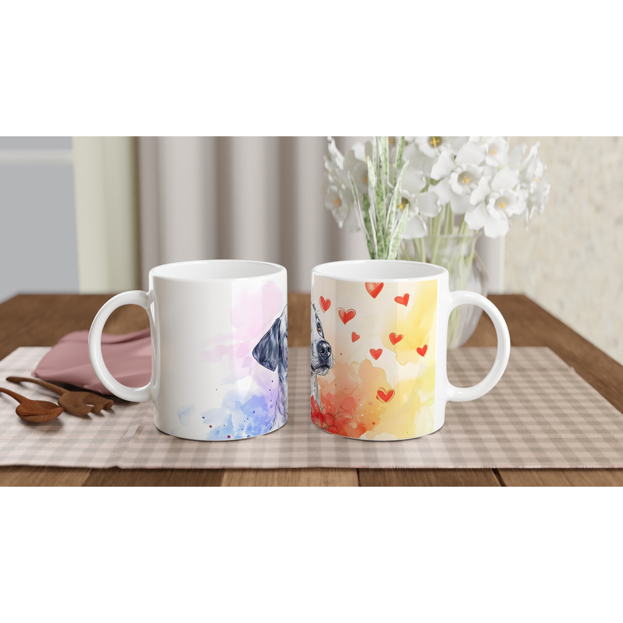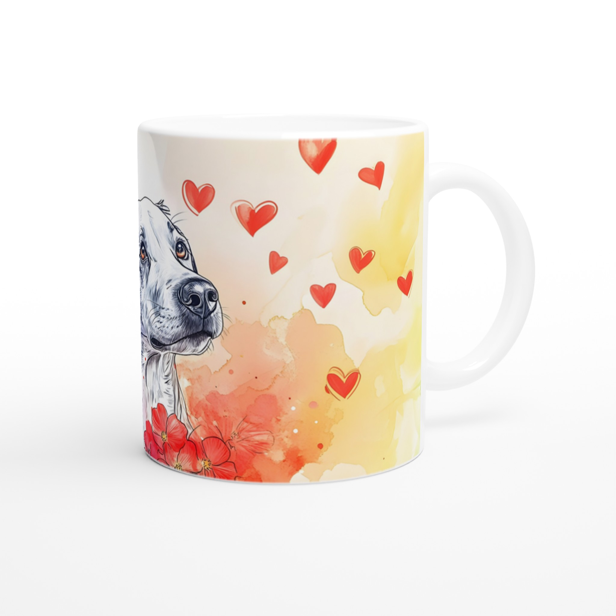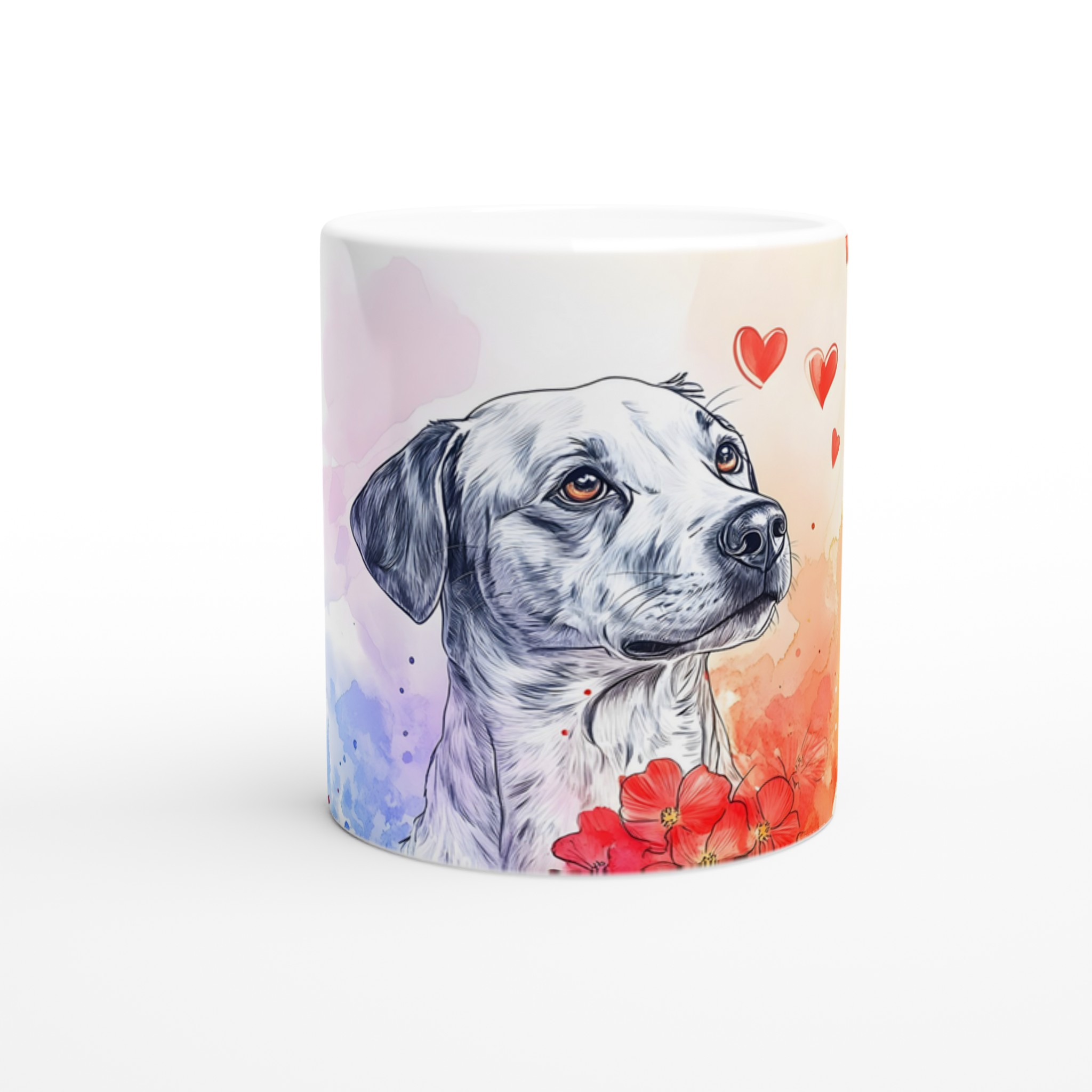 Fånga hjärtat hos varje hundälskare med denna bedårande keramikmugg! Prydd med en konstnärlig akvarellillustration av en charmig hund, omgiven av flygande hjärtan och färgglada blommor, utstrålar denna mugg värme och glädje. De mjuka färgövergångarna och den detaljerade teckningen skapar en unik och känslosam design som gör varje fikastund till något speciellt.