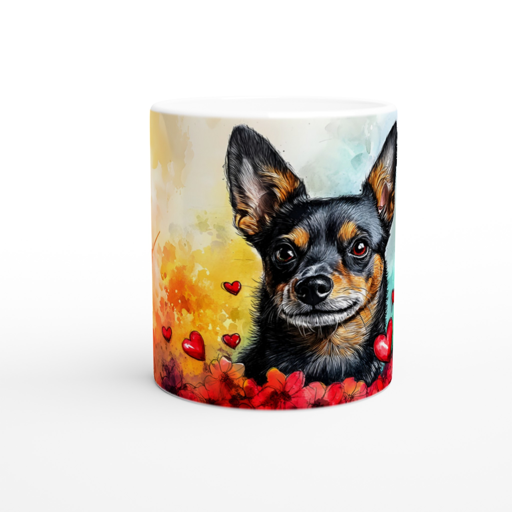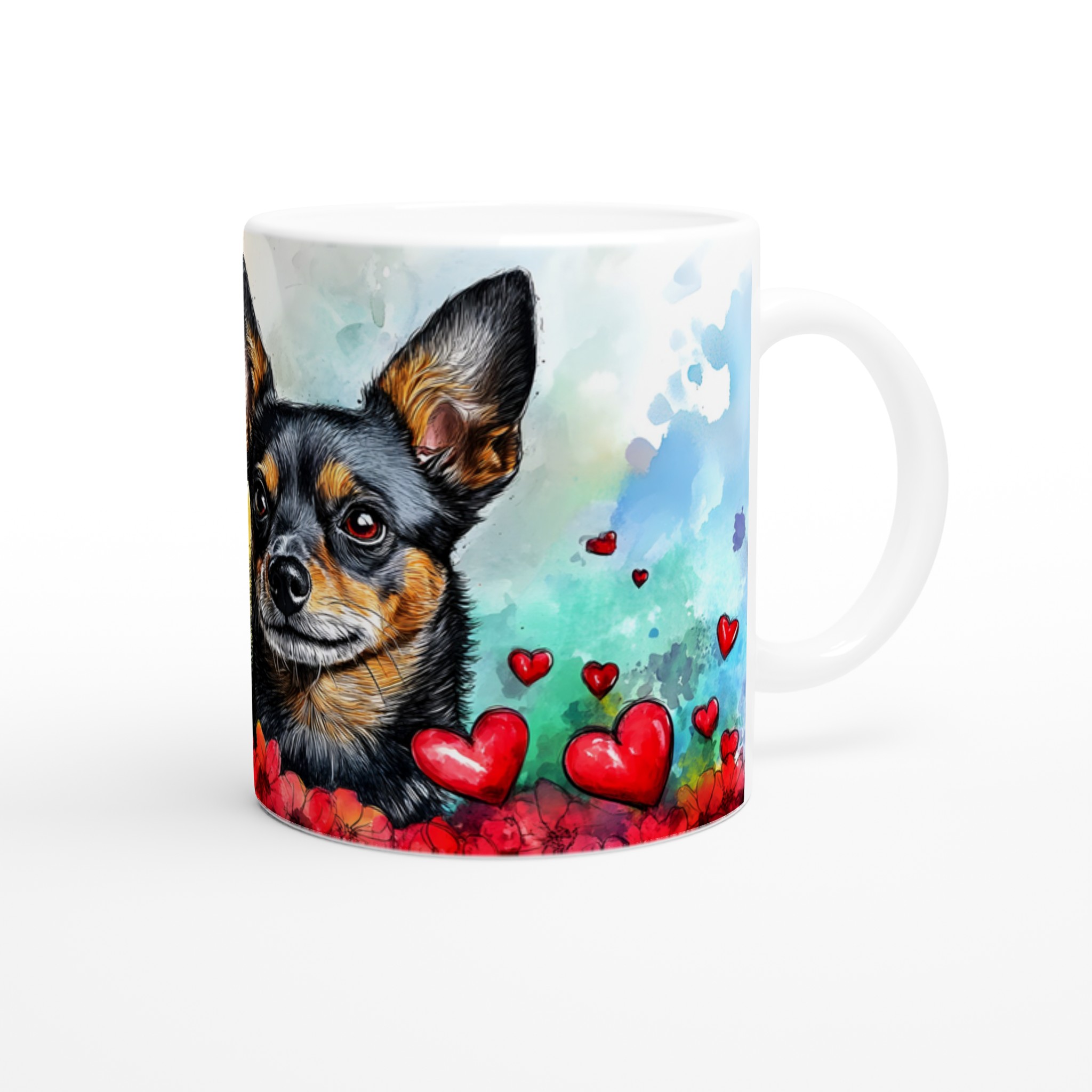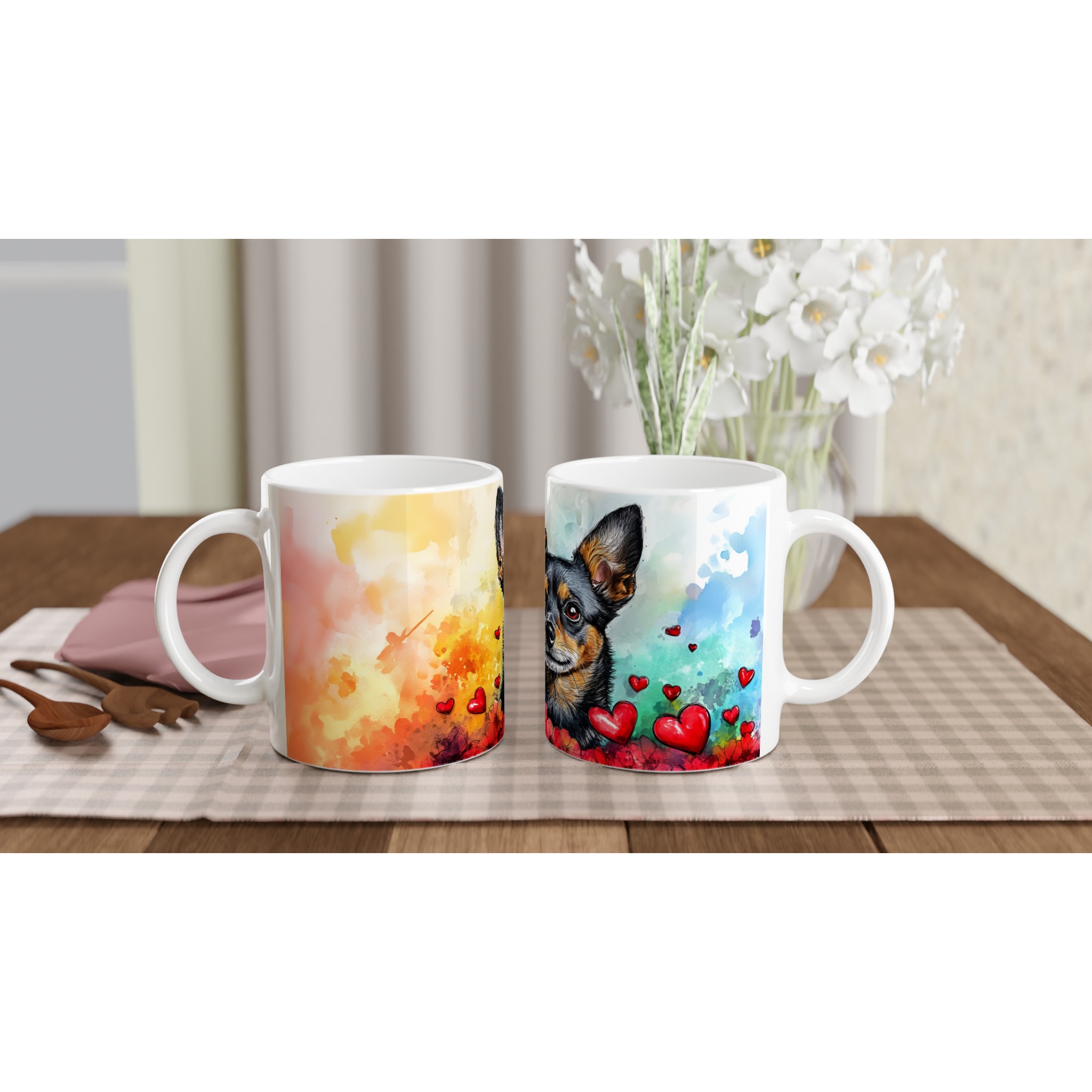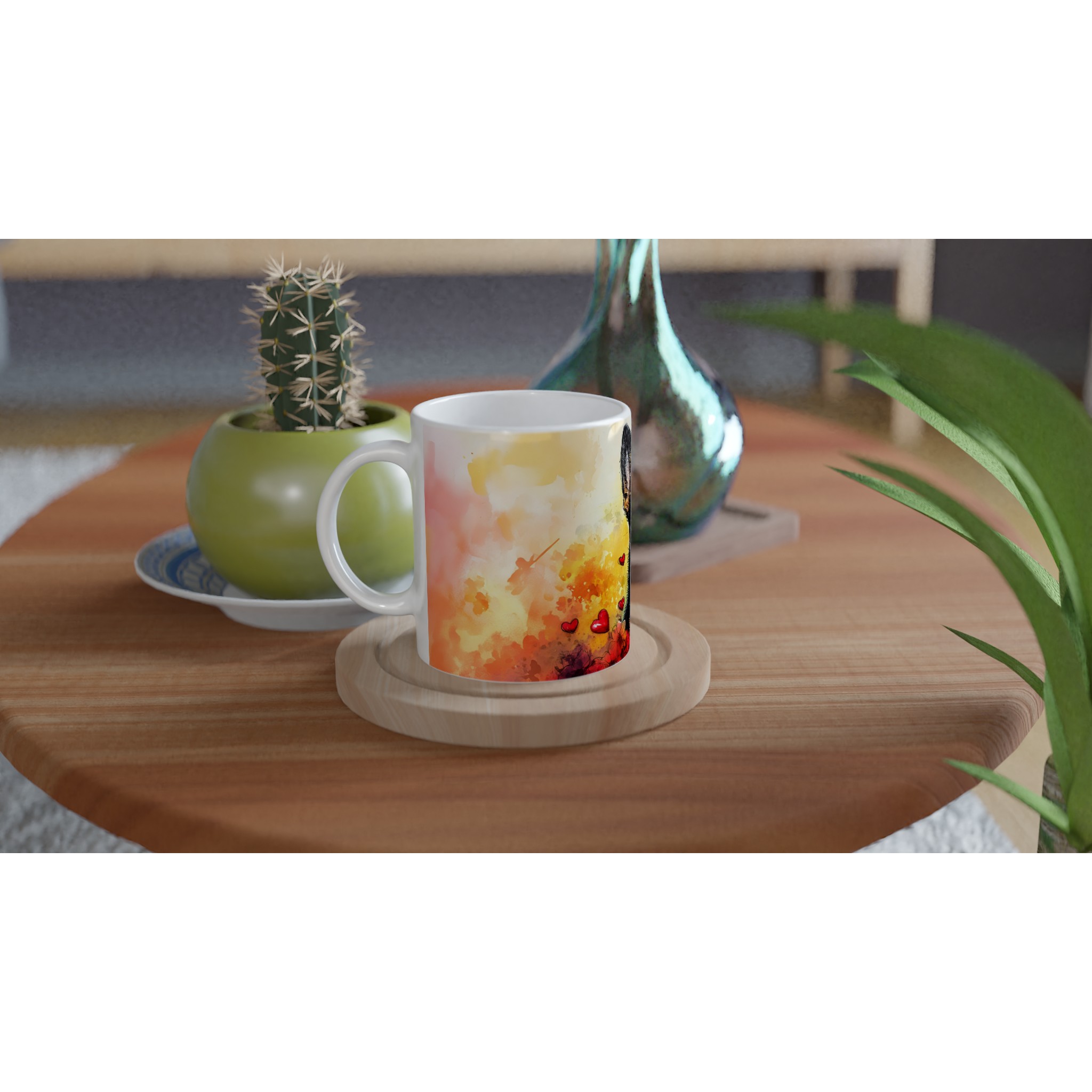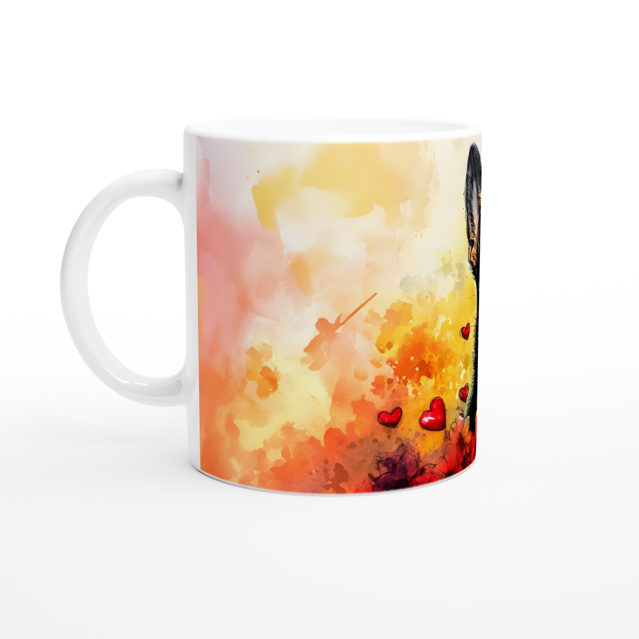 Fånga hjärtat hos varje hundälskare med denna bedårande keramikmugg, prydd med en konstnärlig akvarellbild av en söt hundvalp omgiven av flygande hjärtan och blommor. Den livfulla färgpaletten av varma röda, gula och mjuka blå nyanser skapar en glad och kärleksfull känsla, perfekt för att förgylla din fikastund. Denna mugg är inte bara vacker utan också en daglig påminnelse om den speciella vänskapen med våra fyrbenta vänner.