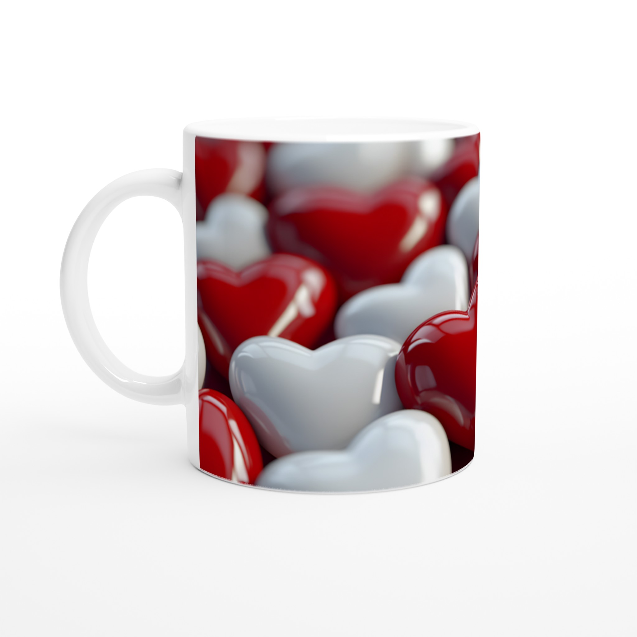 Fyll varje stund med kärlek och värme med denna oemotståndliga keramiska mugg, prydd med glänsande röda och vita hjärtan. Oavsett om det är morgonkaffet som väcker sinnena, en tröstande kopp te under eftermiddagen, eller en lyxig varm choklad för att skämma bort dig själv, är denna mugg den perfekta följeslagaren. Den blanka vita ytan låter hjärtats livliga färger lysa, vilket gör den till en sann glädjespridare i din vardag.