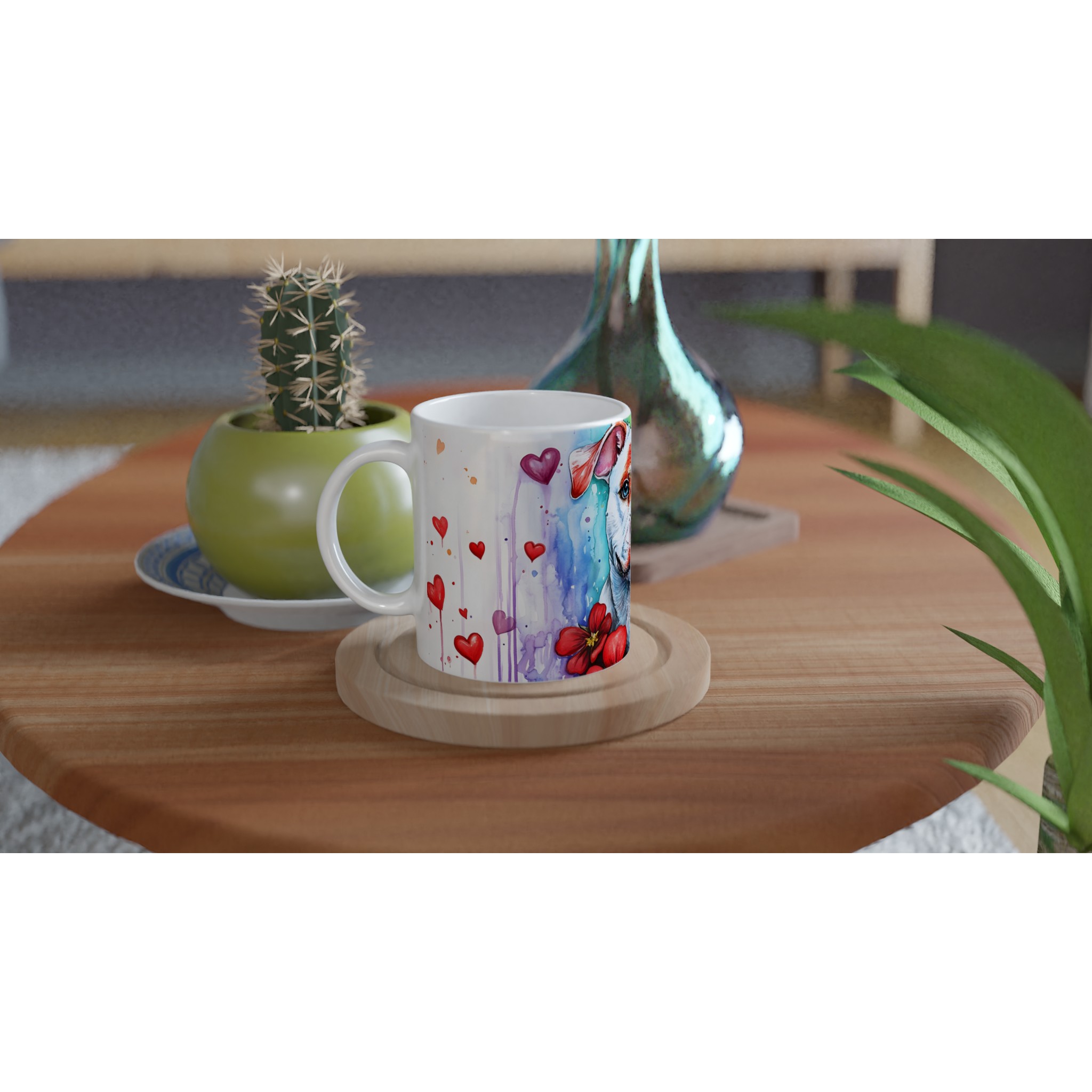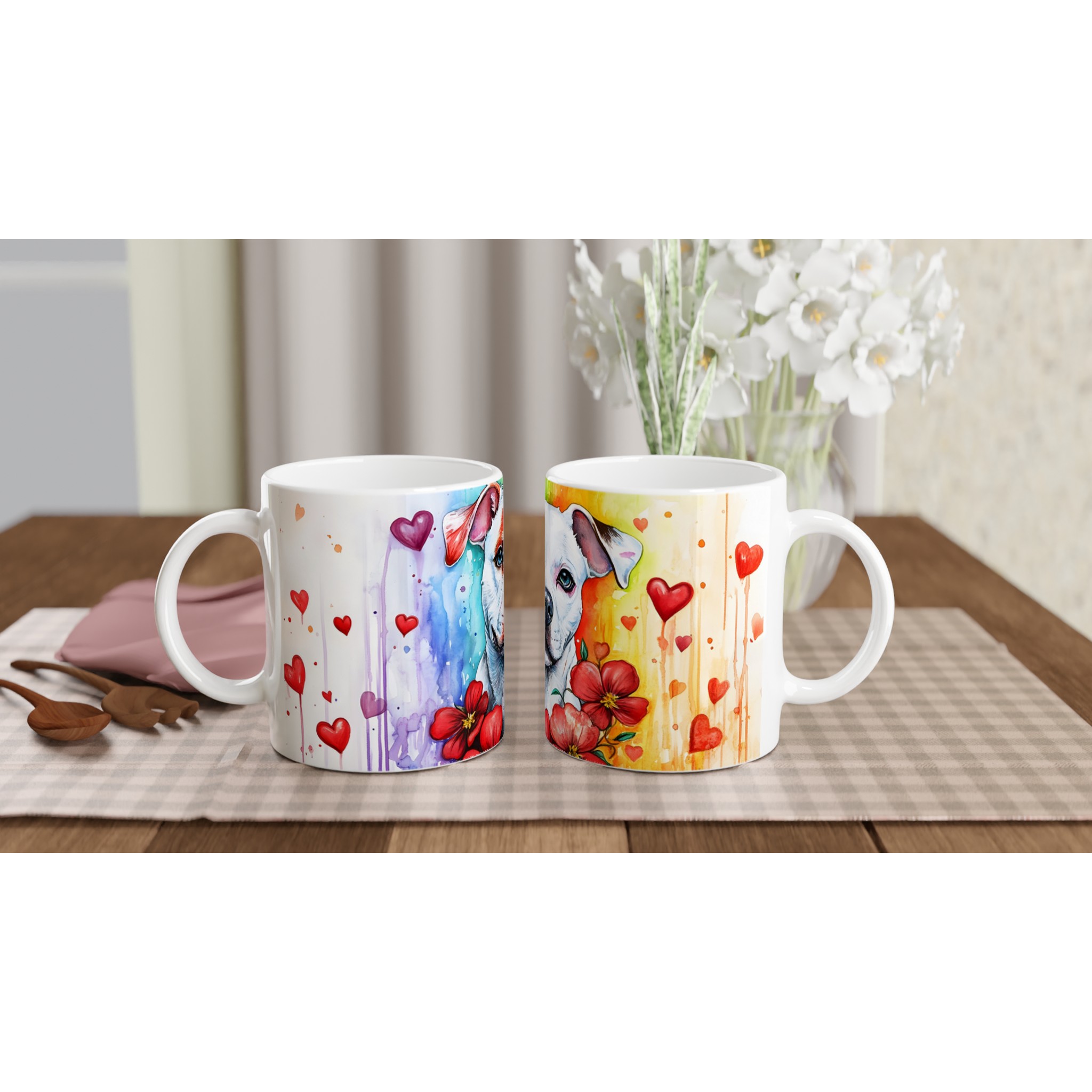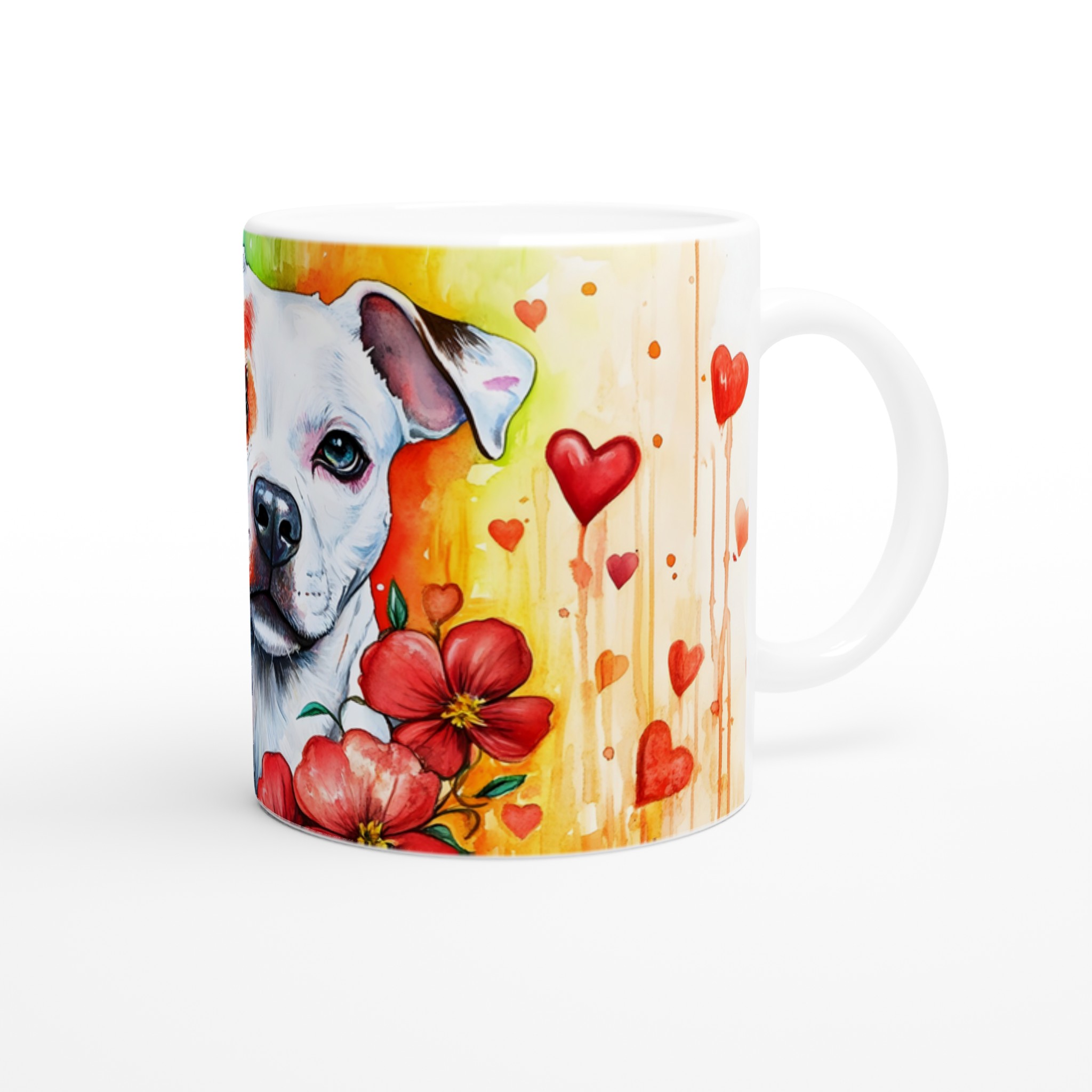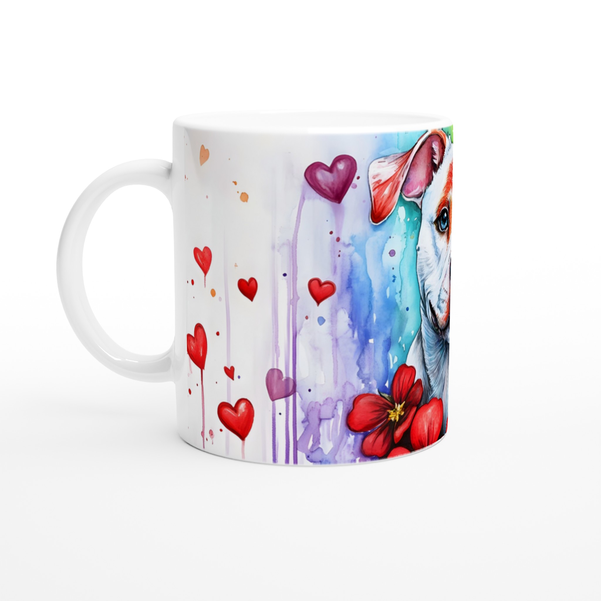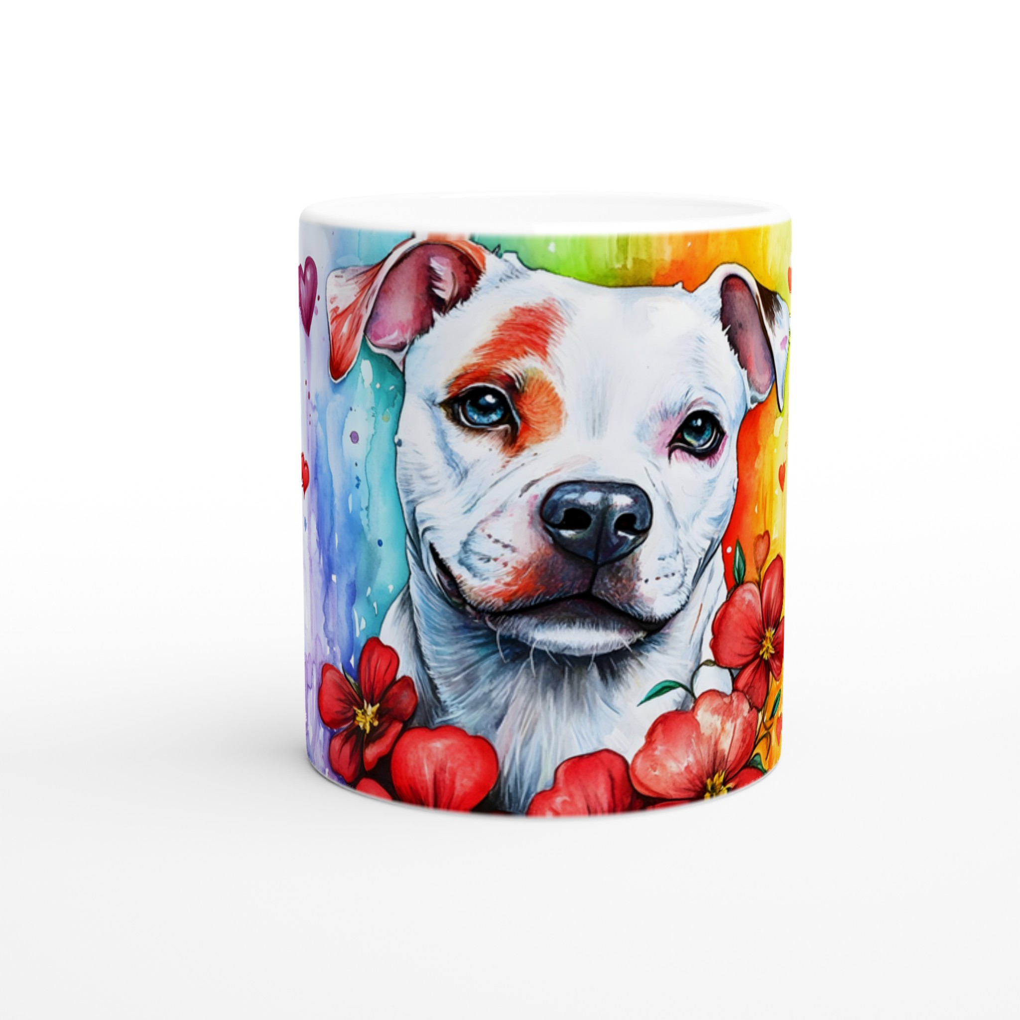 Lyft din fikastund med denna hjärtevärmande keramikmugg, prydd med en bedårande pitbull i en levande akvarelldesign. Omges av en regnbåge av färger och svävande röda hjärtan, utstrålar denna mugg glädje och kärlek. Den är den perfekta följeslagaren för ditt morgonkaffe, en lugnande kopp te eller en mysig varm choklad, och ger en konstnärlig touch till varje ögonblick.
