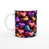 Fyll varje morgon med kärlek med denna charmiga keramikmugg, perfekt för alla dagens stunder – oavsett om det är morgonkaffet, en värmande kopp te eller en härlig varm choklad. Med en design inspirerad av söta, glänsande kärlekshjärtan i rött och vitt, sprider denna mugg en romantisk och glad stämning. Den blanka vita ytan gör att trycket framträder klart och färgstarkt, vilket gör muggen till en riktig favorit i vardagen. Tack vare den höga kvaliteten behåller trycket sin lyster även efter många omgångar i både mikrovågsugn och diskmaskin.