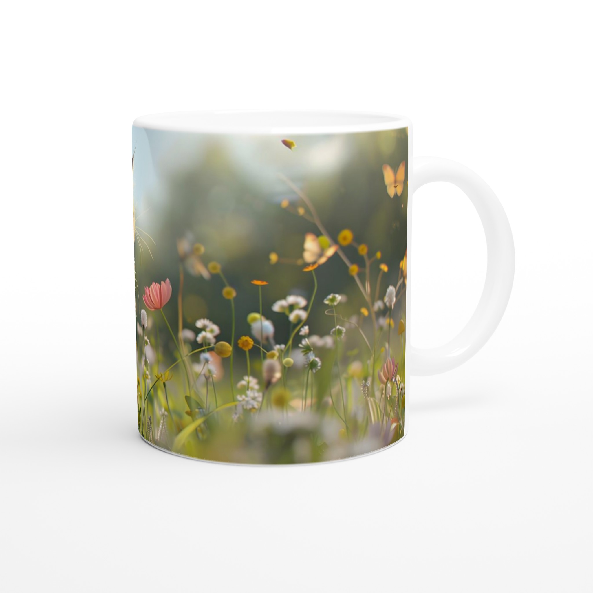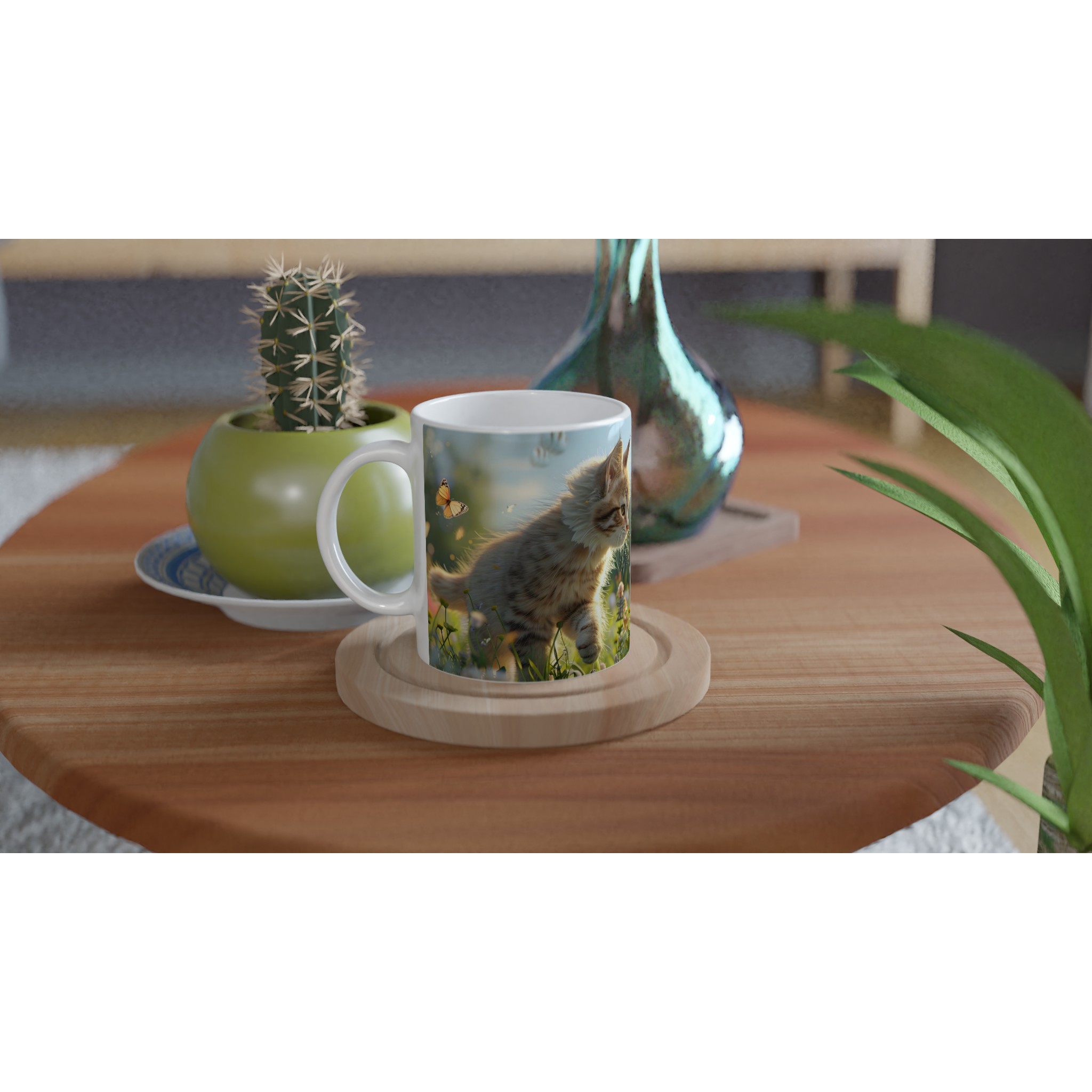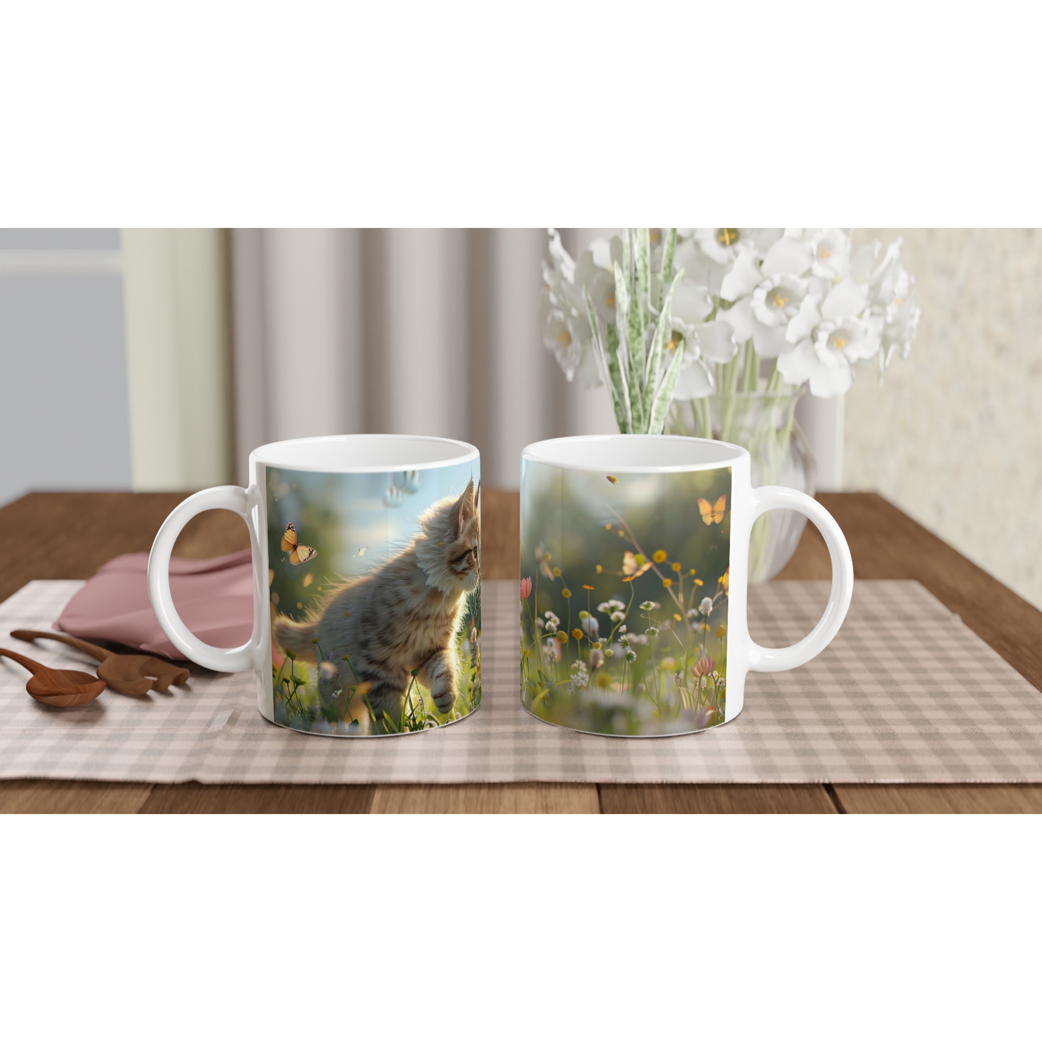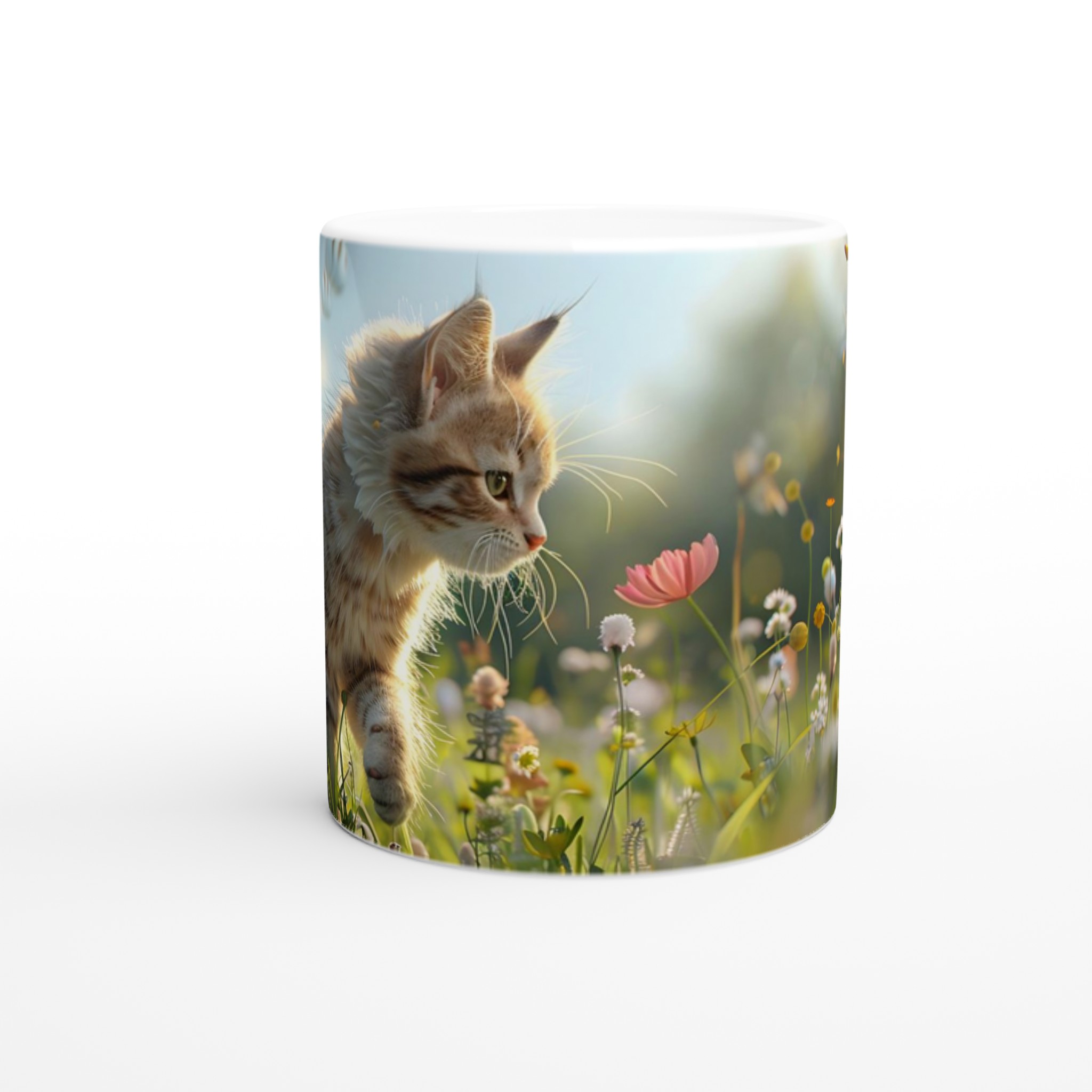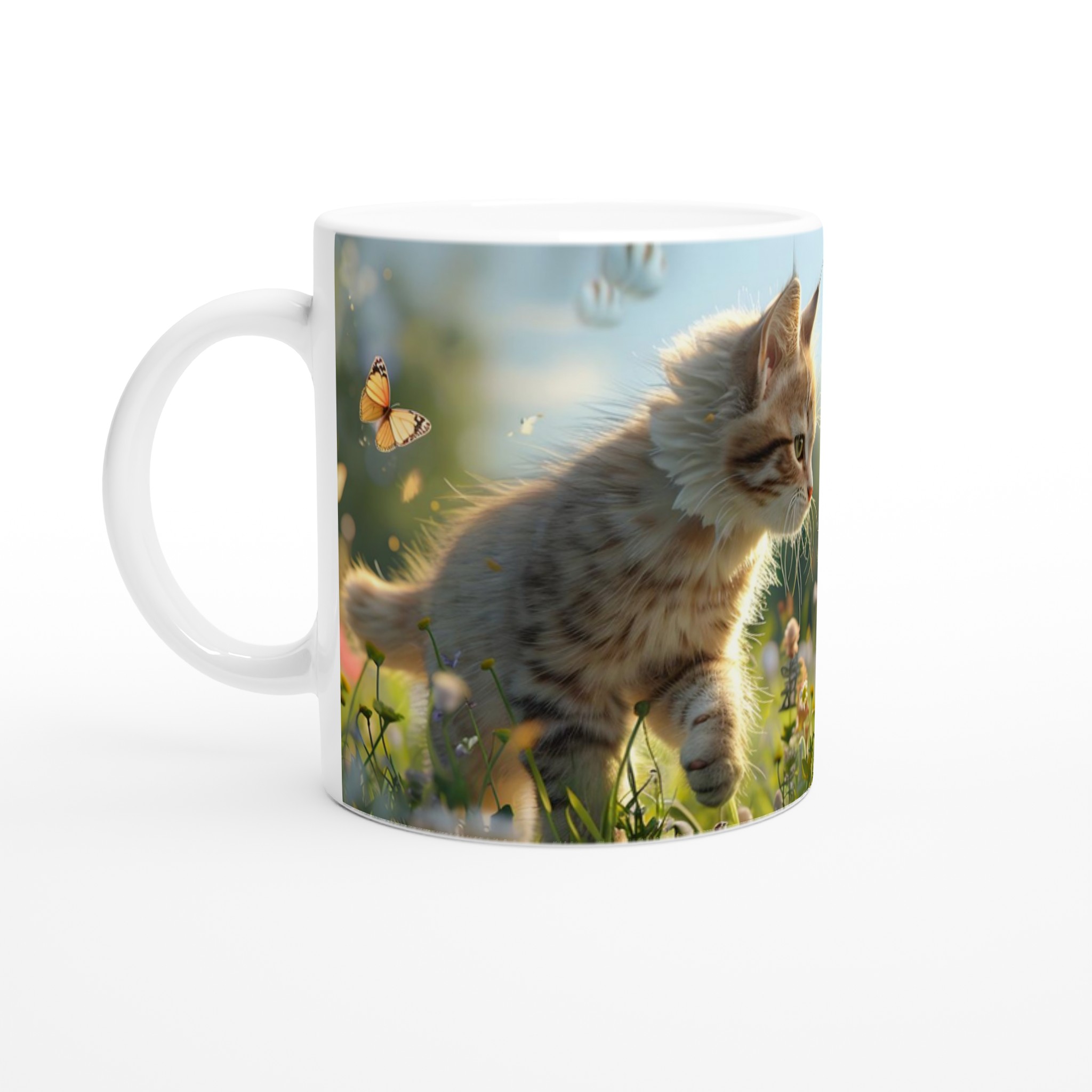 Föreställ dig den härliga känslan av en varm solstråle på en klar vårmorgon, fångad i din hand. Denna förtrollande keramikmugg pryds av en bedårande kattunge som utforskar ett blomstrande vårfält, omgiven av lekfulla fjärilar och strålande blommor. En perfekt mugg för alla som älskar katter, natur och ljusa, glädjefyllda motiv. Den ger en känsla av lugn och nyfikenhet till ditt dagliga liv, oavsett om du njuter av morgonkaffet, en värmande kopp te eller en härlig varm choklad.