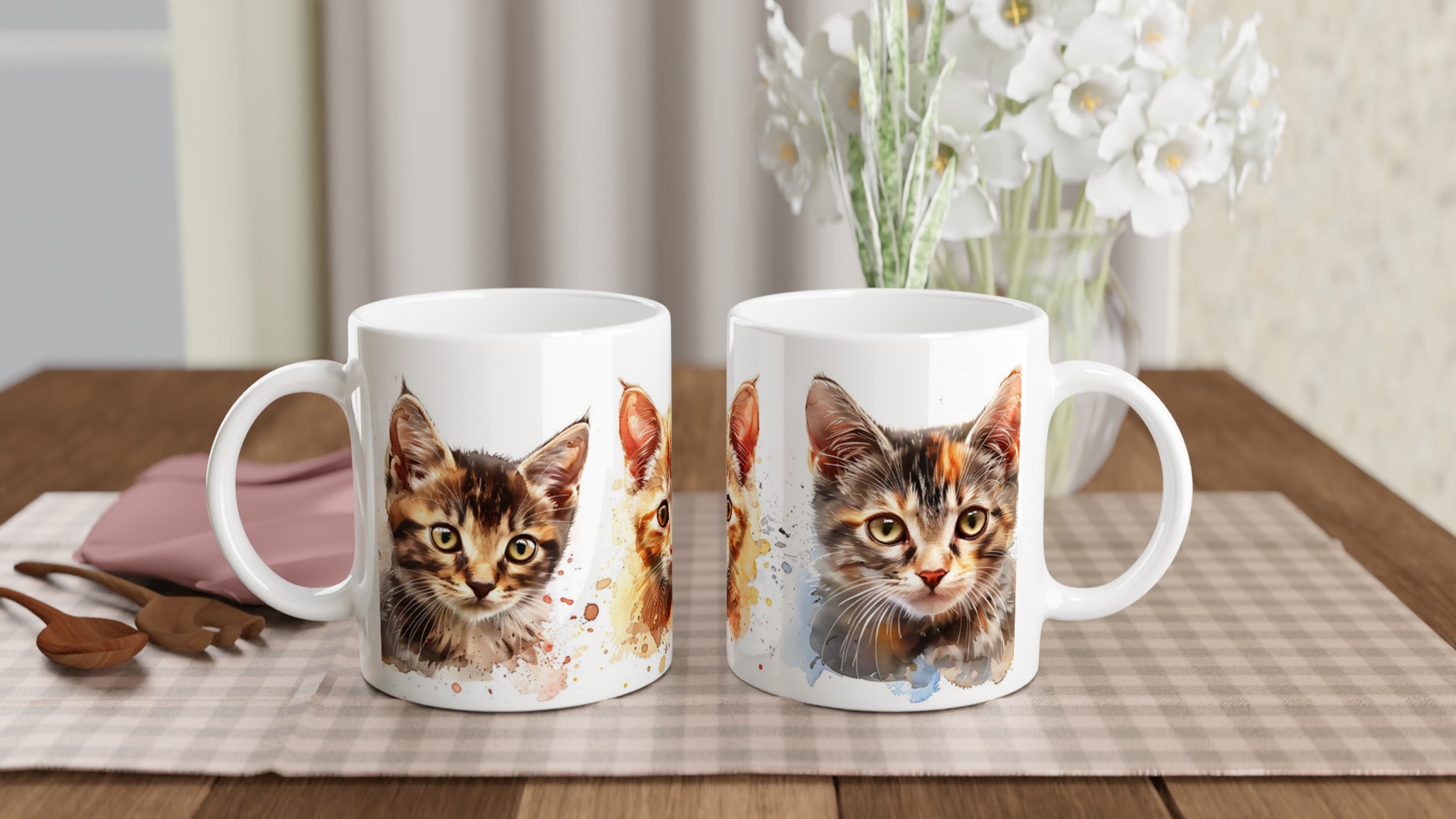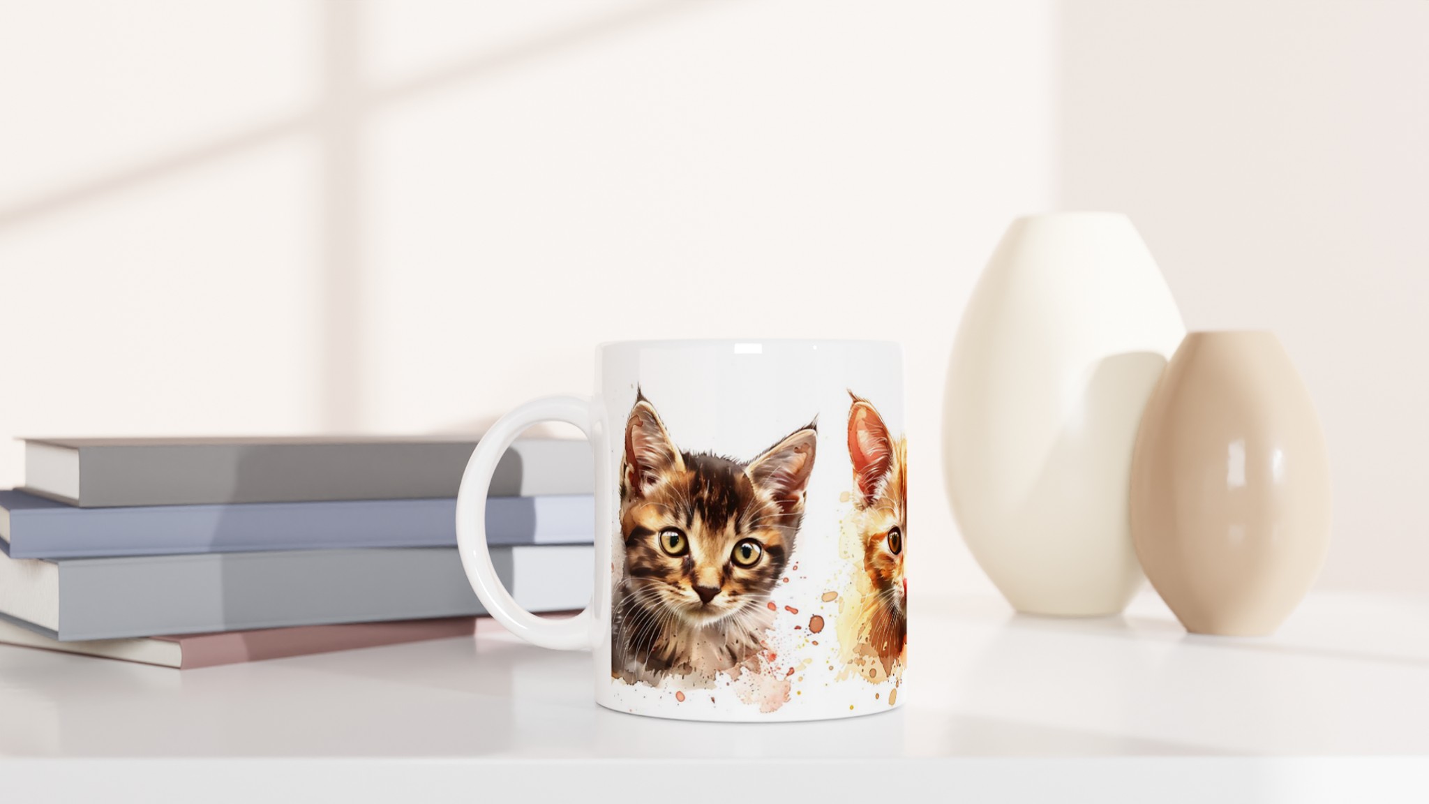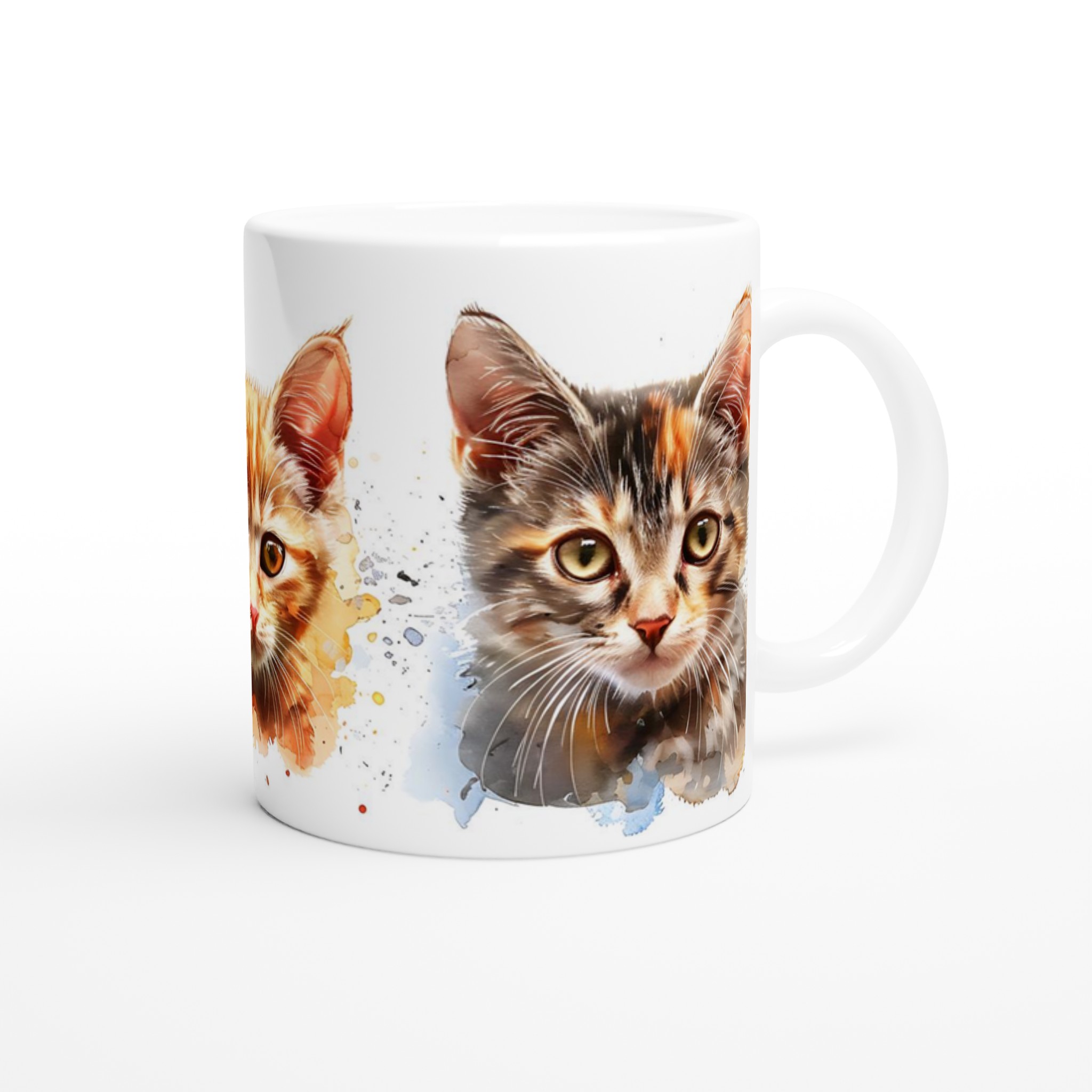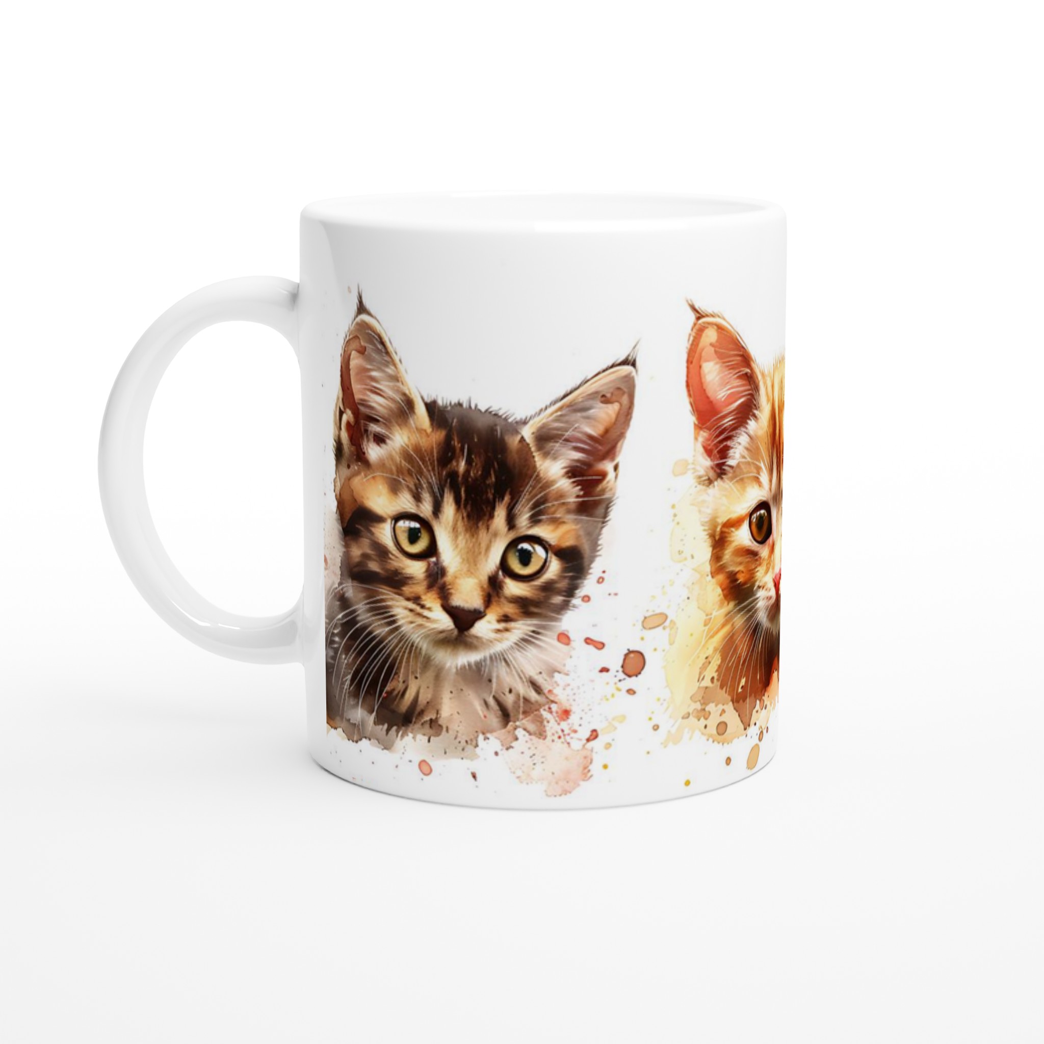 Låt dessa bedårande akvarellkattungar förgylla din dag! Den här stilrena keramiska muggen, prydd med charmerande akvarellporträtt av små katter, blir snabbt en vardagsfavorit. Perfekt för morgonkaffet, kvällens varma choklad eller när du bara vill njuta av en kopp te i sällskap av söta kattansikten. Den blanka ytan framhäver trycken med klara och levande färger, som håller sig fina även efter många turer i mikron och diskmaskinen.