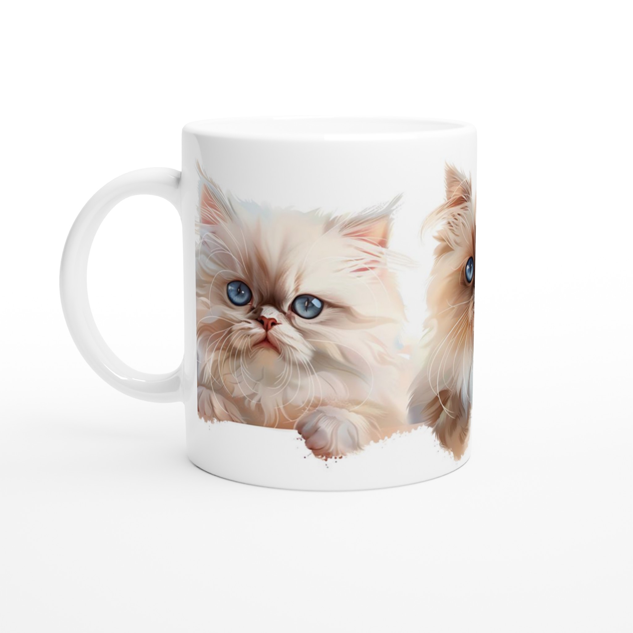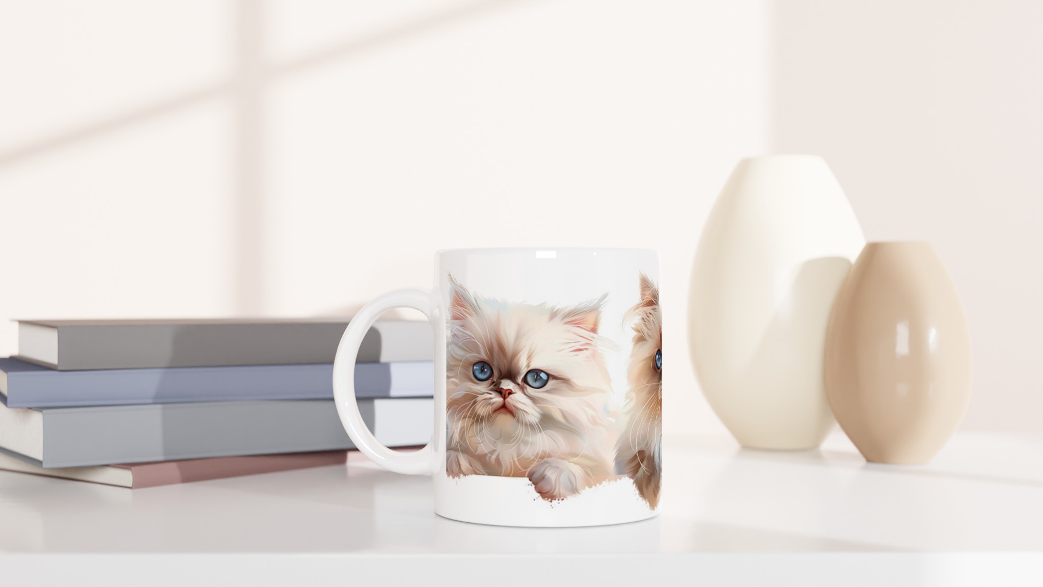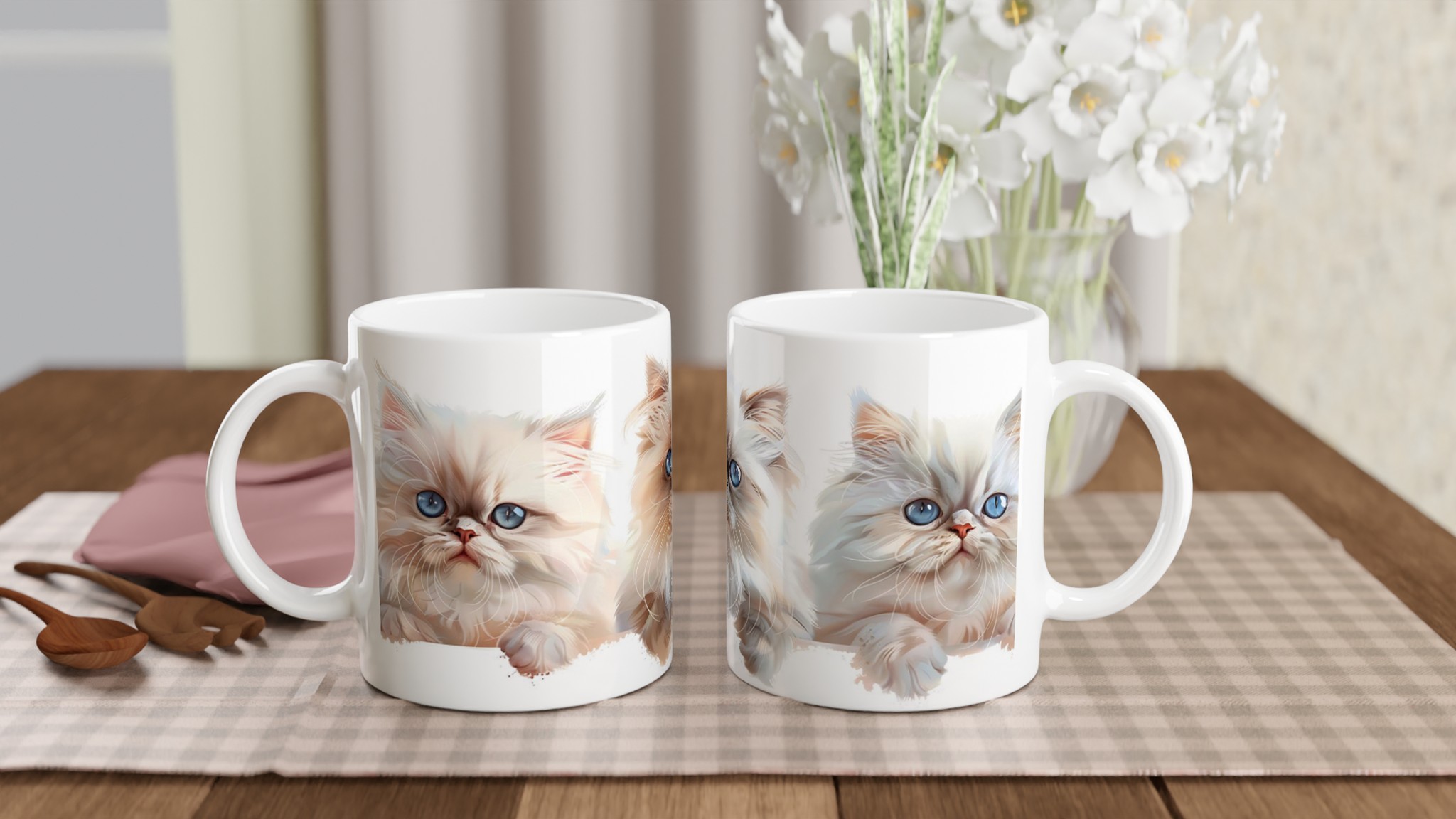 Låt dessa oemotståndliga kattungar med sina hypnotiserande blå ögon förgylla din fikapaus! Den här stilrena keramiska muggen blir snabbt en vardagsfavorit, perfekt för morgonkaffet, kvällens varma choklad eller när du bara vill njuta av en kopp te. Den blanka ytan gör att trycket med de söta kattungarna framhävs med klara och levande färger, som håller sig fina även efter många turer i mikron och diskmaskinen.