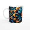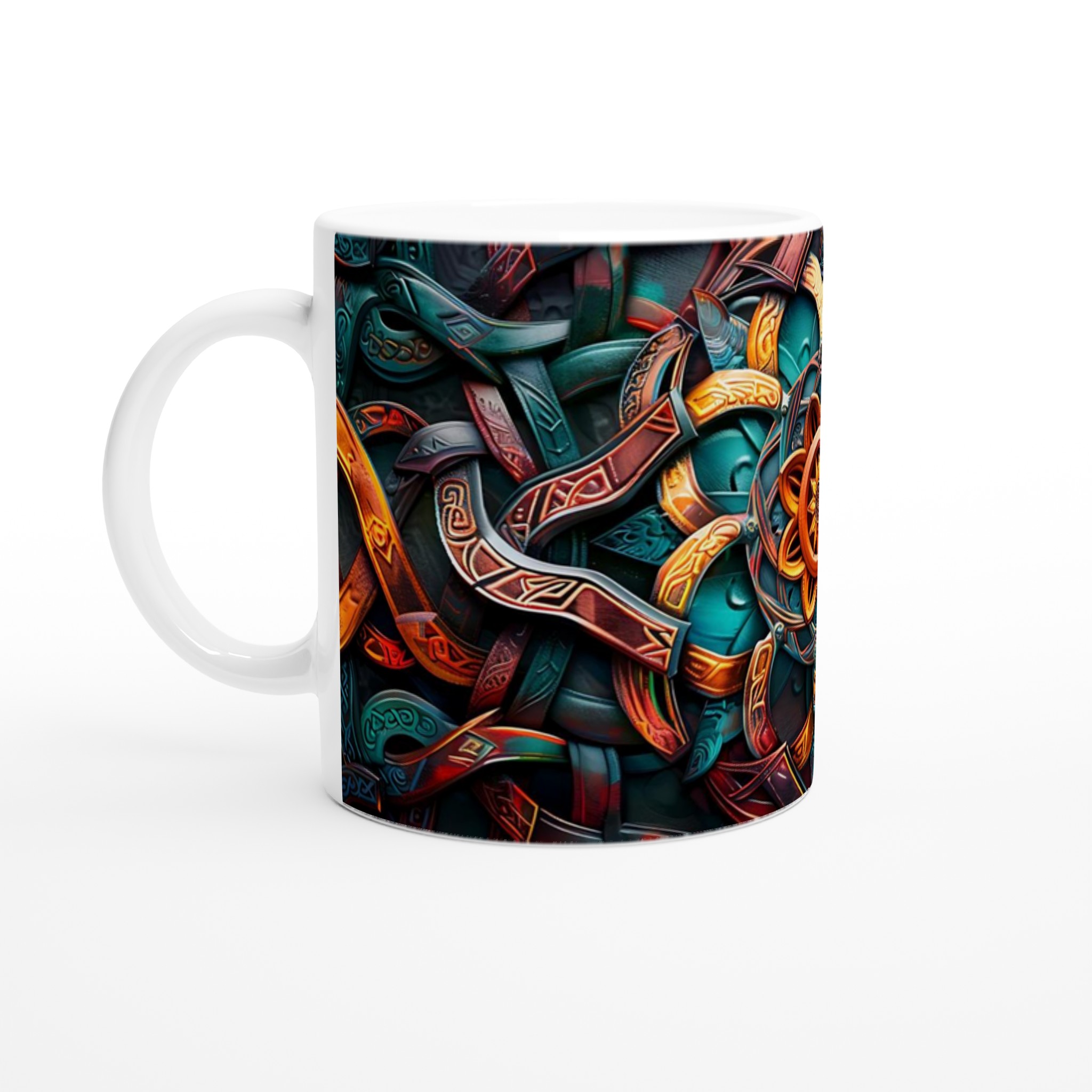 Låt dig förtrollas av denna unika keramiska mugg, prydd med ett hypnotiskt knutmönster i djupt teal och skimrande guld som påminner om forntida keltisk mystik. Varje detalj fångar ögat med sina intrikata former och rika färgpalett, vilket gör varje klunk till en resa. Den blanka vita ytan låter detta mästerverk framträda med enastående klarhet och färgstyrka, perfekt för dig som uppskattar konst och tidlös design i din vardag.