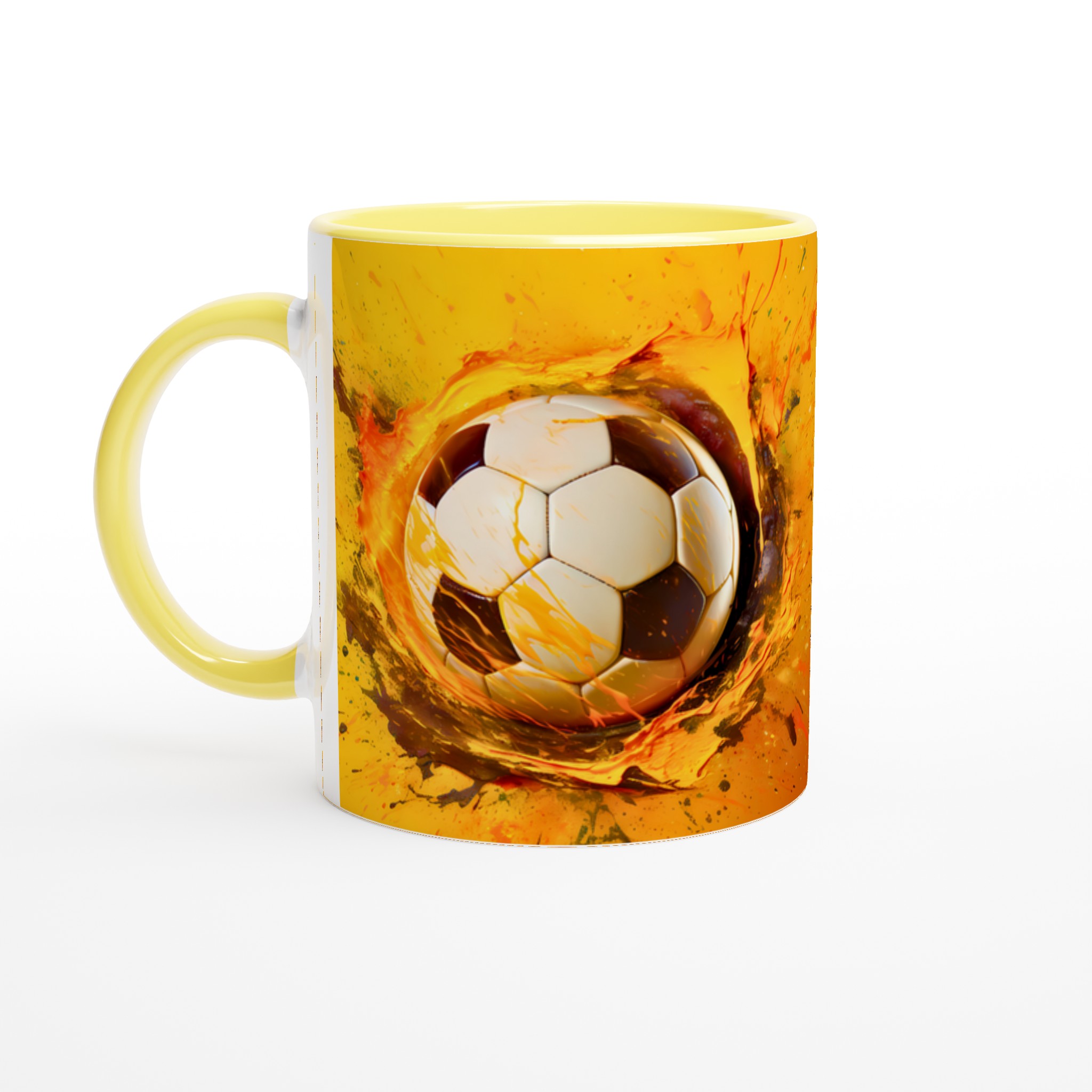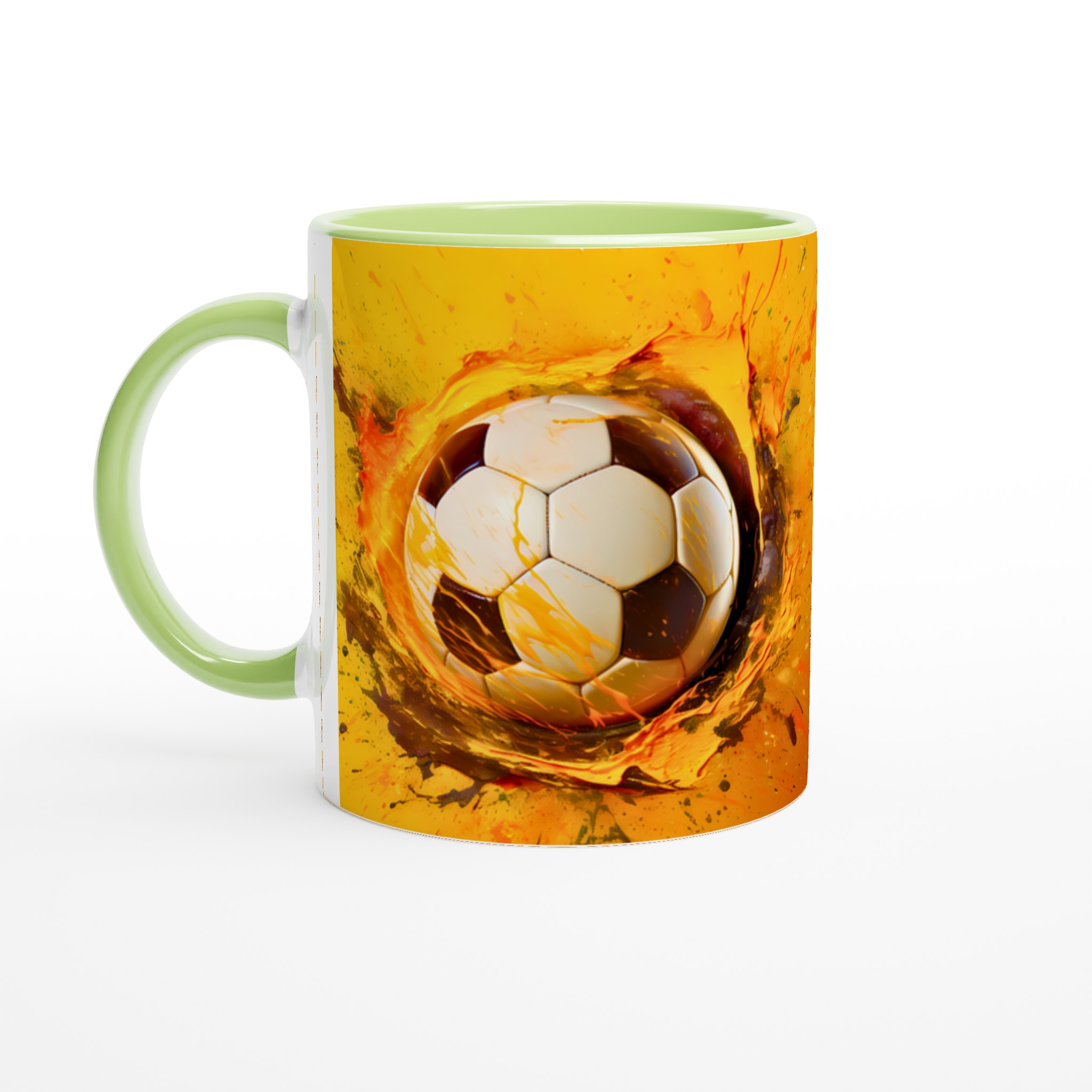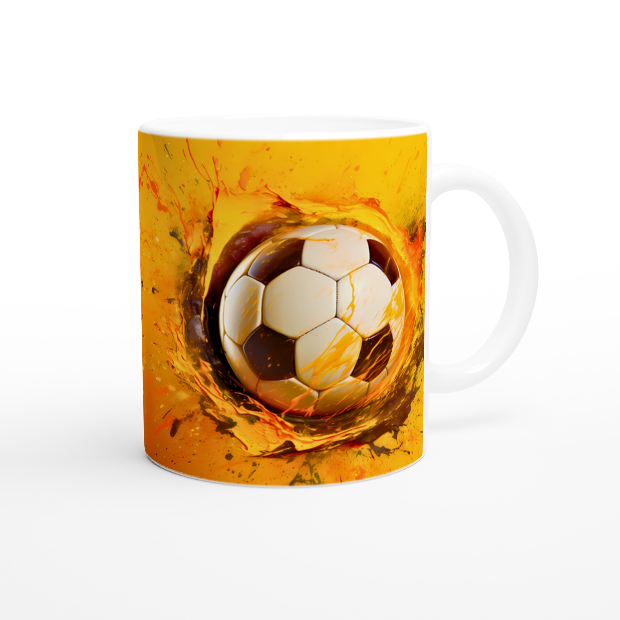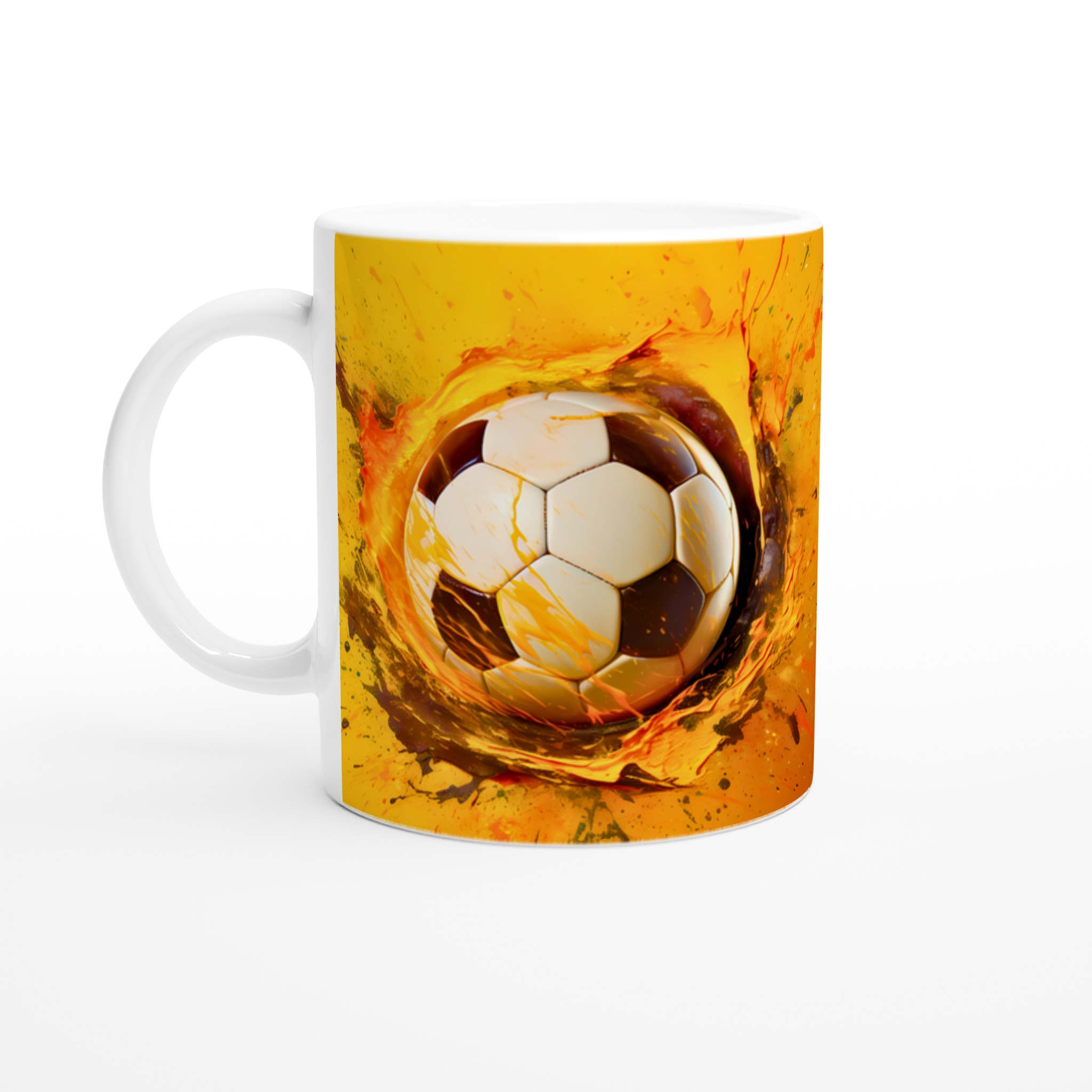Den här stilrena keramiska muggen blir snabbt en vardagsfavorit för alla sportentusiaster. Med sitt dynamiska tryck av en fotboll i en explosion av energiska färger är den perfekt för morgonkaffet, kvällens varma choklad eller när du bara vill njuta av en kopp te medan du drömmer om nästa match. Den blanka vita ytan gör att trycken framhävs med klara och levande färger, som håller sig fina även efter många turer i mikron och diskmaskinen.