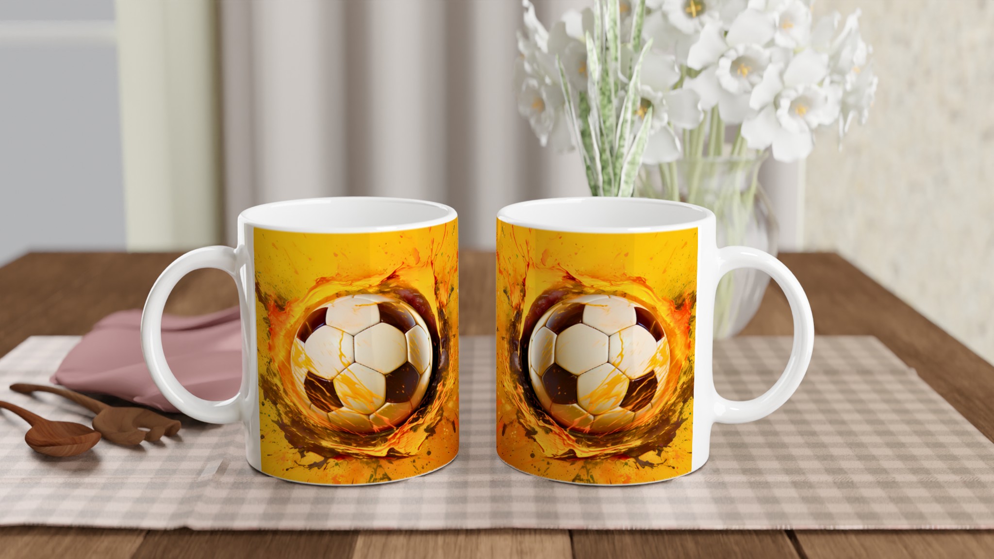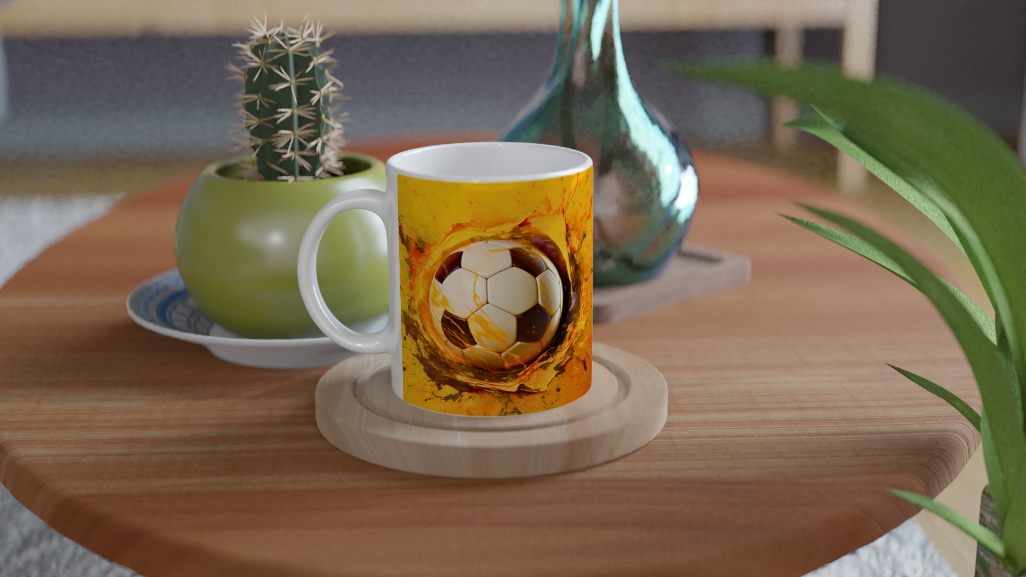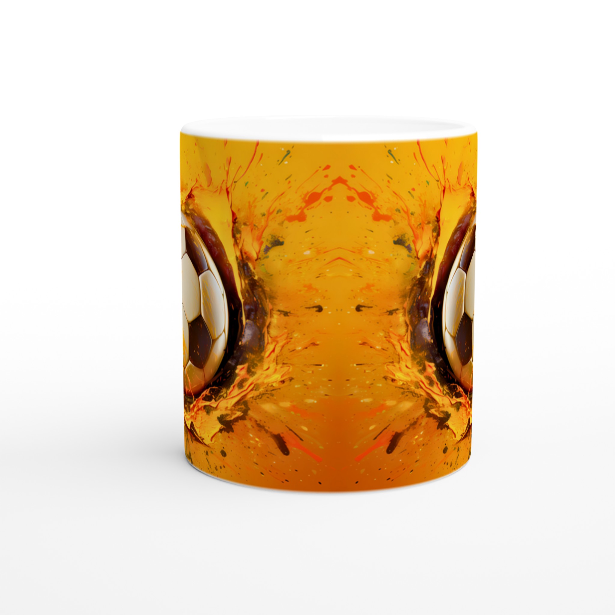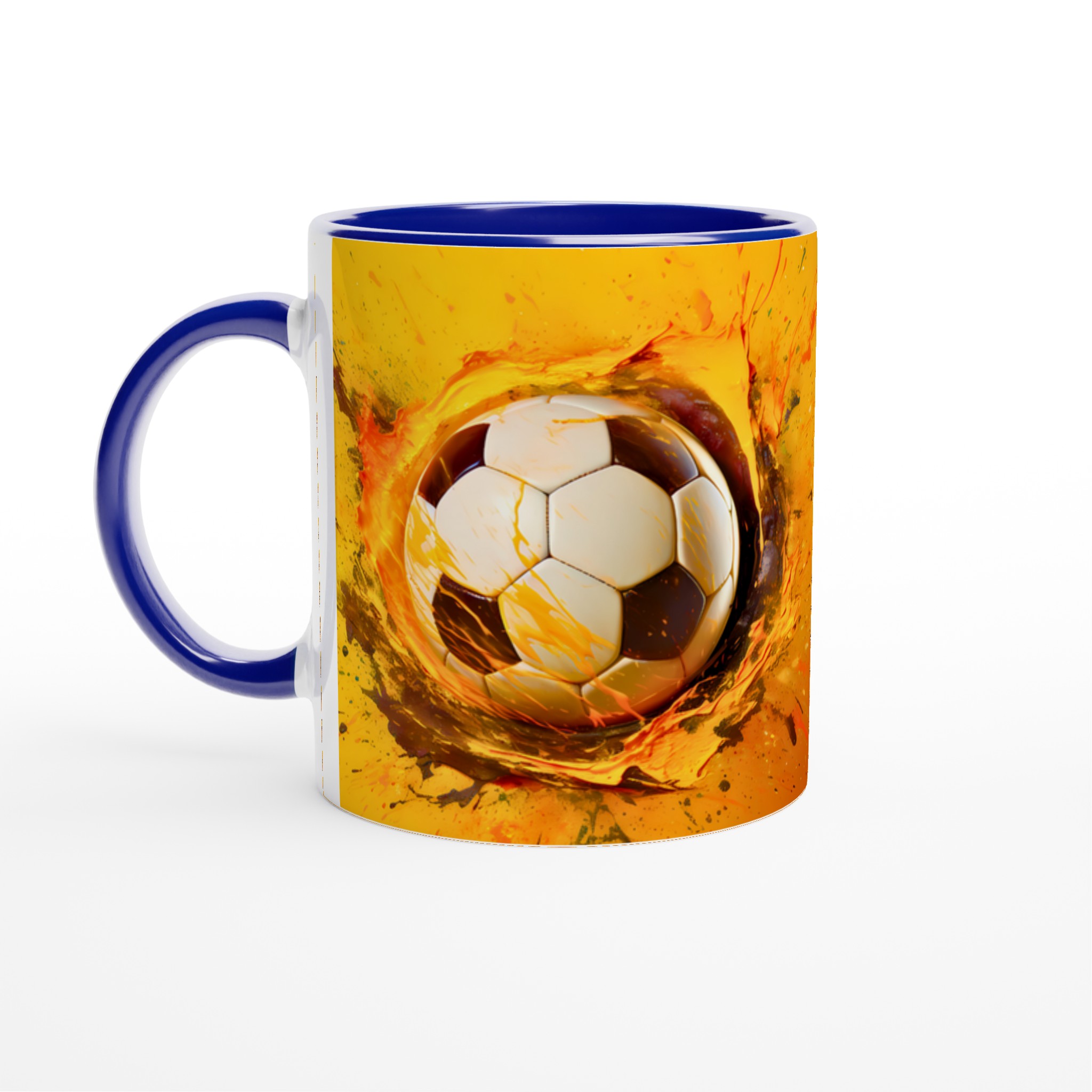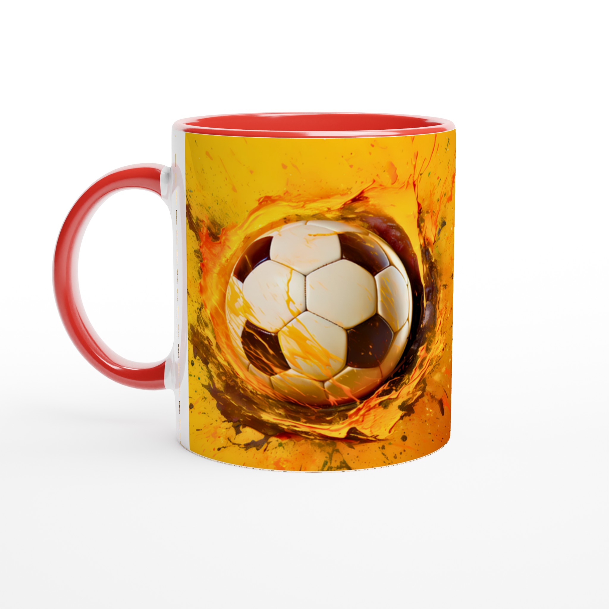 Den här stilrena keramiska muggen blir snabbt en vardagsfavorit för alla sportentusiaster. Med sitt dynamiska tryck av en fotboll i en explosion av energiska färger är den perfekt för morgonkaffet, kvällens varma choklad eller när du bara vill njuta av en kopp te medan du drömmer om nästa match. Den blanka vita ytan gör att trycken framhävs med klara och levande färger, som håller sig fina även efter många turer i mikron och diskmaskinen.
