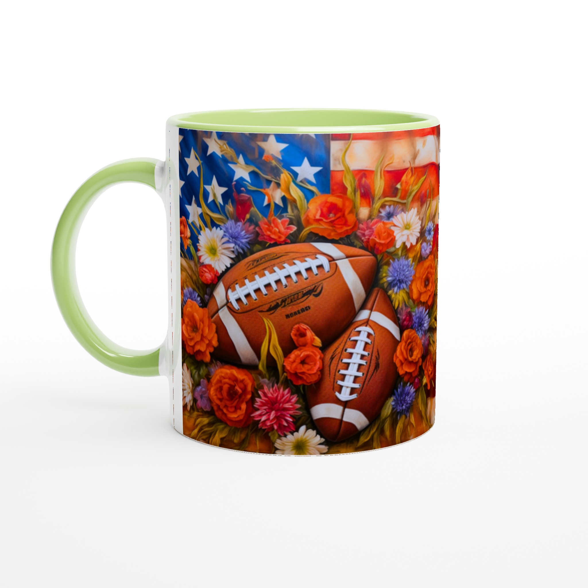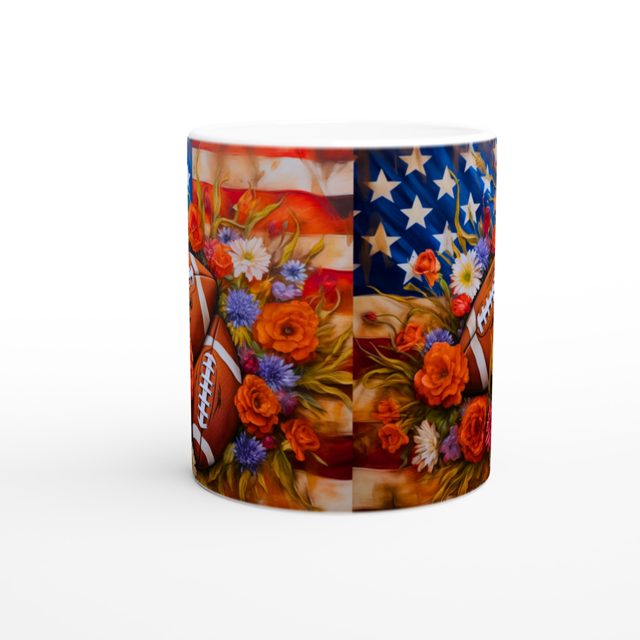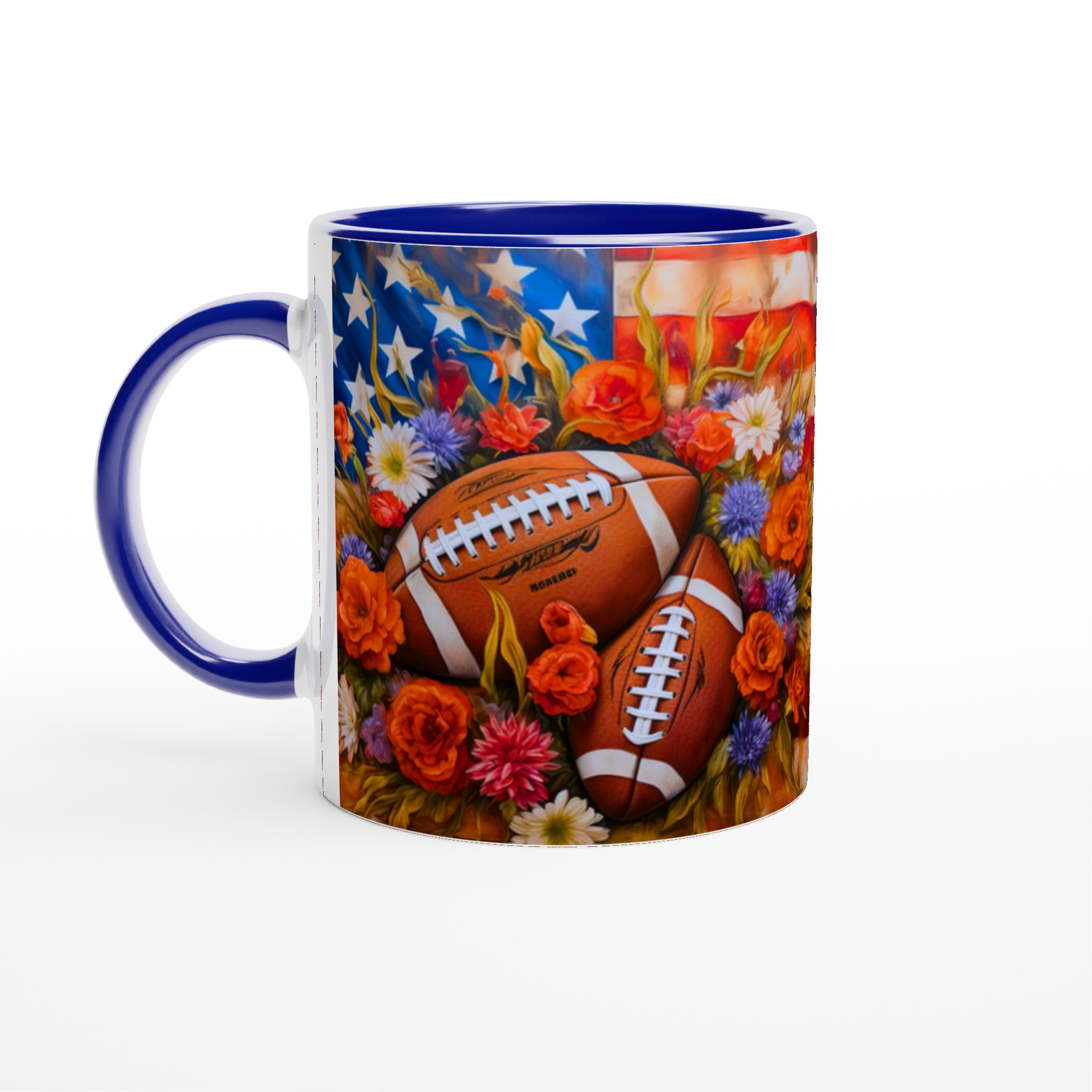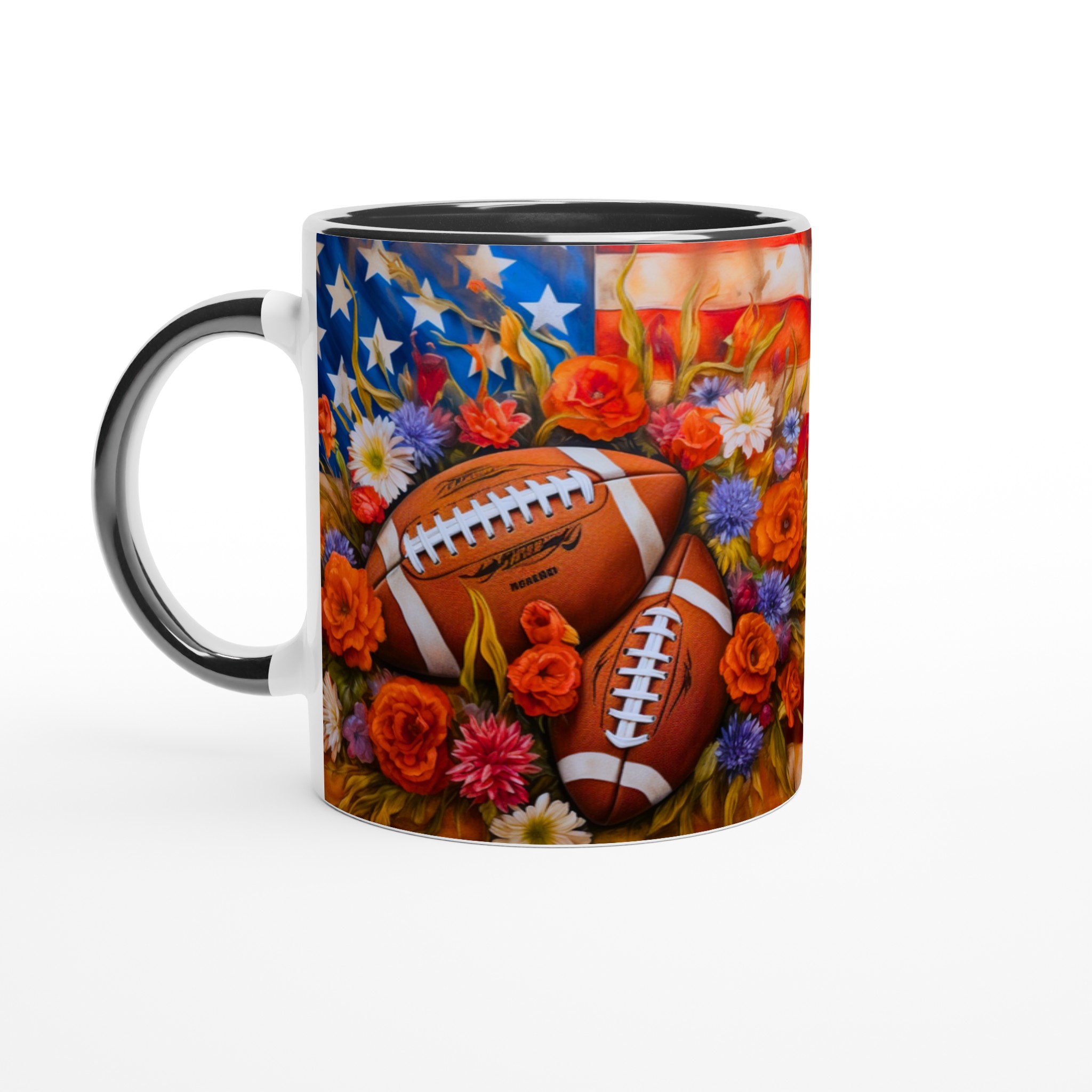 Fånga den amerikanska andan med denna unika keramiska mugg, designad för sportentusiasten med sinne för färg och form. Med en levande illustration av amerikanska fotbollar inbäddade bland en explosion av blommor mot en stjärnspäckad bakgrund, blir varje sip en hyllning till både sport och skönhet.