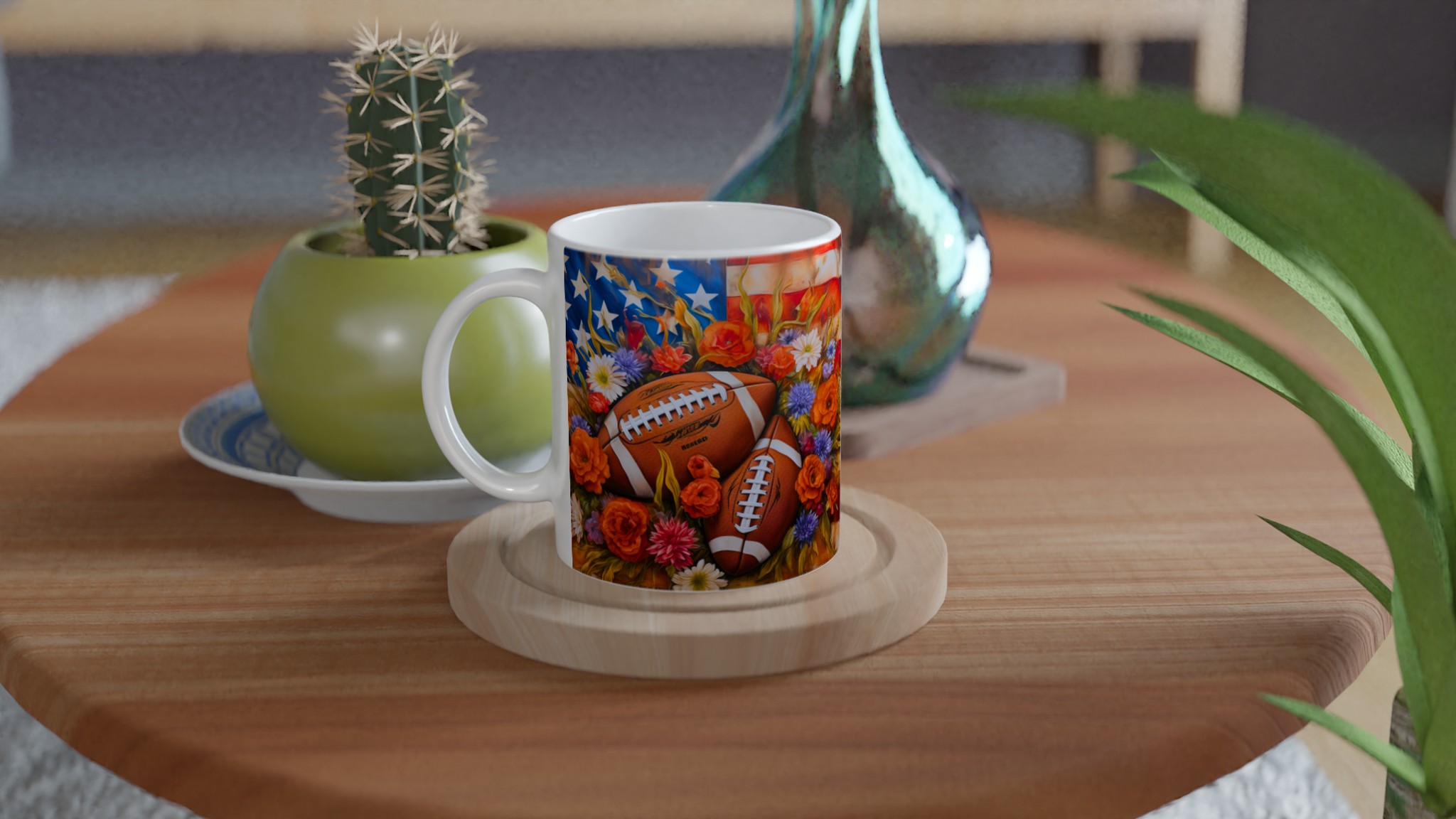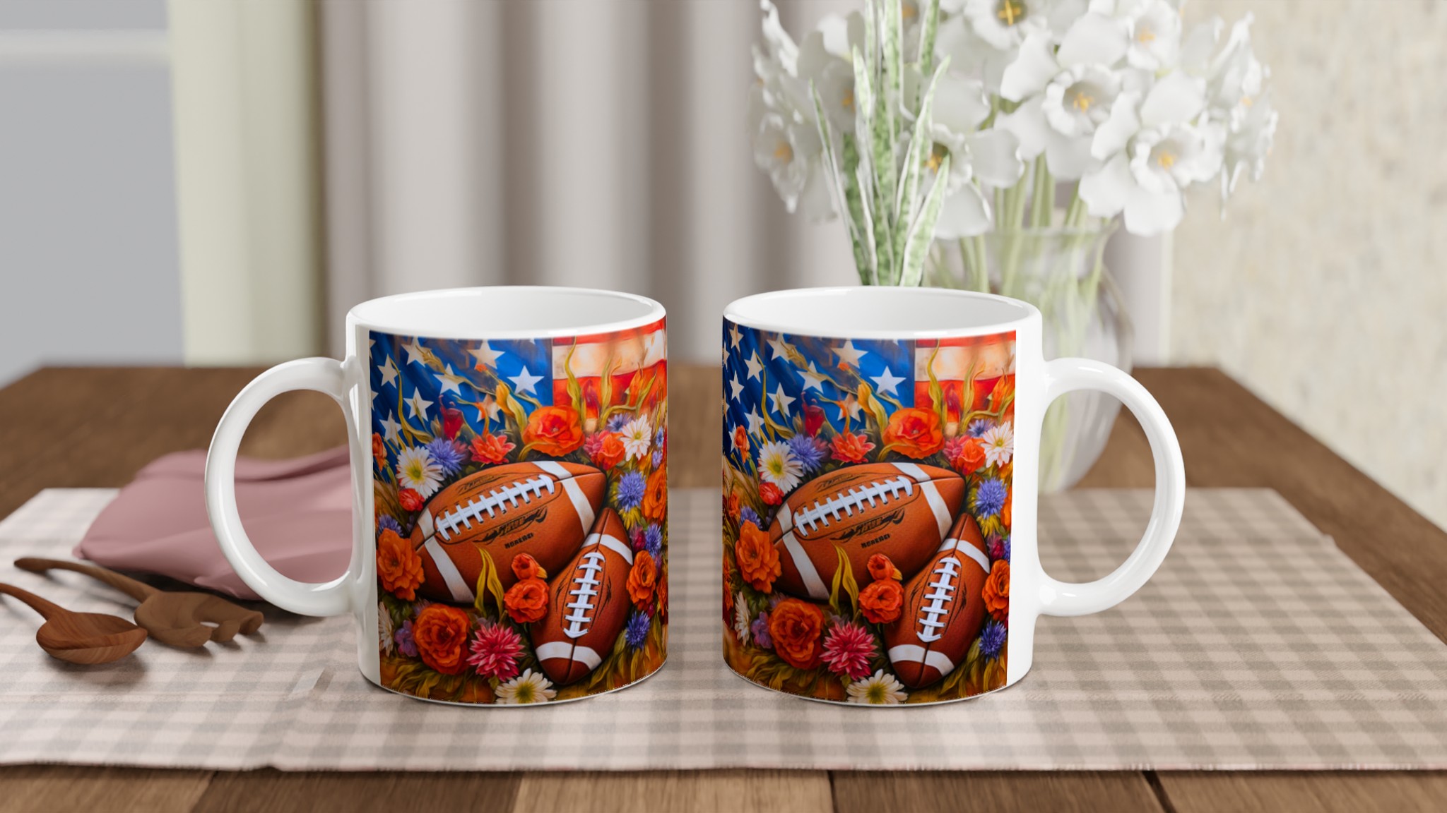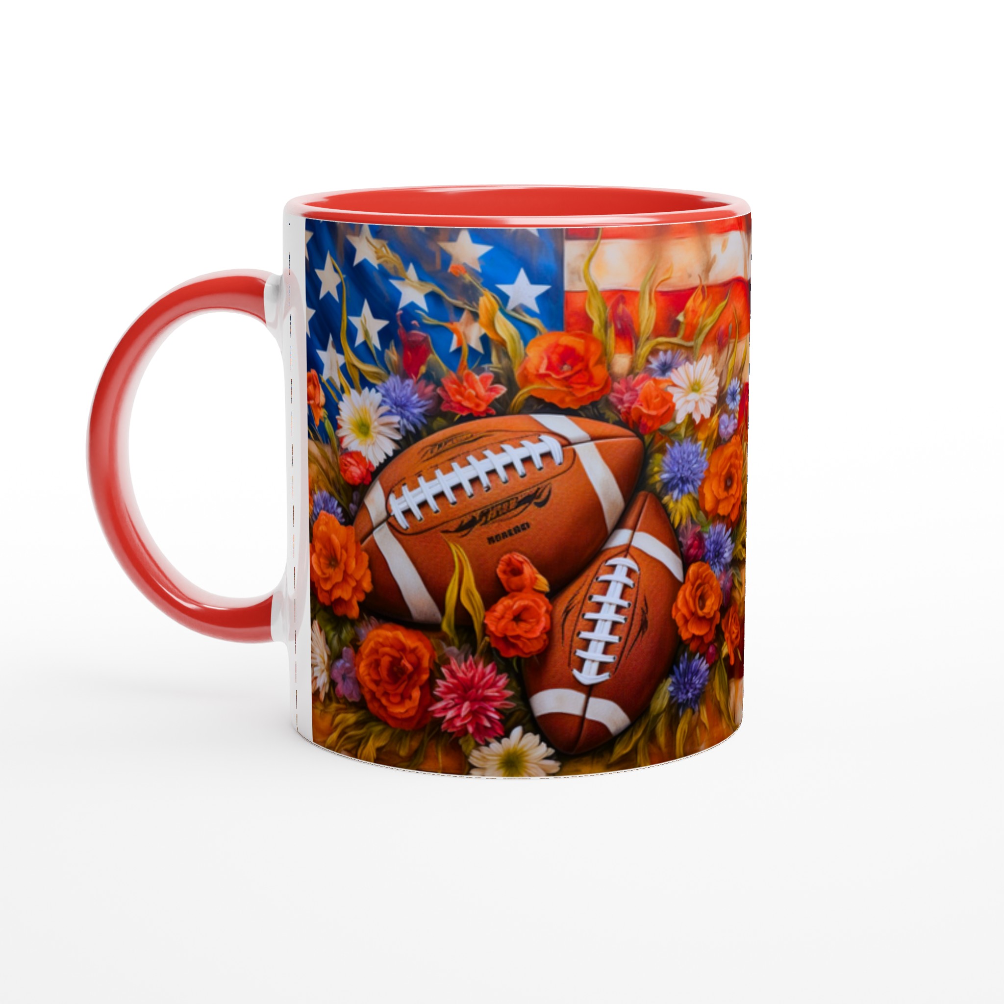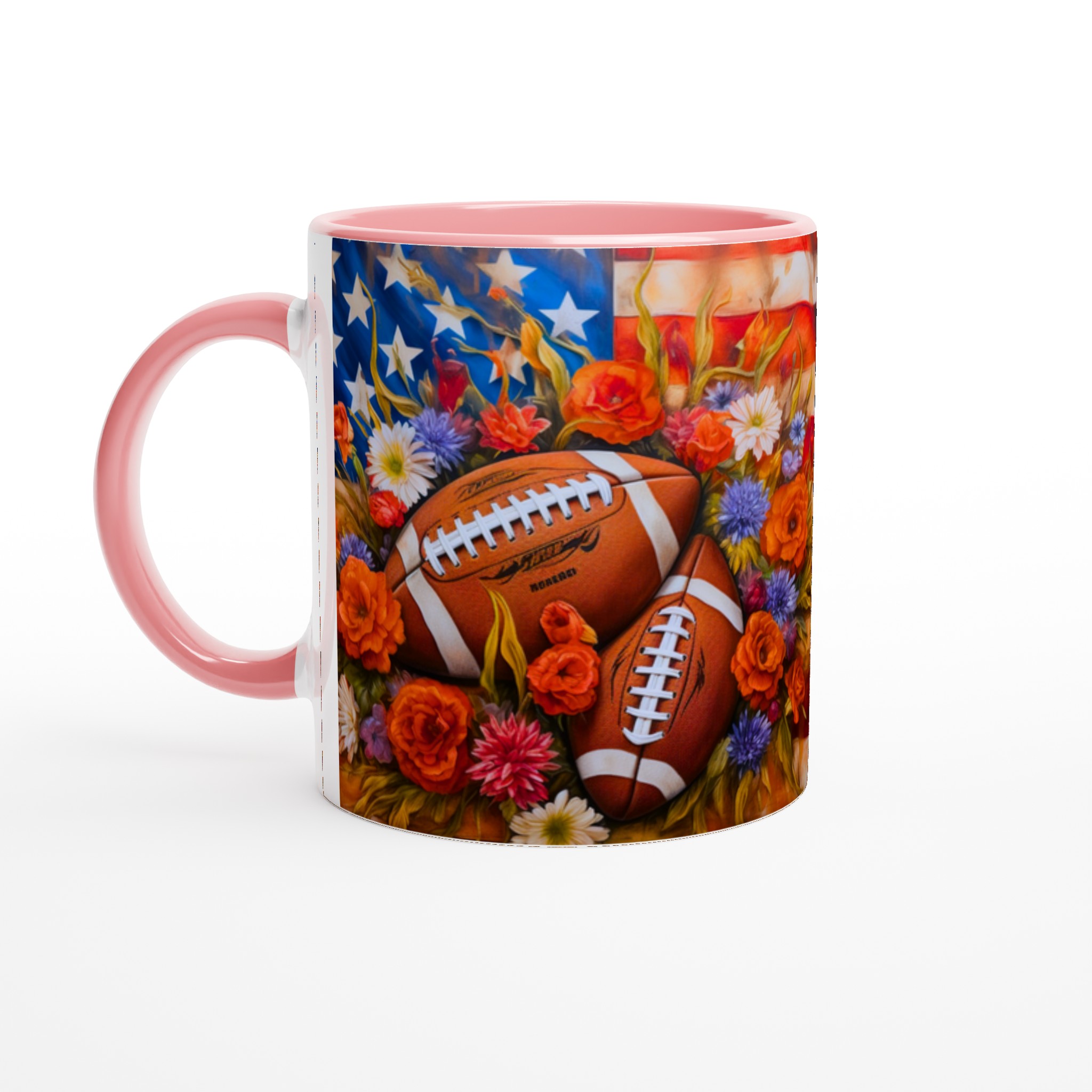 Fånga den amerikanska andan med denna unika keramiska mugg, designad för sportentusiasten med sinne för färg och form. Med en levande illustration av amerikanska fotbollar inbäddade bland en explosion av blommor mot en stjärnspäckad bakgrund, blir varje sip en hyllning till både sport och skönhet.