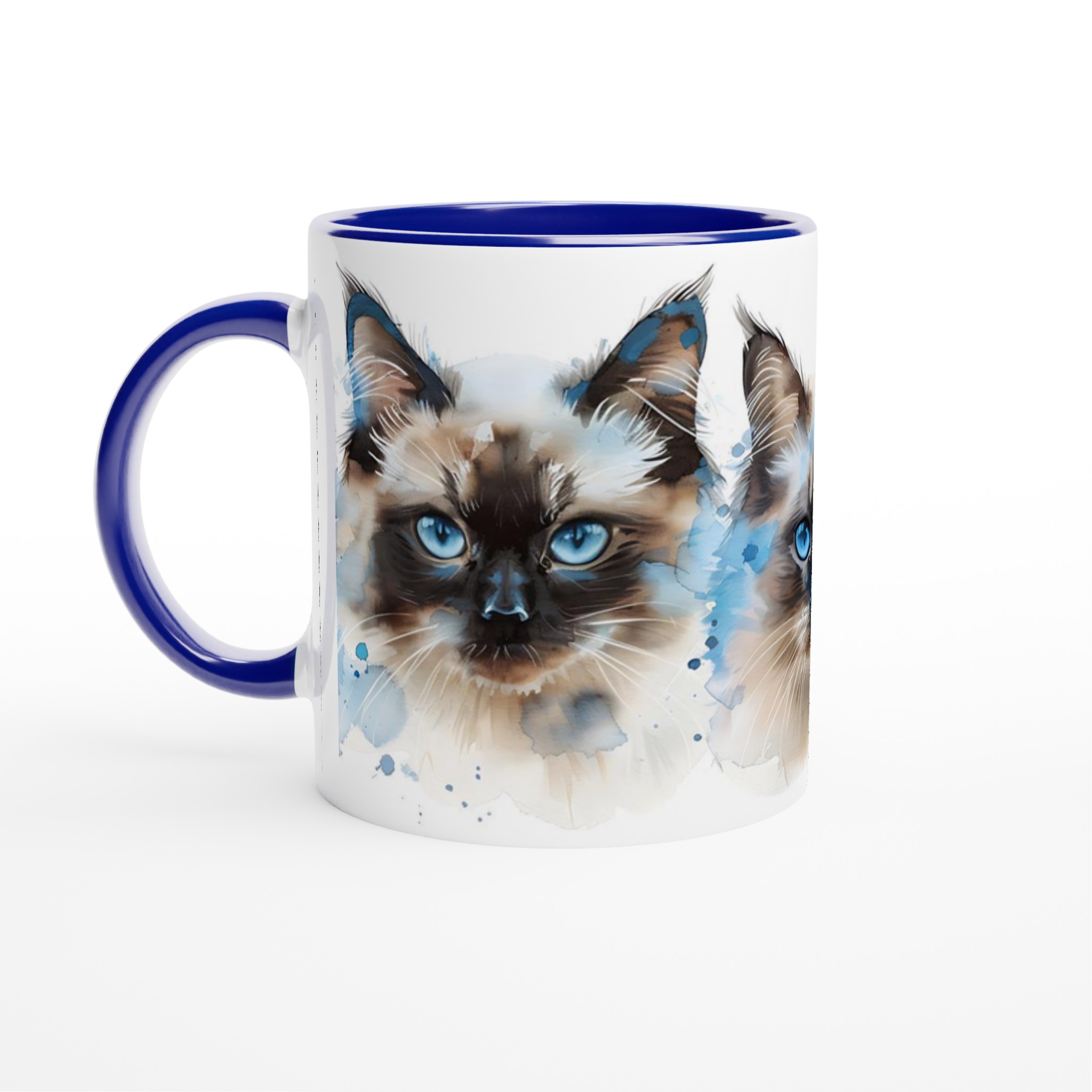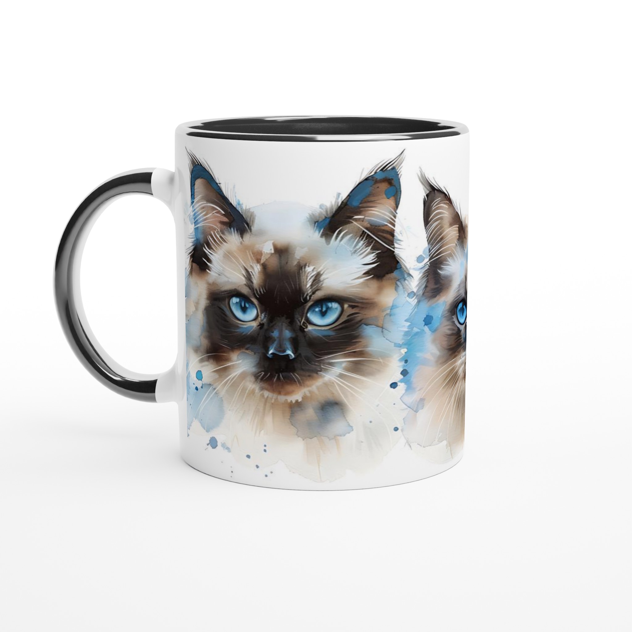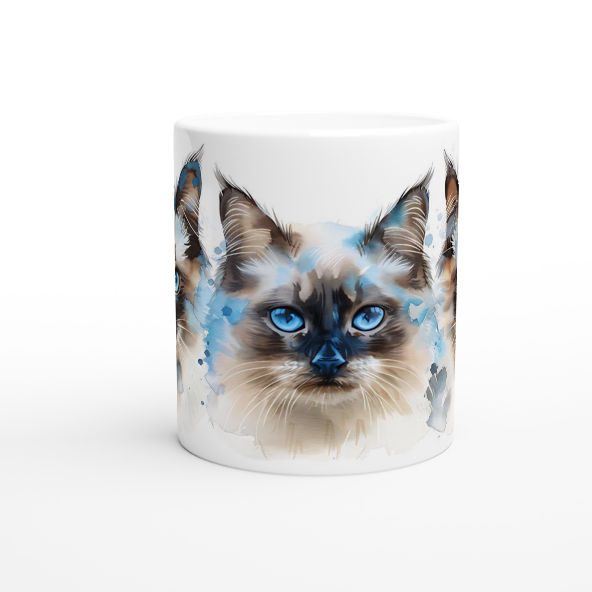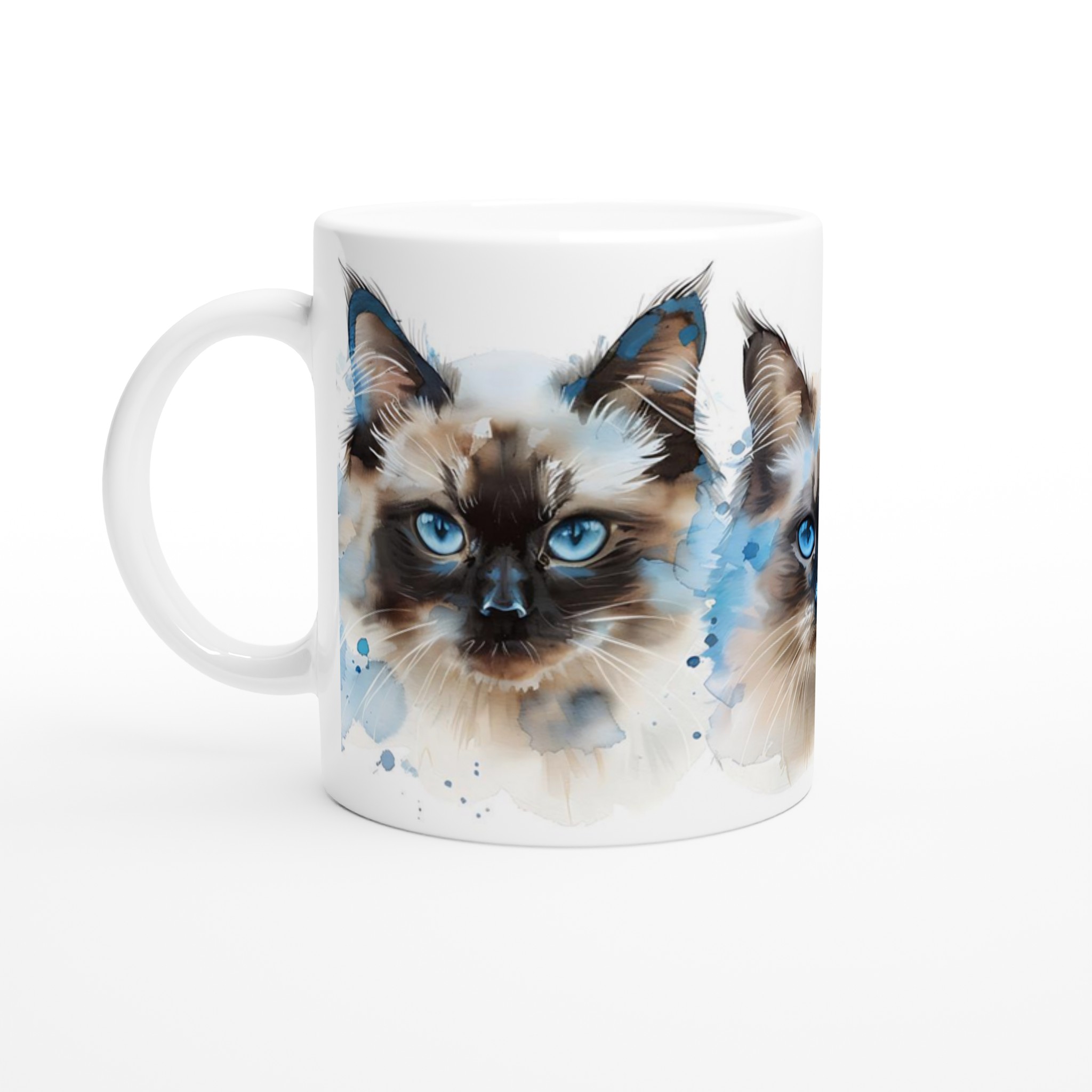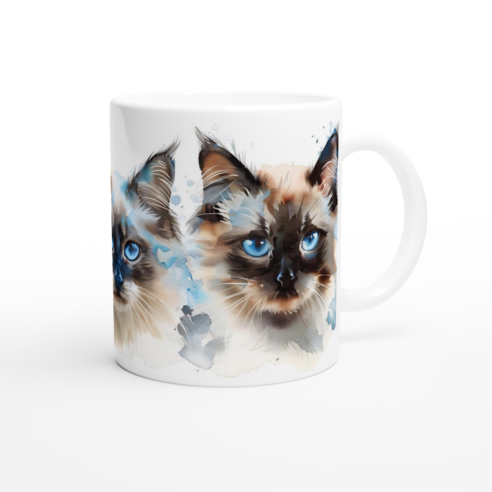 Låt dig förtrollas av de intensivt blå ögonen hos dessa underbara akvarellkatter varje gång du tar en klunk! Denna stilrena keramiska mugg blir snabbt en vardagsfavorit, perfekt för morgonkaffet, kvällens varma choklad eller när du bara vill njuta av en kopp te. Varje kattporträtt är utfört i en luftig akvarellstil med mjuka penseldrag och stänk av klarblått, vilket ger en konstnärlig touch till din dryckesstund.