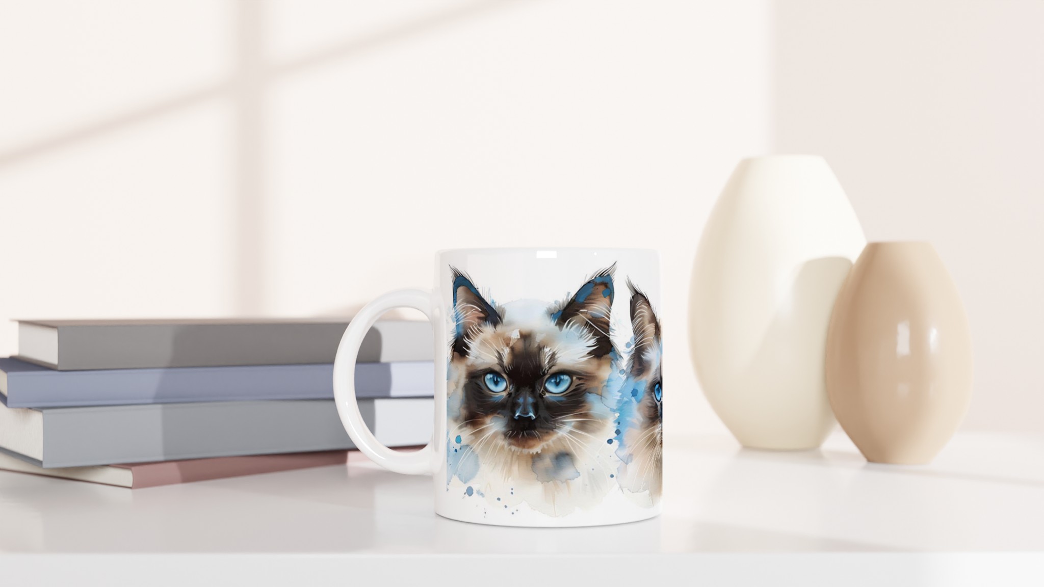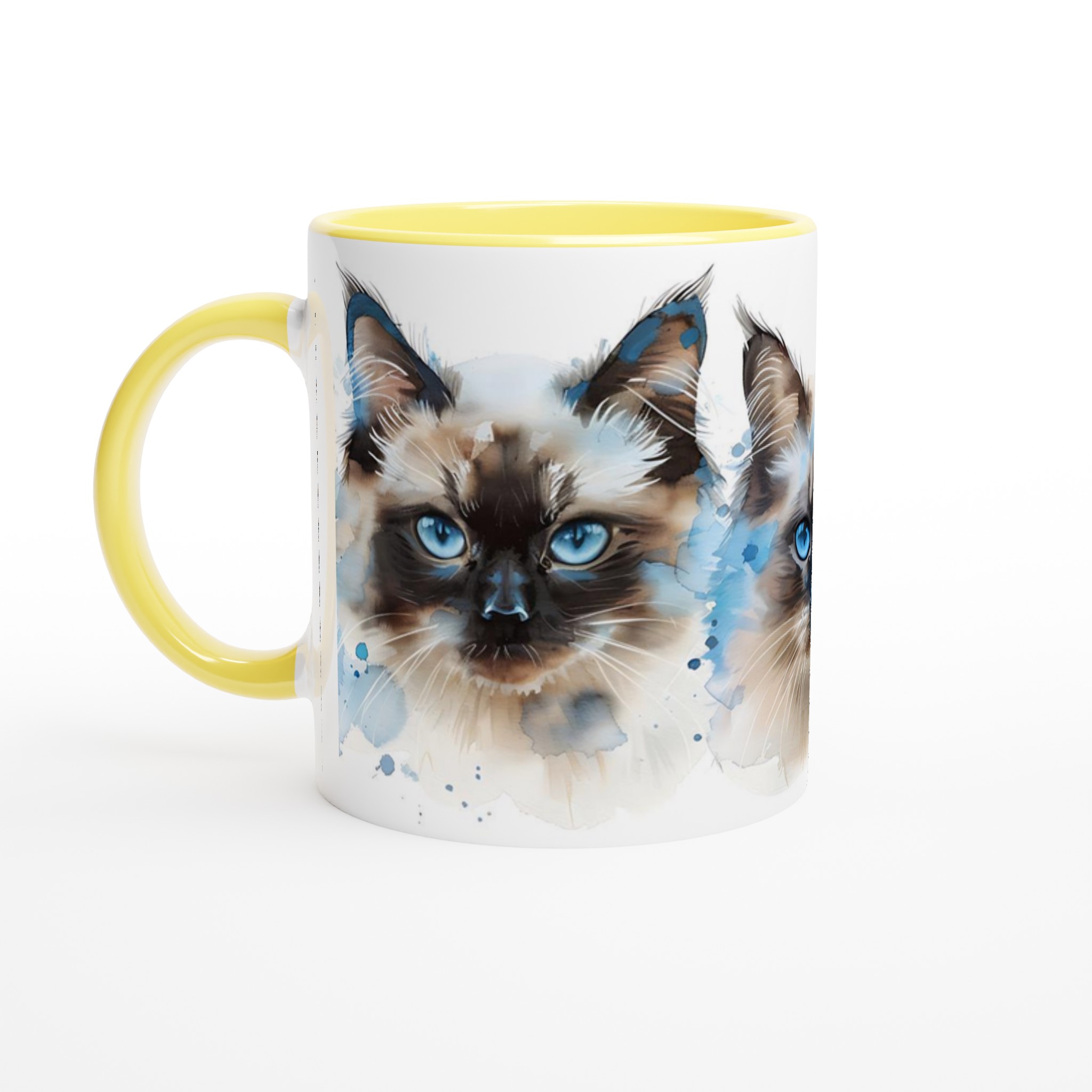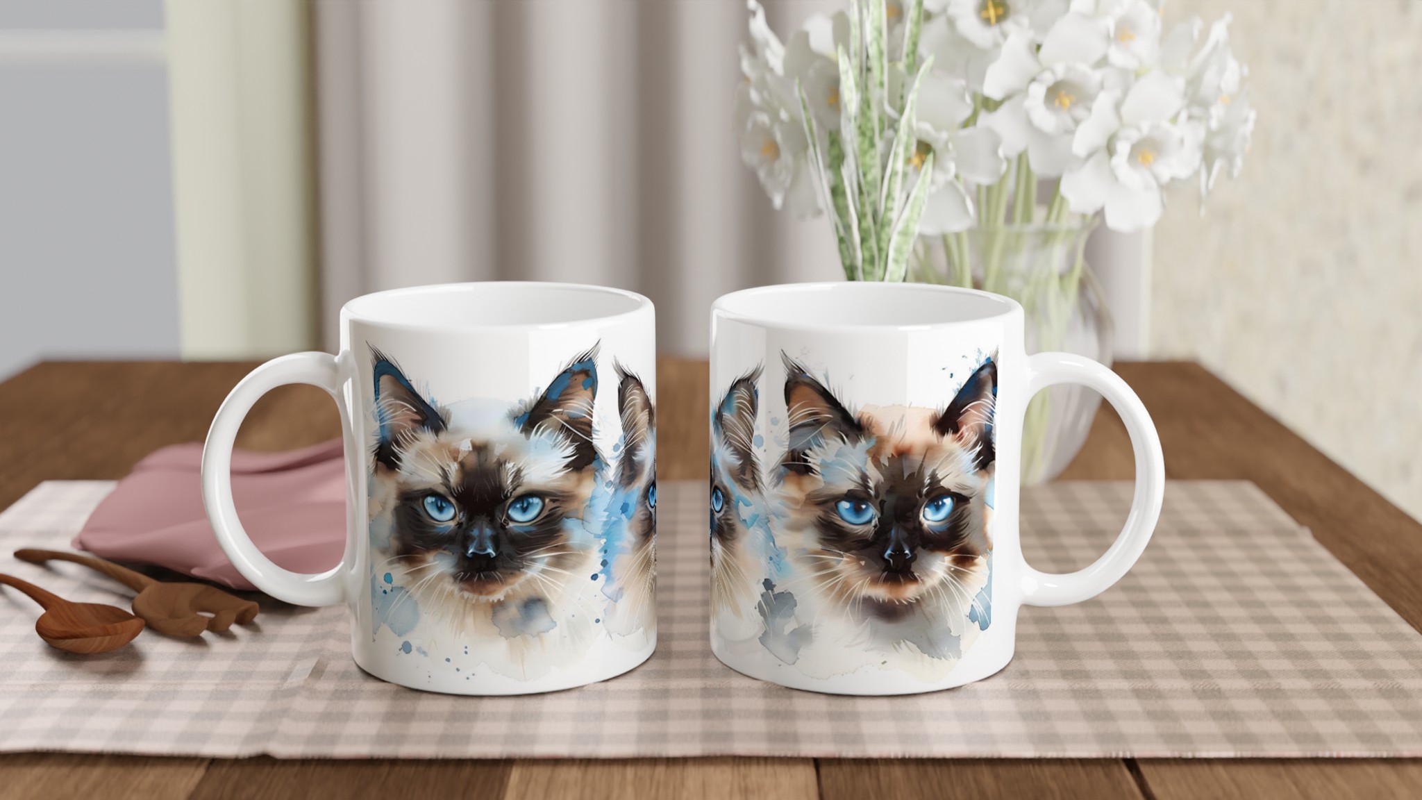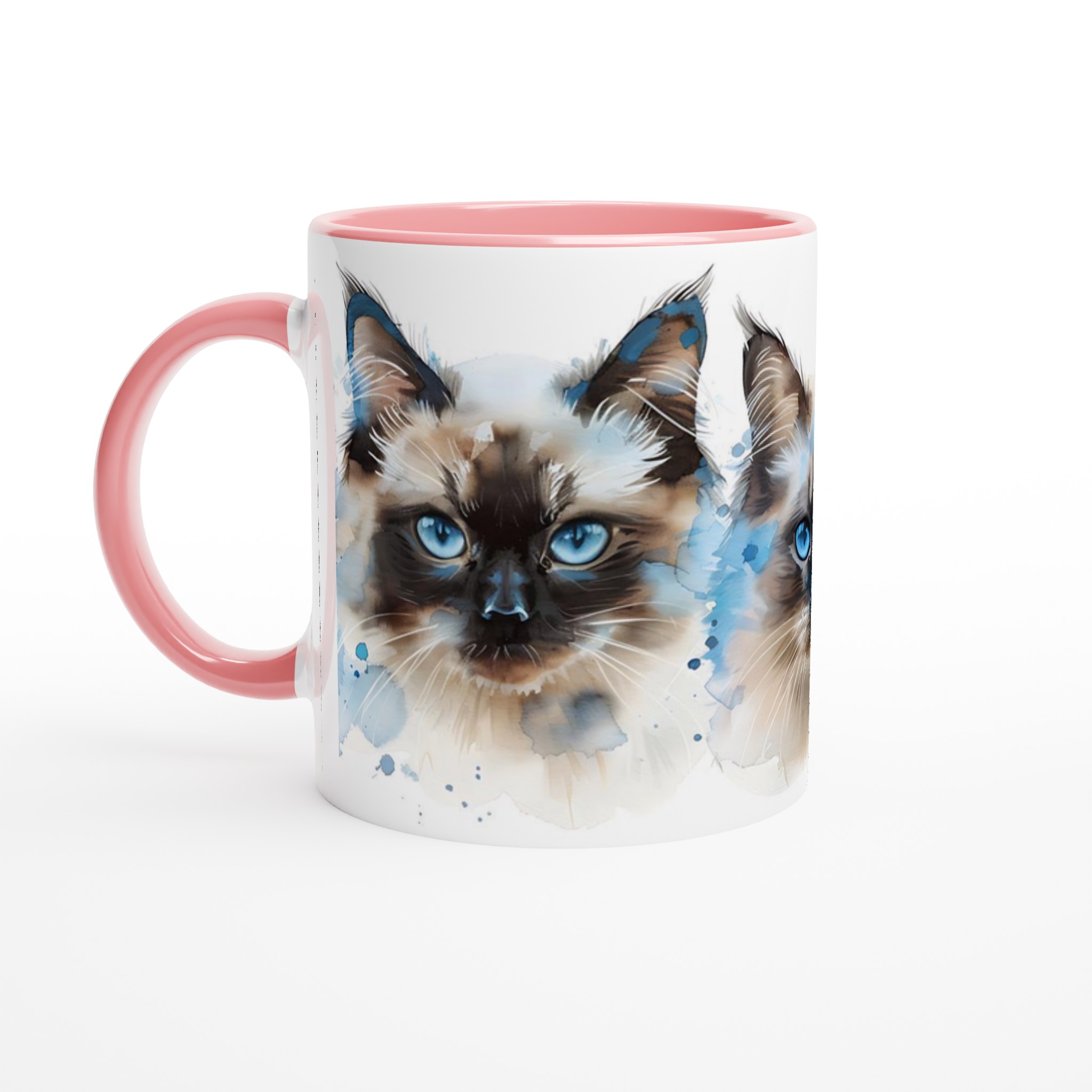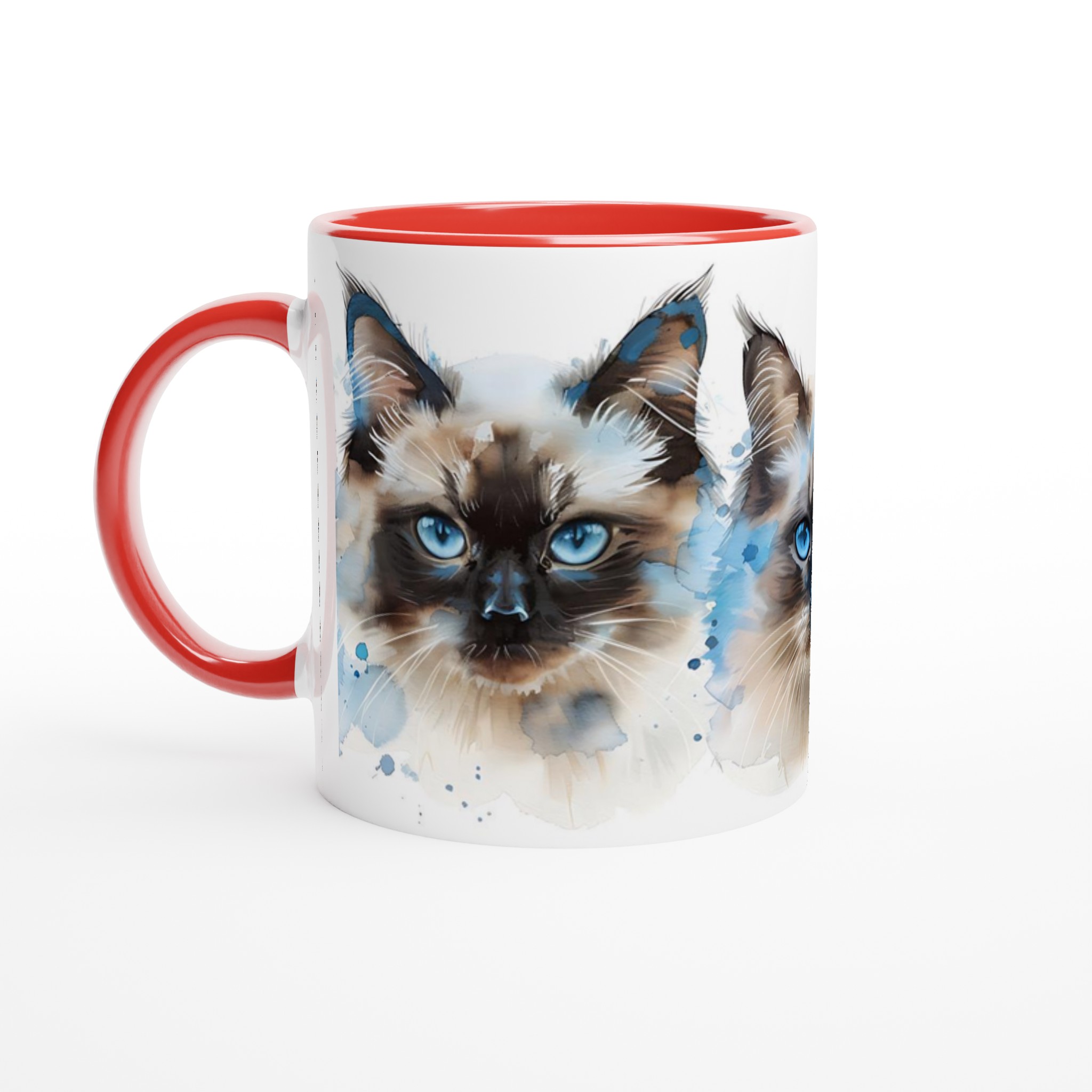 Låt dig förtrollas av de intensivt blå ögonen hos dessa underbara akvarellkatter varje gång du tar en klunk! Denna stilrena keramiska mugg blir snabbt en vardagsfavorit, perfekt för morgonkaffet, kvällens varma choklad eller när du bara vill njuta av en kopp te. Varje kattporträtt är utfört i en luftig akvarellstil med mjuka penseldrag och stänk av klarblått, vilket ger en konstnärlig touch till din dryckesstund.