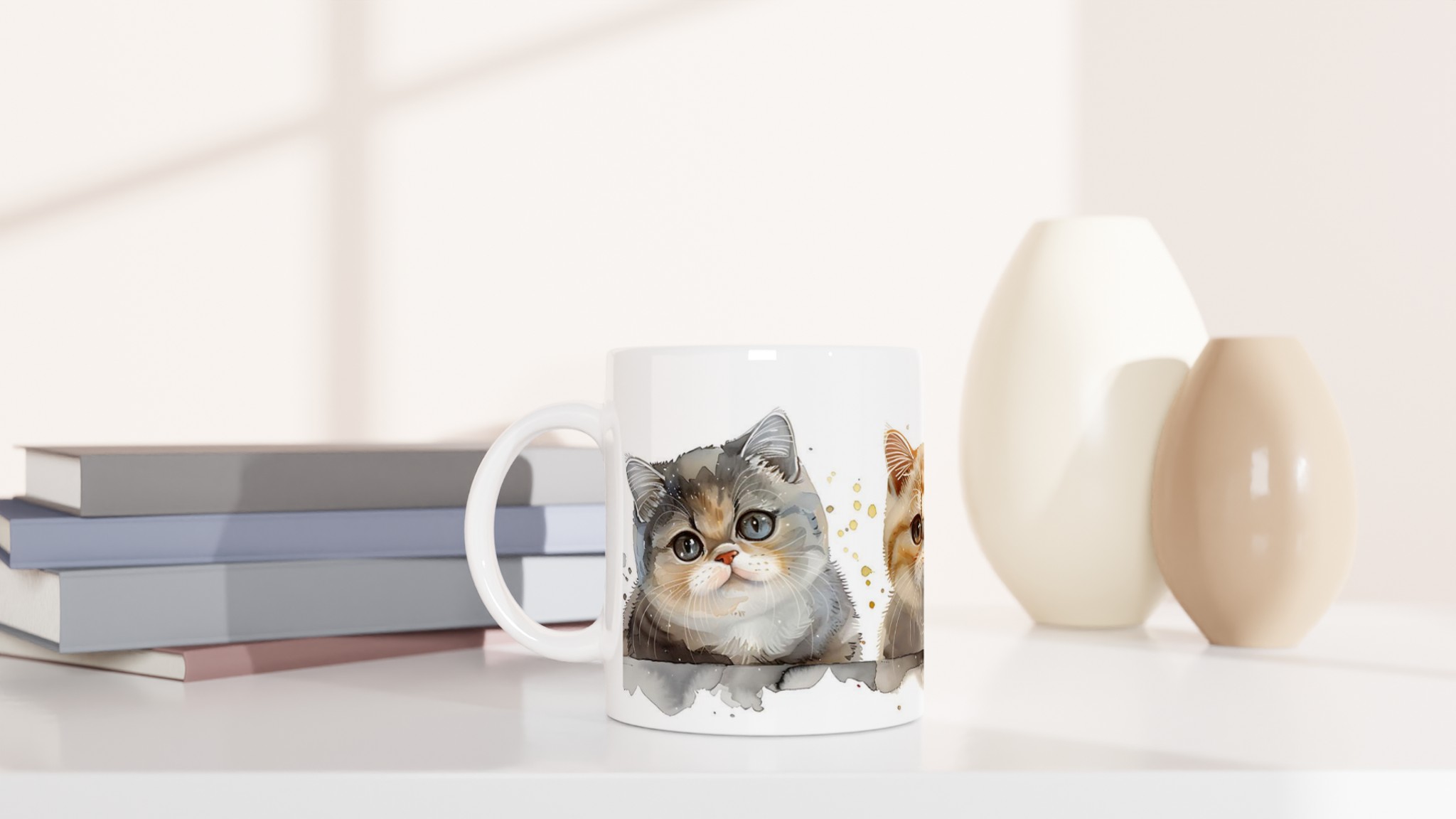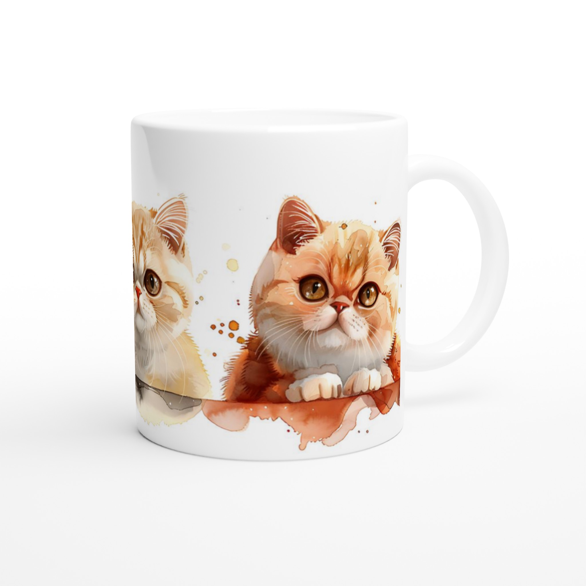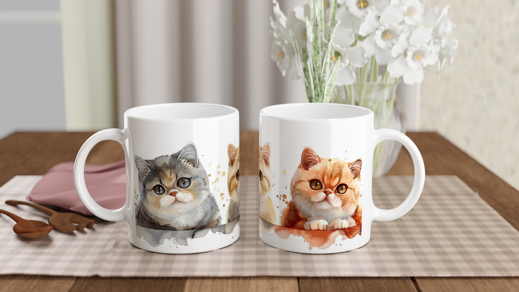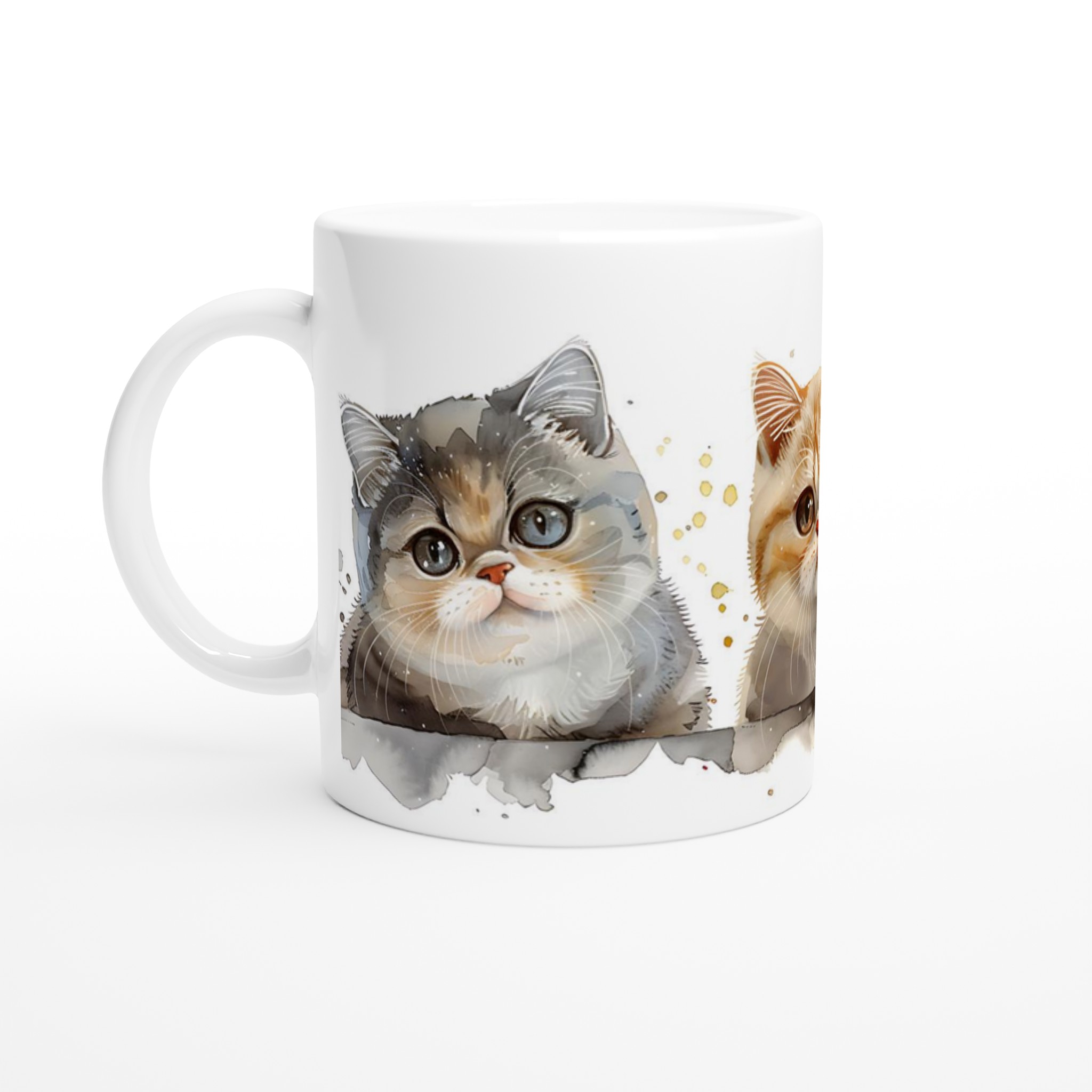Väck liv i dina fikapauser med denna oemotståndliga keramiska mugg, prydd med en lekfull akvarellillustration av tre bedårande kattungar. Varje mugg fångar den mjuka, uttrycksfulla charmen hos dessa små lurviga vänner, med en konstnärlig touch som smälter in perfekt i varje hem. Vare sig det är för morgonkaffet, kvällens varma choklad eller en lugn stund med te, kommer denna mugg snabbt att bli din nya favorit.