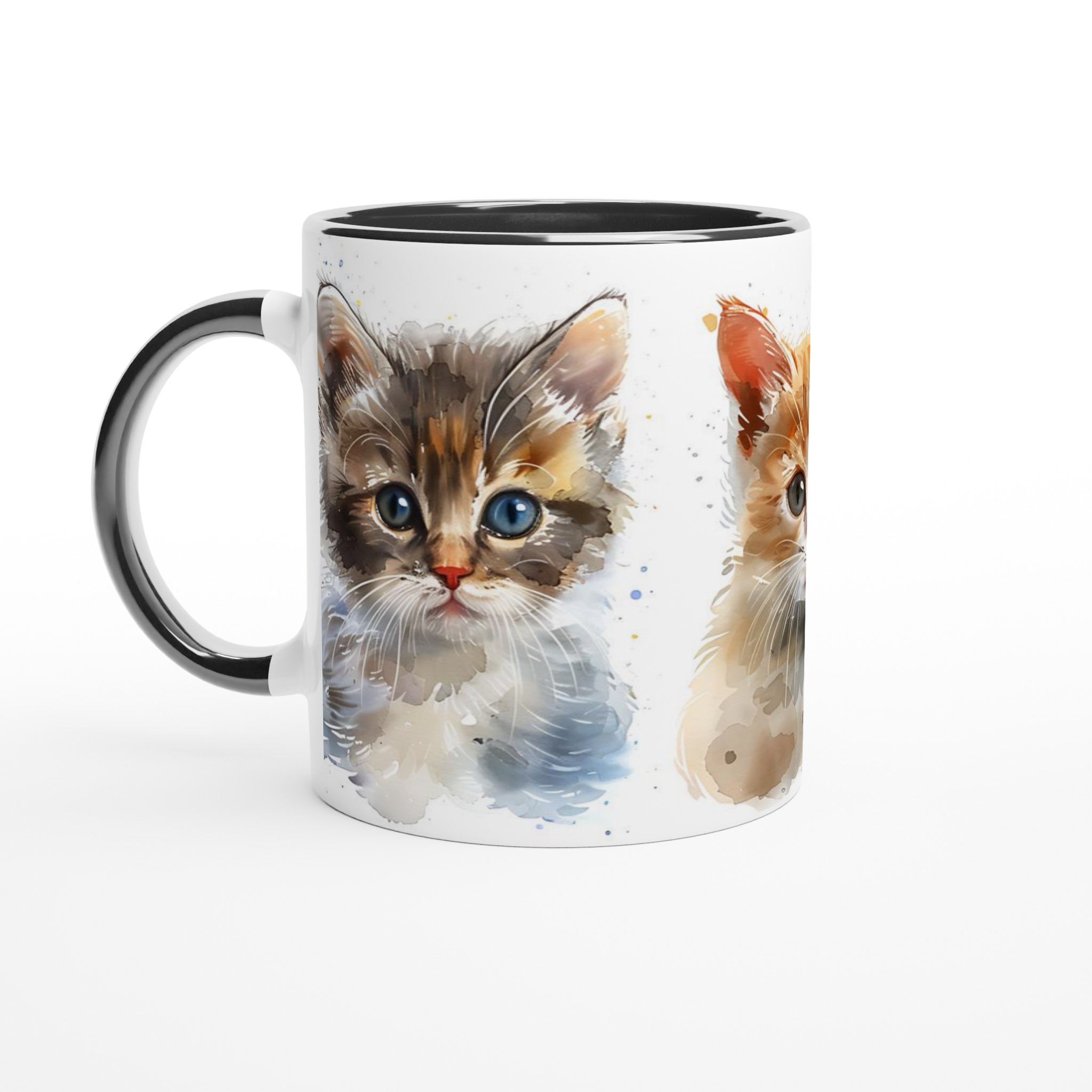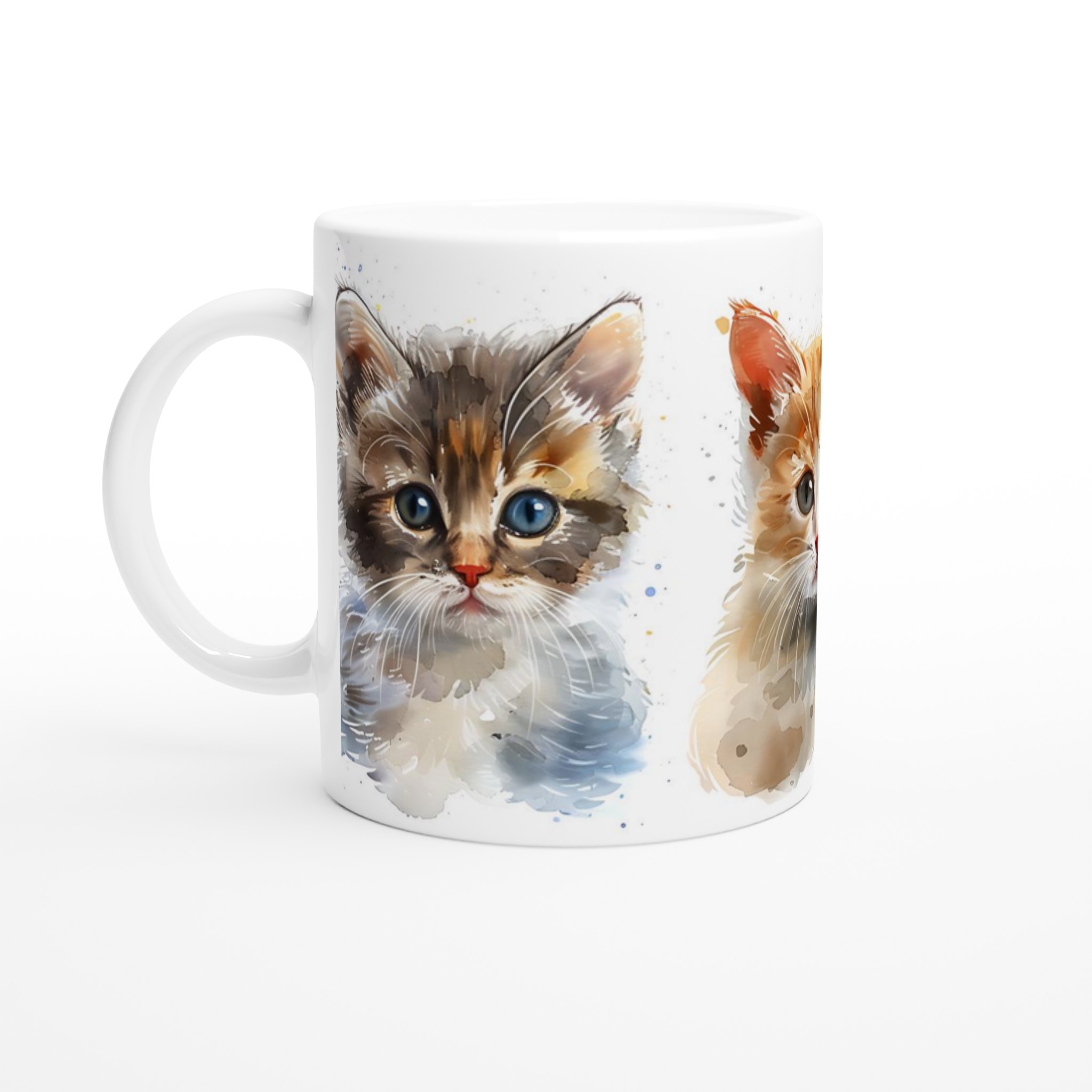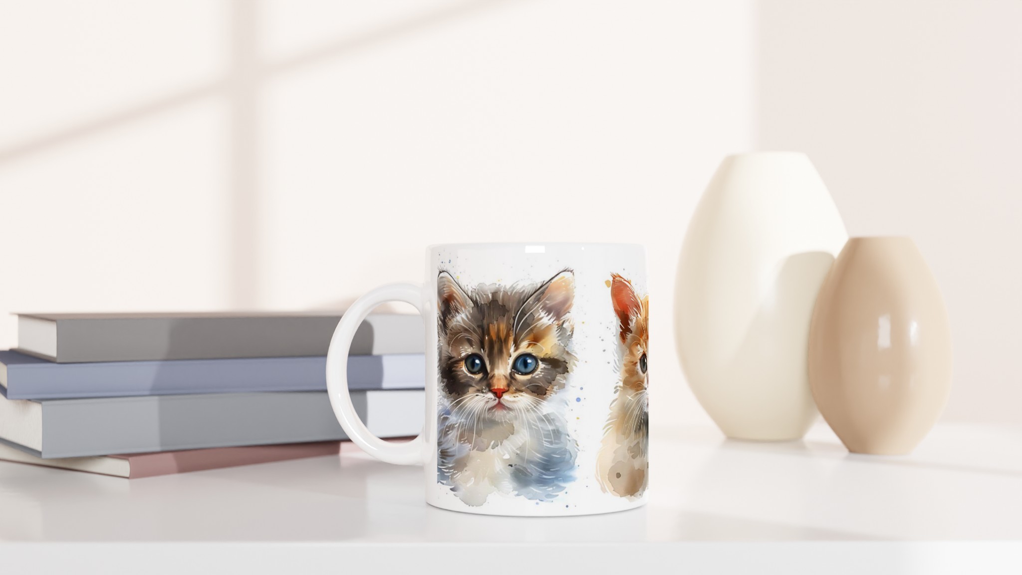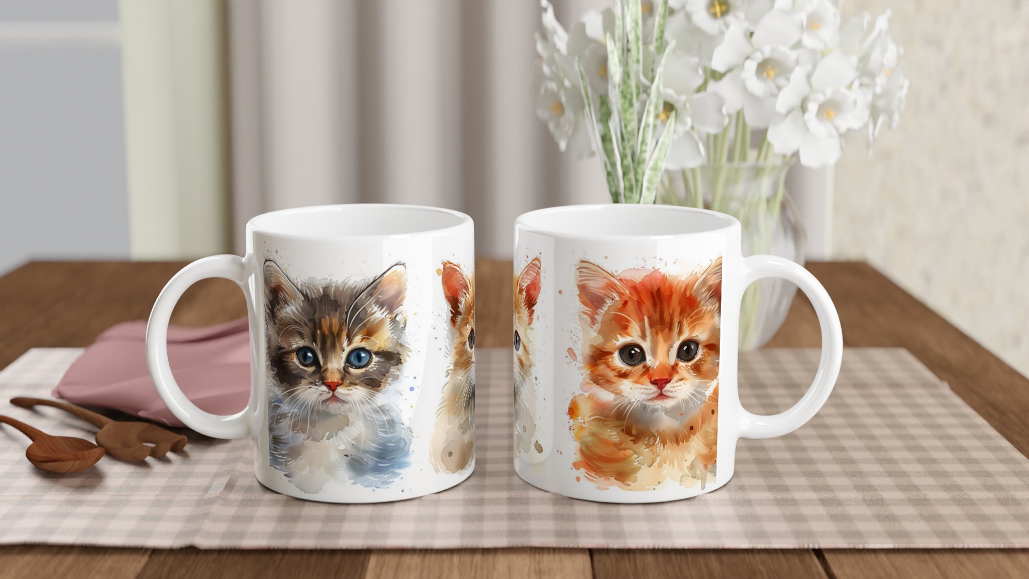 Fånga hjärtan med varje klunk! Den här stilrena keramiska muggen blir snabbt en vardagsfavorit. Med sitt bedårande tryck av akvarellmålade kattungar, fulla av liv och lekfullhet, är den perfekt för morgonkaffet, kvällens varma choklad eller när du bara vill njuta av en kopp te.