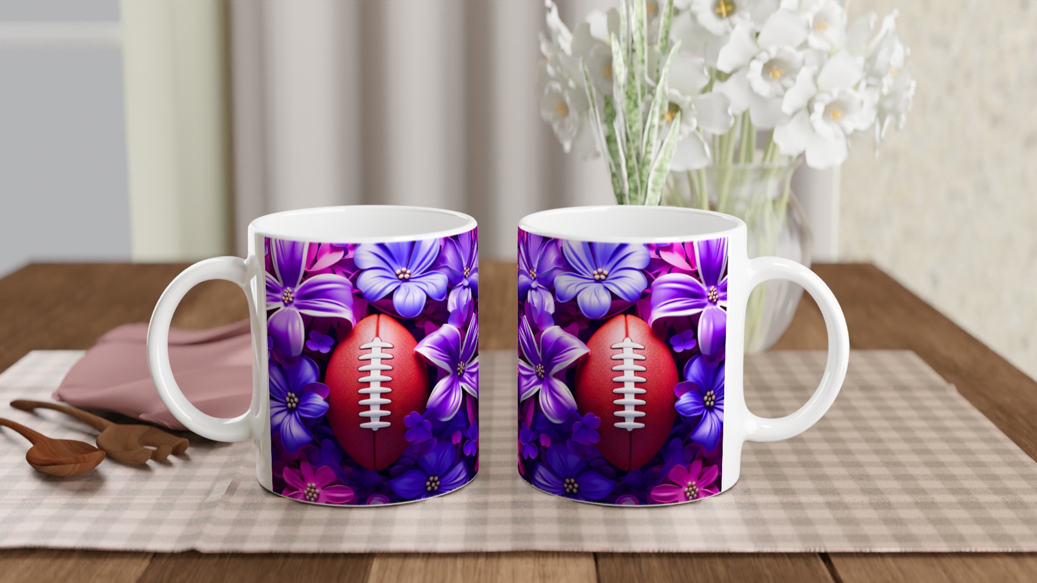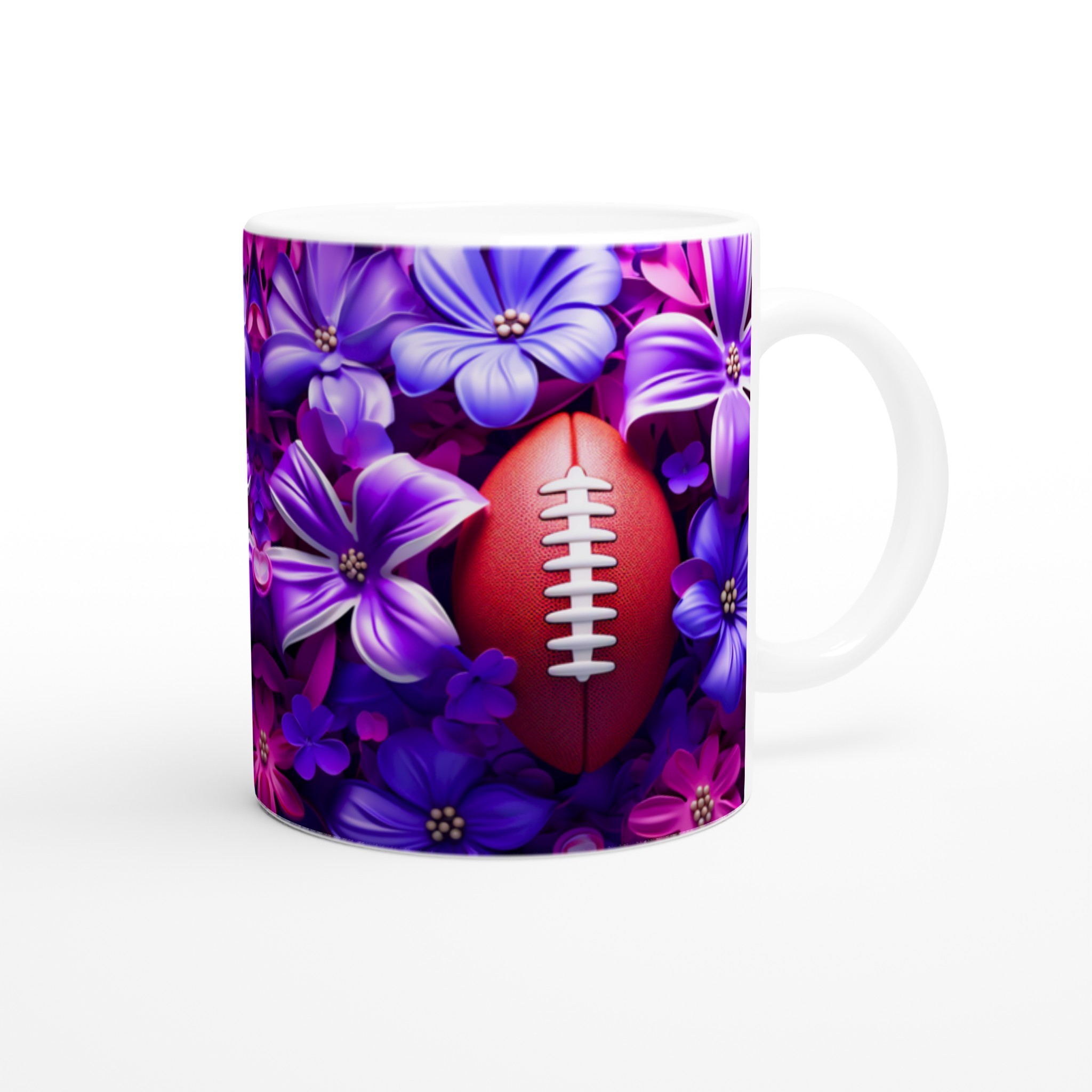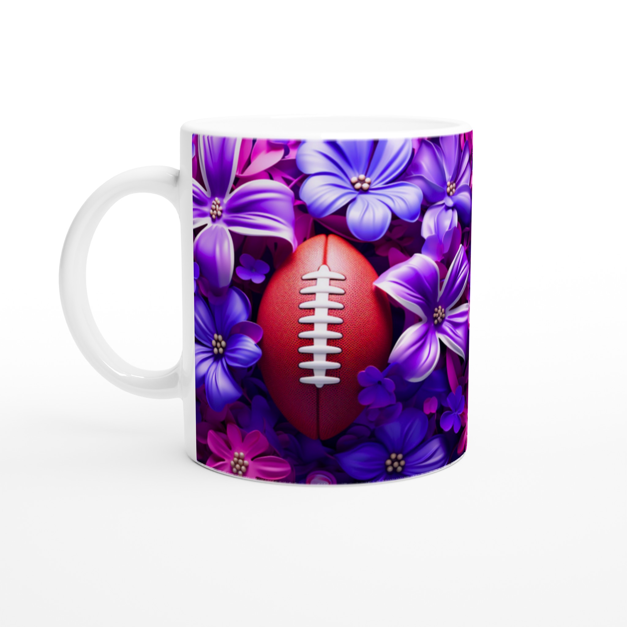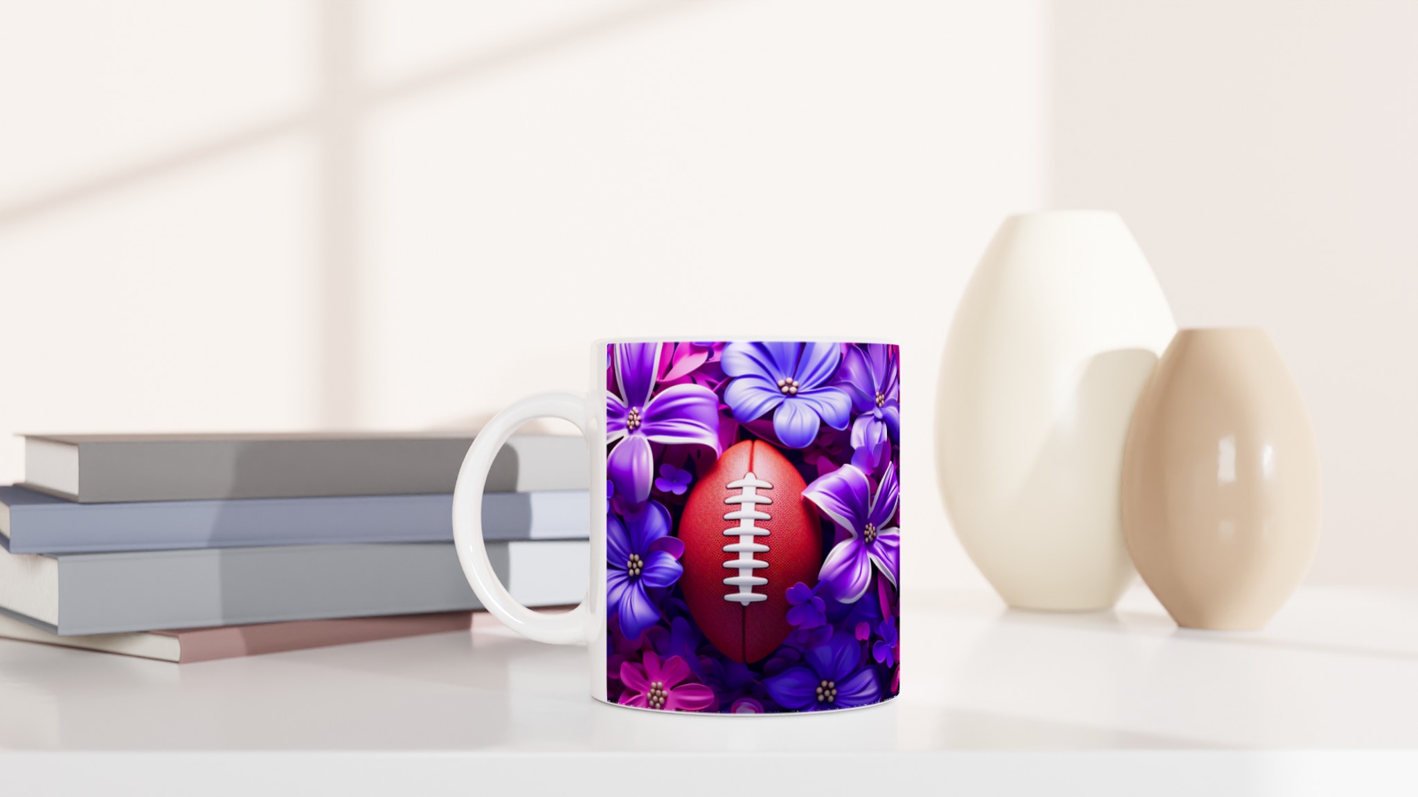 Skäm bort dig själv eller någon du håller kär med denna unika keramiska mugg, som förenar sportens passion med naturens skönhet. Den livfulla designen, inspirerad av amerikansk fotboll omgiven av frodiga lila och rosa blommor, skapar en iögonfallande kontrast som gör varje klunk till en upplevelse. Oavsett om du laddar upp inför matchdagen med morgonkaffet, kopplar av med en varm choklad på kvällen, eller njuter av en lugn te-stund, kommer denna mugg snabbt att bli din favorit.