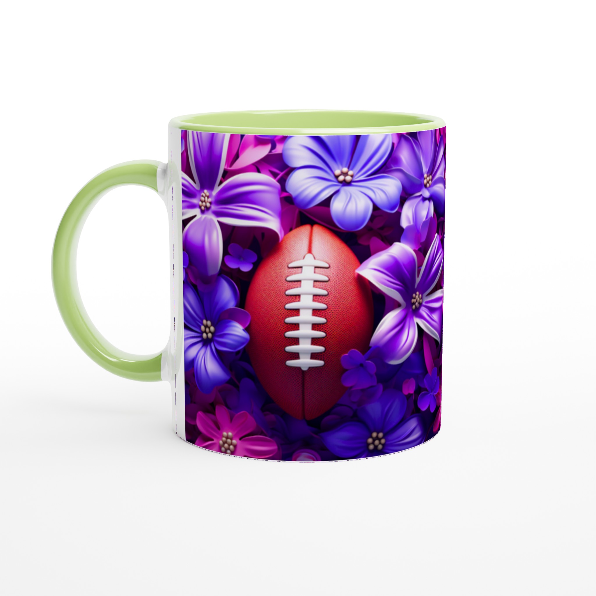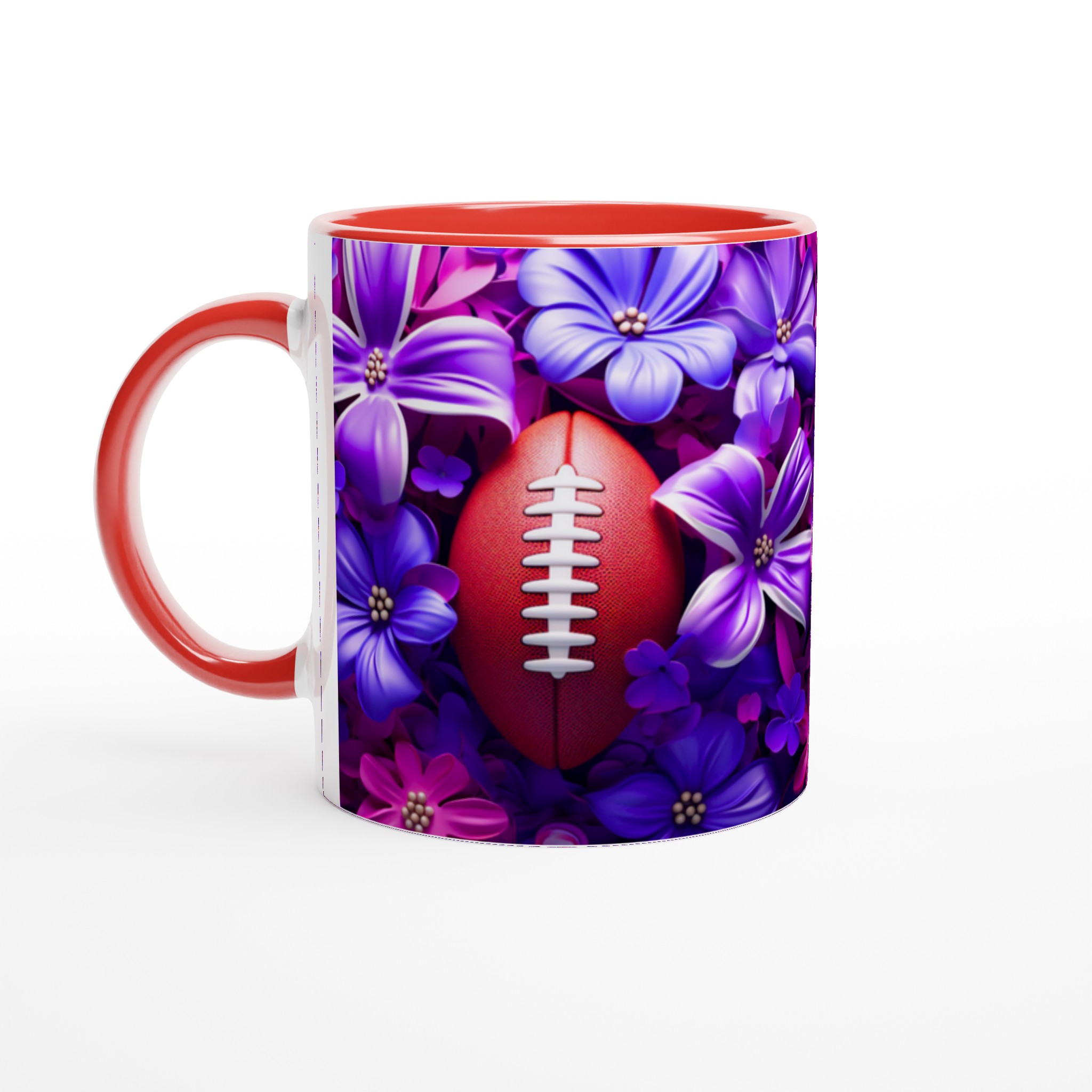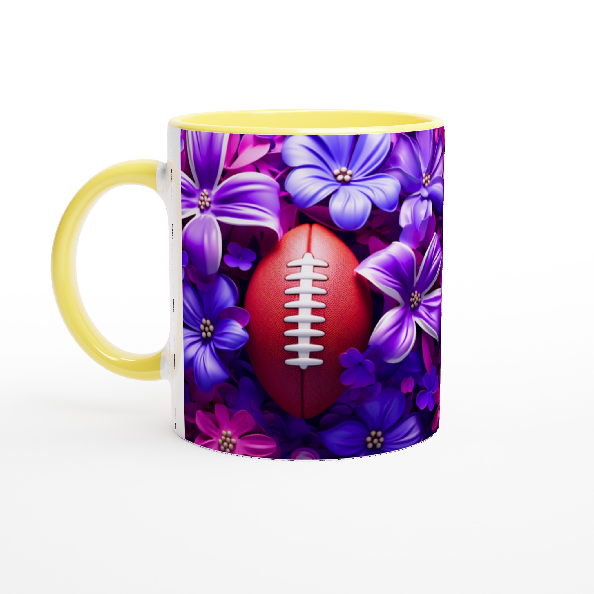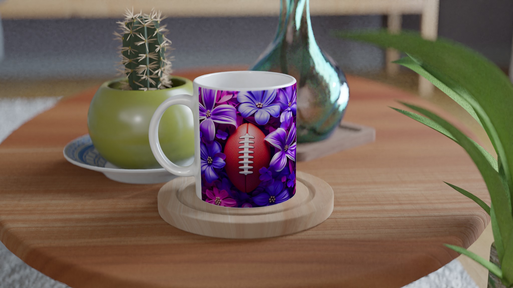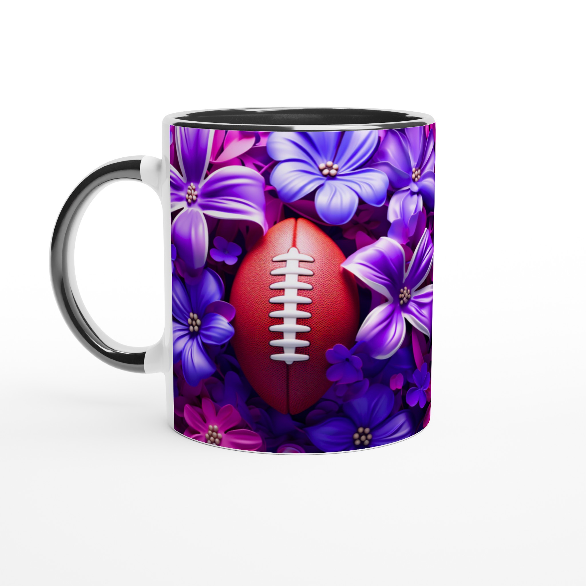 Skäm bort dig själv eller någon du håller kär med denna unika keramiska mugg, som förenar sportens passion med naturens skönhet. Den livfulla designen, inspirerad av amerikansk fotboll omgiven av frodiga lila och rosa blommor, skapar en iögonfallande kontrast som gör varje klunk till en upplevelse. Oavsett om du laddar upp inför matchdagen med morgonkaffet, kopplar av med en varm choklad på kvällen, eller njuter av en lugn te-stund, kommer denna mugg snabbt att bli din favorit.