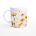 Den här stilrena keramiska muggen med ett livfullt blomstermönster blir snabbt en vardagsfavorit. Perfekt för morgonkaffet, kvällens varma choklad eller när du bara vill njuta av en kopp te. Den blanka vita ytan gör att trycken, med sina klara och levande färger av gula, lila och rosa blommor mot en krämig bakgrund, framhävs och håller sig fina även efter många turer i mikron och diskmaskinen.