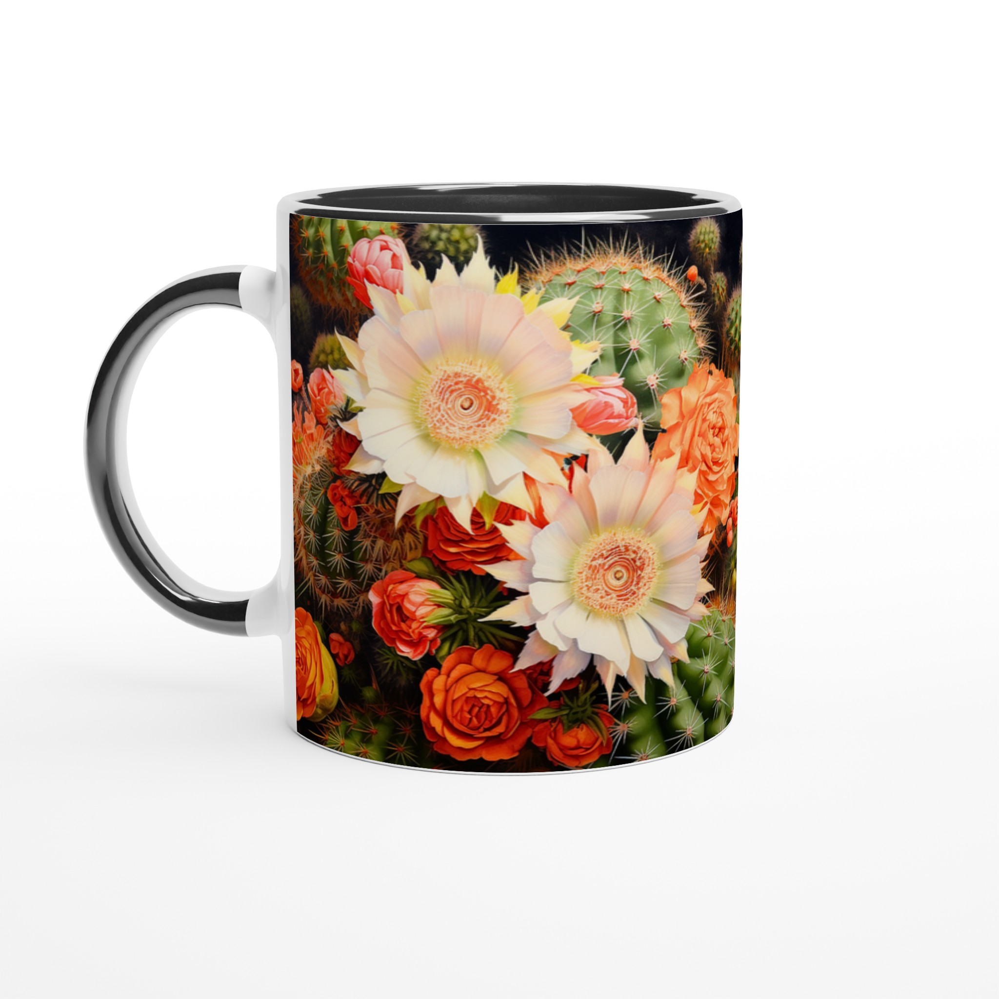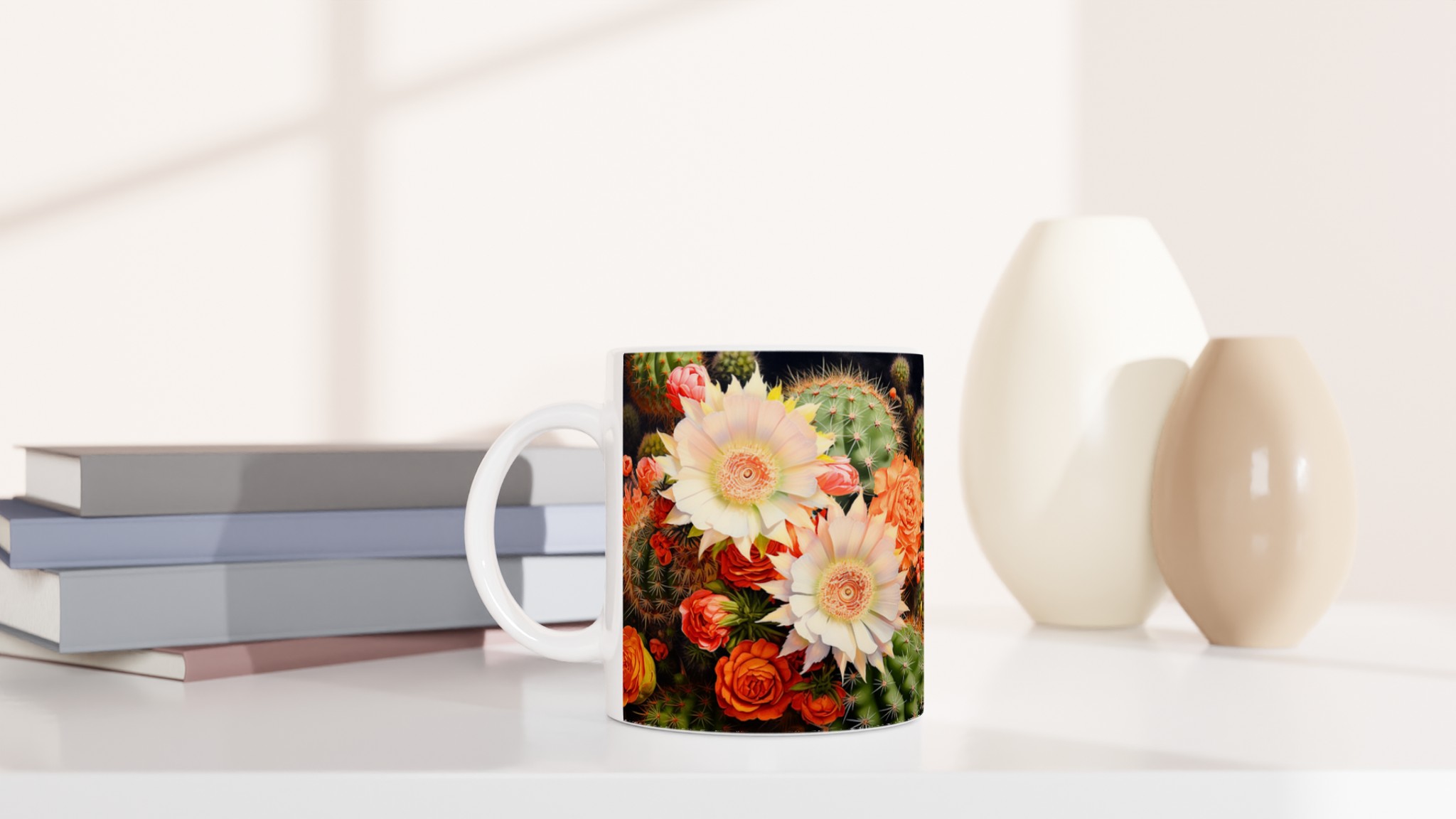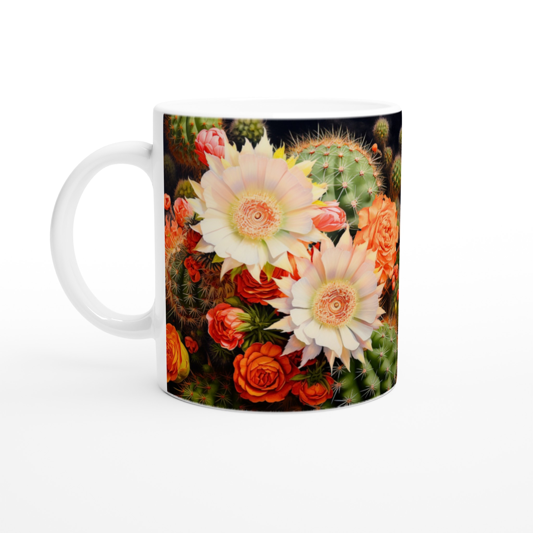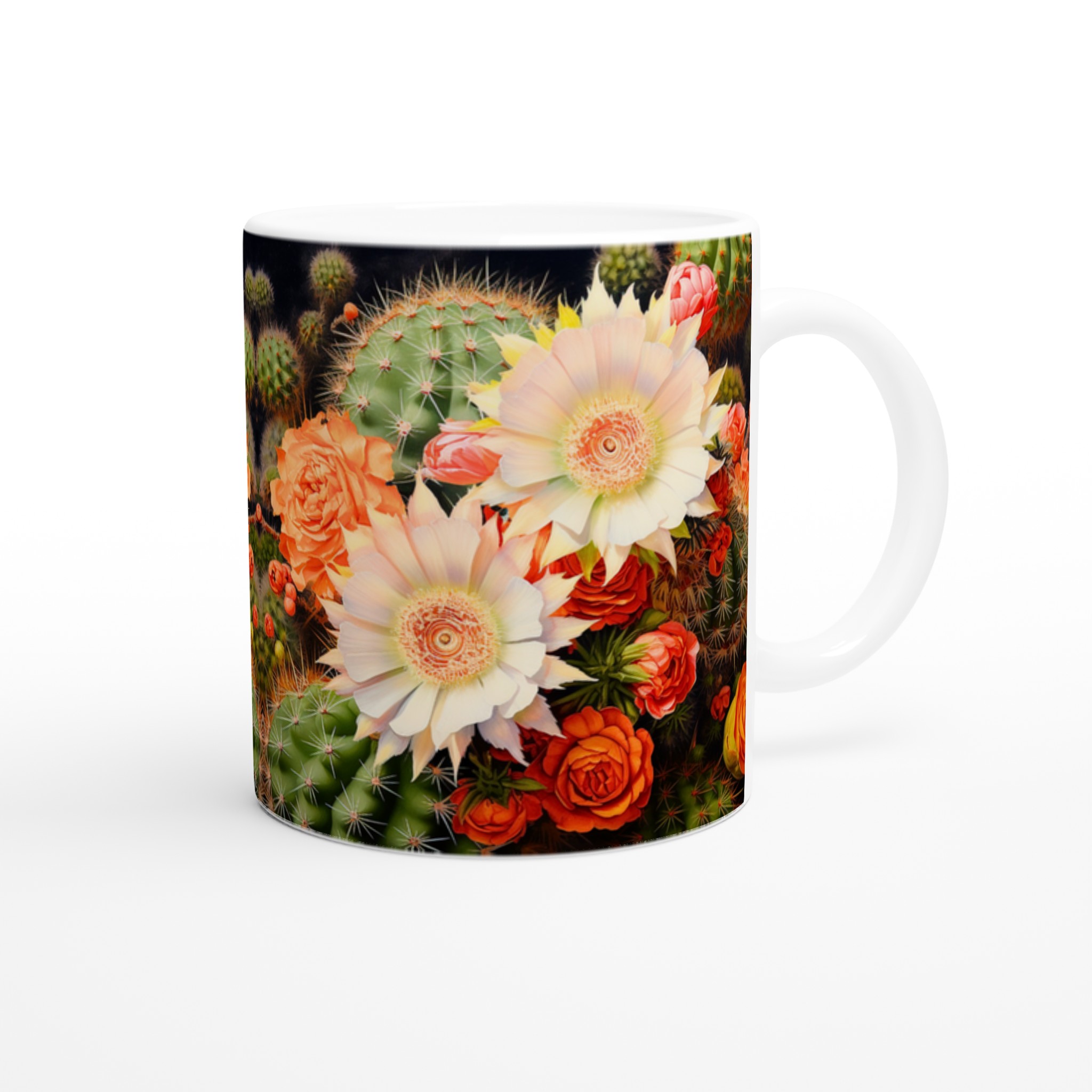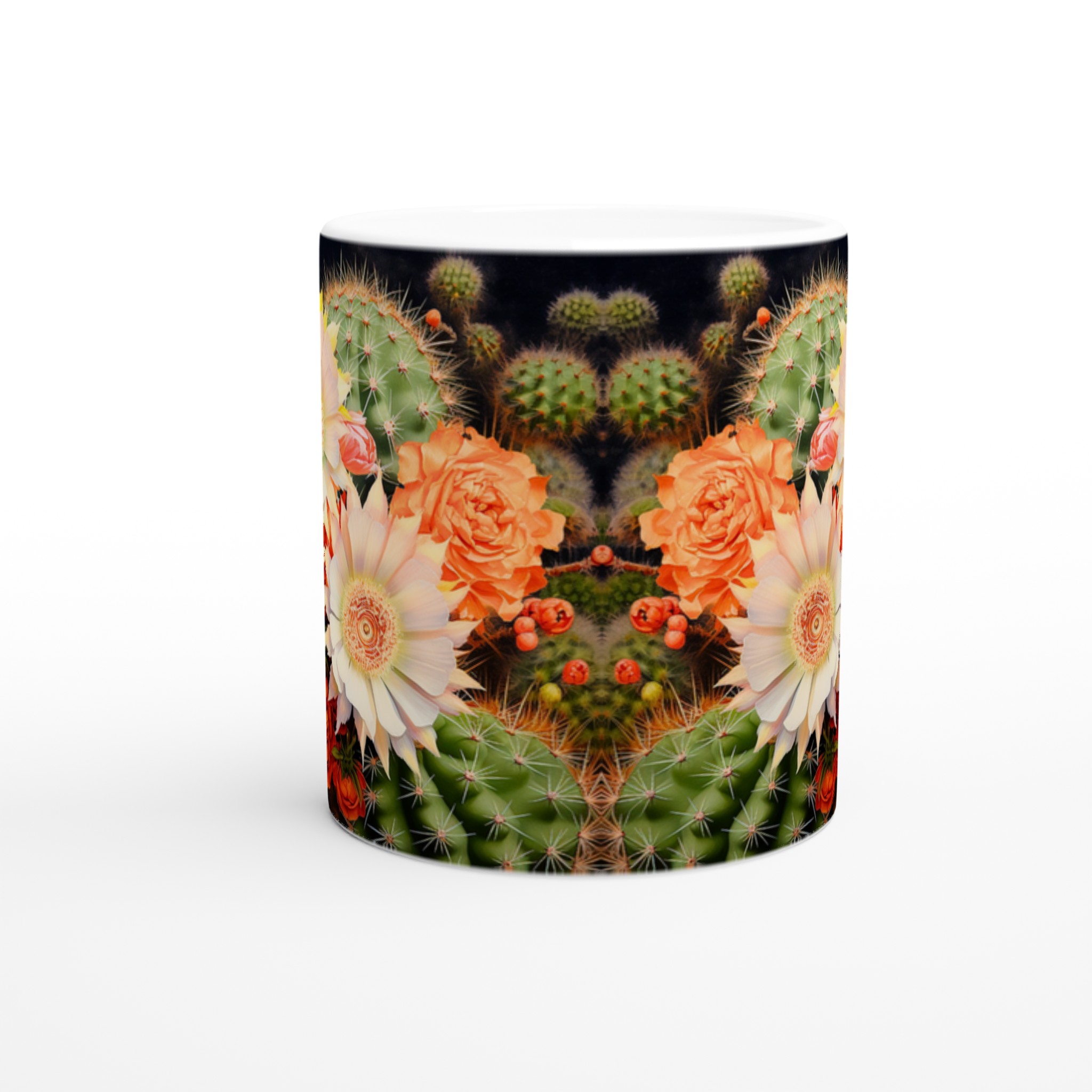 Låt varje klunk bli en resa till en förtrollande ökenträdgård med denna unika keramiska mugg. Dess design fångar den dramatiska skönheten hos blommande kaktusar och livfulla rosor i en rik palett av varmt vitt, soligt orange och frodigt grönt mot en mystisk mörk bakgrund. Denna mugg är inte bara ett kärl för din favoritdryck; den är ett konstverk som förvandlar din fikapaus till en stund av lugn och inspiration.