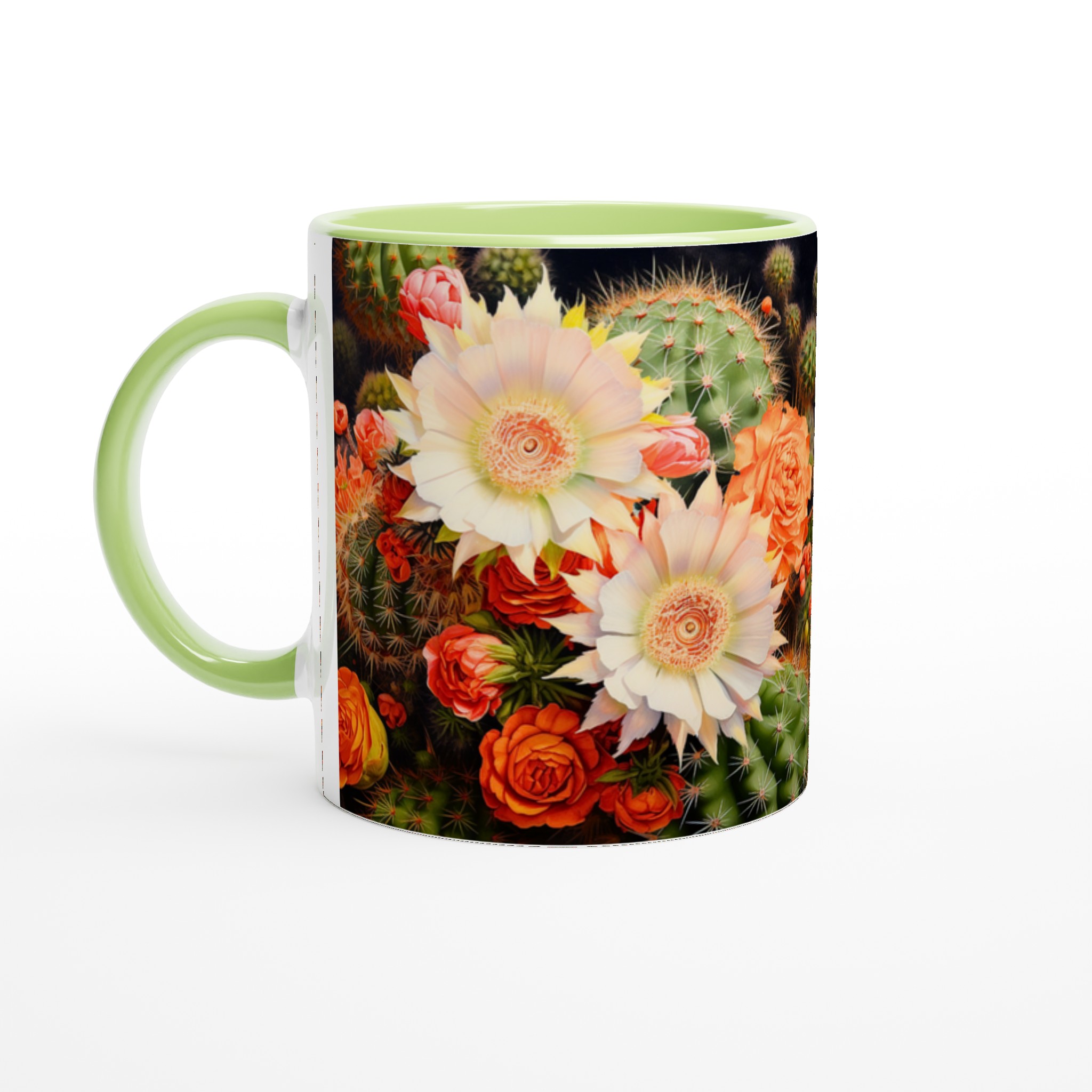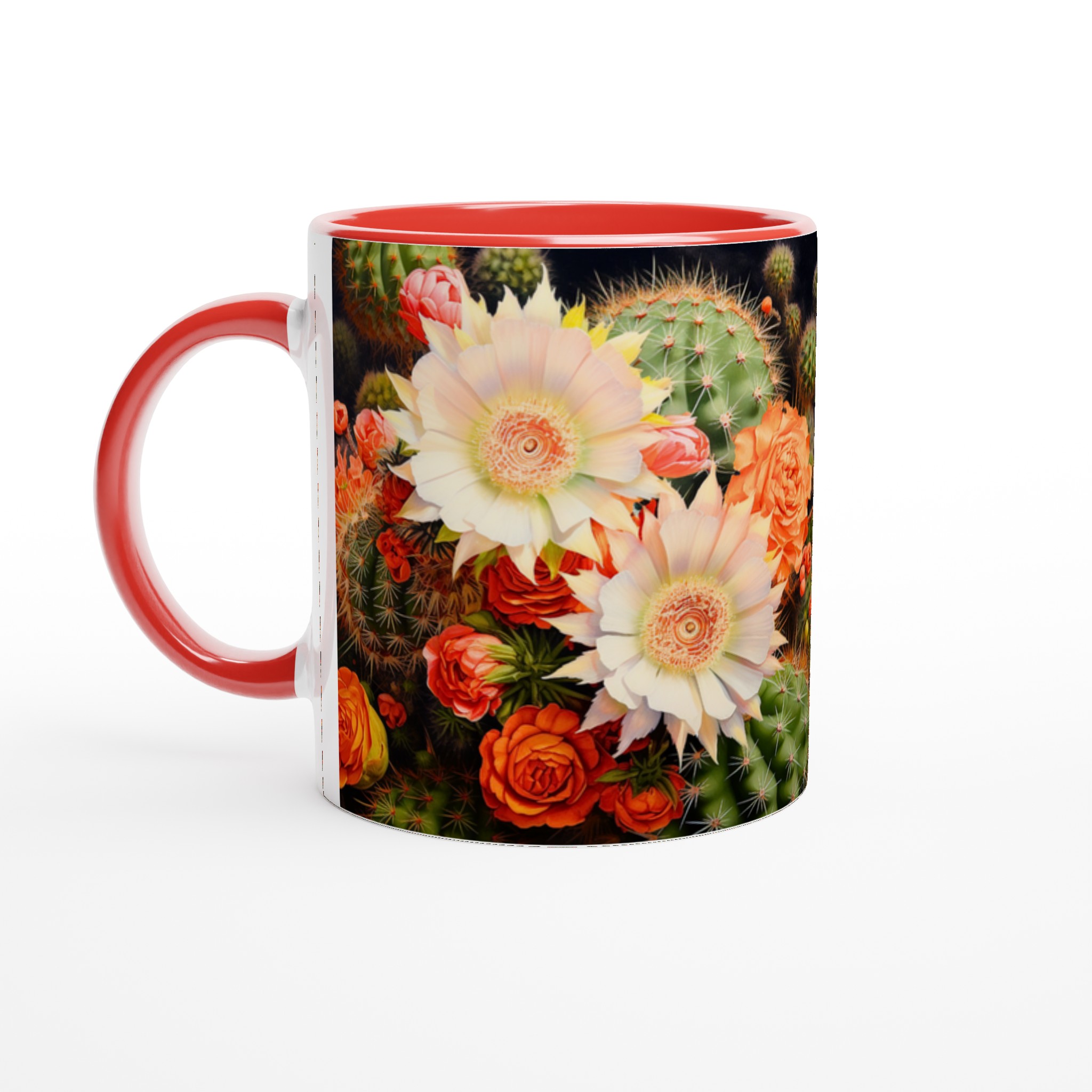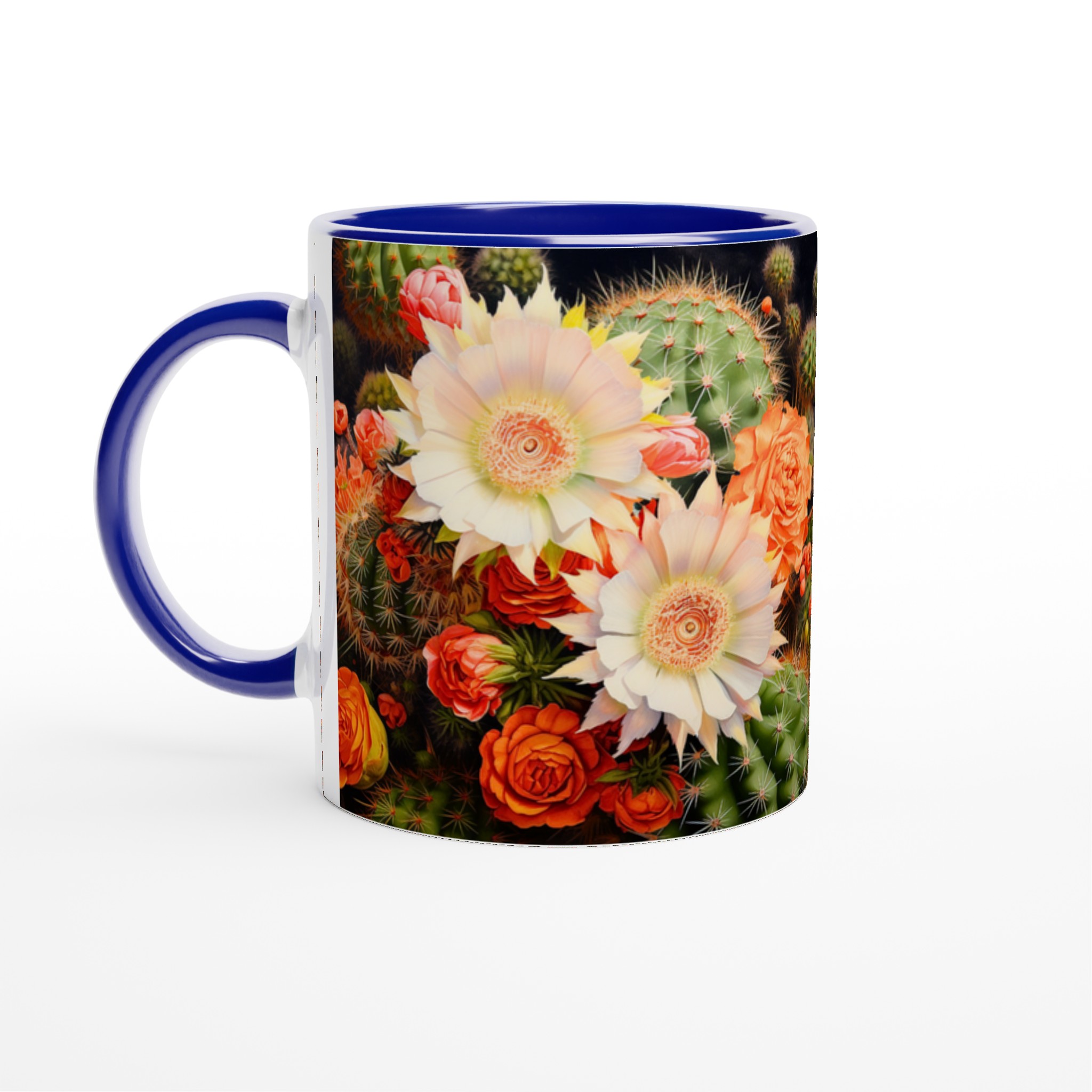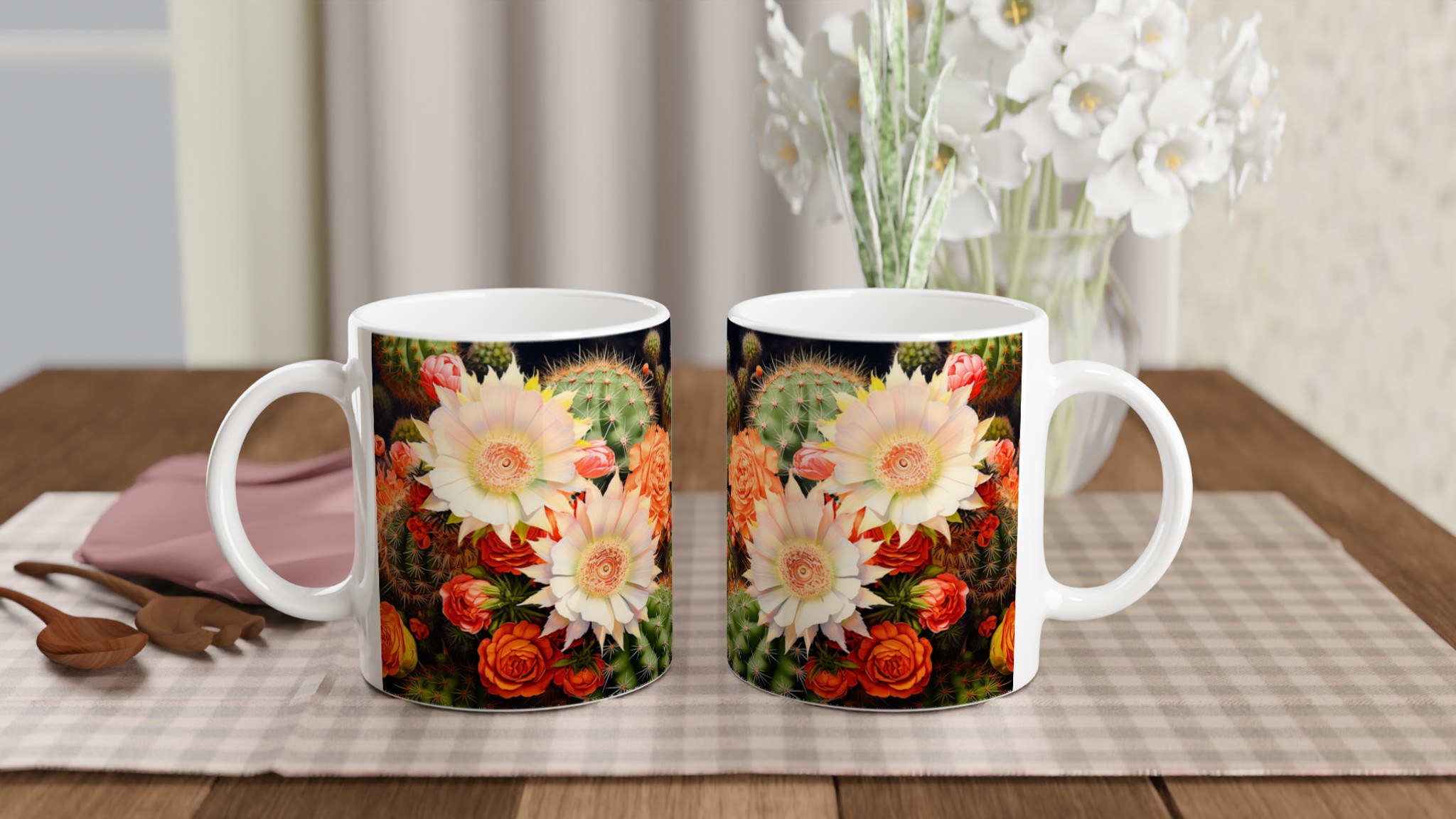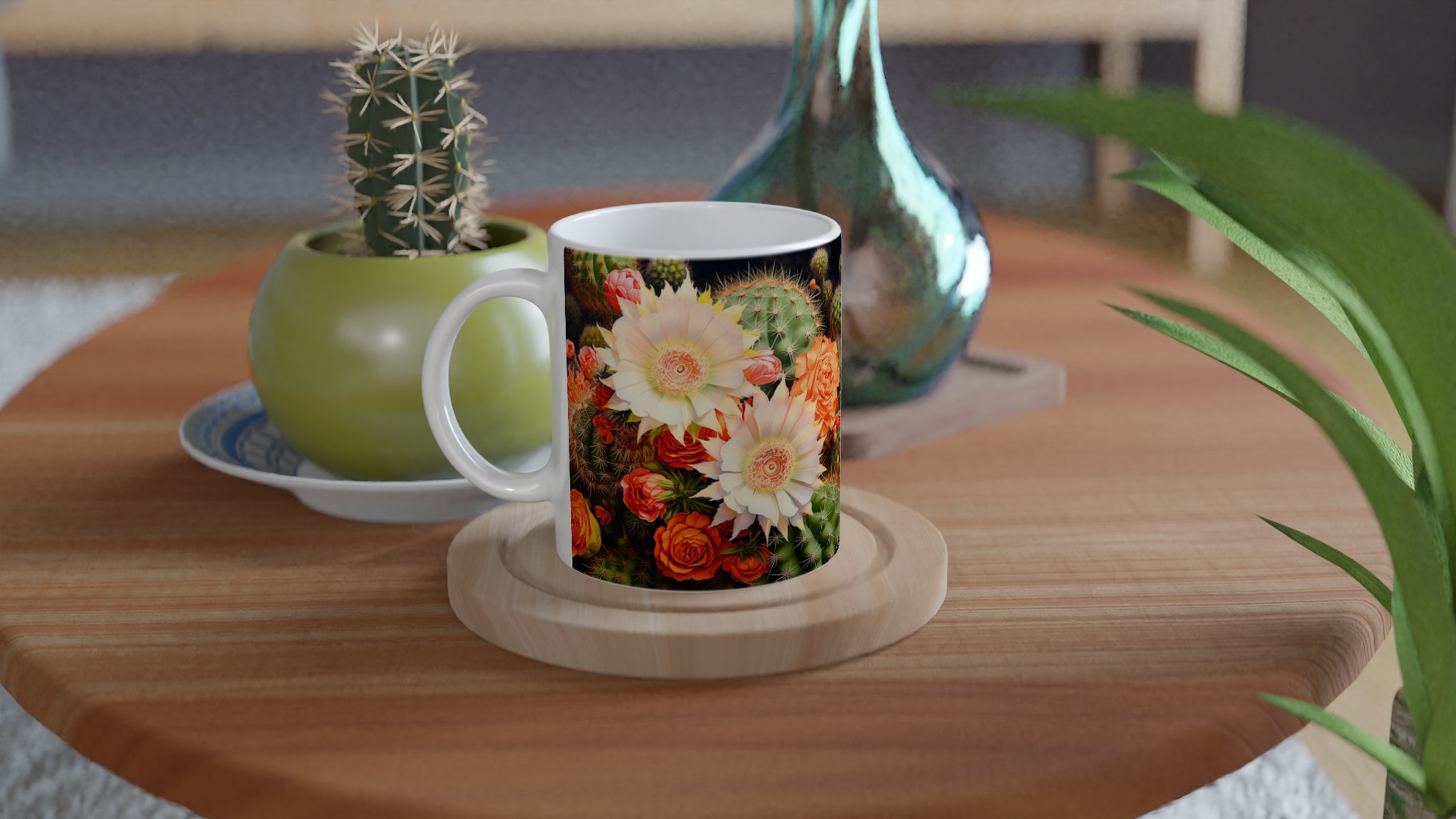 Låt varje klunk bli en resa till en förtrollande ökenträdgård med denna unika keramiska mugg. Dess design fångar den dramatiska skönheten hos blommande kaktusar och livfulla rosor i en rik palett av varmt vitt, soligt orange och frodigt grönt mot en mystisk mörk bakgrund. Denna mugg är inte bara ett kärl för din favoritdryck; den är ett konstverk som förvandlar din fikapaus till en stund av lugn och inspiration.