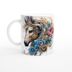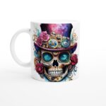 Denna iögonfallande keramiska mugg blir snabbt en favorit för den som älskar en touch av unik konst i vardagen. Med sin fantastiska design, inspirerad av steampunk och ”Day of the Dead”-estetik, prydd med solrosor och intrikata detaljer, är den perfekt för morgonkaffet, kvällens varma choklad eller när du bara vill njuta av en kopp te med stil.