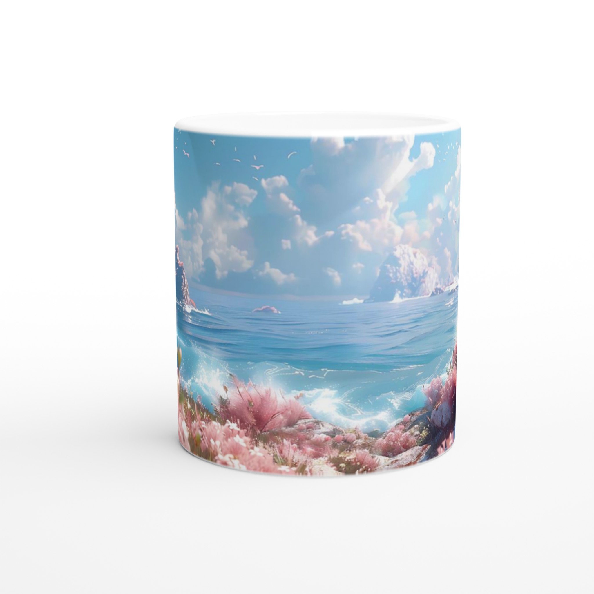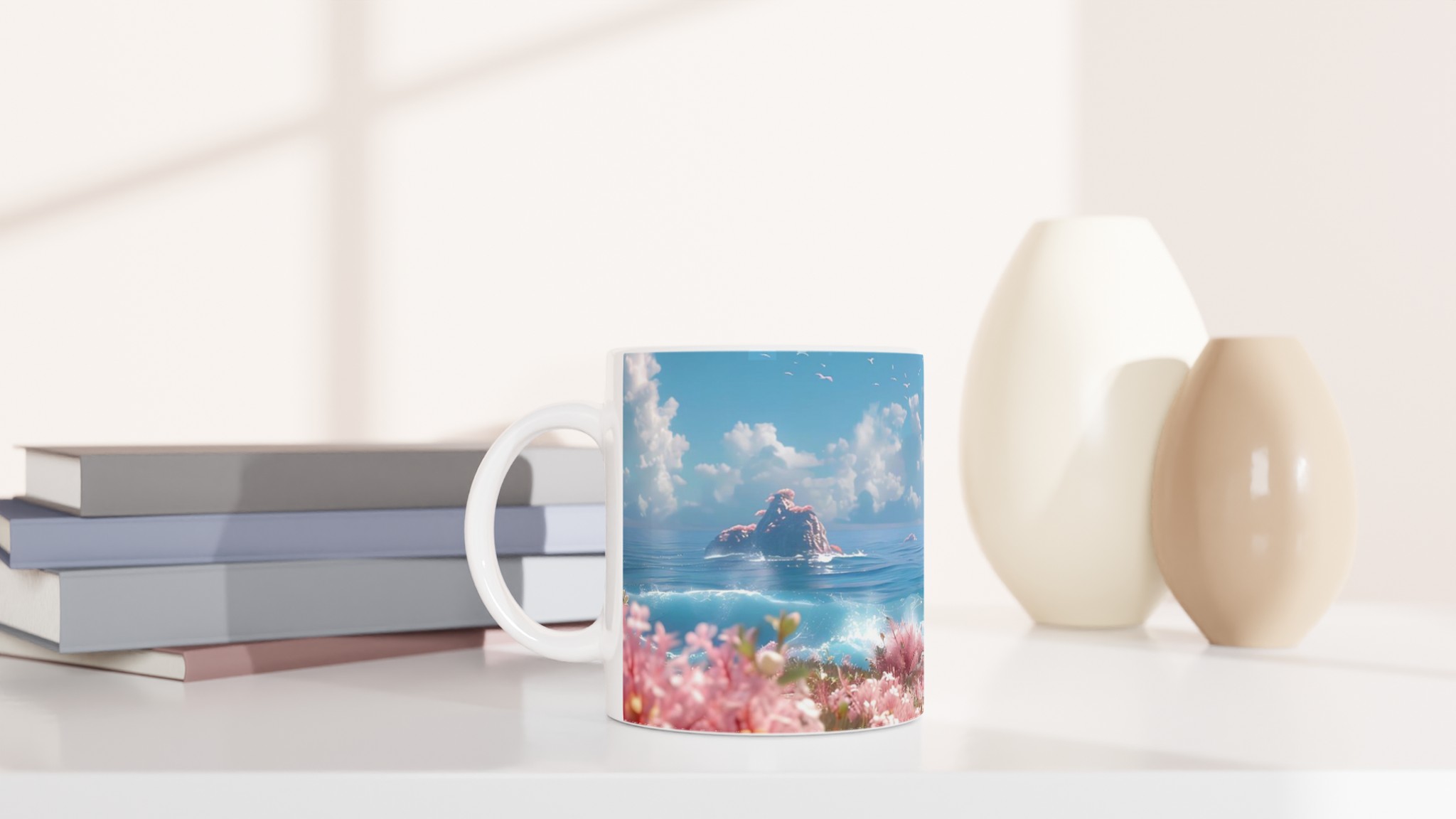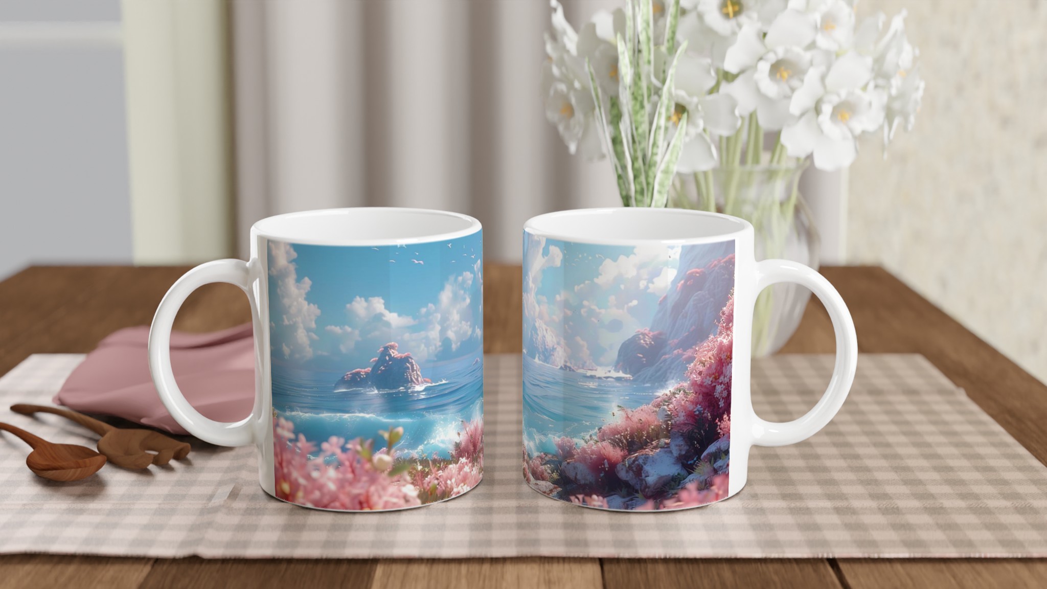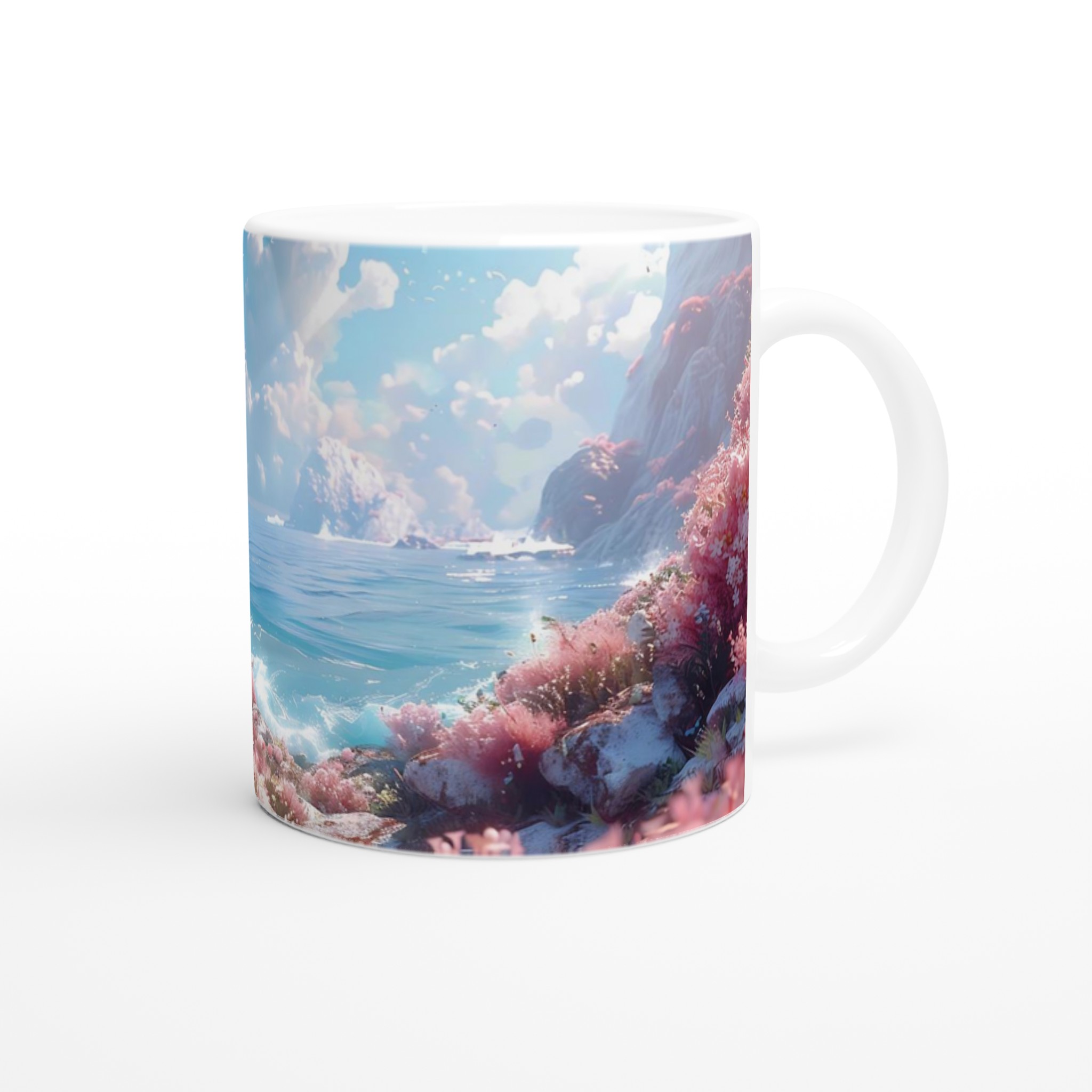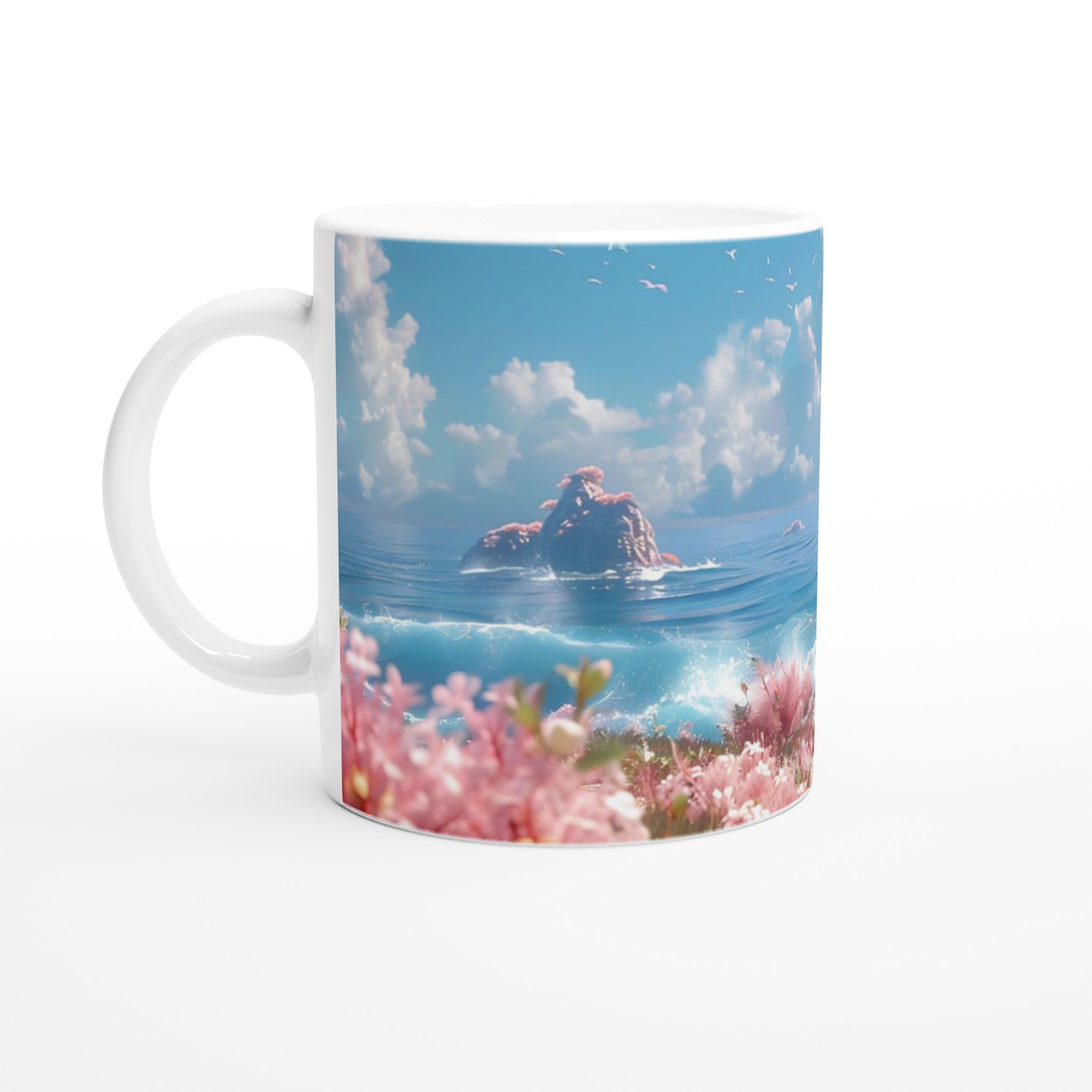 Föreställ dig att ta en klunk av ditt favoritkaffe medan du drömmer dig bort till en lugn och blomstrande strandkant. Denna keramiska mugg fångar den eteriska skönheten hos havet med mjuka rosa blommor och lugnande blå vågor, vilket gör varje dryck till en minisemester. Dess stilrena design blir snabbt en vardagsfavorit – perfekt för morgonkaffet, kvällens varma choklad eller när du bara vill njuta av en kopp te. Den blanka vita ytan framhäver trycken med klara och levande färger, som håller sig fina även efter många turer i mikron och diskmaskinen.