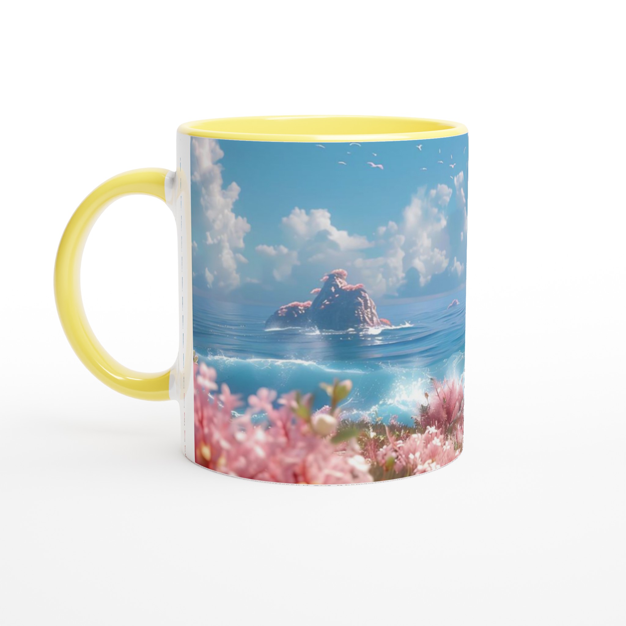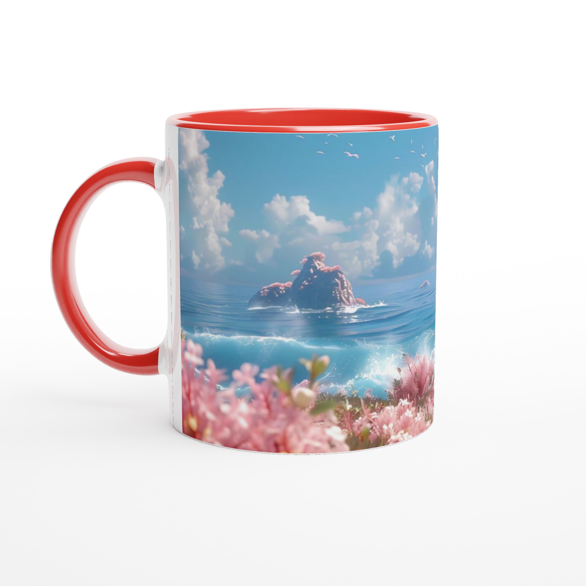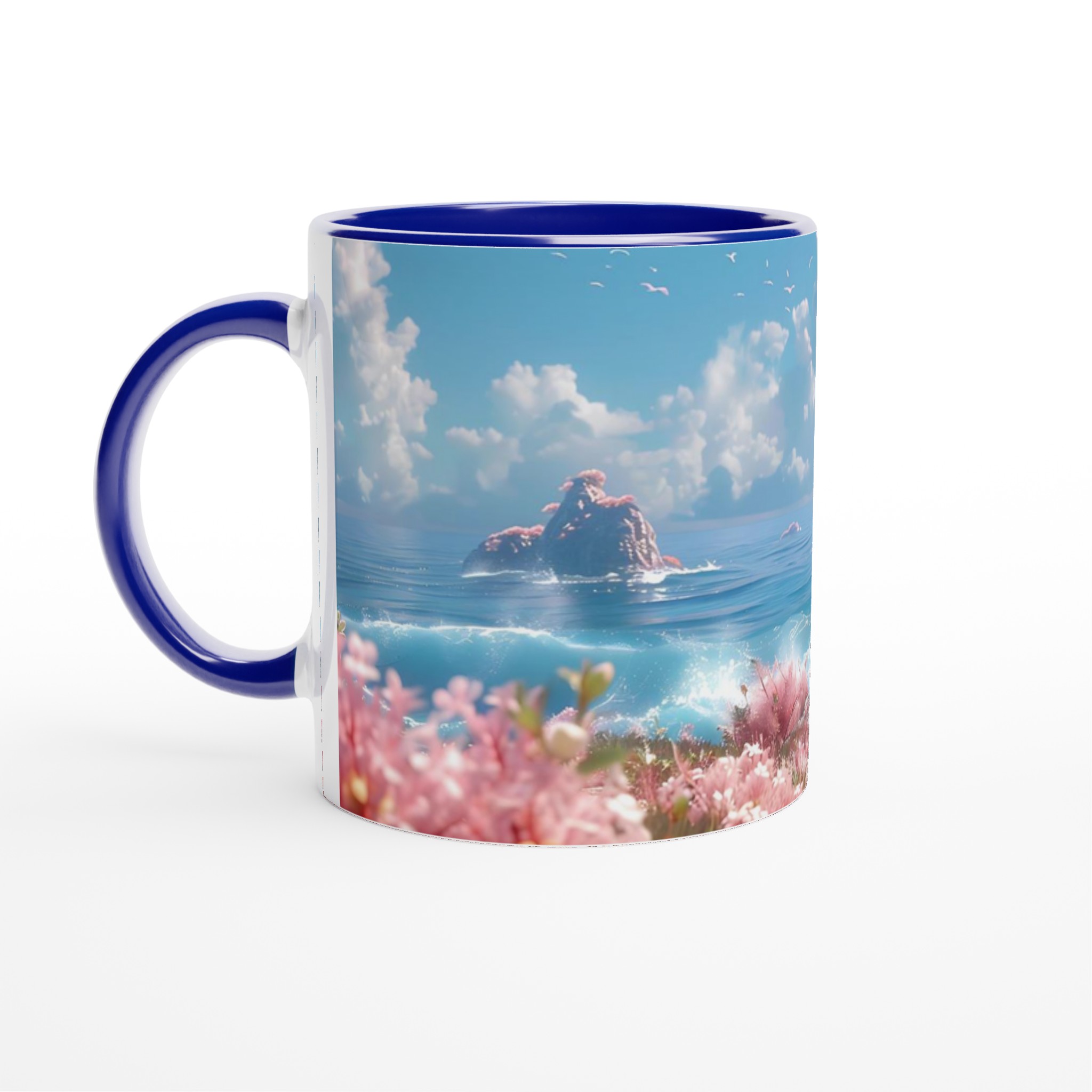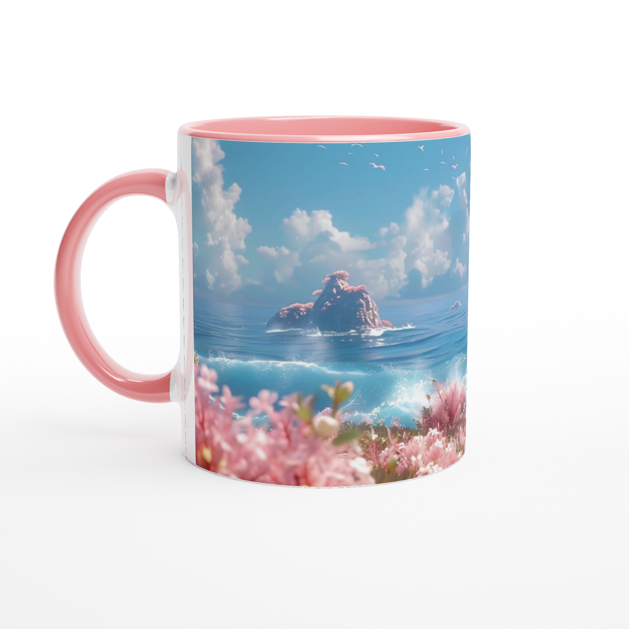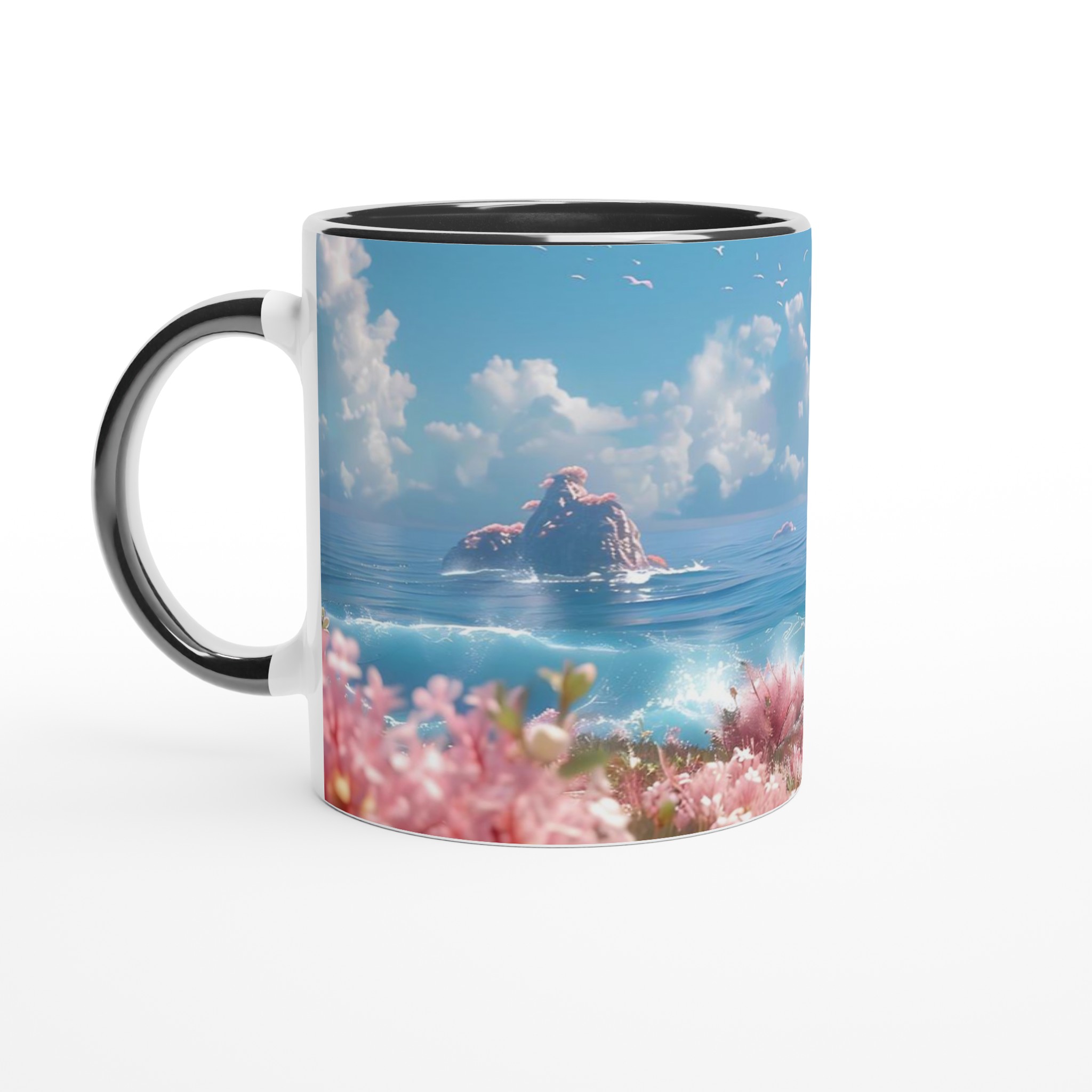 Föreställ dig att ta en klunk av ditt favoritkaffe medan du drömmer dig bort till en lugn och blomstrande strandkant. Denna keramiska mugg fångar den eteriska skönheten hos havet med mjuka rosa blommor och lugnande blå vågor, vilket gör varje dryck till en minisemester. Dess stilrena design blir snabbt en vardagsfavorit – perfekt för morgonkaffet, kvällens varma choklad eller när du bara vill njuta av en kopp te. Den blanka vita ytan framhäver trycken med klara och levande färger, som håller sig fina även efter många turer i mikron och diskmaskinen.