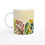 Låt varje klunk bli en uppfriskande upplevelse med vår Keramiska Mugg – Blomstrande Våräng. Inspirerad av bilden som strålar av en färgsprakande palett av handgjorda pappersblommor i nyanser av lila, rosa, gult och orange, förvandlar denna mugg din fikastund till en miniträdgård. Denna stilrena keramiska mugg blir snabbt en vardagsfavorit. Perfekt för morgonkaffet, kvällens varma choklad eller när du bara vill njuta av en kopp te. Den blanka vita ytan gör att trycken framhävs med klara och levande färger, som håller sig fina även efter många turer i mikron och diskmaskinen.