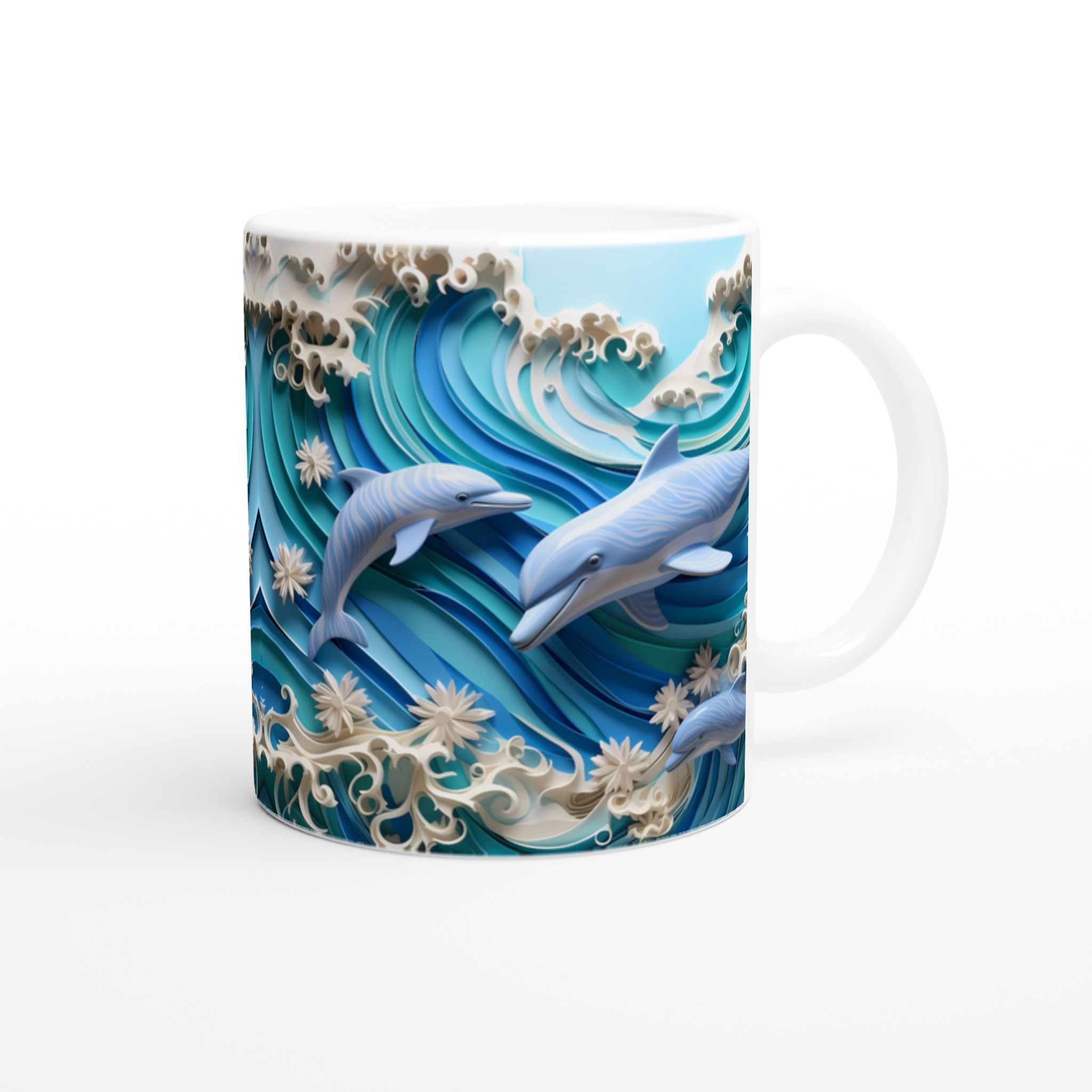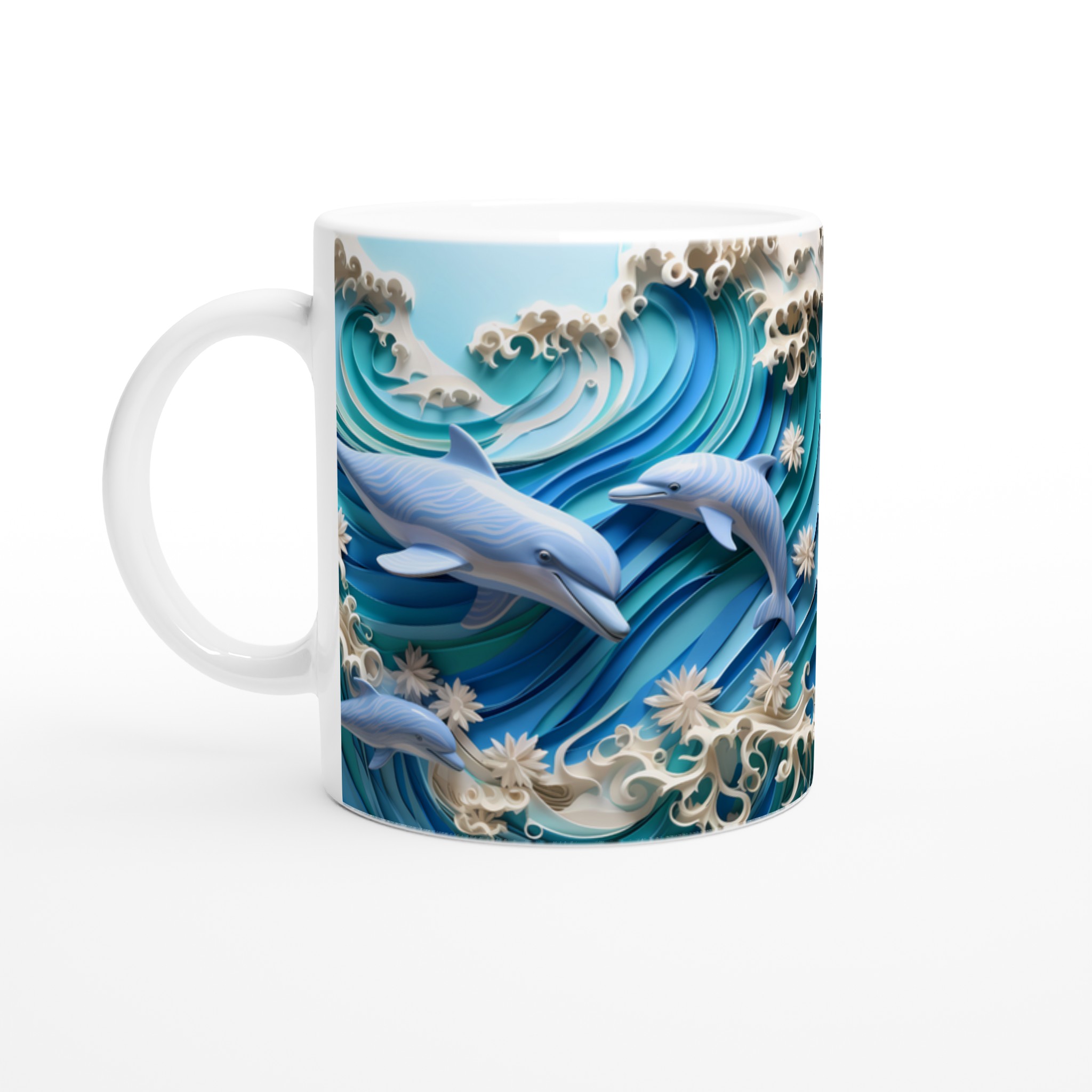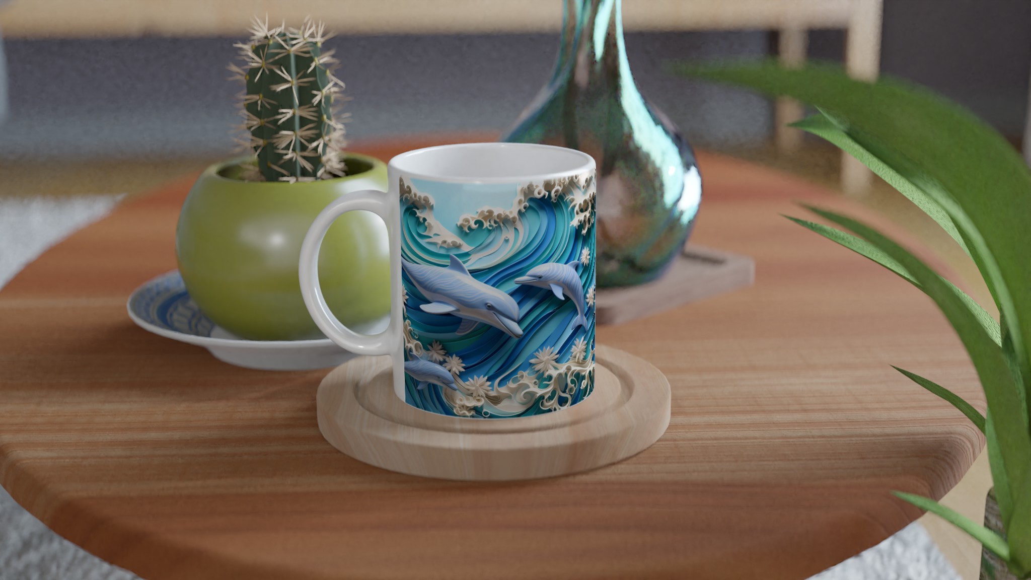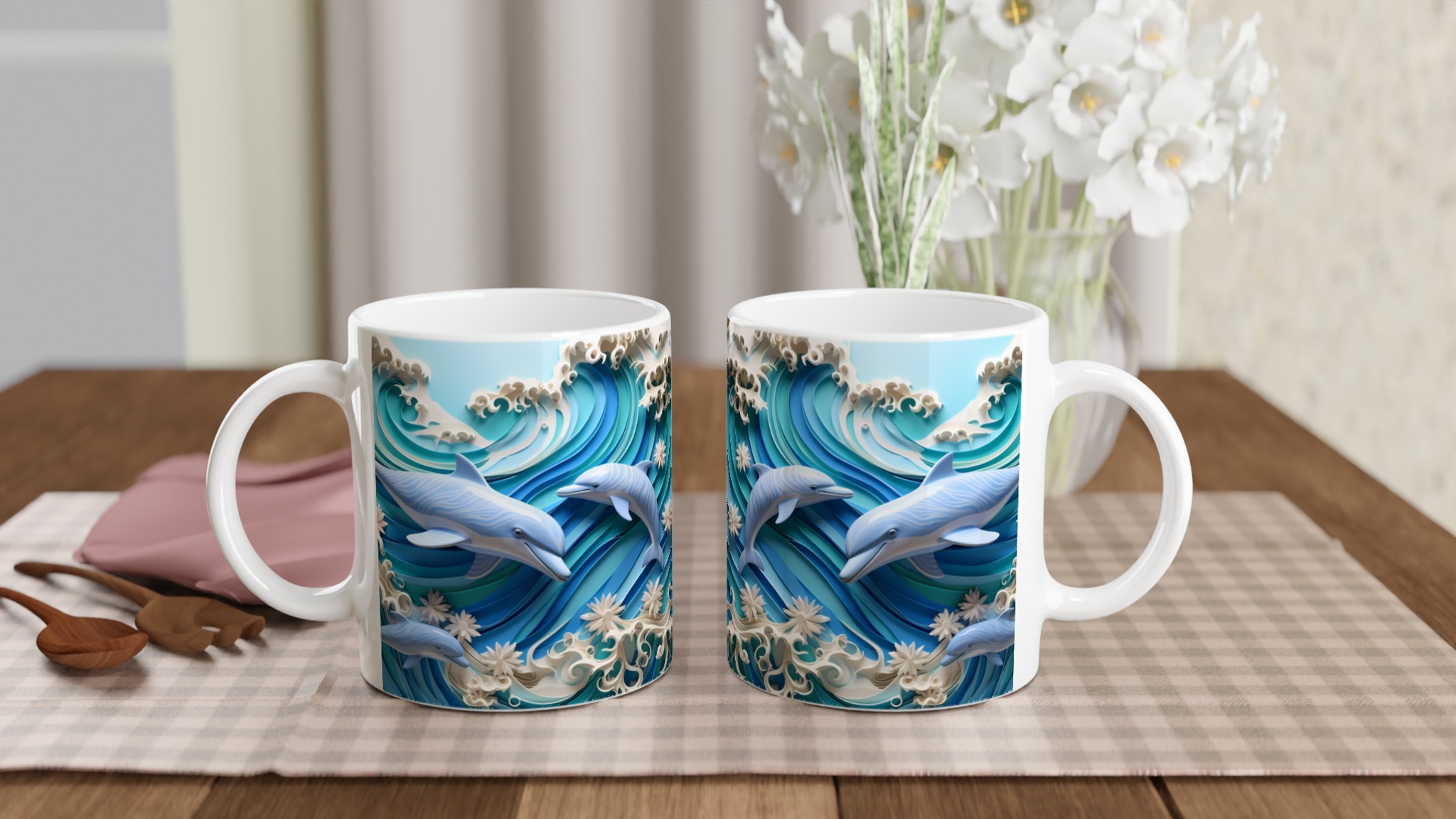 Låt dig svepas med av havets lugn med vår charmiga keramiska mugg, som fångar ögonblicket av lekfulla delfiner i turkosa, svallande vågor. Denna mugg är inte bara en behållare för din favor dryck, utan en liten konstverk som för med sig en känsla av lugn och glädje till din vardag. Med sina levande blåa nyanser och detaljerade design, blir den snabbt en favorit för alla som älskar havets magi.