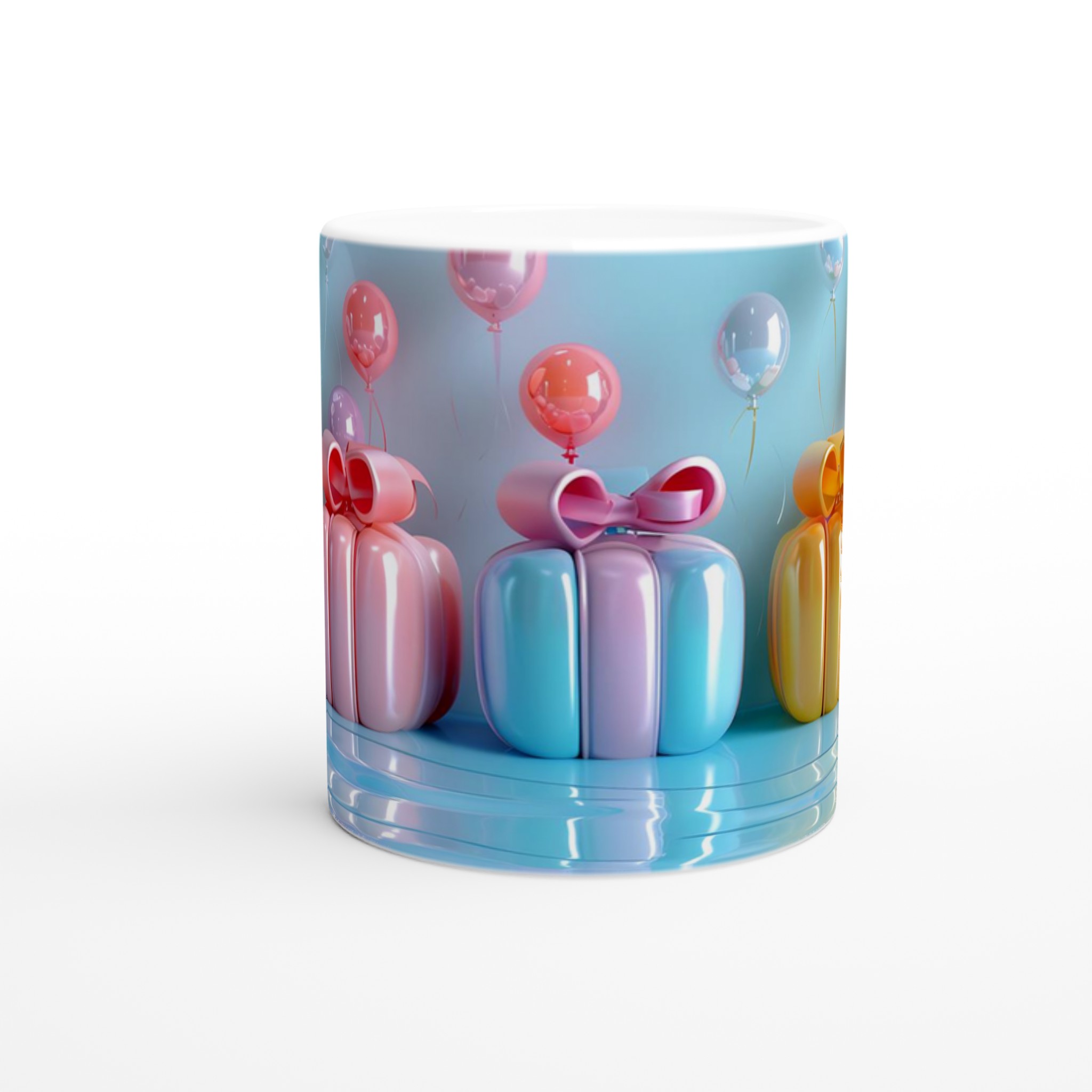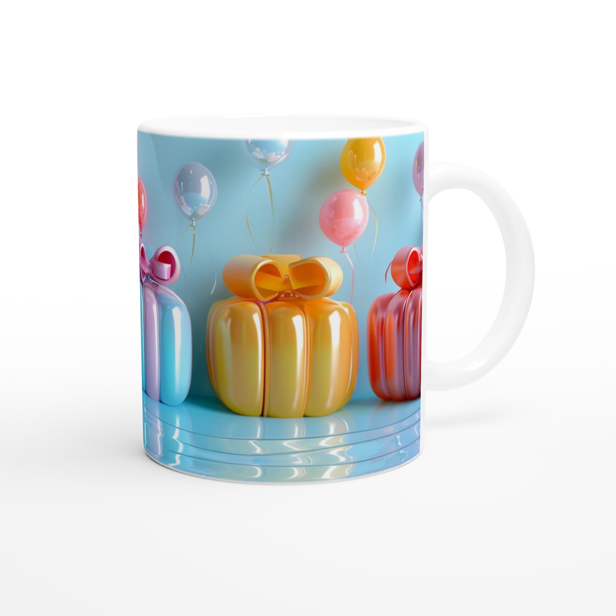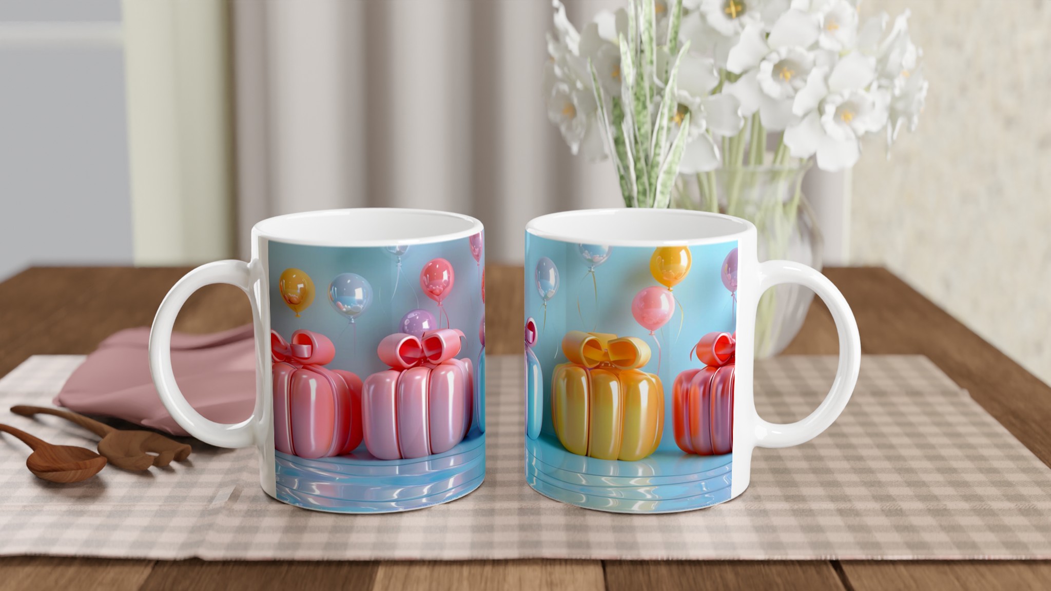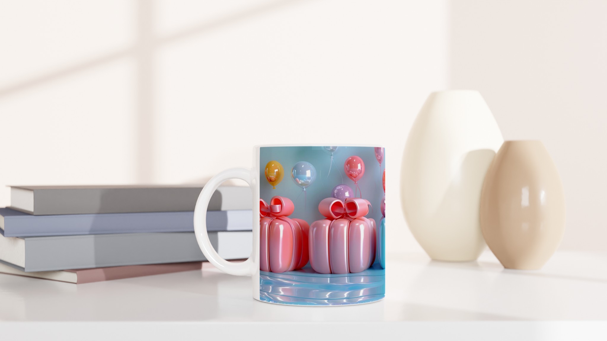 Överraska någon speciell eller unna dig själv den här förtrollande keramiska muggen, inspirerad av festliga presentaskar och glada ballonger. Med sin blanka yta och oemotståndliga charm är den mer än bara en mugg – den är en daglig påminnelse om glädje och firande. Välj bland en palett av livfulla färger som framhäver varje tryck med klara och levande toner, som håller sig fina även efter otaliga turer i mikron och diskmaskinen.