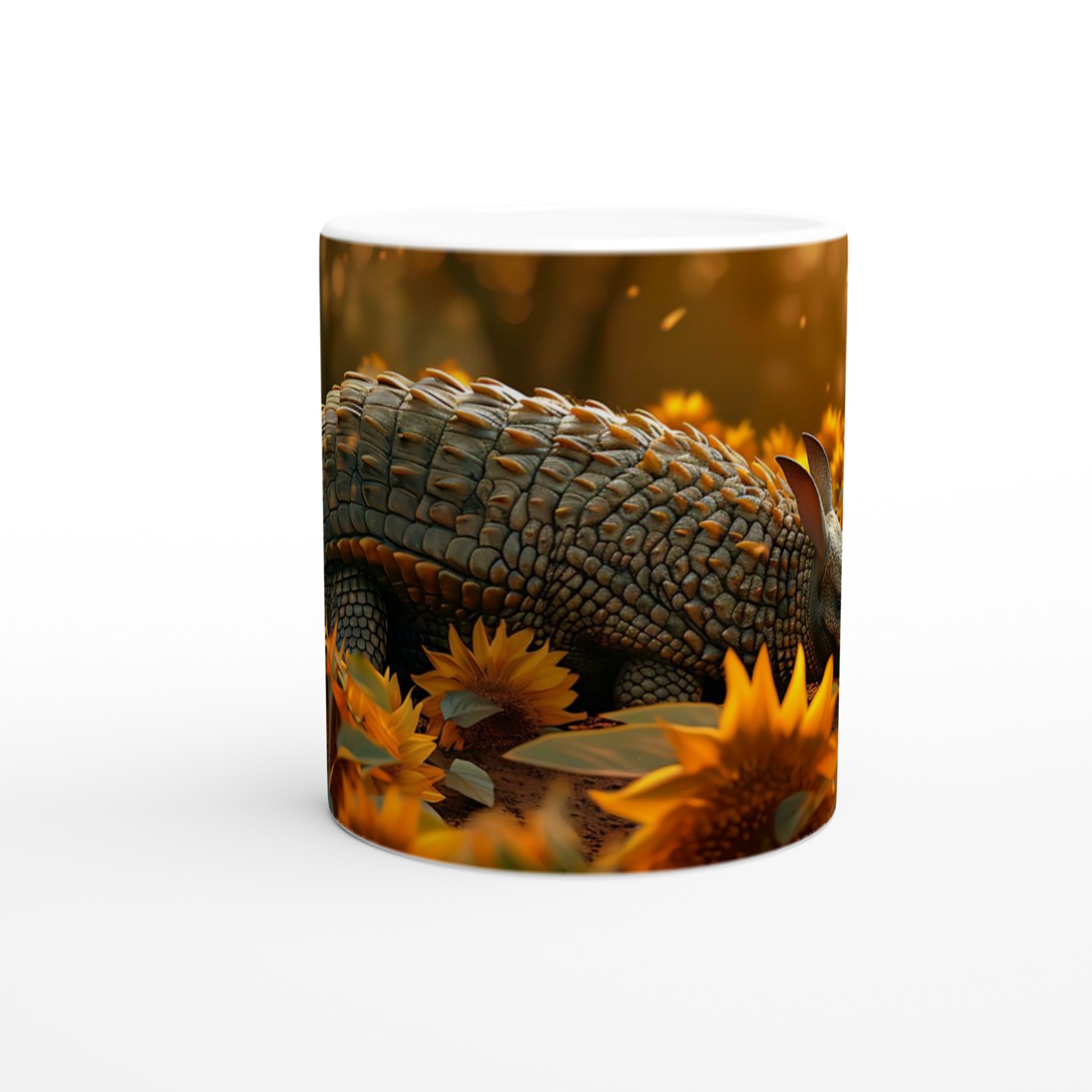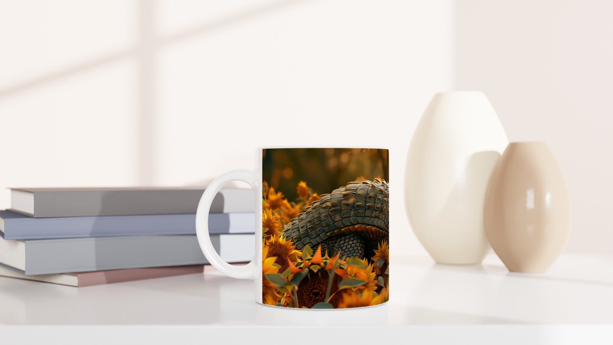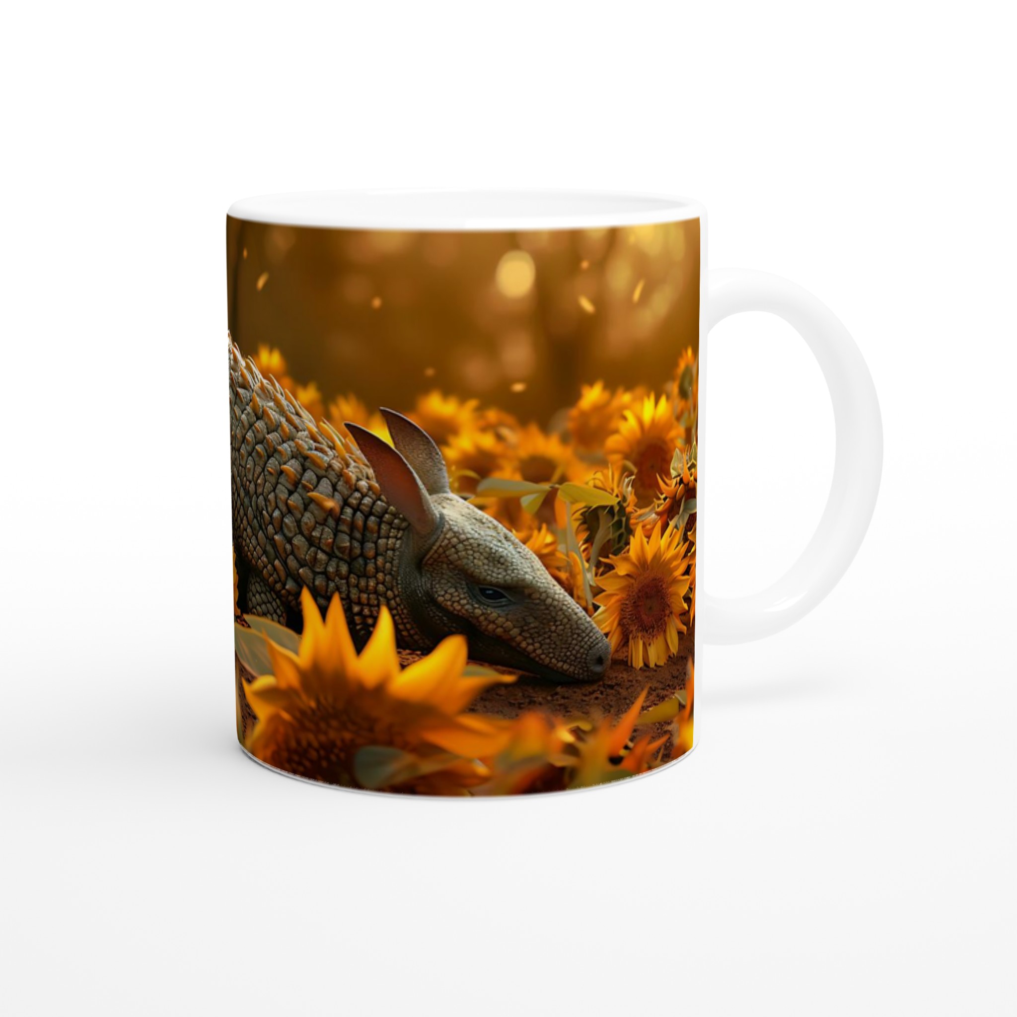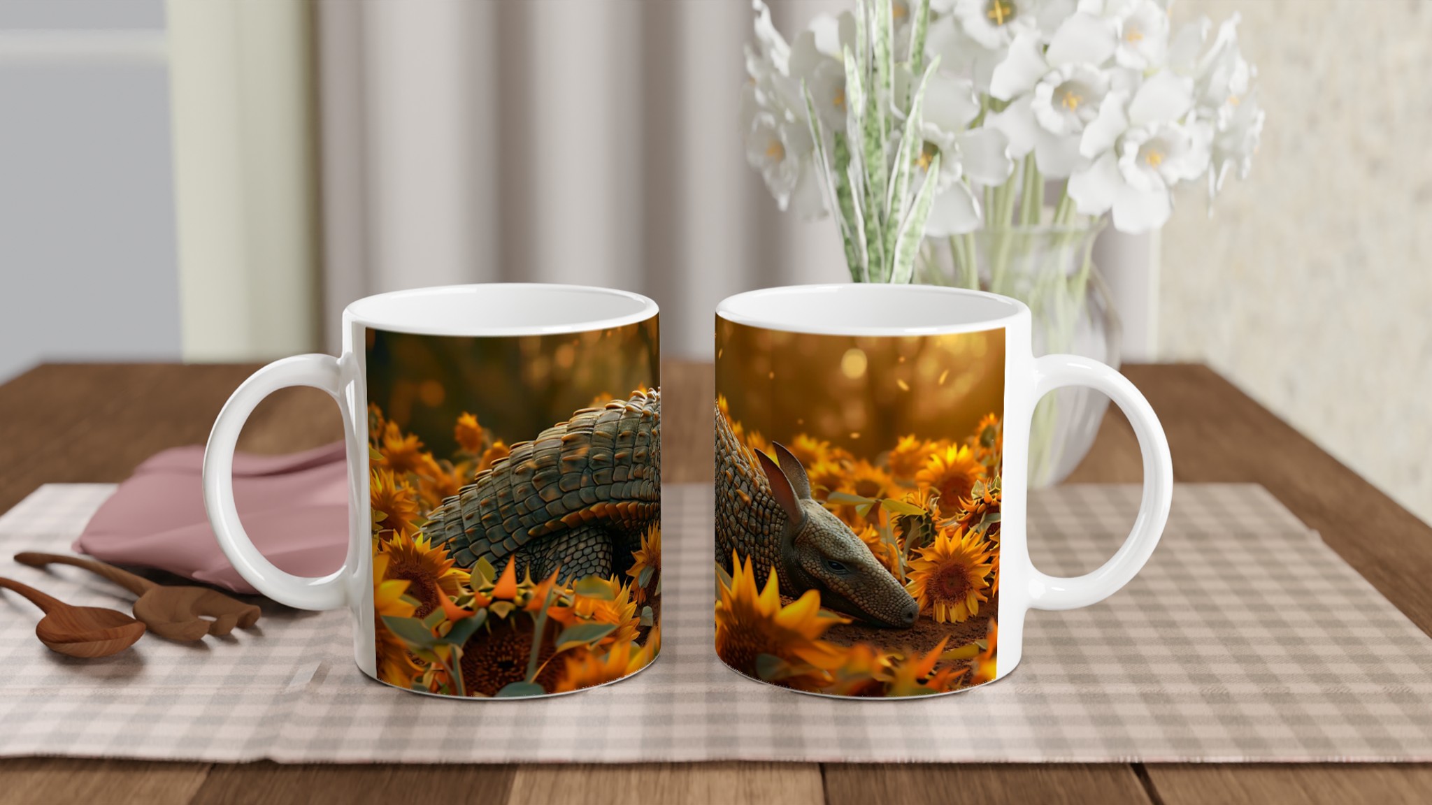 Låt dig förtrollas varje dag med vår charmiga keramiska mugg, som fångar den lugna och drömlika atmosfären av ett pansardjur vilande i ett gyllene solrosfält. Denna mugg blir snabbt en vardagsfavorit, perfekt för morgonkaffet, kvällens varma choklad eller när du bara vill njuta av en kopp te.