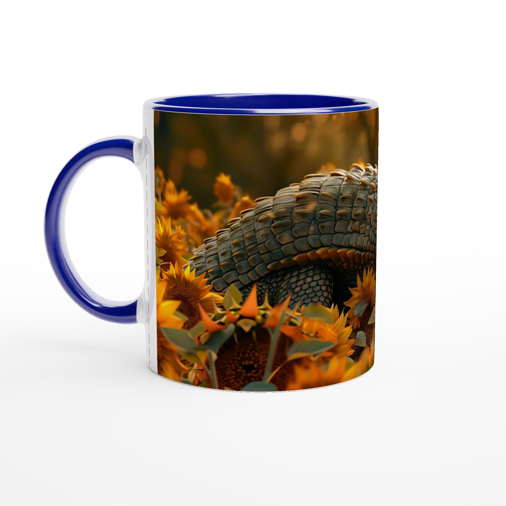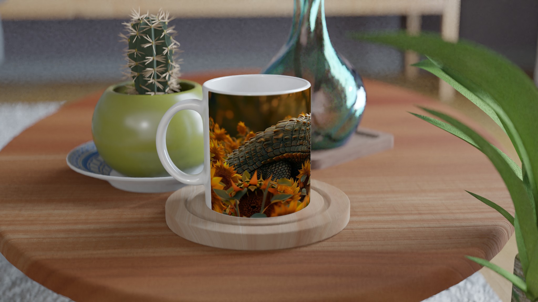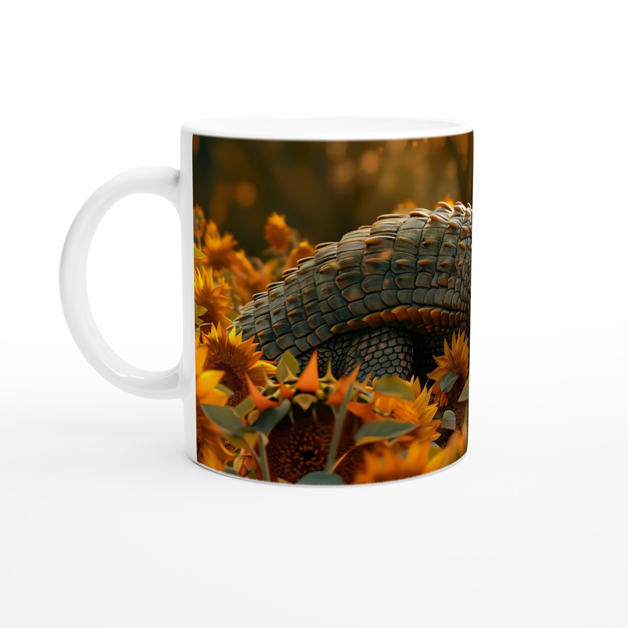 Låt dig förtrollas varje dag med vår charmiga keramiska mugg, som fångar den lugna och drömlika atmosfären av ett pansardjur vilande i ett gyllene solrosfält. Denna mugg blir snabbt en vardagsfavorit, perfekt för morgonkaffet, kvällens varma choklad eller när du bara vill njuta av en kopp te.