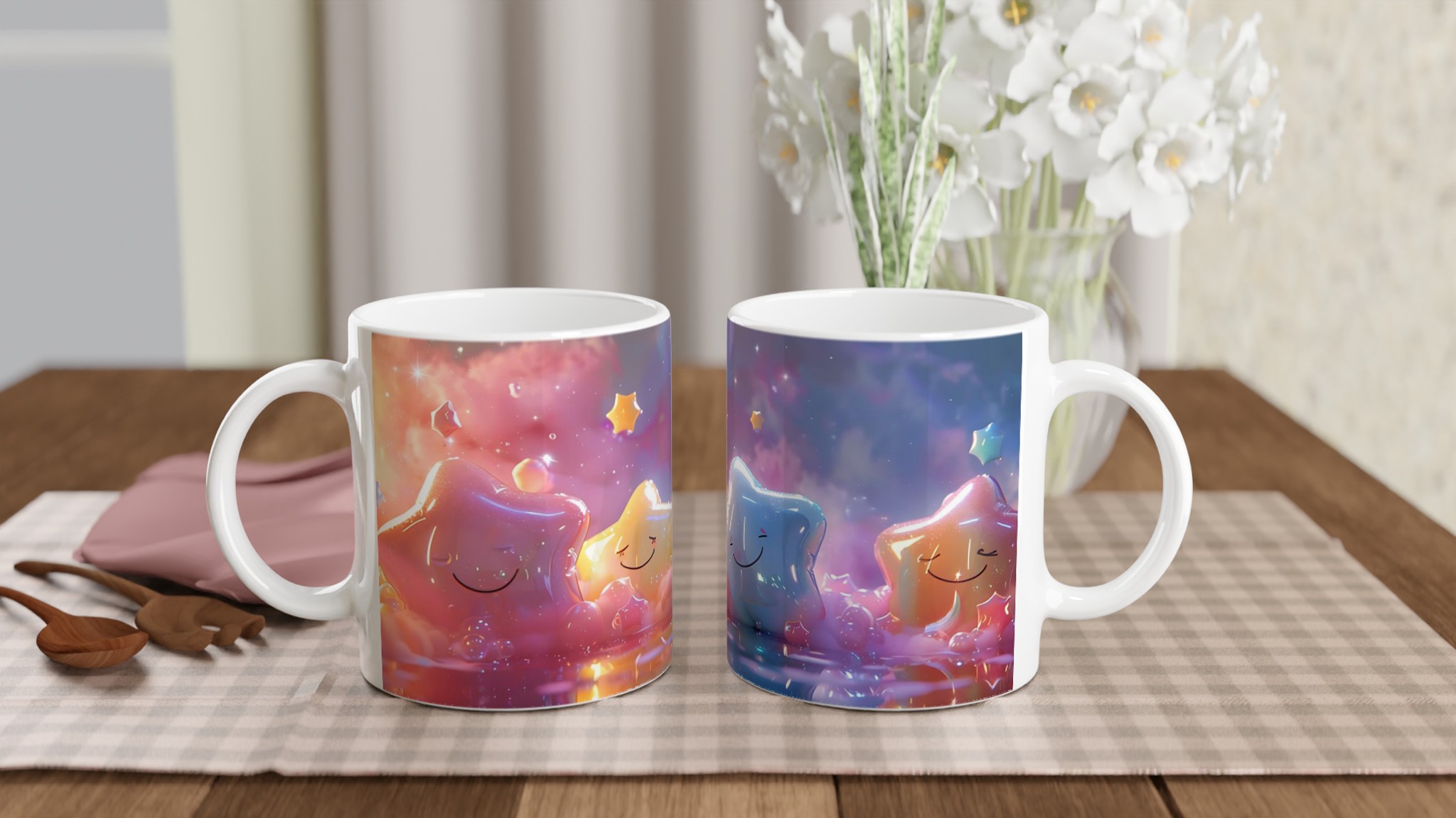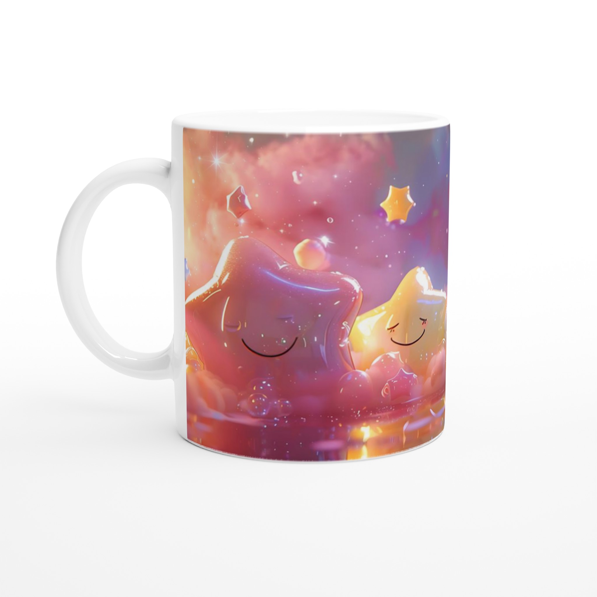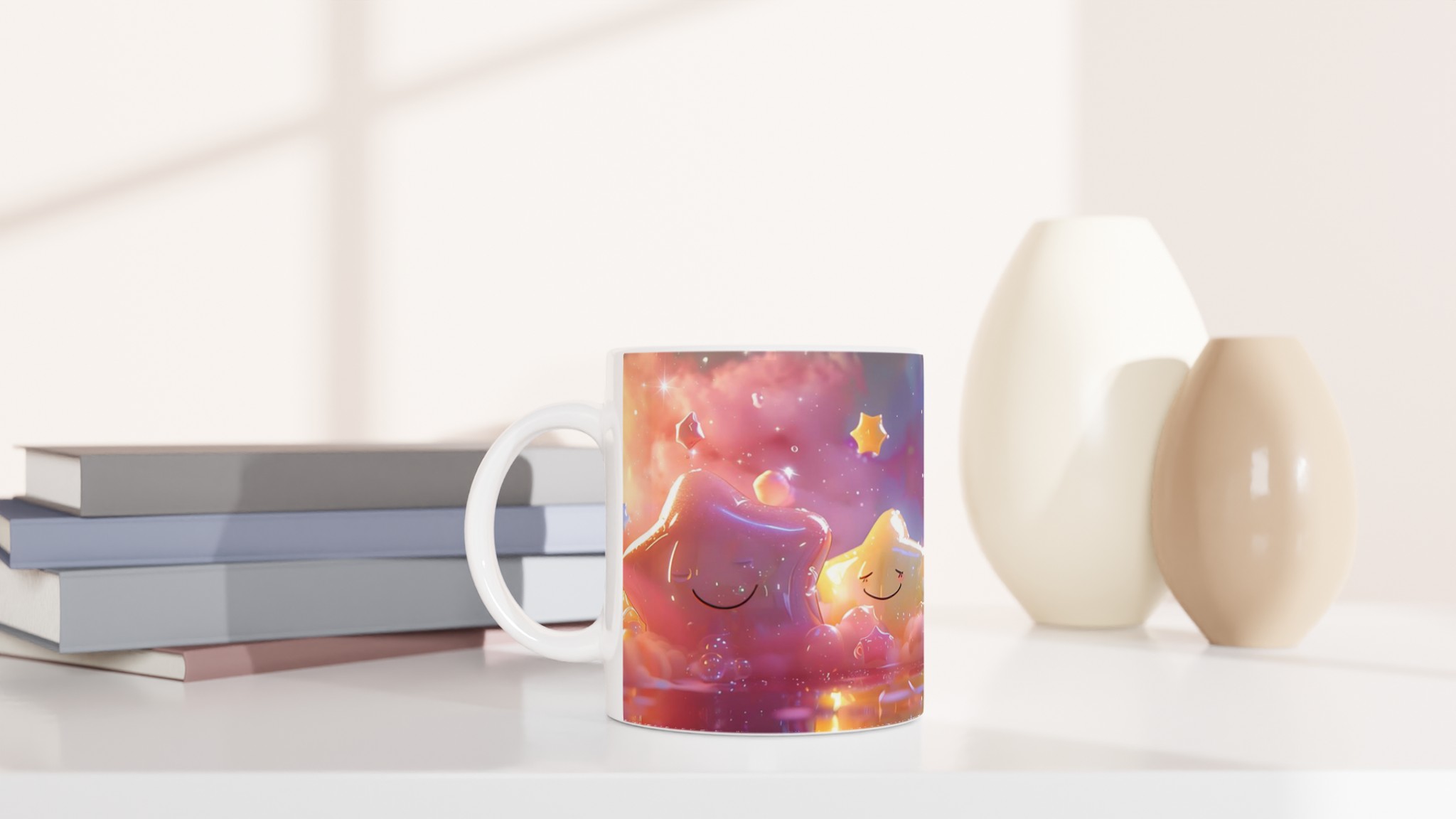 Låt varje klunk bli en resa till en magisk stjärnhimmel med vår underbara keramiska mugg! Med en design inspirerad av drömmiga moln, glittrande stjärnor och lekfulla, leende stjärnfigurer i mjuka pastellfärger, blir den här muggen inte bara en vardagsfavorit – den blir en liten bit lycka i din hand. Perfekt för morgonkaffet, kvällens varma choklad eller när du bara vill njuta av en kopp te och drömma dig bort.
